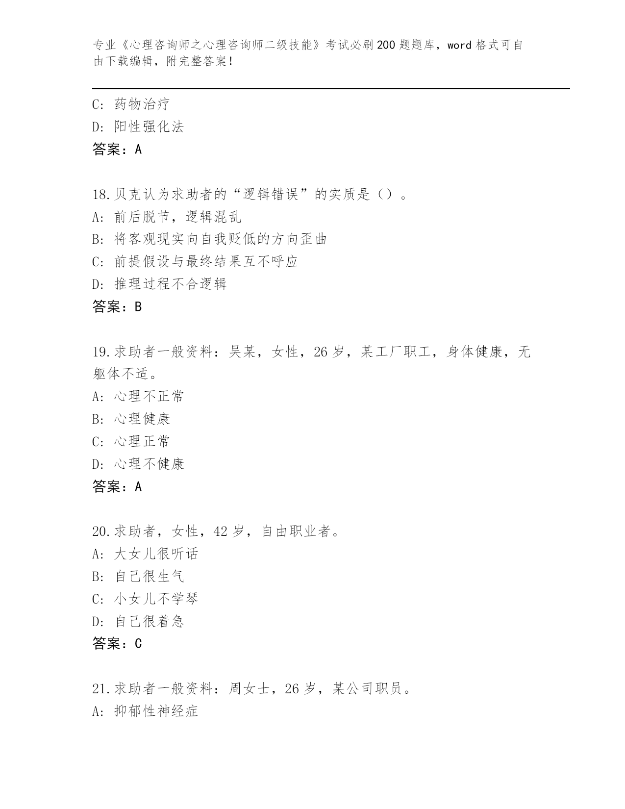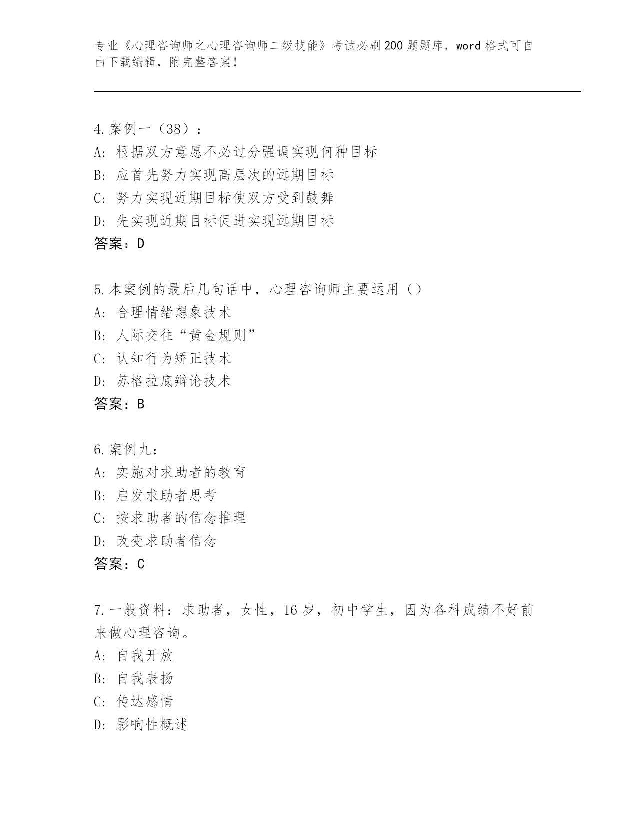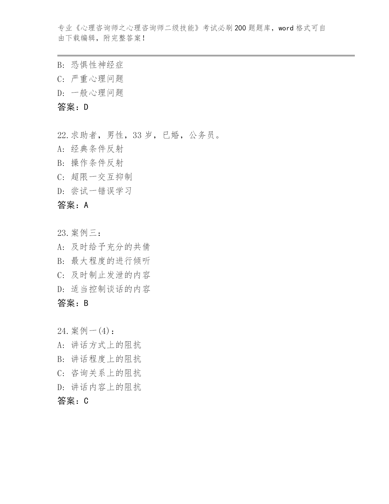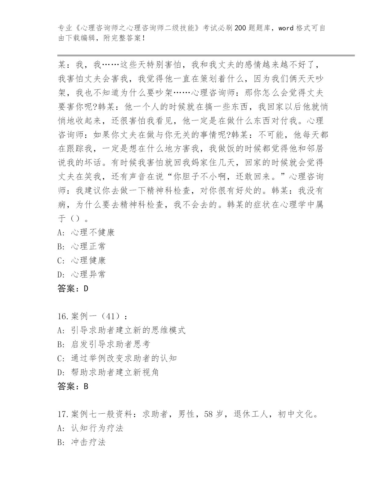 河北省张北县2024年《心理咨询师之心理咨询师二级技能》考试必刷200题王牌题库含答案(模拟题)