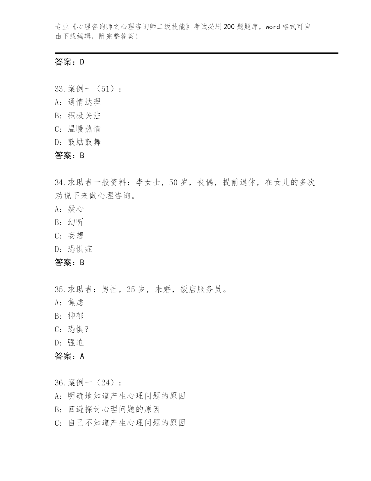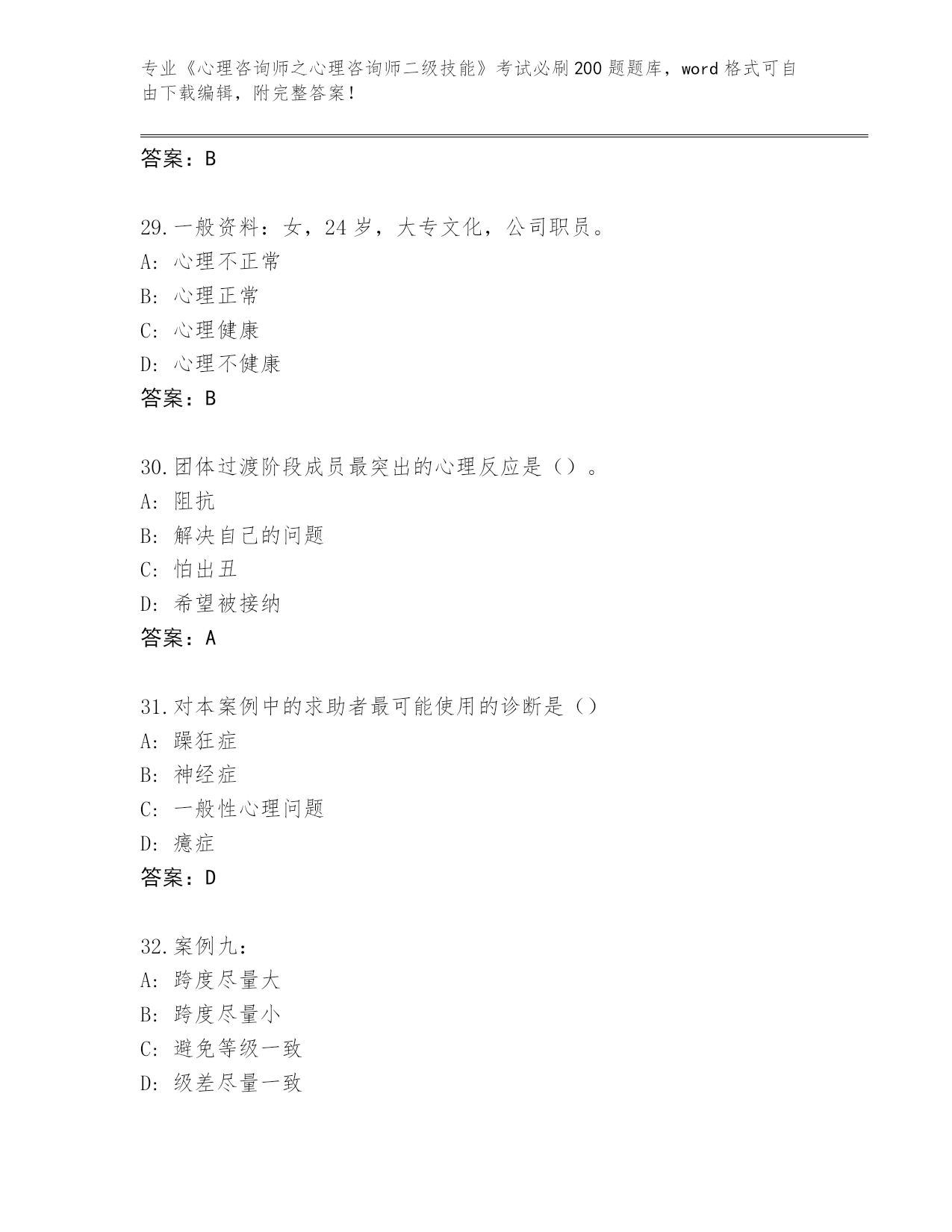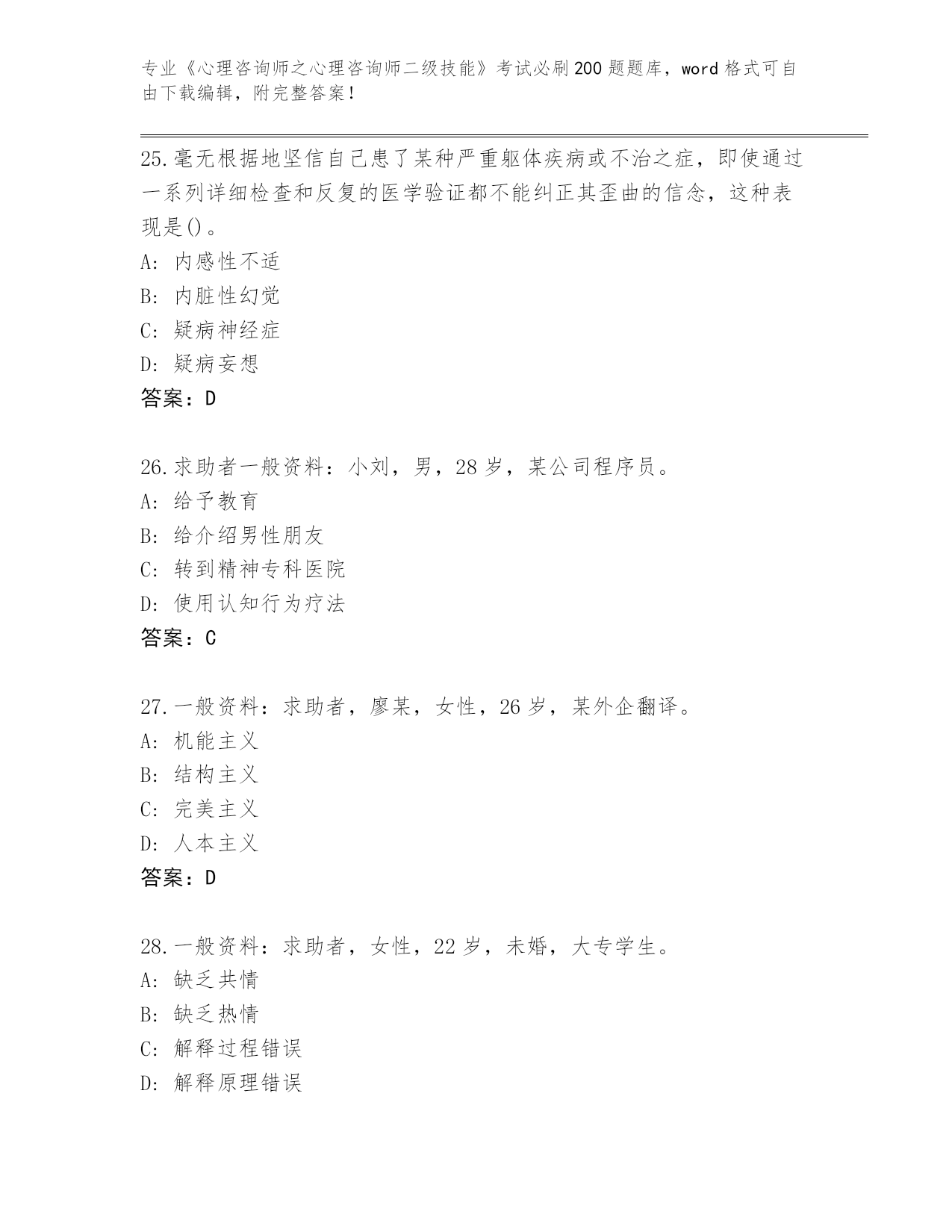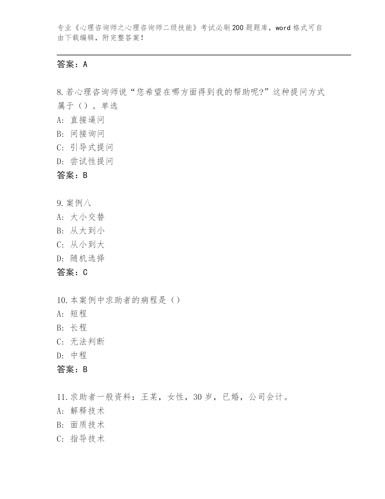 河北省张北县2024年《心理咨询师之心理咨询师二级技能》考试必刷200题王牌题库含答案(模拟题)