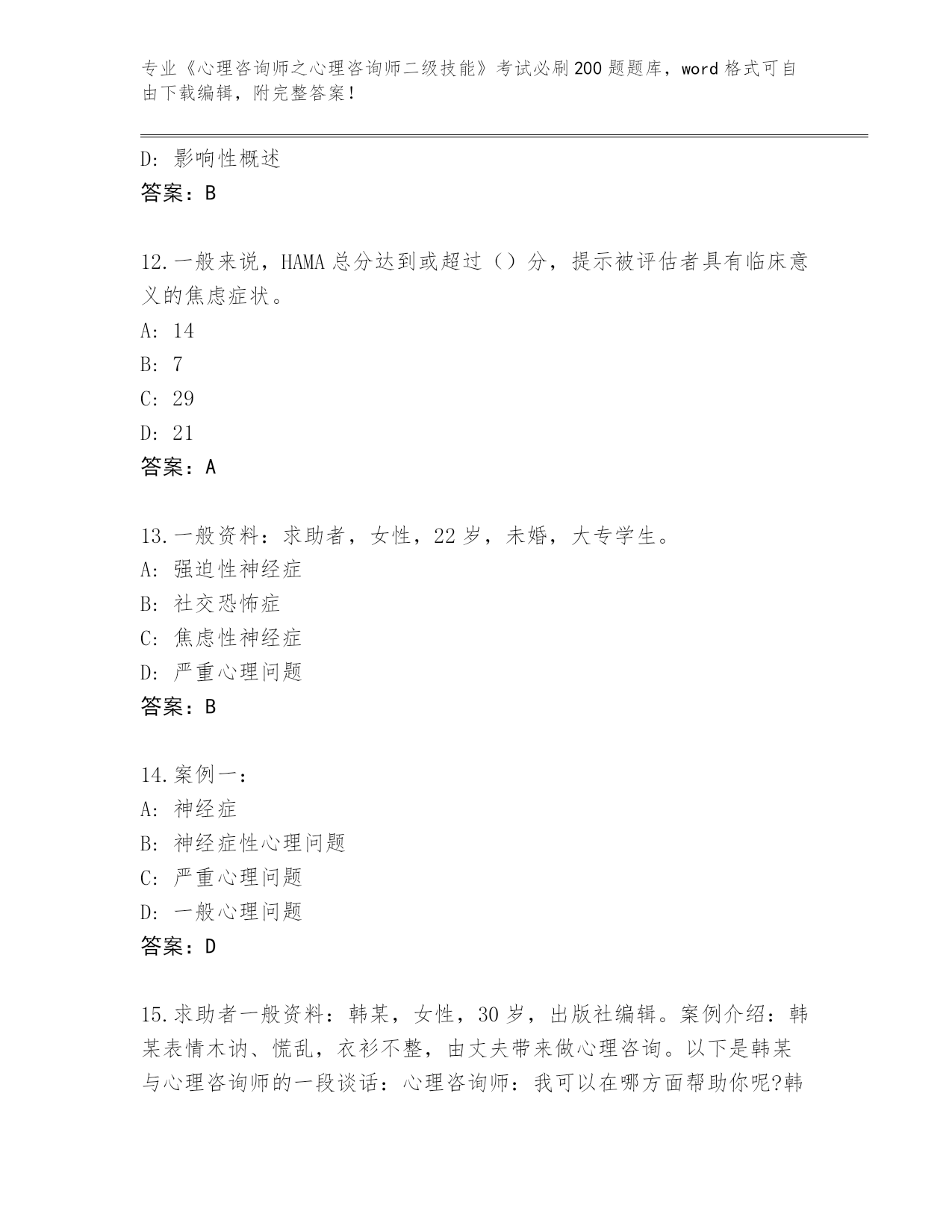 2024年安徽省《心理咨询师之心理咨询师二级技能》考试必刷200题王牌题库(必刷)