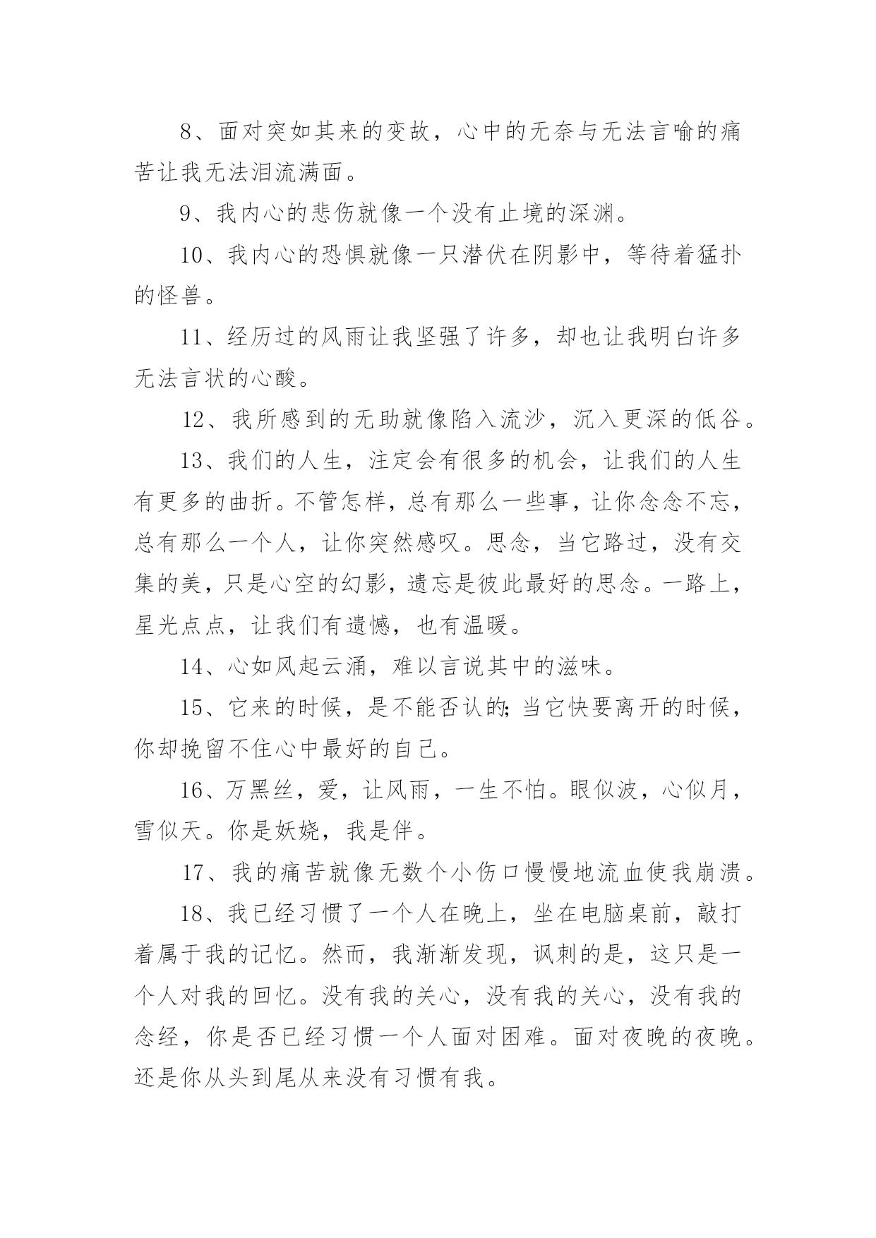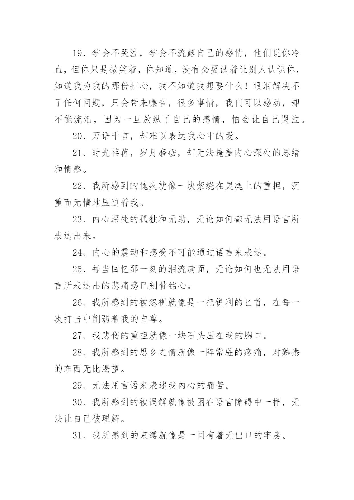 无法表达心情文案句子无法表达心情文案句子在平平淡淡的日常中,越来越多人钟情于在线上发布文案,文案用于分享自己的生活状态。想发文案却总是不知道怎么组织语言?以下是小编为大家收集的无法表达心情文案句子,欢迎大家借鉴与参考,希望对大家有所帮助。1、表面的文字无法表现内心的真实情感。2、是否青春年少,遇见你只在路上,却不知你即将离去。也许,太年轻的爱情让我们走在成长的旅途中,盲目的找不到方向,跌跌撞撞的走向远方。一场相遇已缘薄凉烟轻落,一场绚烂开是开到尽头的茶。3、我们曾经爱过的痛,曾经心碎的痛,应该说是由某人的外表造成的。4、我的焦虑就像一场不断发酵的风暴,没有任何安全的避风港。5、我所感到的爱慕就像一种无止境的渴求,无法满足,总是渴望更多。6、心灵的起伏,难以用言辞来表达。7、所有的报告,今晚注定要失眠,看着我除了心中的难受找不到其他语言来描述此刻的心情!真的好爱姜松的妈妈,真的真的太不容易了!人类的本性实在是太深了8、面对突如其来的变故,心中的无奈与无法言喻的痛苦让我无法泪流满面。9、我内心的悲伤就像一个没有止境的深渊。10、我内心的恐惧就像一只潜伏在阴影中,等待着猛扑的怪兽。11、经历过的风雨让我坚强了许多,却也让我明白许多无法言状的心酸。12、我所感到的无助就像陷入流沙,沉入更深的低谷。13、我们的人生,注定会有很多的机会,让我们的人生有更多的曲折。不管怎样,总有那么一些事,让你念念不忘,总有那么一个人,让你突然感叹。思念,当它路过,没有交集的美,只是心空的幻影,遗忘是彼此最好的思念。一路上,星光点点,让我们有遗憾,也有温暖。14、心如风起云涌,难以言说其中的滋味。15、它来的时候,是不能否认的;当它快要离开的时候,你却挽留不住心中最好的自己。16、万黑丝,爱,让风雨,一生不怕。眼似波,心似月,雪似天。你是妖娆,我是伴。17、我的痛苦就像无数个小伤口慢慢地流血使我崩溃。18、我已经习惯了一个人在晚上,坐在电脑桌前,敲打着属于我的记忆。然而,我渐渐发现,讽刺的是,这只是一个人对我的回忆。没有我的关心,没有我的关心,没有我的念经,你是否已经习惯一个人面对困难。面对夜晚的夜晚。还是你从头到尾从来没有习惯有我。19、学会不哭泣,学会不流露自己的感情,他们说你冷血,但你只是微笑着,你知道,没有必要试着让别人认识你,知道我为我的那份担心,我不知道我想要什么!眼泪解决不了任何问题,只会带来噪音,很多事情,我们可以感动,却不能流泪,因为一旦放纵了自己的感情,怕会让自己哭泣。20、万语千言,却难以表达我心中的爱。21、时光荏苒,岁月磨砺,却无法掩盖内心深处的思绪和情感。22、我所感到的愧疚就像一块萦绕在灵魂上的重担,沉重而无情地压迫着我。23、内心深处的孤独和无助,无论如何都无法用语言所表达出来。24、内心的震动和感受不可能通过语言来表达。25、每当回忆那一刻的泪流满面,无论如何也无法用语言所表达出的悲痛感已刻骨铭心。26、我所感到的被忽视就像是一把锐利的匕首,在每一次打击中削弱着我的自尊。27、我悲伤的重担就像一块石头压在我的胸口。28、我所感到的思乡之情就像一阵常驻的疼痛,对熟悉的东西无比渴望。29、无法用言语来表述我内心的痛苦。30、我所感到的被误解就像被困在语言障碍中一样,无法让自己被理解。31、我所感到的束缚就像是一间有着无出口的牢房。32、我的心碎就像打碎的玻璃,无法重新拼接。33、有一种心情是失落,有一种美丽是放弃。放弃一次朋友默默的,放弃一种等待却得不到的感觉,放弃一种等待却得不到的感觉,放弃一颗希望的心,放弃一份心中忧伤的感觉。然而,这种悲伤并不妨碍我重新开始,在新的时空里将音乐重新演绎,将故事重新讲述。