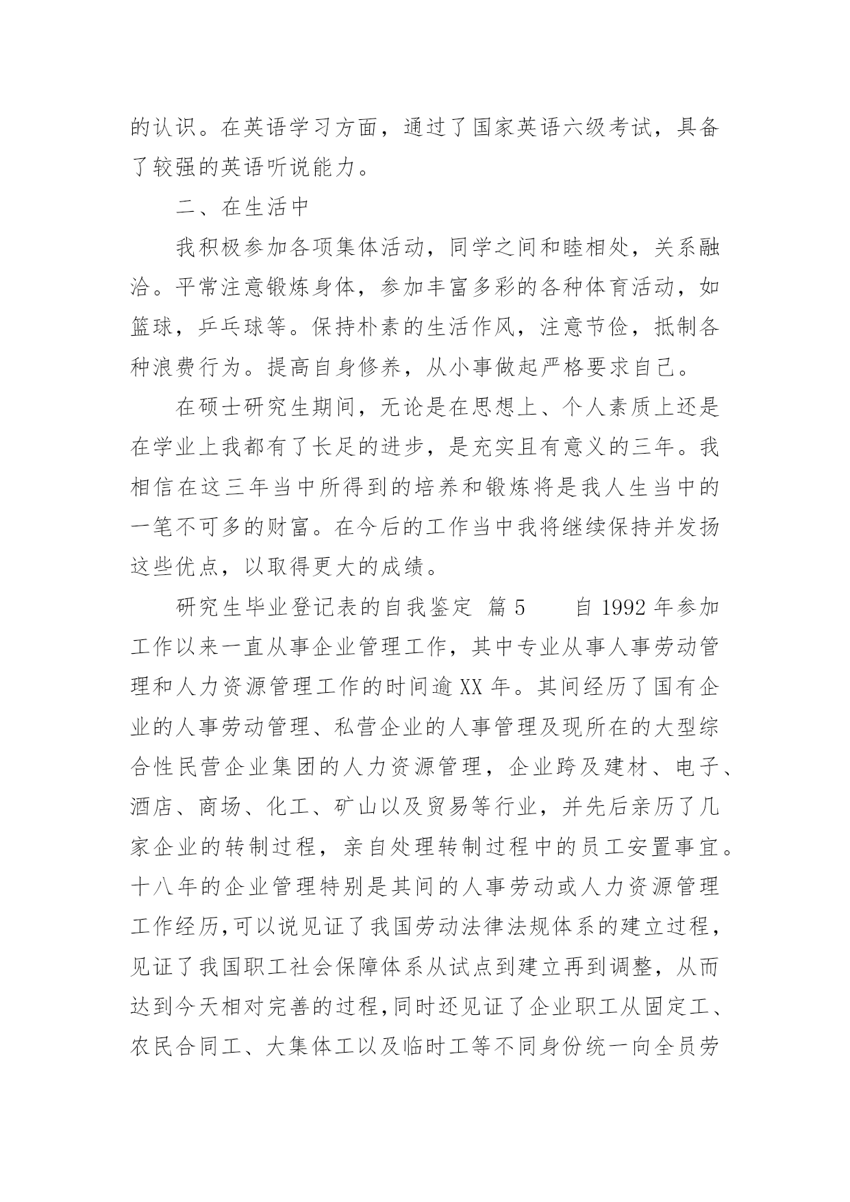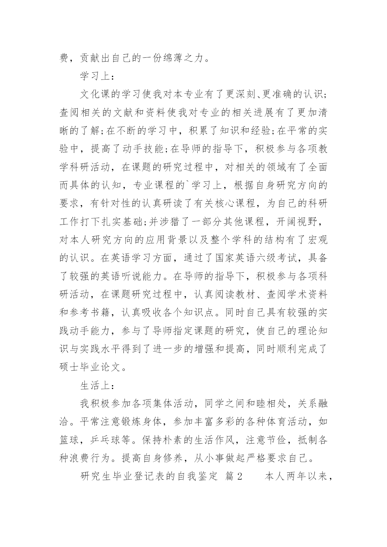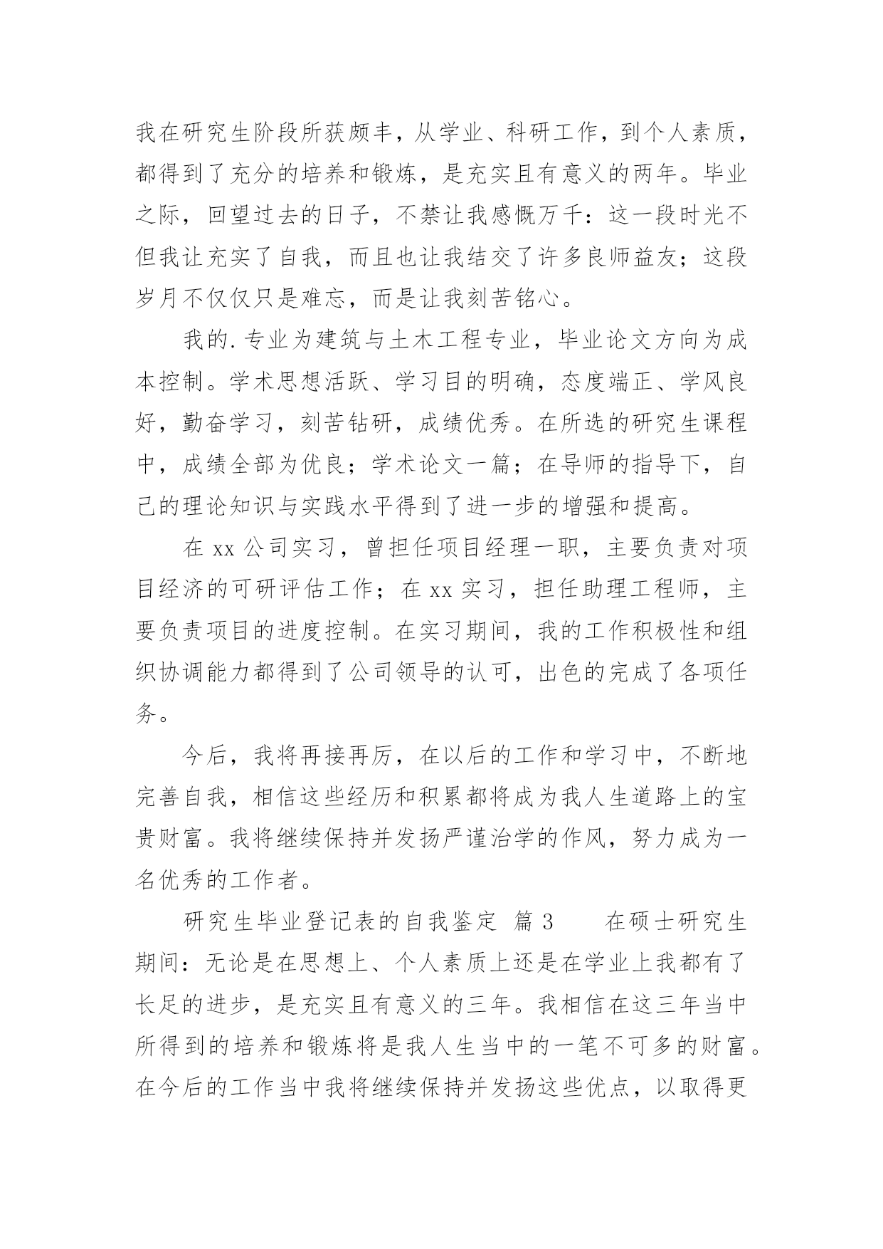 研究生毕业登记表的自我鉴定研究生毕业登记表的自我鉴定自我鉴定就是把一个时间段的个人情况进行一次全面系统的总结,它可以帮助我们了解自己的优点和缺点,让我们好好写一份自我鉴定总结一下吧。那么自我鉴定要注意有什么内容呢?下面是小编收集整理的研究生毕业登记表的自我鉴定,仅供参考,欢迎大家阅读。研究生毕业登记表的自我鉴定篇1在硕士研究生期间,无论是在思想上、个人素质上还是在学业上我都有了长足的进步,是充实且有意义的三年。我相信在这三年当中所得到的培养和锻炼将是我人生当中的一笔不可多的财富。在今后的工作当中我将继续保持并发扬这些优点,以取得更大的成绩。思想上:我一直积极要求进步。我是在XX年5月光荣地成为了一名预备党员,在进入xx大学后,通过本党支部同志的影响,带动,帮助,思想上有了更大的进步,并加深了我对建设有中国特色的社会主义理论和党的基本路线深刻的认识,进一步的树立了坚定的共产主义信念。经过党组织1年预备期的考察,于XX年年5月如期转为正式党员。在成为一名党员后我时刻牢记自己是一名党员,处处以身作则,以一名合格党员的要求严格规范自己的言行举止,自愿缴纳特殊党费,贡献出自己的一份绵薄之力。学习上:文化课的学习使我对本专业有了更深刻、更准确的认识;查阅相关的文献和资料使我对专业的相关进展有了更加清晰的了解;在不断的学习中,积累了知识和经验;在平常的实验中,提高了动手技能;在导师的指导下,积极参与各项教学科研活动,在课题的研究过程中,对相关的领域有了全面而具体的认知,专业课程的`学习上,根据自身研究方向的要求,有针对性的认真研读了有关核心课程,为自己的科研工作打下扎实基础;并涉猎了一部分其他课程,开阔视野,对本人研究方向的应用背景以及整个学科的结构有了宏观的认识。在英语学习方面,通过了国家英语六级考试,具备了较强的英语听说能力。在导师的指导下,积极参与各项科研活动,在课题研究过程中,认真阅读教材、查阅学术资料和参考书籍,认真吸收各个知识点。同时自己具有较强的实践动手能力,参与了导师指定课题的研究,使自己的理论知识与实践水平得到了进一步的增强和提高,同时顺利完成了硕士毕业论文。生活上:我积极参加各项集体活动,同学之间和睦相处,关系融洽。平常注意锻炼身体,参加丰富多彩的各种体育活动,如篮球,乒乓球等。保持朴素的生活作风,注意节俭,抵制各种浪费行为。提高自身修养,从小事做起严格要求自己。研究生毕业登记表的自我鉴定篇2本人两年以来,我在研究生阶段所获颇丰,从学业、科研工作,到个人素质,都得到了充分的培养和锻炼,是充实且有意义的两年。毕业之际,回望过去的日子,不禁让我感慨万千:这一段时光不但我让充实了自我,而且也让我结交了许多良师益友;这段岁月不仅仅只是难忘,而是让我刻苦铭心。我的.专业为建筑与土木工程专业,毕业论文方向为成本控制。学术思想活跃、学习目的明确,态度端正、学风良好,勤奋学习,刻苦钻研,成绩优秀。在所选的研究生课程中,成绩全部为优良;学术论文一篇;在导师的指导下,自己的理论知识与实践水平得到了进一步的增强和提高。在xx公司实习,曾担任项目经理一职,主要负责对项目经济的可研评估工作;在xx实习,担任助理工程师,主要负责项目的进度控制。在实习期间,我的工作积极性和组织协调能力都得到了公司领导的认可,出色的完成了各项任务。今后,我将再接再厉,在以后的工作和学习中,不断地完善自我,相信这些经历和积累都将成为我人生道路上的宝贵财富。我将继续保持并发扬严谨治学的作风,努力成为一名优秀的工作者。研究生毕业登记表的自我鉴定篇3在硕士研究生期间:无论是在思想上、个人素质上还是在学业上我都有了长足的进步,是充实且有意义的三年。我相信在这三年当中所得到的培养和锻炼将是我人生当中的一笔不可多的财富。在今后的工作当中我将继续保持并发扬这些优点,以取得更大的成绩。思想上:我一直积极要求进步。在xx年xx月光荣地成为了一名预备党员,在进入xx大学后,通过本党支部同志的影响,带动,帮助,思想上有了更大的进步,并加深了我对建设有中国特色的社会主义理论和党的基本路线深刻的`认识,进一步的树立了坚定的共产主义信念,经过党组织1年预备期的考察,于xx年xx月如期转为正式党员,在成为一名党员后我时刻牢记自己是一名党员,处处以身作则,以一名合格党员的要求严格规范自己的言行举止,在这次汶川大地震后能积极捐款,自愿缴纳特殊党费,贡献出自己的一份绵薄之力。学习上:文化课的学习使我对本专业有了更深刻、更准确的认识;查阅相关的文献和资料使我对专业的相关进展有了更加清晰的了解;在不断的学习中,积累了知识和经验;在平常的实验中,提高了动手技能;在导师的指导下,积极参与各项教学科研活动,在课题的研究过程中,对相关的领域有了全面而具体的认知。专业课程的学习上,根据自身研究方向的要求,有针对性的