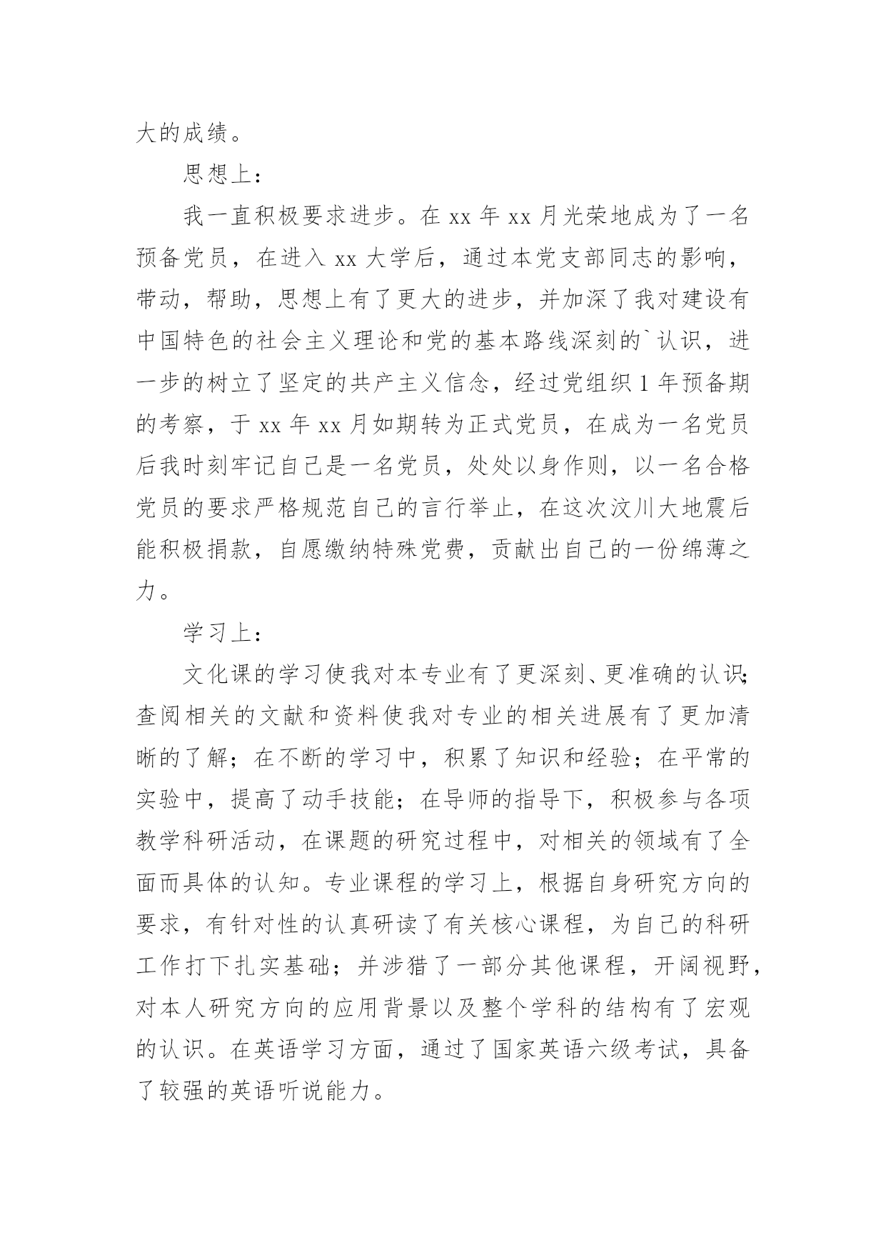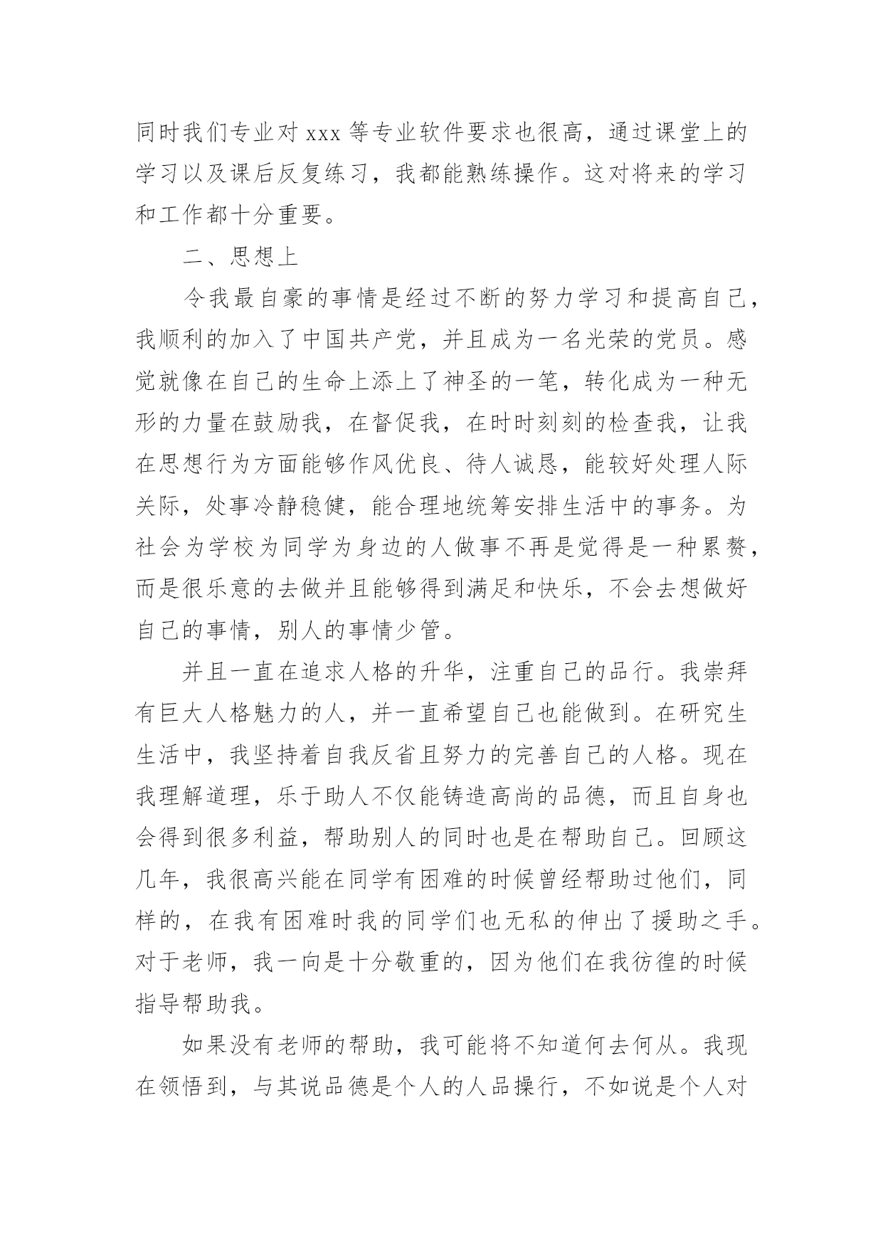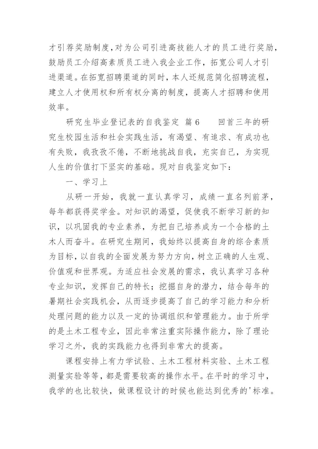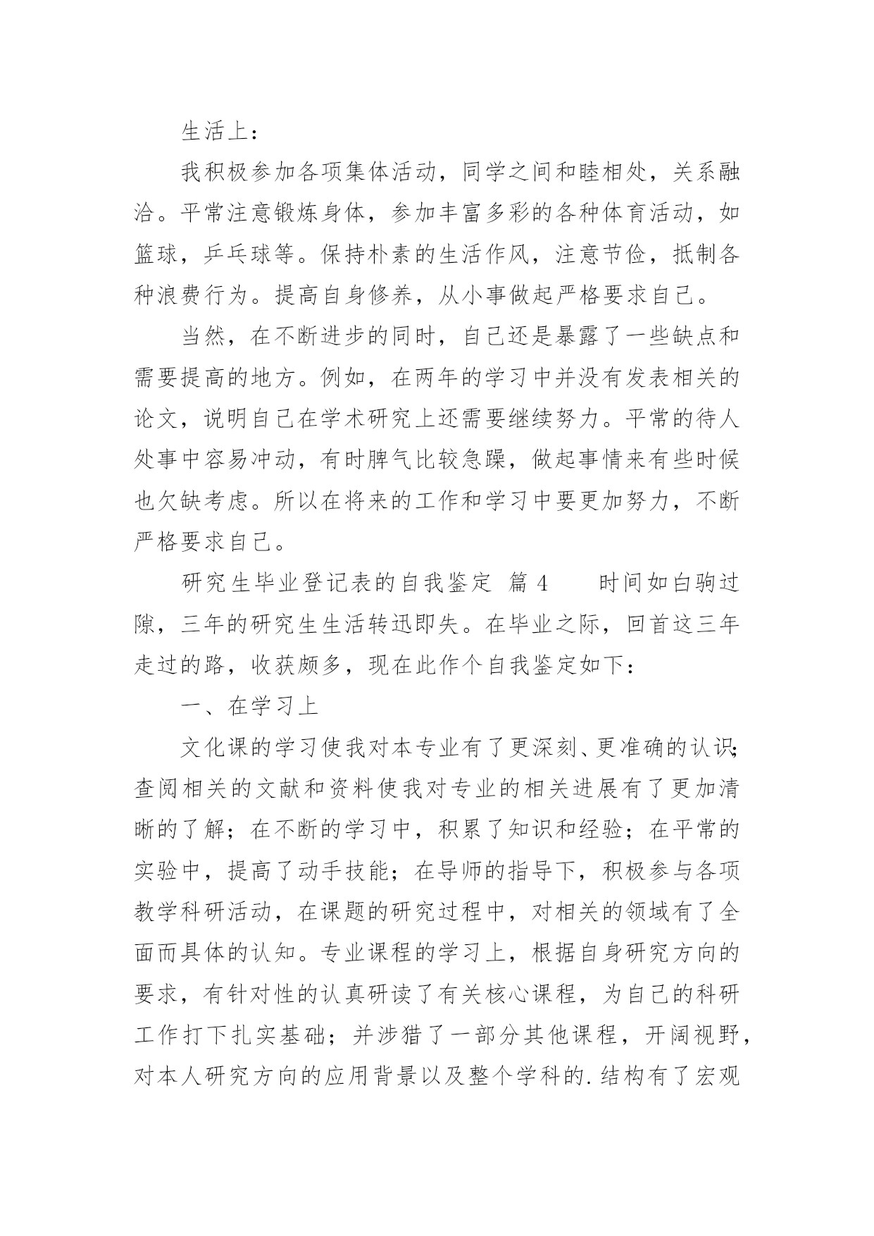 研究生毕业登记表的自我鉴定研究生毕业登记表的自我鉴定自我鉴定就是把一个时间段的个人情况进行一次全面系统的总结,它可以帮助我们了解自己的优点和缺点,让我们好好写一份自我鉴定总结一下吧。那么自我鉴定要注意有什么内容呢?下面是小编收集整理的研究生毕业登记表的自我鉴定,仅供参考,欢迎大家阅读。研究生毕业登记表的自我鉴定篇1在硕士研究生期间,无论是在思想上、个人素质上还是在学业上我都有了长足的进步,是充实且有意义的三年。我相信在这三年当中所得到的培养和锻炼将是我人生当中的一笔不可多的财富。在今后的工作当中我将继续保持并发扬这些优点,以取得更大的成绩。思想上:我一直积极要求进步。我是在XX年5月光荣地成为了一名预备党员,在进入xx大学后,通过本党支部同志的影响,带动,帮助,思想上有了更大的进步,并加深了我对建设有中国特色的社会主义理论和党的基本路线深刻的认识,进一步的树立了坚定的共产主义信念。经过党组织1年预备期的考察,于XX年年5月如期转为正式党员。在成为一名党员后我时刻牢记自己是一名党员,处处以身作则,以一名合格党员的要求严格规范自己的言行举止,自愿缴纳特殊党费,贡献出自己的一份绵薄之力。学习上:文化课的学习使我对本专业有了更深刻、更准确的认识;查阅相关的文献和资料使我对专业的相关进展有了更加清晰的了解;在不断的学习中,积累了知识和经验;在平常的实验中,提高了动手技能;在导师的指导下,积极参与各项教学科研活动,在课题的研究过程中,对相关的领域有了全面而具体的认知,专业课程的`学习上,根据自身研究方向的要求,有针对性的认真研读了有关核心课程,为自己的科研工作打下扎实基础;并涉猎了一部分其他课程,开阔视野,对本人研究方向的应用背景以及整个学科的结构有了宏观的认识。在英语学习方面,通过了国家英语六级考试,具备了较强的英语听说能力。在导师的指导下,积极参与各项科研活动,在课题研究过程中,认真阅读教材、查阅学术资料和参考书籍,认真吸收各个知识点。同时自己具有较强的实践动手能力,参与了导师指定课题的研究,使自己的理论知识与实践水平得到了进一步的增强和提高,同时顺利完成了硕士毕业论文。生活上:我积极参加各项集体活动,同学之间和睦相处,关系融洽。平常注意锻炼身体,参加丰富多彩的各种体育活动,如篮球,乒乓球等。保持朴素的生活作风,注意节俭,抵制各种浪费行为。提高自身修养,从小事做起严格要求自己。研究生毕业登记表的自我鉴定篇2本人两年以来,我在研究生阶段所获颇丰,从学业、科研工作,到个人素质,都得到了充分的培养和锻炼,是充实且有意义的两年。毕业之际,回望过去的日子,不禁让我感慨万千:这一段时光不但我让充实了自我,而且也让我结交了许多良师益友;这段岁月不仅仅只是难忘,而是让我刻苦铭心。我的.专业为建筑与土木工程专业,毕业论文方向为成本控制。学术思想活跃、学习目的明确,态度端正、学风良好,勤奋学习,刻苦钻研,成绩优秀。在所选的研究生课程中,成绩全部为优良;学术论文一篇;在导师的指导下,自己的理论知识与实践水平得到了进一步的增强和提高。在xx公司实习,曾担任项目经理一职,主要负责对项目经济的可研评估工作;在xx实习,担任助理工程师,主要负责项目的进度控制。在实习期间,我的工作积极性和组织协调能力都得到了公司领导的认可,出色的完成了各项任务。今后,我将再接再厉,在以后的工作和学习中,不断地完善自我,相信这些经历和积累都将成为我人生道路上的宝贵财富。我将继续保持并发扬严谨治学的作风,努力成为一名优秀的工作者。研究生毕业登记表的自我鉴定篇3在硕士研究生期间:无论是在思想上、个人素质上还是在学业上我都有了长足的进步,是充实且有意义的三年。我相信在这三年当中所得到的培养和锻炼将是我人生当中的一笔不可多的财富。在今后的工作当中我将继续保持并发扬这些优点,以取得更大的成绩。思想上:我一直积极要求进步。在xx年xx月光荣地成为了一名预备党员,在进入xx大学后,通过本党支部同志的影响,带动,帮助,思想上有了更大的进步,并加深了我对建设有中国特色的社会主义理论和党的基本路线深刻的`认识,进一步的树立了坚定的共产主义信念,经过党组织1年预备期的考察,于xx年xx月如期转为正式党员,在成为一名党员后我时刻牢记自己是一名党员,处处以身作则,以一名合格党员的要求严格规范自己的言行举止,在这次汶川大地震后能积极捐款,自愿缴纳特殊党费,贡献出自己的一份绵薄之力。学习上:文化课的学习使我对本专业有了更深刻、更准确的认识;查阅相关的文献和资料使我对专业的相关进展有了更加清晰的了解;在不断的学习中,积累了知识和经验;在平常的实验中,提高了动手技能;在导师的指导下,积极参与各项教学科研活动,在课题的研究过程中,对相关的领域有了全面而具体的认知。专业课程的学习上,根据自身研究方向的要求,有针对性的