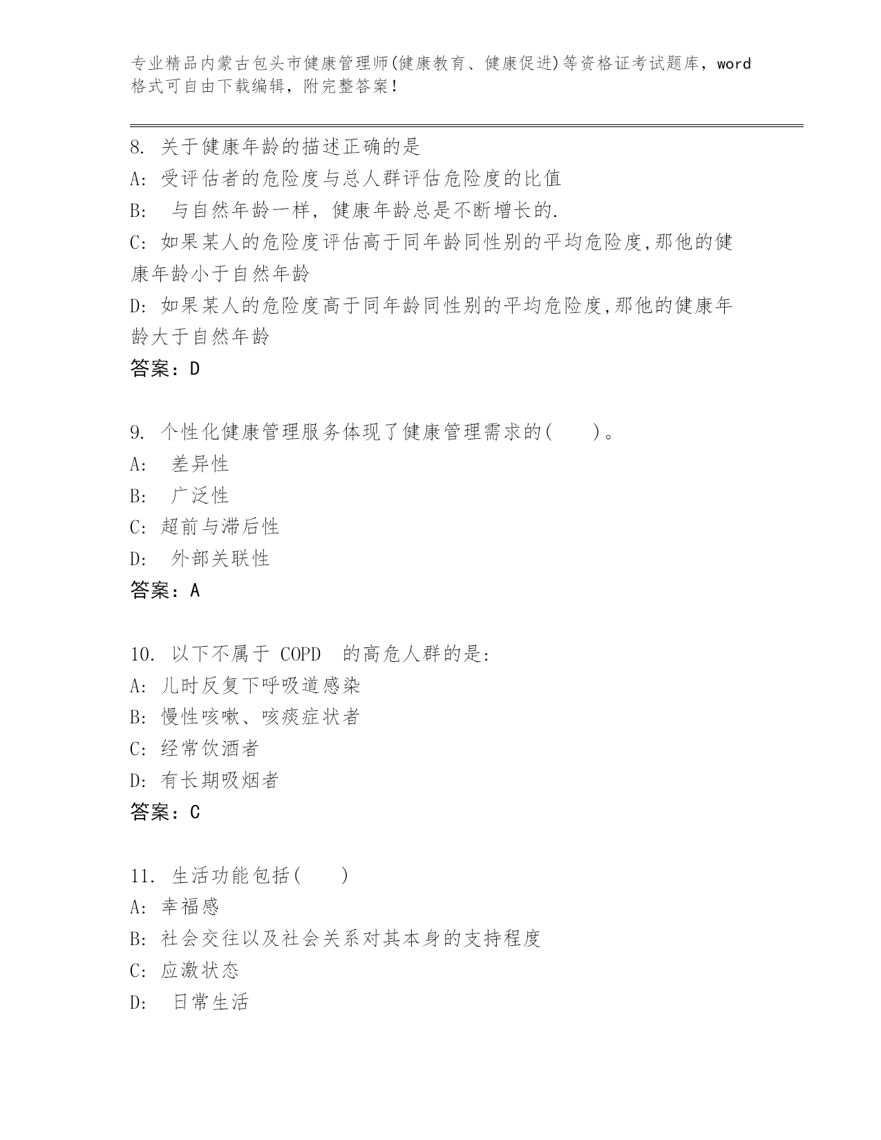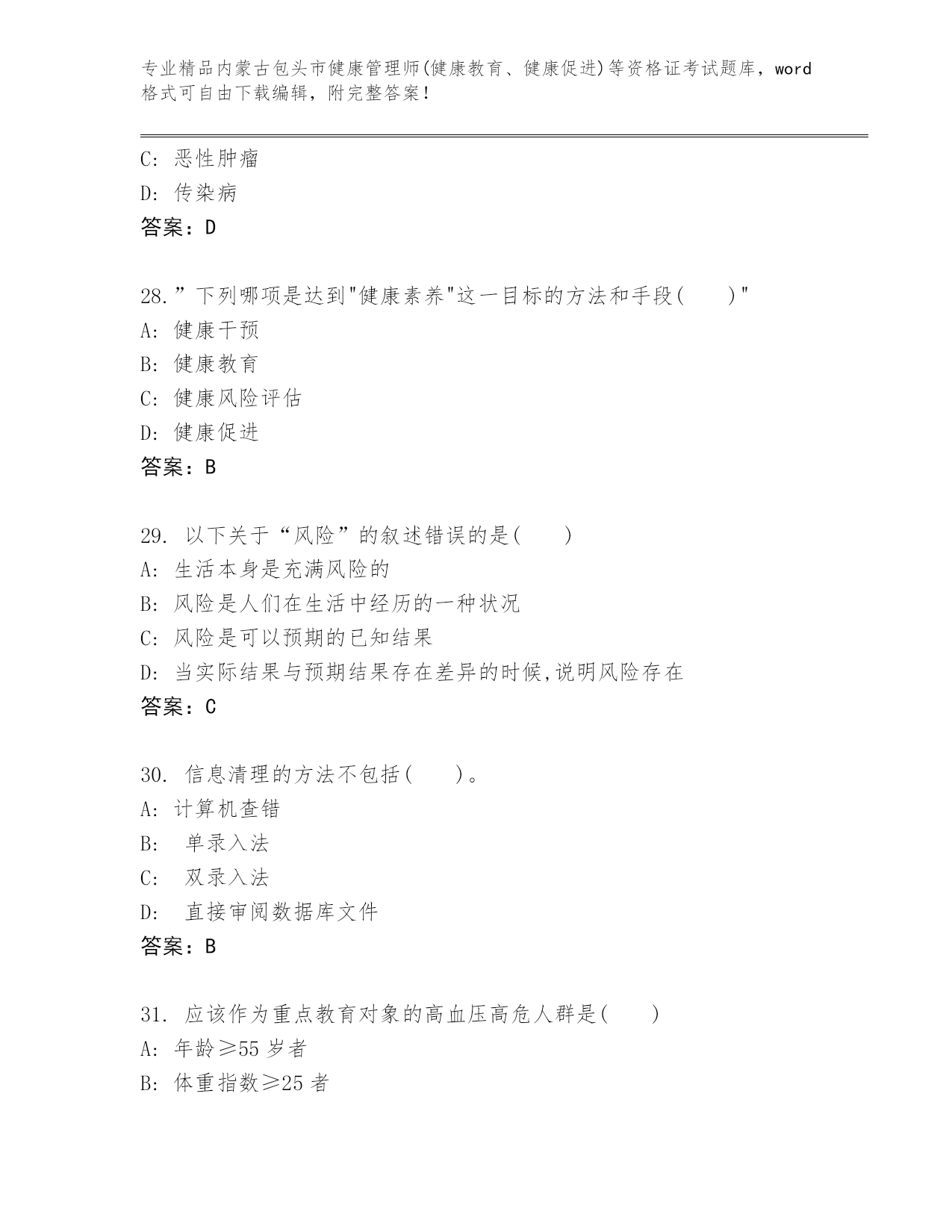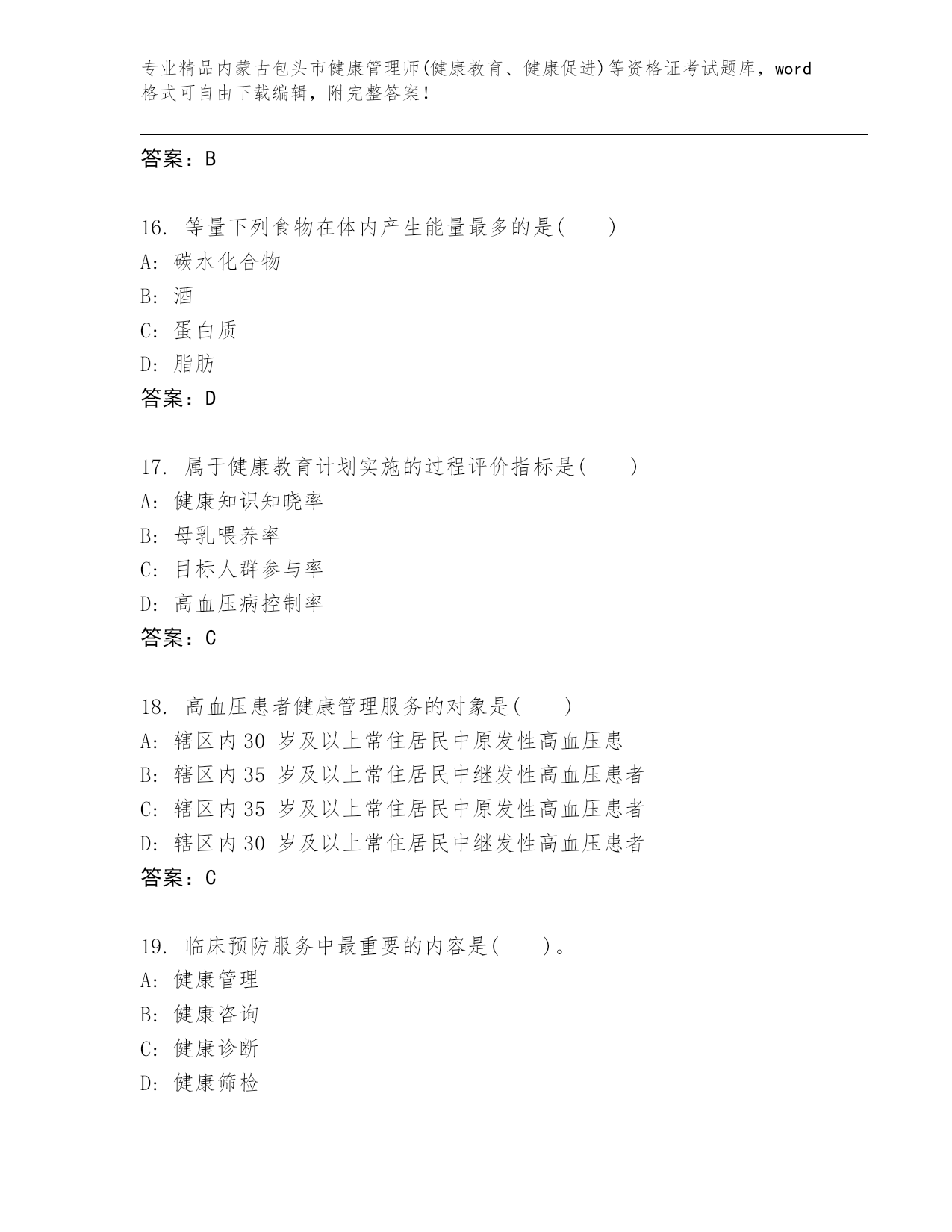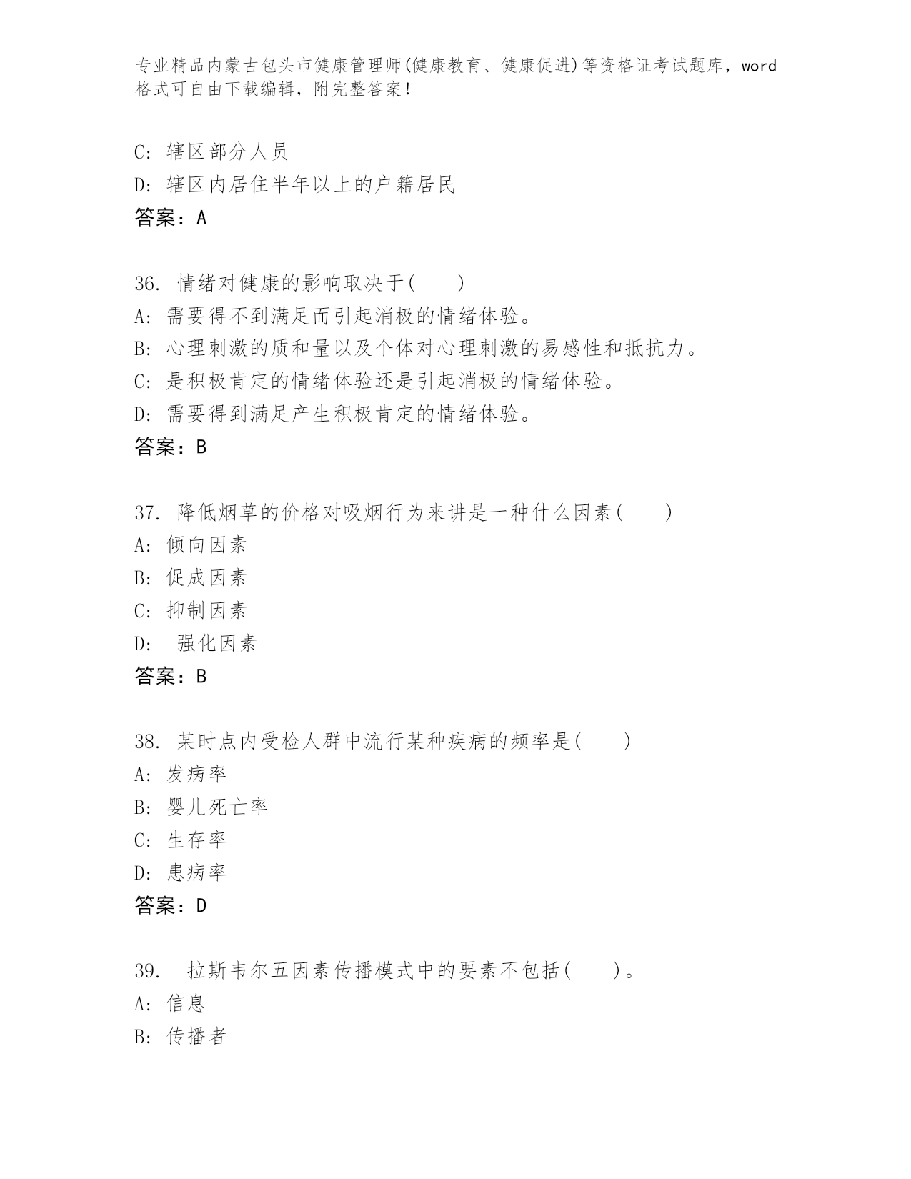 完整版内蒙古包头市健康管理师(健康教育、健康促进)等资格证考试大全及答案.docx