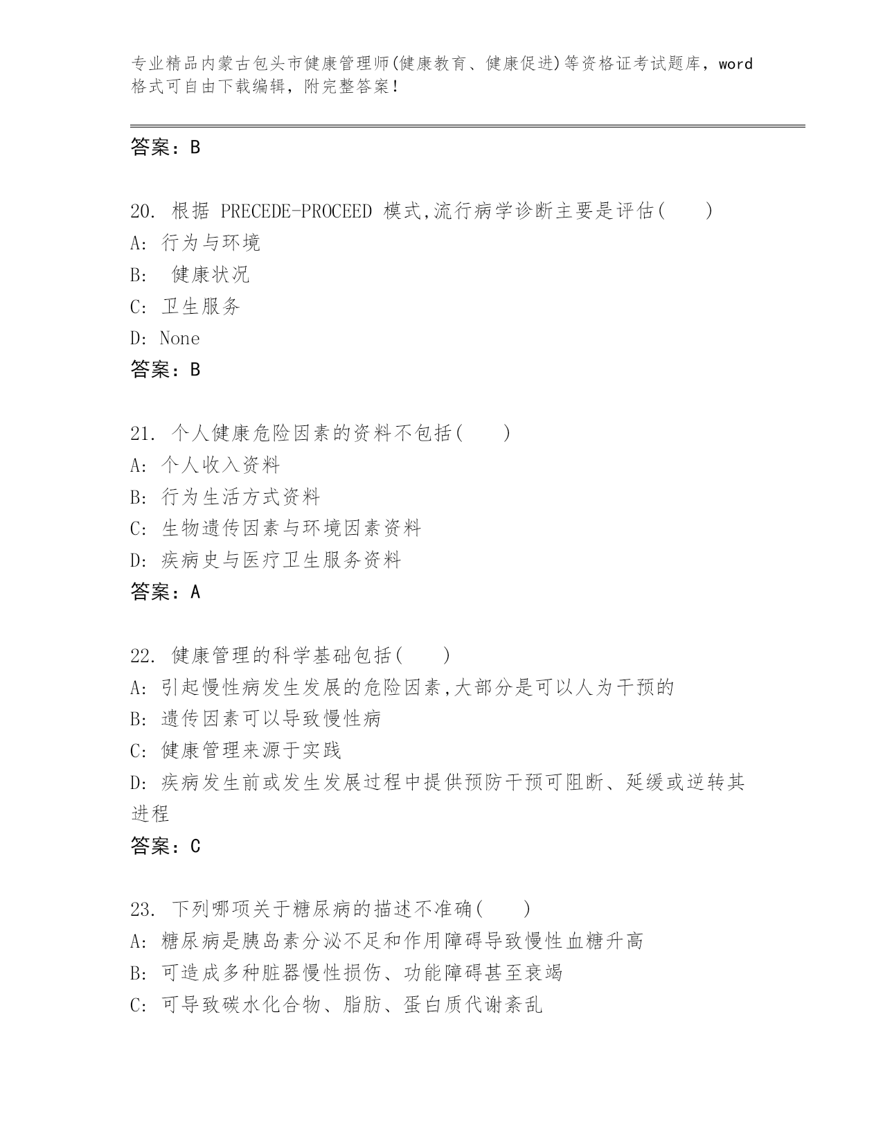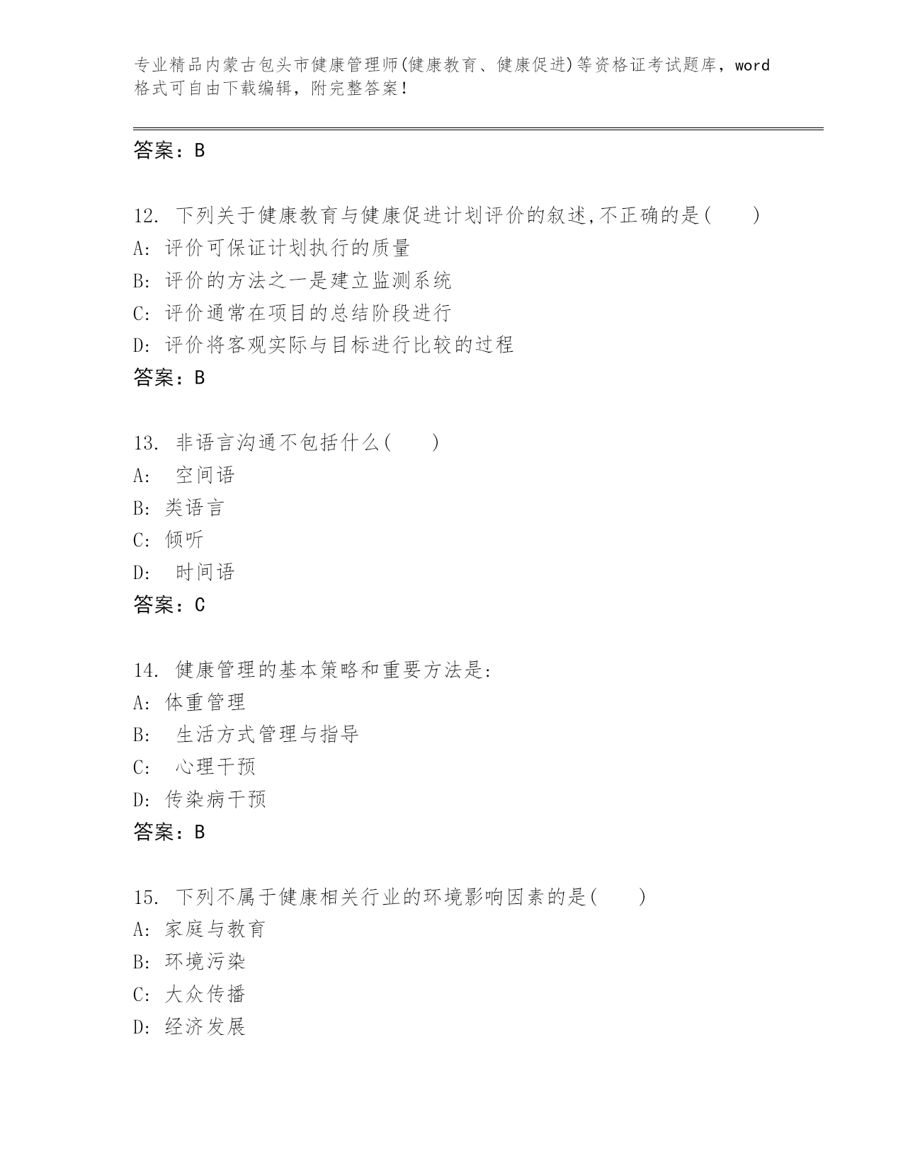 完整版内蒙古包头市健康管理师(健康教育、健康促进)等资格证考试大全及答案