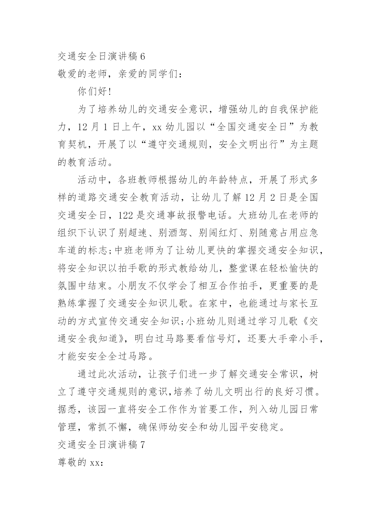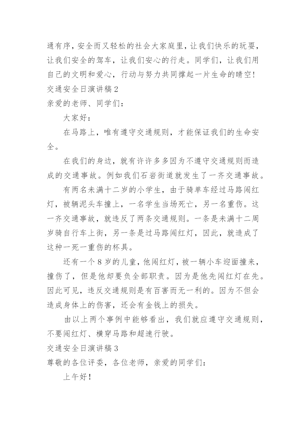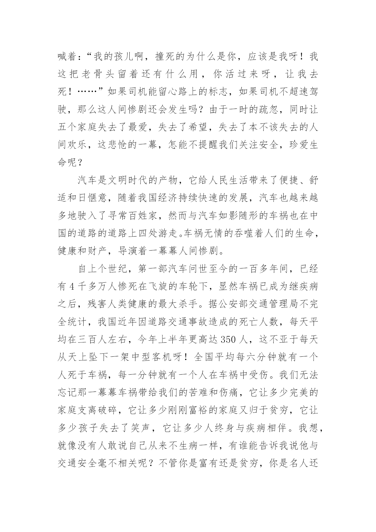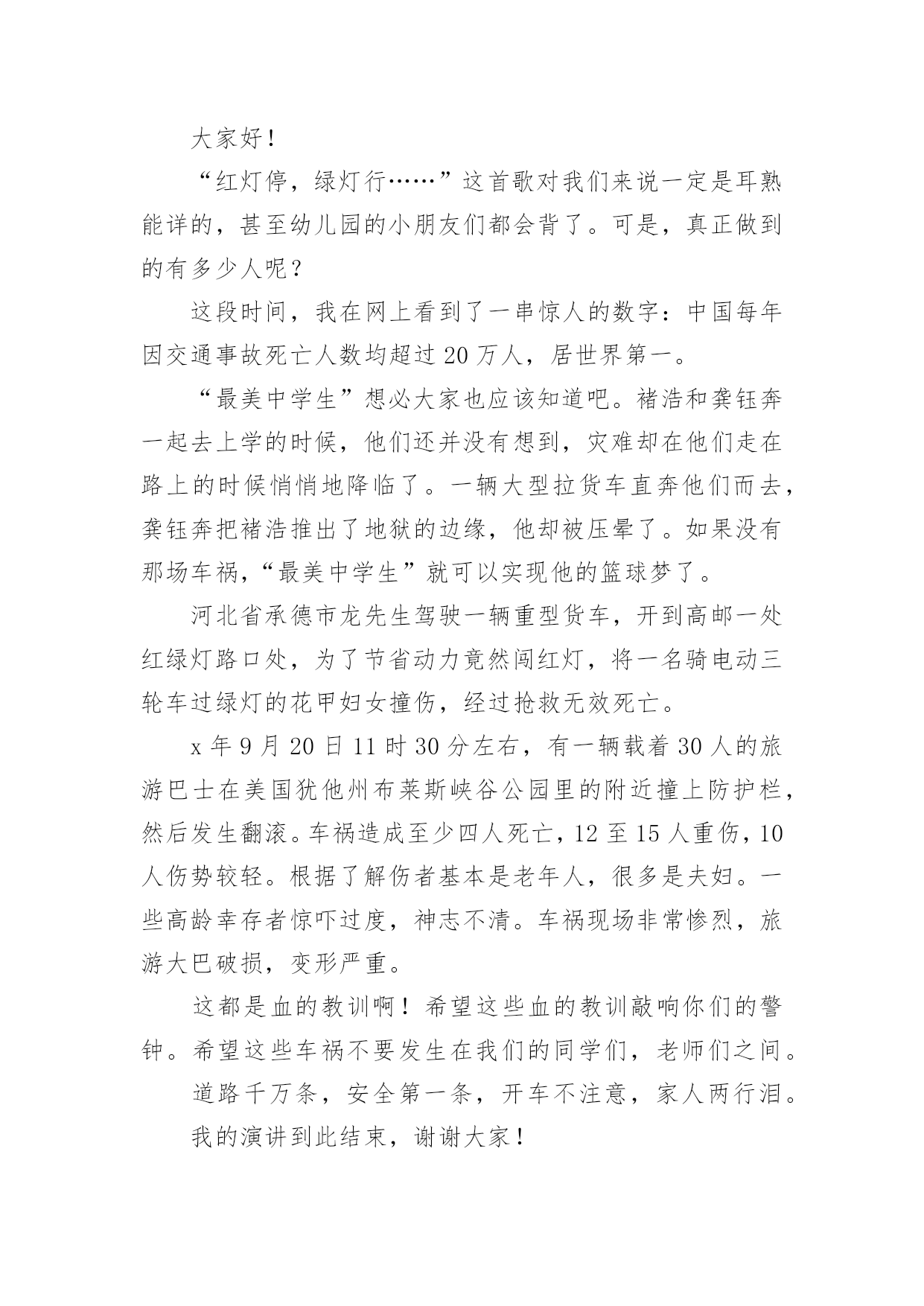 交通安全日演讲稿交通安全日演讲稿演讲稿具有逻辑严密,态度明确,观点鲜明的特点。在不断进步的社会中,能够利用到演讲稿的场合越来越多,那么你有了解过演讲稿吗?以下是小编帮大家整理的交通安全日演讲稿,仅供参考,大家一起来看看吧。交通安全日演讲稿1亲爱的同学们:大家好!今天我站在这个演讲台上,既紧张又兴奋。紧张是因为我从来没有参加过演讲,而且是在广庭大众之下演讲;兴奋是因为能有这样的一个机会,和同学们一起学习交通安全法规。虽然我没有华丽的辞藻,但我希望我真诚的话语能唤醒同学们对交通安全法规的对生命的珍爱。先讲一个故事吧。几个学者与一个老者同船共渡。学者们问老者是否懂得什么是哲学,老者连连摇头。学者们纷纷叹息:那你已经失去了一半的生命。这时一个巨浪打来,小船被掀翻了,老者问:“你们会不会游泳啊?”学者们异口同声地说不会。老者叹口气说:“那你们就失去了全部的生命。”虽然这只是一个故事,但其中蕴含的哲理却耐人寻味。灾难的发生对每个人来说,不分贫富贵贱,不论性别年龄。孩子、学子、工人、知识分子,人民公仆……无论咿呀学语,还是学富五车,无论幼小纤弱,还是身强力壮,如果缺少应有的警惕,不懂起码的安全常识,那么,危险一旦降临,本来有可能逃离的厄运,却都会在意料之外、客观之中发生了。同学们!当你因为路口没有车辆而在红灯下穿越马路,你是否想过你已经走到了危险的边缘?当你骑车在路上抱怨行驶太慢,想超过前面的车辆,你是否想起每年有多少司机因为违章超车而命丧黄泉?当你抱怨规定太多,交警太严,你又是否想过,如果不是这样,这份车轮底下的死亡报告还将带给人们多少的震惊和血腥?同学们,伊拉克战争历时两年,死亡4万余人,而你们是否发现每年10.9万的车祸死亡人数,是一个比战争还要冷冰冰的无情的数字。不知大家又是否知道:按照规定路线方向行驶,不闯红灯,不超速,不醉酒驾车,不横穿马路等等,这些非常简单的做法,既是遵守交通规则表现,也是一种文明的行为。因为这样您不仅保障了自己出行的安全,也是尊重他人生命的表现。遵章守纪,就是尊重生命,尊重自我。当我们能做到这一切的时候,我们的社会便向文明的彼岸又靠近了一步。重视交通安全,是我们每个人的义务,更是我们每个人的责任。让我们携起手来呵护这文明之花,让我们远离伤痛,珍爱彼此的生命吧。我们每一个人的生命都是宝贵的,让我们每一个人自觉遵守交通规则,珍惜和尊重我们彼此的生命,如果你想让我们这个世界多一些笑声,少一点哭声。让我们共同生活在交通有序,安全而又轻松的社会大家庭里,让我们快乐的玩耍,让我们安全的驾车,让我们安心的行走。同学们,让我们用自己的文明和爱心,行动与努力共同撑起一片生命的晴空!交通安全日演讲稿2亲爱的老师、同学们:大家好:在马路上,唯有遵守交通规则,才能保证我们的生命安全。在我们的身边,就有许许多多因为不遵守交通规则而造成的交通事故。例如我们石岩街道就发生了一齐交通事故。有两名未满十二岁的小学生,由于骑单车经过马路闯红灯,被辆泥头车撞上,一名学生当场死亡,另一名重伤。这一齐交通事故,就违反了两条交通规则。一条是未满十二周岁骑自行车上街,另一条是过马路闯红灯,因此,就造成了这种一死一重伤的杯具。还有一个8岁的儿童,他闯红灯,被一辆小车迎面撞来,撞伤了,但是他却要负全部职责。因为是他先闯红灯在先。因此可见,违反交通规则是有百害而无一利的。因为不但会造成身体上的伤害,还会有金钱上的损失。由以上两个事例中能够看出,我们就应遵守交通规则,不要闯红灯、横穿马路和超速行驶。交通安全日演讲稿3尊敬的各位评委,各位老师,亲爱的同学们:上午好!我是来自北京工商大学的xx,很高兴有机会能和各位共同关注道路交通安全法,一起创造文明顺畅的交通环境。今日我演讲的题目是《文明相伴,幸福相随》,当我走上讲台,面对着你,我亲爱的朋友,知道我在想什么吗?我想到了生命。生命是美好的,生命为我们孕育着未来,生命为我们创造无穷的价值,生命为我们支撑起一个光彩夺目的世界。但是面对着可贵的生命,有时我们却那样的轻视。一个年仅28岁的小伙子,,从家乡千里迢迢到上海打工,由于表现出色,很快成为了单位的负责人。一个月1600元的工资,足以养活一家人。妻子抱着环抱中的婴儿也来到了上海,给他洗衣,做饭,一家人过着前所未有的甜蜜生活,可如今,这一切都破灭了,而造成这一切后果的,却是小伙子自己——x年的冬天,那个再平常不过的日子,小伙子他下班太迟,着急回家,骑上自行车抄近路,不顾一切地上了高架路,而且还是逆向穿行!惨剧发生了,一辆迎面疾驶的汽车将他撞出了几十米远,这哪里是条近路,这分明是一条通向死亡的不归路啊!所有美好的憧憬,所有对未来的期盼,就在这一瞬间化为了灰烬。怀抱婴儿的年轻妻子该如何面对这残酷的现实。如果小伙子不这样着急,如果他不上高架路,如果他不逆向行使,如果在他心中