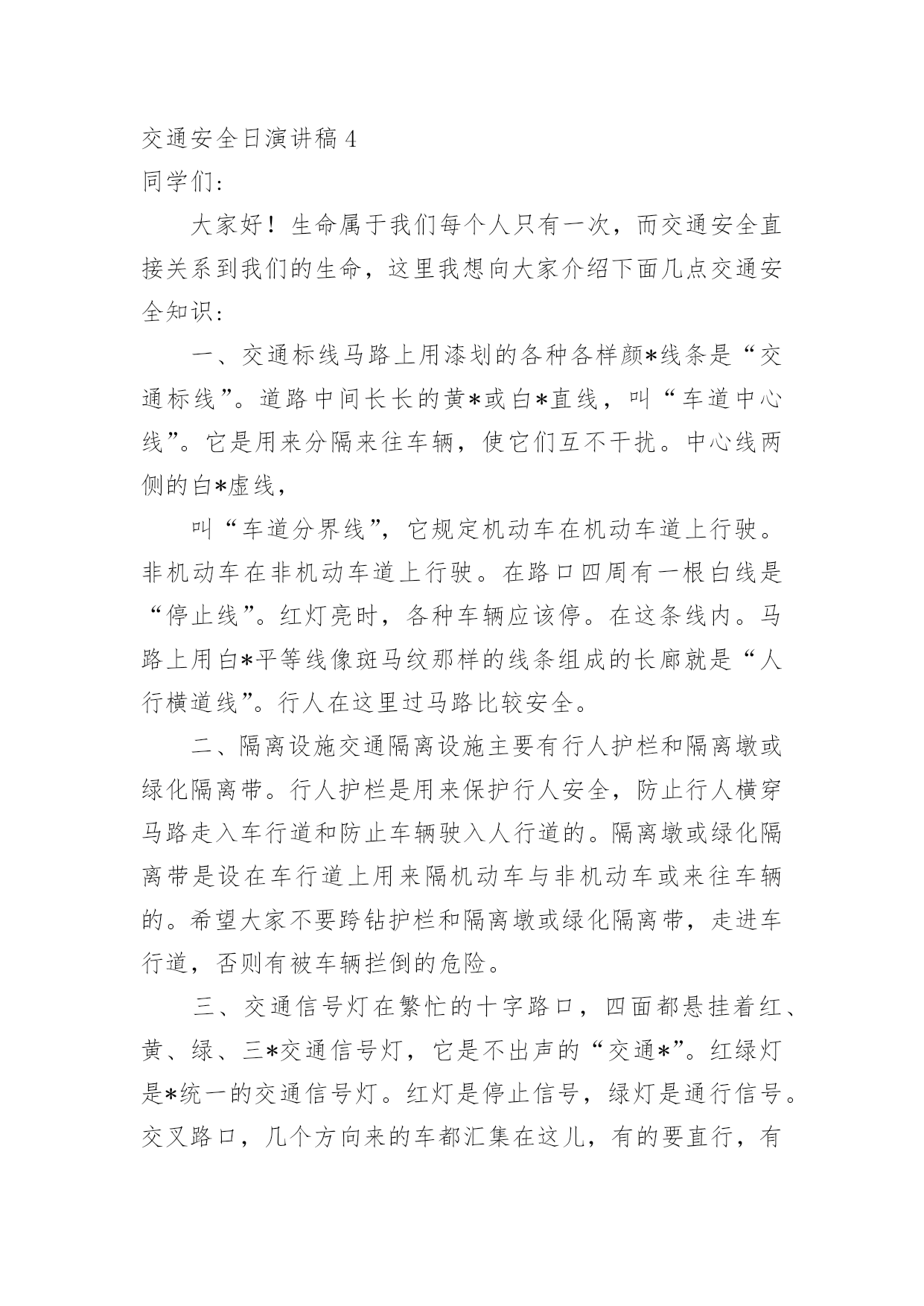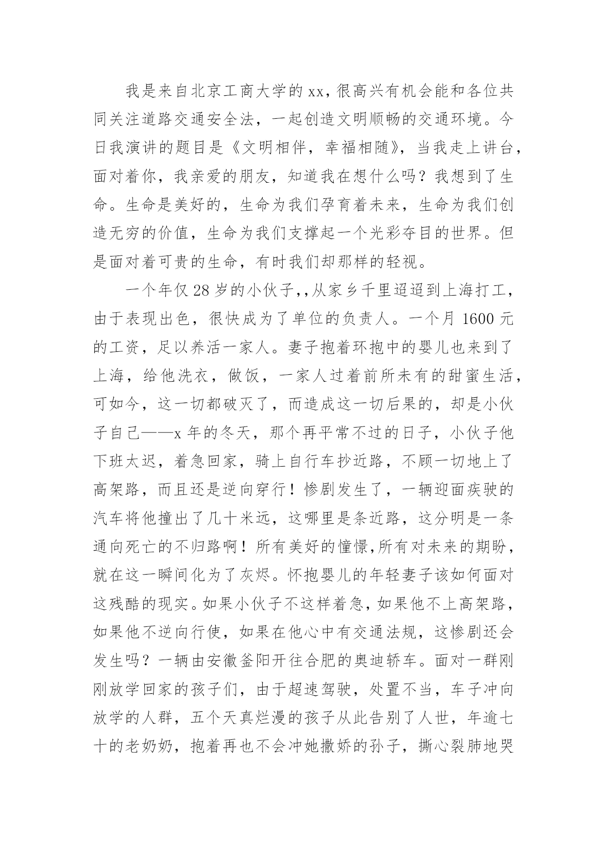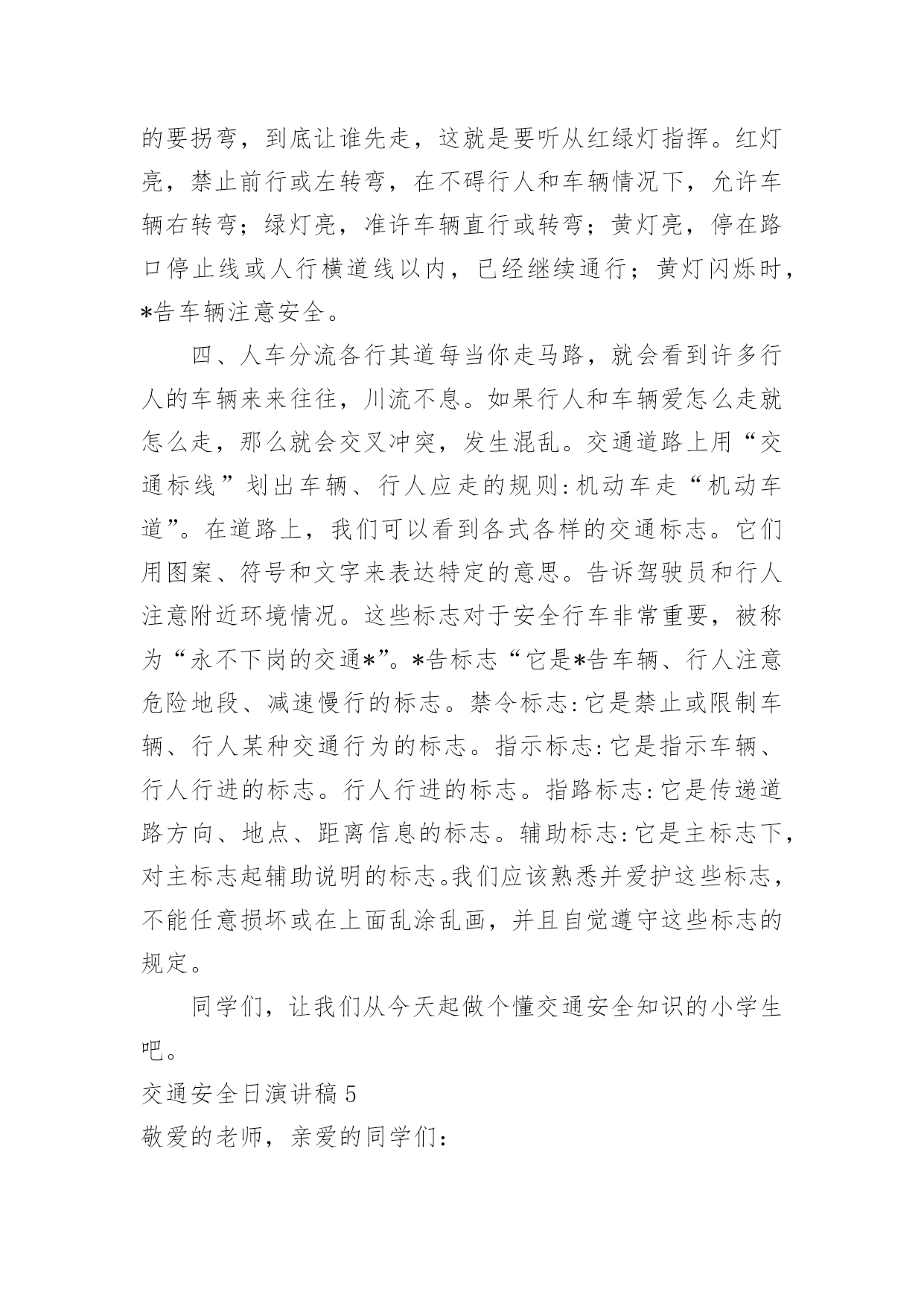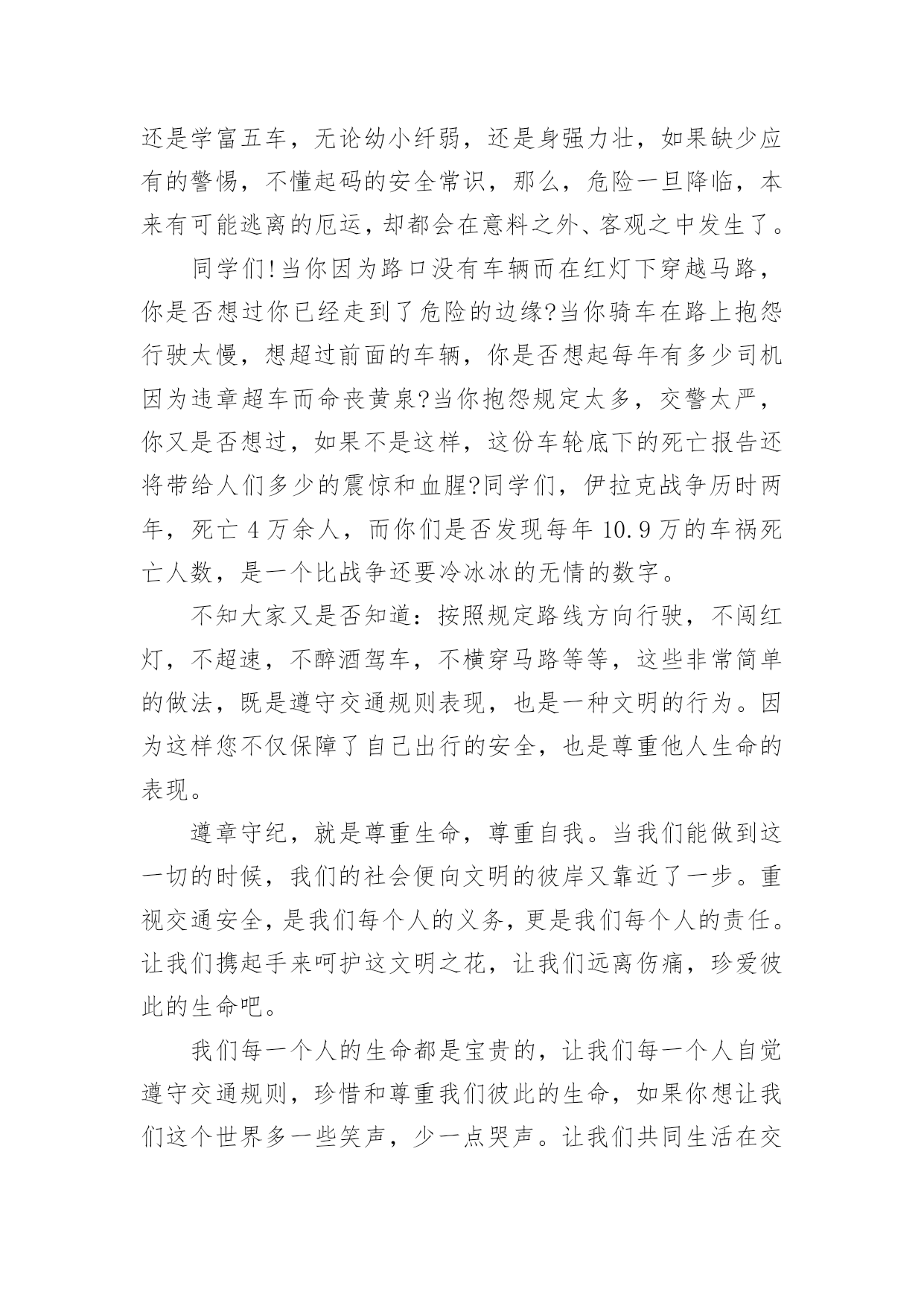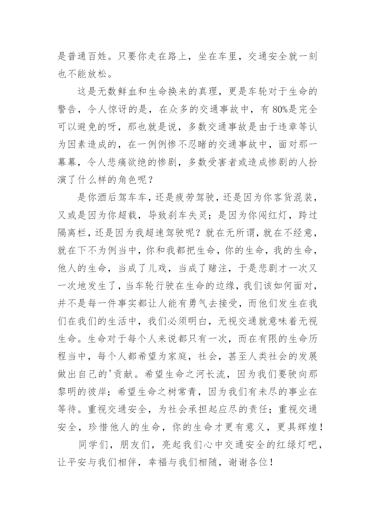 交通安全日演讲稿交通安全日演讲稿演讲稿具有逻辑严密,态度明确,观点鲜明的特点。在不断进步的社会中,能够利用到演讲稿的场合越来越多,那么你有了解过演讲稿吗?以下是小编帮大家整理的交通安全日演讲稿,仅供参考,大家一起来看看吧。交通安全日演讲稿1亲爱的同学们:大家好!今天我站在这个演讲台上,既紧张又兴奋。紧张是因为我从来没有参加过演讲,而且是在广庭大众之下演讲;兴奋是因为能有这样的一个机会,和同学们一起学习交通安全法规。虽然我没有华丽的辞藻,但我希望我真诚的话语能唤醒同学们对交通安全法规的对生命的珍爱。先讲一个故事吧。几个学者与一个老者同船共渡。学者们问老者是否懂得什么是哲学,老者连连摇头。学者们纷纷叹息:那你已经失去了一半的生命。这时一个巨浪打来,小船被掀翻了,老者问:“你们会不会游泳啊?”学者们异口同声地说不会。老者叹口气说:“那你们就失去了全部的生命。”虽然这只是一个故事,但其中蕴含的哲理却耐人寻味。灾难的发生对每个人来说,不分贫富贵贱,不论性别年龄。孩子、学子、工人、知识分子,人民公仆……无论咿呀学语,还是学富五车,无论幼小纤弱,还是身强力壮,如果缺少应有的警惕,不懂起码的安全常识,那么,危险一旦降临,本来有可能逃离的厄运,却都会在意料之外、客观之中发生了。同学们!当你因为路口没有车辆而在红灯下穿越马路,你是否想过你已经走到了危险的边缘?当你骑车在路上抱怨行驶太慢,想超过前面的车辆,你是否想起每年有多少司机因为违章超车而命丧黄泉?当你抱怨规定太多,交警太严,你又是否想过,如果不是这样,这份车轮底下的死亡报告还将带给人们多少的震惊和血腥?同学们,伊拉克战争历时两年,死亡4万余人,而你们是否发现每年10.9万的车祸死亡人数,是一个比战争还要冷冰冰的无情的数字。不知大家又是否知道:按照规定路线方向行驶,不闯红灯,不超速,不醉酒驾车,不横穿马路等等,这些非常简单的做法,既是遵守交通规则表现,也是一种文明的行为。因为这样您不仅保障了自己出行的安全,也是尊重他人生命的表现。遵章守纪,就是尊重生命,尊重自我。当我们能做到这一切的时候,我们的社会便向文明的彼岸又靠近了一步。重视交通安全,是我们每个人的义务,更是我们每个人的责任。让我们携起手来呵护这文明之花,让我们远离伤痛,珍爱彼此的生命吧。我们每一个人的生命都是宝贵的,让我们每一个人自觉遵守交通规则,珍惜和尊重我们彼此的生命,如果你想让我们这个世界多一些笑声,少一点哭声。让我们共同生活在交通有序,安全而又轻松的社会大家庭里,让我们快乐的玩耍,让我们安全的驾车,让我们安心的行走。同学们,让我们用自己的文明和爱心,行动与努力共同撑起一片生命的晴空!交通安全日演讲稿2亲爱的老师、同学们:大家好:在马路上,唯有遵守交通规则,才能保证我们的生命安全。在我们的身边,就有许许多多因为不遵守交通规则而造成的交通事故。例如我们石岩街道就发生了一齐交通事故。有两名未满十二岁的小学生,由于骑单车经过马路闯红灯,被辆泥头车撞上,一名学生当场死亡,另一名重伤。这一齐交通事故,就违反了两条交通规则。一条是未满十二周岁骑自行车上街,另一条是过马路闯红灯,因此,就造成了这种一死一重伤的杯具。还有一个8岁的儿童,他闯红灯,被一辆小车迎面撞来,撞伤了,但是他却要负全部职责。因为是他先闯红灯在先。因此可见,违反交通规则是有百害而无一利的。因为不但会造成身体上的伤害,还会有金钱上的损失。由以上两个事例中能够看出,我们就应遵守交通规则,不要闯红灯、横穿马路和超速行驶。交通安全日演讲稿3尊敬的各位评委,各位老师,亲爱的同学们:上午好!我是来自北京工商大学的xx,很高兴有机会能和各位共同关注道路交通安全法,一起创造文明顺畅的交通环境。今日我演讲的题目是《文明相伴,幸福相随》,当我走上讲台,面对着你,我亲爱的朋友,知道我在想什么吗?我想到了生命。生命是美好的,生命为我们孕育着未来,生命为我们创造无穷的价值,生命为我们支撑起一个光彩夺目的世界。但是面对着可贵的生命,有时我们却那样的轻视。一个年仅28岁的小伙子,,从家乡千里迢迢到上海打工,由于表现出色,很快成为了单位的负责人。一个月1600元的工资,足以养活一家人。妻子抱着环抱中的婴儿也来到了上海,给他洗衣,做饭,一家人过着前所未有的甜蜜生活,可如今,这一切都破灭了,而造成这一切后果的,却是小伙子自己——x年的冬天,那个再平常不过的日子,小伙子他下班太迟,着急回家,骑上自行车抄近路,不顾一切地上了高架路,而且还是逆向穿行!惨剧发生了,一辆迎面疾驶的汽车将他撞出了几十米远,这哪里是条近路,这分明是一条通向死亡的不归路啊!所有美好的憧憬,所有对未来的期盼,就在这一瞬间化为了灰烬。怀抱婴儿的年轻妻子该如何面对这残酷的现实。如果小伙子不这样着急,如果他不上高架路,如果他不逆向行使,如果在他心中