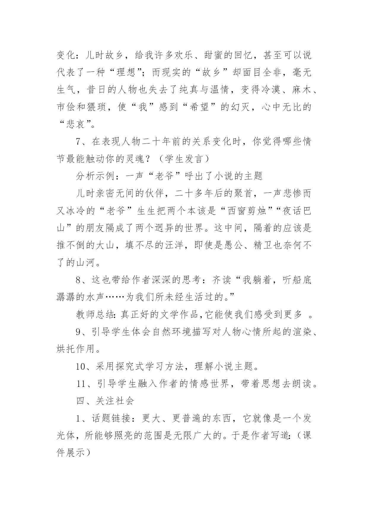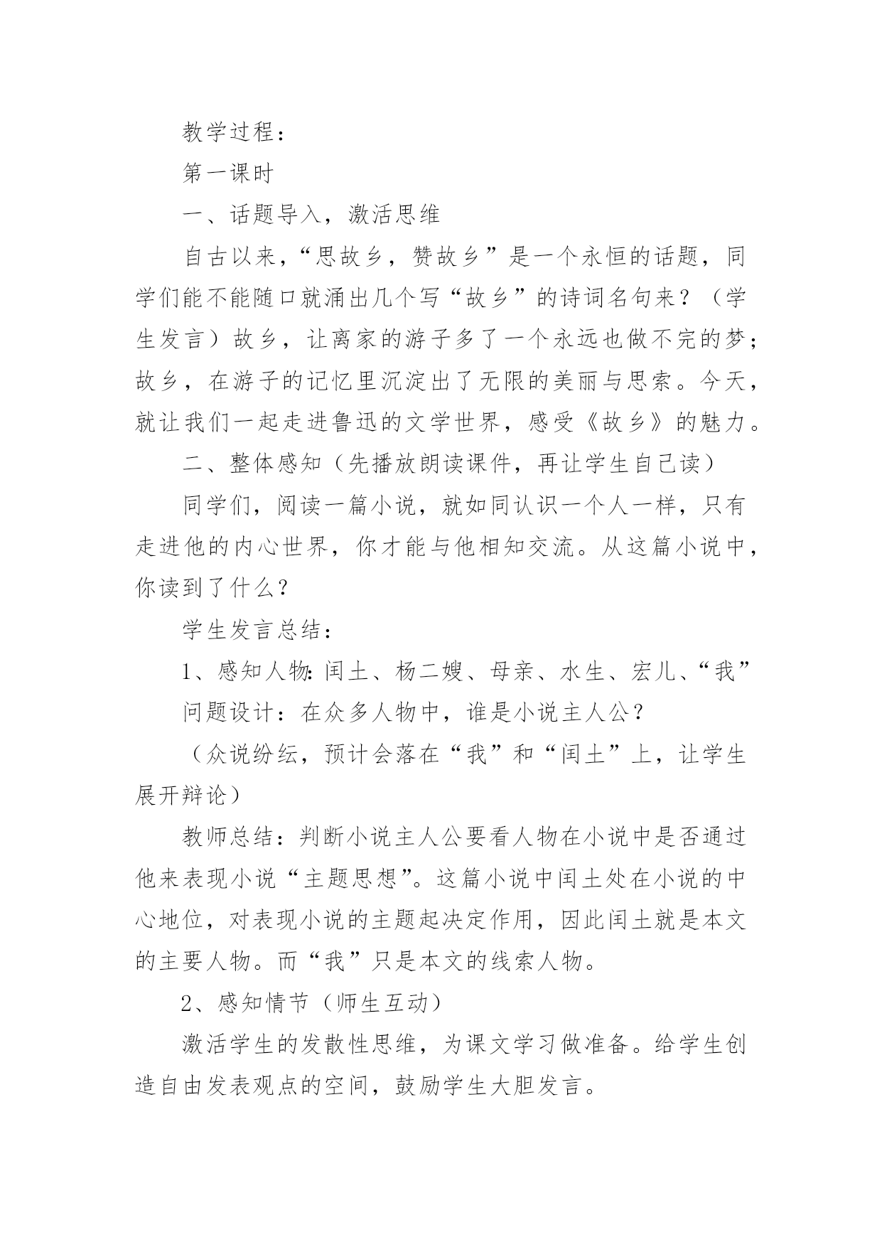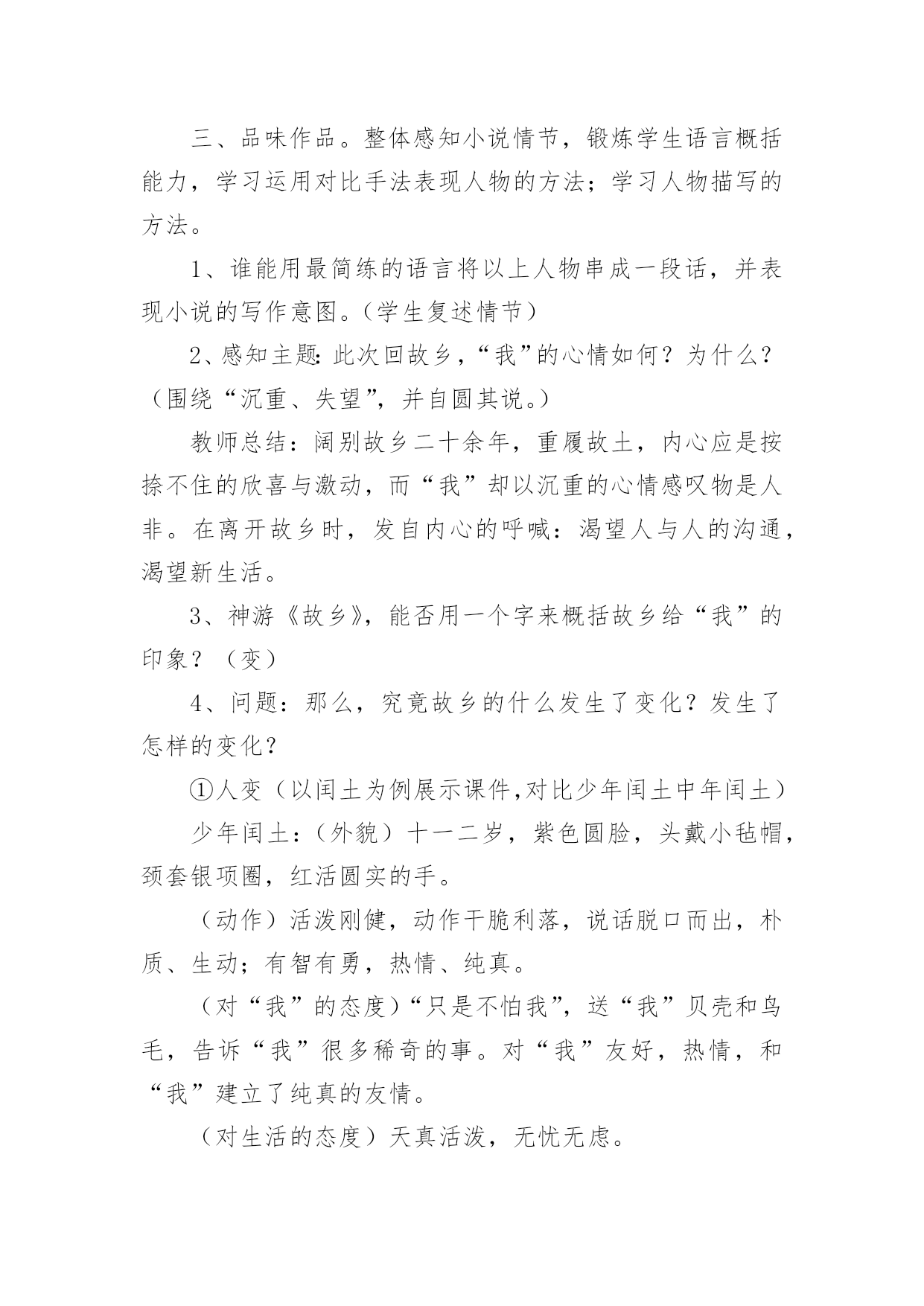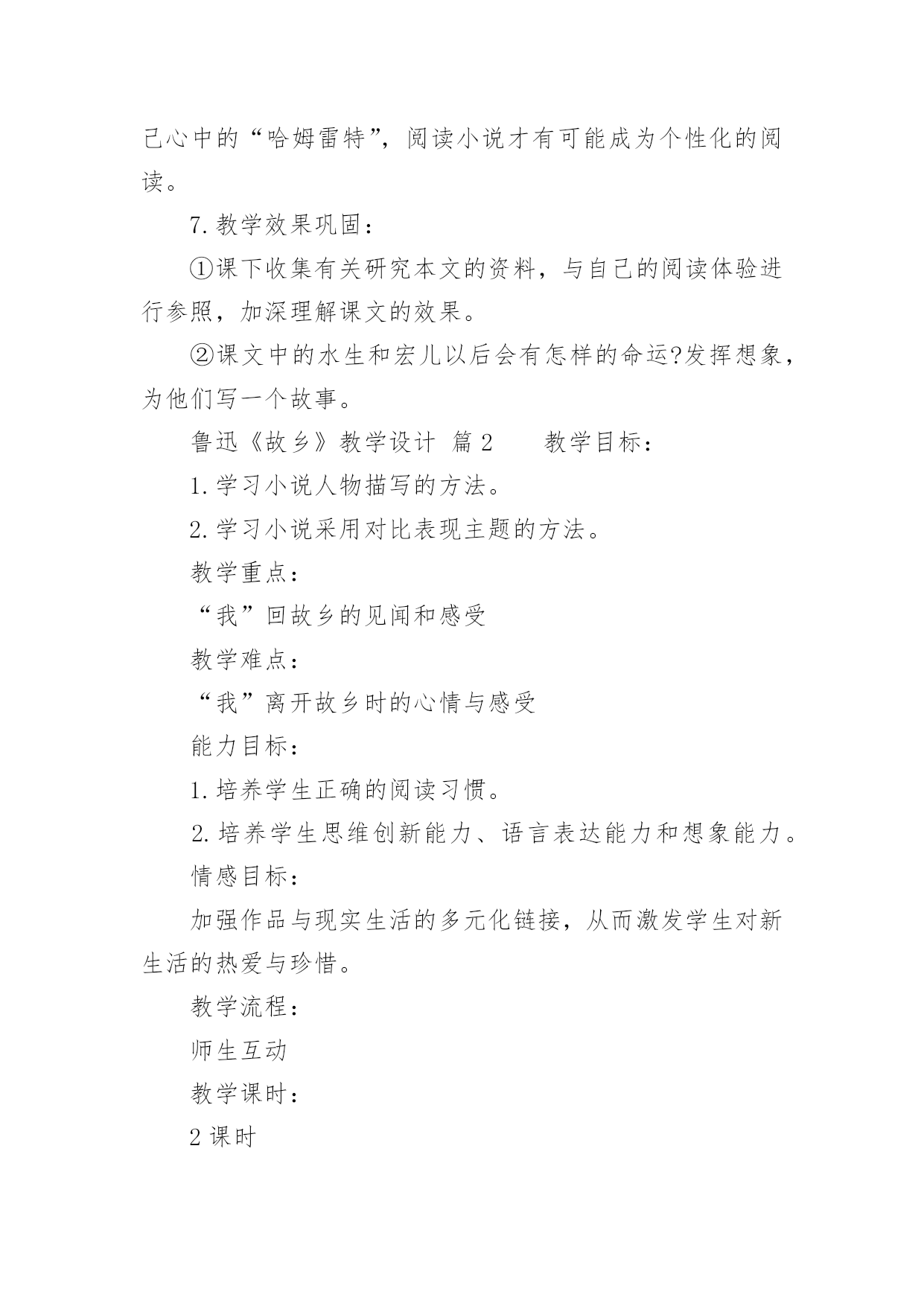 鲁迅《故乡》教学设计鲁迅《故乡》教学设计(通用20篇)作为一名为他人授业解惑的教育工作者,通常需要用到教学设计来辅助教学,教学设计是连接基础理论与实践的桥梁,对于教学理论与实践的紧密结合具有沟通作用。那么教学设计应该怎么写才合适呢?以下是小编帮大家整理的鲁迅《故乡》教学设计,欢迎阅读与收藏。鲁迅《故乡》教学设计篇1教学目标:1.了解小说的特点2.理解文章主题3.学会分析人物形象教学重点:分析人物,评价人物,探讨人物与主题的关系。教学过程:1.知识链接:我们在前几册课本中已经学过了不少小说,如《最后一课》《社戏》等,课外阅读的小说作品就更多了,阅读这些小说作品,为我们积累了许多阅读小说的感性经验。本册教材的“附录”中,编排了《谈谈小说》这篇知识短文,阅读这篇短文,我们会明确阅读小说的一些常识,其中重要的一个方面,是要知道一篇小说必须具备三个要素:生动的人物形象、完整的故事情节和人物活动的具体环境。在这三个要素中,人物形象又是主要要素。2.布置快速阅读课文,查阅工具书,完成基础知识积累。3.与文本对话。就下列问题组织讨论和交流:①文中写了哪些人物?列一个人物表。在这些人物中,其中哪些人物着墨较多?分别为他们写一个小传。②分析人物的性格特点,然后用一两句生动的话对人物作一评价。4.师生对话,学生与学生对话。反馈讨论效果,就学生写的小传进行交流。文中塑造的人物有:闰土、杨二嫂、“我”,“我”母亲、水生、宏儿;其中闰土、杨二嫂、“我”着墨较多,刻画得比较详细,人物形象丰满。为他们写小传,要从全文着眼,筛选与之有关的材料与信息,然后将其连缀在一起。如杨二嫂的小传(参考示例):20年前,杨二嫂开了一个豆腐店,为了能赚到更多的钱,她擦着**,终日在店里坐着,凭自己的年轻美貌招徕顾客,生意非常好。20多年过去了,她的青春已逝,美貌不再,更重要的是由于农村经济的衰败,她的家境已难以维持原来的殷实,在种种艰辛的磨砺中,为了生存,她变得泼悍、放肆、尖刻、自私。当她见到在外20多年现在回到故乡的迅哥儿时,就虚假吹捧,尖刻嘲讽;趁迅哥儿一家搬家的混乱之际,中伤闰土,还顺手拿走了一些家中的东西。“小说塑造人物的方法是丰富多样的,有概括介绍,也有形象描绘;有外貌和内心描写,也有行动和对话描写;有正面描写,也有侧面描写。”(《谈谈小说》)在阅读课文时,掌握这些塑造人物的方法,是写好人物小传的重要方面;而写人物的小传,又是对作品进行再创作的一种重要途径,它为更好地与文本对话,与作者对话提供了可能。同时,也为分析人物性格特点奠定了基础。在写本文中的人物小传的过程中,可以看出“变”是这些人物的一个重要特征,在分析人物性格时,要抓住一个“变”字。如对闰土,就可作这样的分析:闰土是一个代表了中国封建农村因贫穷、落后的生活重压而变得麻木、愚昧的农民的形象。一千个读者就有一千个哈姆雷特,不同的学生阅读《故乡》,对文中的人物的理解也应该是不同的;评价人物,发表对文中人物的看法,就是个性化阅读的一种实践,是一种创新能力的展示。读这篇小说,评价其中的人物,也是在前三个单元学过了议论文之后,运用议论这一表达方法的一种实践。用一两句生动的话评价人物,还是一种对语言运用能力的训练。在学生交流过程中,有可能会出现许多闪耀着创新光芒的见解,要不失时机地予以鼓励。下面的示例供参考:闰土(1):多子,饥荒,苛税,兵,匪,官,绅,如同一把把挫刀,在时间这块励石上,活生生地把一个少年小英雄磨成了一个木偶人。闰土(2):一声“老爷!”就把自己与儿时的好友隔在了无形的厚障壁的两边;带回家去的香炉、烛台何尝不是在增加这厚障壁的高度呢!杨二嫂:一个被社会扭曲了的变形人,不仅表现在从当年的“豆腐西施”变成了今天的“圆规”,而且还表现在自己被侮辱、被损害的同时,又在侮辱和损害着别人。“我”:曾使自己魂牵梦萦的故乡,一下子就显露出了它的丑陋;为使它美丽,只有在本来没有路的地方走出一条新路来。“我”母亲:慈祥、宽容、厚道地对待所有的人,对待这个世界;世界却没有给她以公平:变卖家产,告别家园,跟儿子去外地谋生,她的前面是一片未知。水生:一个20年前的闰土,20年后,他或许不会再成为今天的闰土;对他来说,与生俱来的苦难其实也是一种改变命运的财富!宏儿:从“飞”出家门的那一刻起,他就开始“飞”向这个既陌生又新鲜的世界了。5.研究性学习:关于本文主题的探讨。文学作品的理解,不强求一致,对人物的理解是这样,对主题的理解也是这样。除了课后练习中列举的四种以外,还有:①茅盾先生认为这篇小说的主题是“悲哀那人与人之间的不了解,隔膜”(见茅盾以郎损为笔名发表于1921年《小说月报》的《评四五六月的创作》一文)。②反映辛亥革命前后农村破产,农民痛苦生活的现实,揭示产生这种现实的根源。③表达对改造旧社会创造新生活的愿望与信心。对这