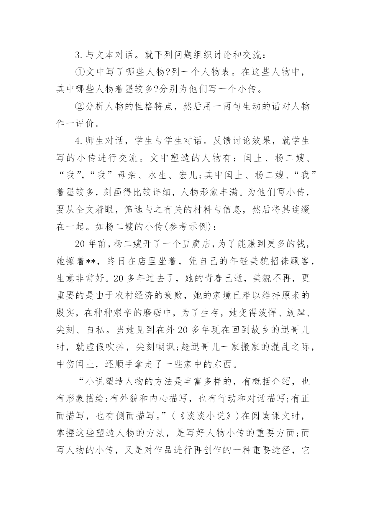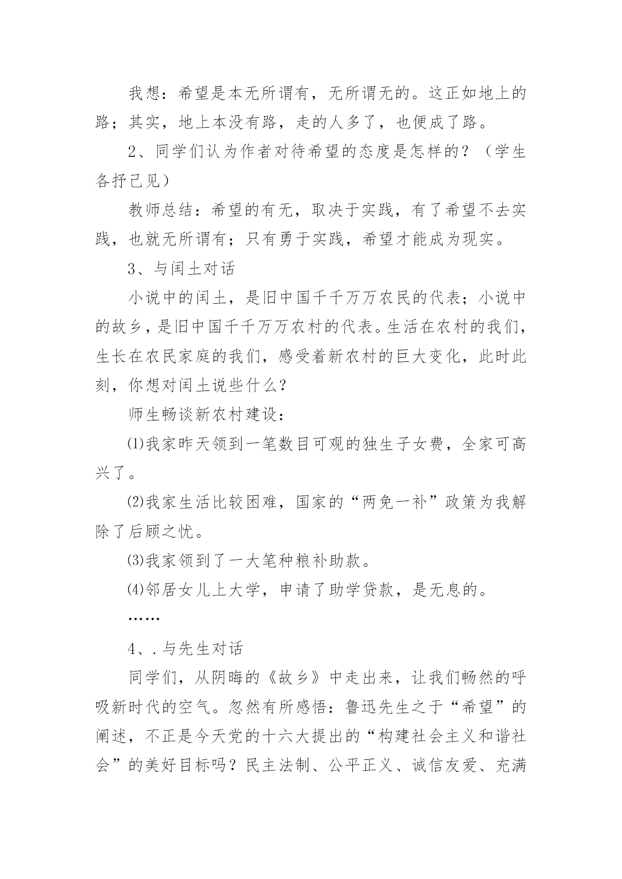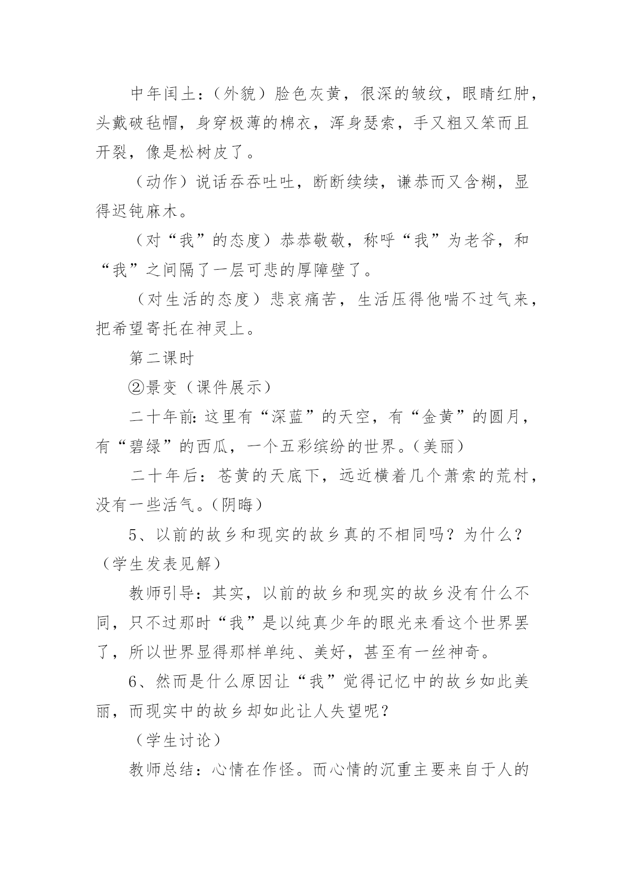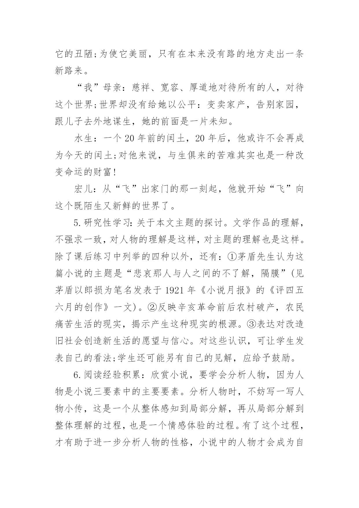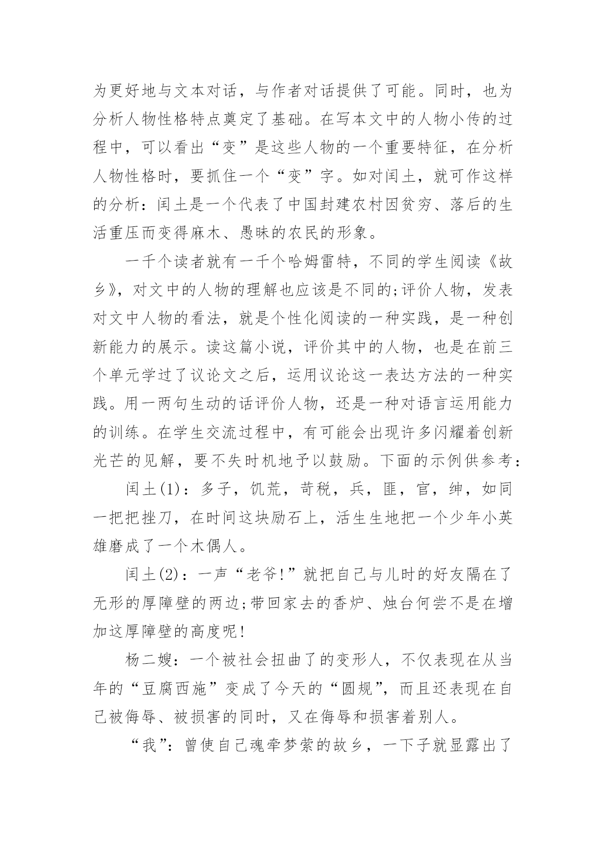 鲁迅《故乡》教学设计鲁迅《故乡》教学设计(通用20篇)作为一名为他人授业解惑的教育工作者,通常需要用到教学设计来辅助教学,教学设计是连接基础理论与实践的桥梁,对于教学理论与实践的紧密结合具有沟通作用。那么教学设计应该怎么写才合适呢?以下是小编帮大家整理的鲁迅《故乡》教学设计,欢迎阅读与收藏。鲁迅《故乡》教学设计篇1教学目标:1.了解小说的特点2.理解文章主题3.学会分析人物形象教学重点:分析人物,评价人物,探讨人物与主题的关系。教学过程:1.知识链接:我们在前几册课本中已经学过了不少小说,如《最后一课》《社戏》等,课外阅读的小说作品就更多了,阅读这些小说作品,为我们积累了许多阅读小说的感性经验。本册教材的“附录”中,编排了《谈谈小说》这篇知识短文,阅读这篇短文,我们会明确阅读小说的一些常识,其中重要的一个方面,是要知道一篇小说必须具备三个要素:生动的人物形象、完整的故事情节和人物活动的具体环境。在这三个要素中,人物形象又是主要要素。2.布置快速阅读课文,查阅工具书,完成基础知识积累。3.与文本对话。就下列问题组织讨论和交流:①文中写了哪些人物?列一个人物表。在这些人物中,其中哪些人物着墨较多?分别为他们写一个小传。②分析人物的性格特点,然后用一两句生动的话对人物作一评价。4.师生对话,学生与学生对话。反馈讨论效果,就学生写的小传进行交流。文中塑造的人物有:闰土、杨二嫂、“我”,“我”母亲、水生、宏儿;其中闰土、杨二嫂、“我”着墨较多,刻画得比较详细,人物形象丰满。为他们写小传,要从全文着眼,筛选与之有关的材料与信息,然后将其连缀在一起。如杨二嫂的小传(参考示例):20年前,杨二嫂开了一个豆腐店,为了能赚到更多的钱,她擦着**,终日在店里坐着,凭自己的年轻美貌招徕顾客,生意非常好。20多年过去了,她的青春已逝,美貌不再,更重要的是由于农村经济的衰败,她的家境已难以维持原来的殷实,在种种艰辛的磨砺中,为了生存,她变得泼悍、放肆、尖刻、自私。当她见到在外20多年现在回到故乡的迅哥儿时,就虚假吹捧,尖刻嘲讽;趁迅哥儿一家搬家的混乱之际,中伤闰土,还顺手拿走了一些家中的东西。“小说塑造人物的方法是丰富多样的,有概括介绍,也有形象描绘;有外貌和内心描写,也有行动和对话描写;有正面描写,也有侧面描写。”(《谈谈小说》)在阅读课文时,掌握这些塑造人物的方法,是写好人物小传的重要方面;而写人物的小传,又是对作品进行再创作的一种重要途径,它为更好地与文本对话,与作者对话提供了可能。同时,也为分析人物性格特点奠定了基础。在写本文中的人物小传的过程中,可以看出“变”是这些人物的一个重要特征,在分析人物性格时,要抓住一个“变”字。如对闰土,就可作这样的分析:闰土是一个代表了中国封建农村因贫穷、落后的生活重压而变得麻木、愚昧的农民的形象。一千个读者就有一千个哈姆雷特,不同的学生阅读《故乡》,对文中的人物的理解也应该是不同的;评价人物,发表对文中人物的看法,就是个性化阅读的一种实践,是一种创新能力的展示。读这篇小说,评价其中的人物,也是在前三个单元学过了议论文之后,运用议论这一表达方法的一种实践。用一两句生动的话评价人物,还是一种对语言运用能力的训练。在学生交流过程中,有可能会出现许多闪耀着创新光芒的见解,要不失时机地予以鼓励。下面的示例供参考:闰土(1):多子,饥荒,苛税,兵,匪,官,绅,如同一把把挫刀,在时间这块励石上,活生生地把一个少年小英雄磨成了一个木偶人。闰土(2):一声“老爷!”就把自己与儿时的好友隔在了无形的厚障壁的两边;带回家去的香炉、烛台何尝不是在增加这厚障壁的高度呢!杨二嫂:一个被社会扭曲了的变形人,不仅表现在从当年的“豆腐西施”变成了今天的“圆规”,而且还表现在自己被侮辱、被损害的同时,又在侮辱和损害着别人。“我”:曾使自己魂牵梦萦的故乡,一下子就显露出了它的丑陋;为使它美丽,只有在本来没有路的地方走出一条新路来。“我”母亲:慈祥、宽容、厚道地对待所有的人,对待这个世界;世界却没有给她以公平:变卖家产,告别家园,跟儿子去外地谋生,她的前面是一片未知。水生:一个20年前的闰土,20年后,他或许不会再成为今天的闰土;对他来说,与生俱来的苦难其实也是一种改变命运的财富!宏儿:从“飞”出家门的那一刻起,他就开始“飞”向这个既陌生又新鲜的世界了。5.研究性学习:关于本文主题的探讨。文学作品的理解,不强求一致,对人物的理解是这样,对主题的理解也是这样。除了课后练习中列举的四种以外,还有:①茅盾先生认为这篇小说的主题是“悲哀那人与人之间的不了解,隔膜”(见茅盾以郎损为笔名发表于1921年《小说月报》的《评四五六月的创作》一文)。②反映辛亥革命前后农村破产,农民痛苦生活的现实,揭示产生这种现实的根源。③表达对改造旧社会创造新生活的愿望与信心。对这