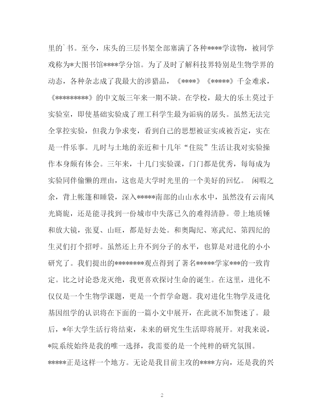 此资料由网络收集而来,如有侵权请告知上传者立即删除。资料共分享,我们负责传递知识。PAGEPAGE3生命科学研究生自我介绍生命科学研究生自我介绍**,出生于19**年*月**日**省**县。自小我与土地亲近,与自然感情之久不需置疑。与****学结缘始于母亲的《*****》和父亲的《*****》。我接受了正规的十二年中国基础教育,十二年寒窗乏善可陈。曾*次参加中学*竞赛,分别取得*奖和*奖。高中三年,平心而论只拼了半年,用减肥八千克换了一张*总分的高考成绩单。怀着对****学的一腔热情,力排众议报考了**大学生命科学学院,并被录取。进入大学,发现理想中之自由开放的象牙塔仍遥不可及,但对我来说已经是“如鳅得泥”。虽然与中学相比,课程的负担不止增加了倍余,但我更喜欢这种忙碌。基础课的教学,应该不能算得上理想,我想这是多数大学的通病。不过,课程本身的吸引力,远远大于我对教学方式的不满。虽然没有在拿到全部的优秀,但也算是顺利通过。英语拿下*级,也似小马过河,不是一件异常恐怖的事情。在顺利完成学习任务之余,课外阅读成了我的最大爱好,三年间省下了别人喝咖啡的钱全部买了书。*年北京,*年上海,每次都把钱包里的钱换成了更加充实的书包里的`书。至今,床头的三层书架全部塞满了各种****学读物,被同学戏称为*大图书馆****学分馆。为了及时了解科技界特别是生物学界的动态,各种杂志成了我最大的涉猎品,《****》《*****》千金难求,《*********》的中文版三年来一期不缺。在学校,最大的乐土莫过于实验室,即使基础实验成了理工科学生最为诟病的孱头。虽然无法完全掌控实验,但我力争求变,看到自己的思想被证实或被否定,实在是一件乐事。儿时与土地的亲近和十几年“住院”生活让我对实验操作本身颇有体会。三年来,十几门实验课,门门都是优秀,每每成为实验同伴偷懒的理由,这也是大学时光里的一个美好的回忆。闲暇之余,背上帐篷和睡袋,深入*****南部的山山水水中,虽然没有云南风光旖旎,还是能寻找到一份城市中失落已久的难得清静。带上地质锤和放大镜,张夏、山旺,都是好去处。和奥陶纪、寒武纪、第四纪的生灵们打个招呼。虽然还上升不到分子的水平,也算是对进化的小小研究了。我们提出的********观点得到了著名*****学家***的一致肯定。比之讨论恐龙灭绝,我更喜欢探讨生命的诞生。在这里,进化不仅仅是一个生物学课题,更是一个哲学命题。我对进化生物学及进化基因组学的认识将在下面的一篇小文中展开,在此就不加赘述了。最后,*年大学生活行将结束,未来的研究生生活即将展开。对我来说,*院系统始终是我的唯一选择,我需要的是一个纯粹的研究氛围。*****正是这样一个地方。无论是我目前主攻的****方向,还是我的兴趣所在-******,*****都有国内顶尖的教授和实验条件。倘若能有幸成为*****的一员,在如此优秀的研究条件下工作,还有什么能说的呢?推荐你使用百度搜索内容