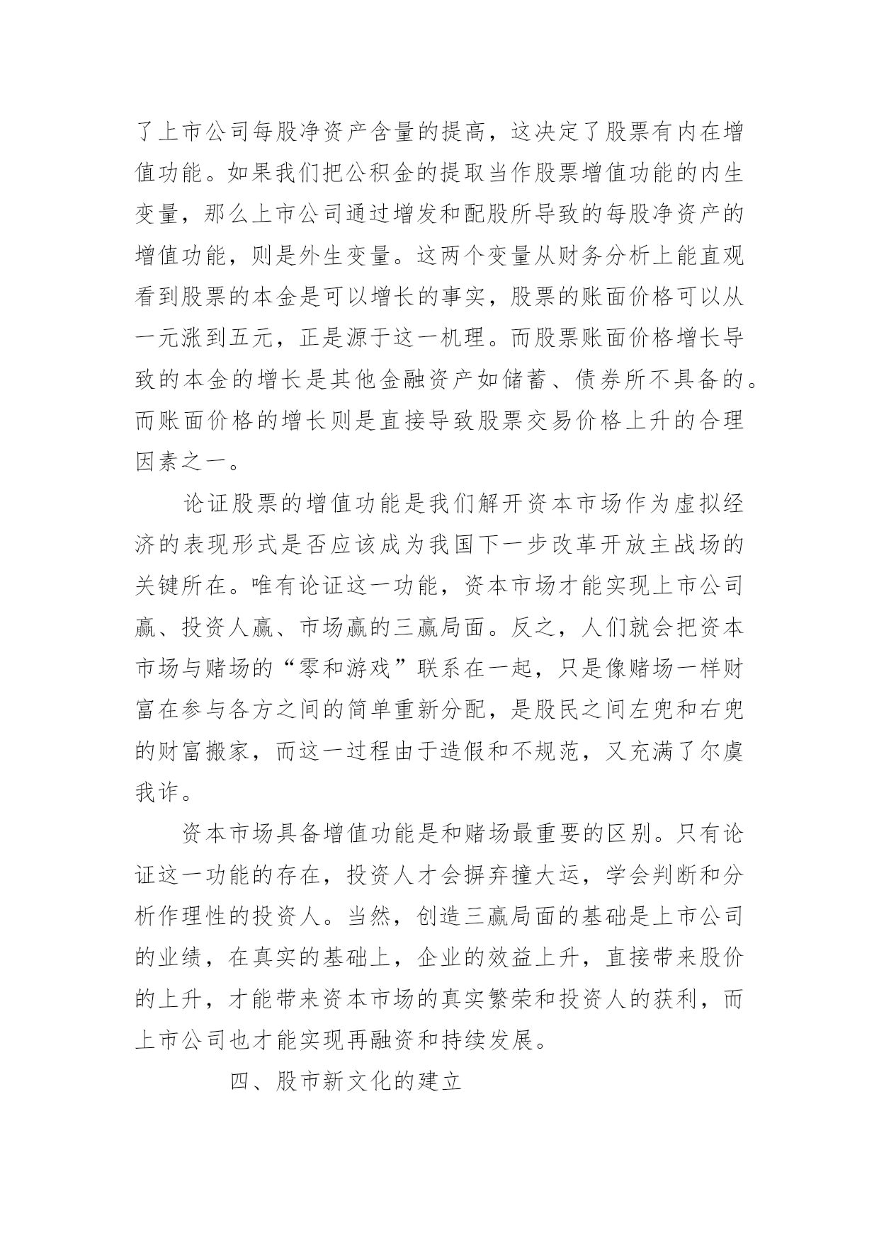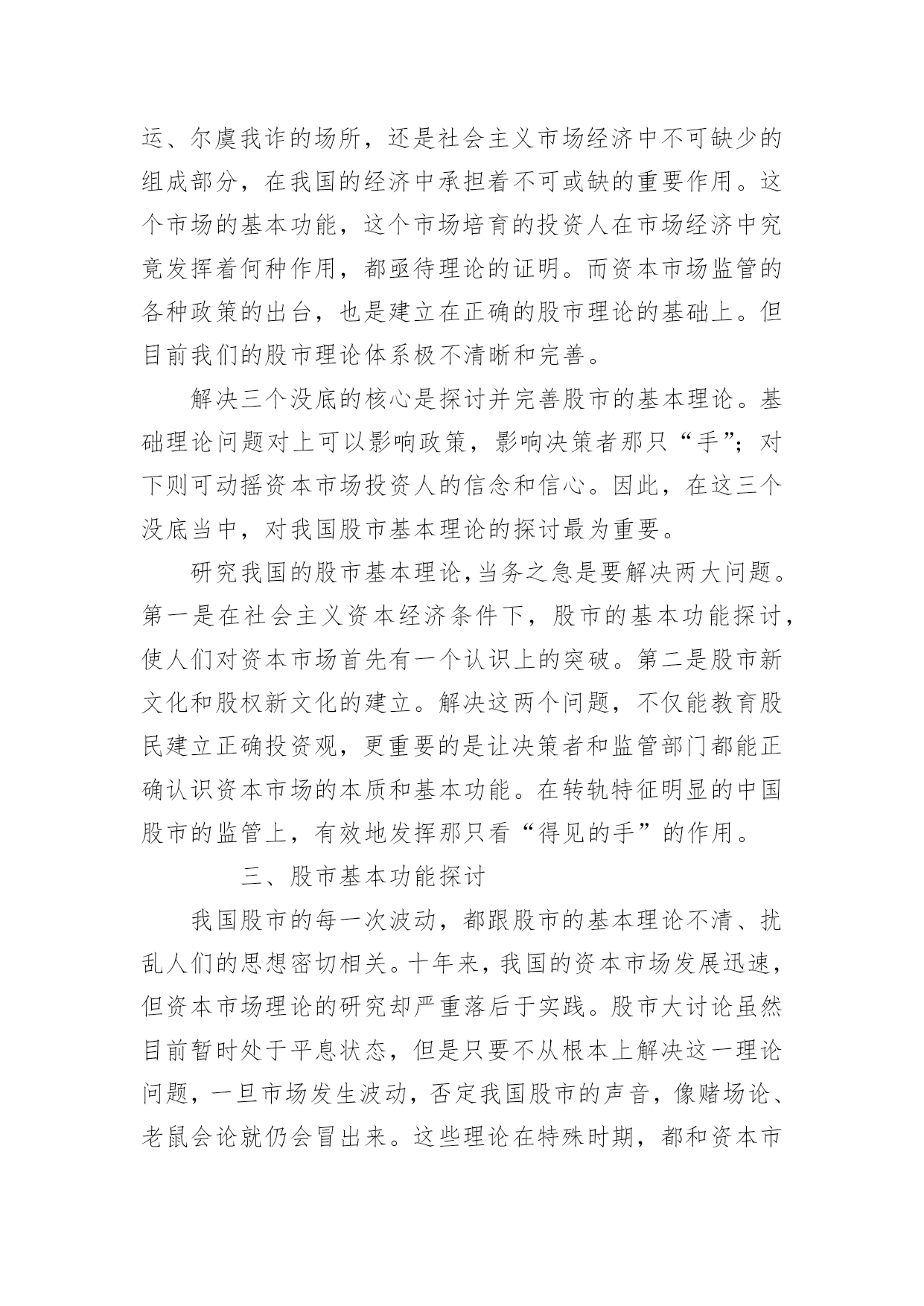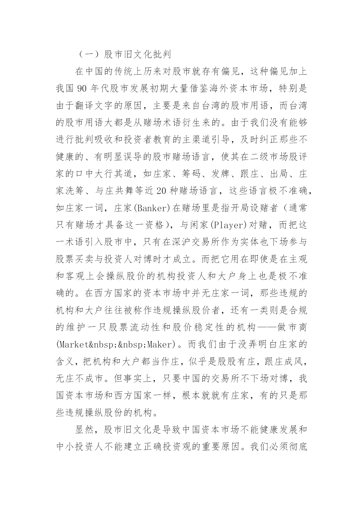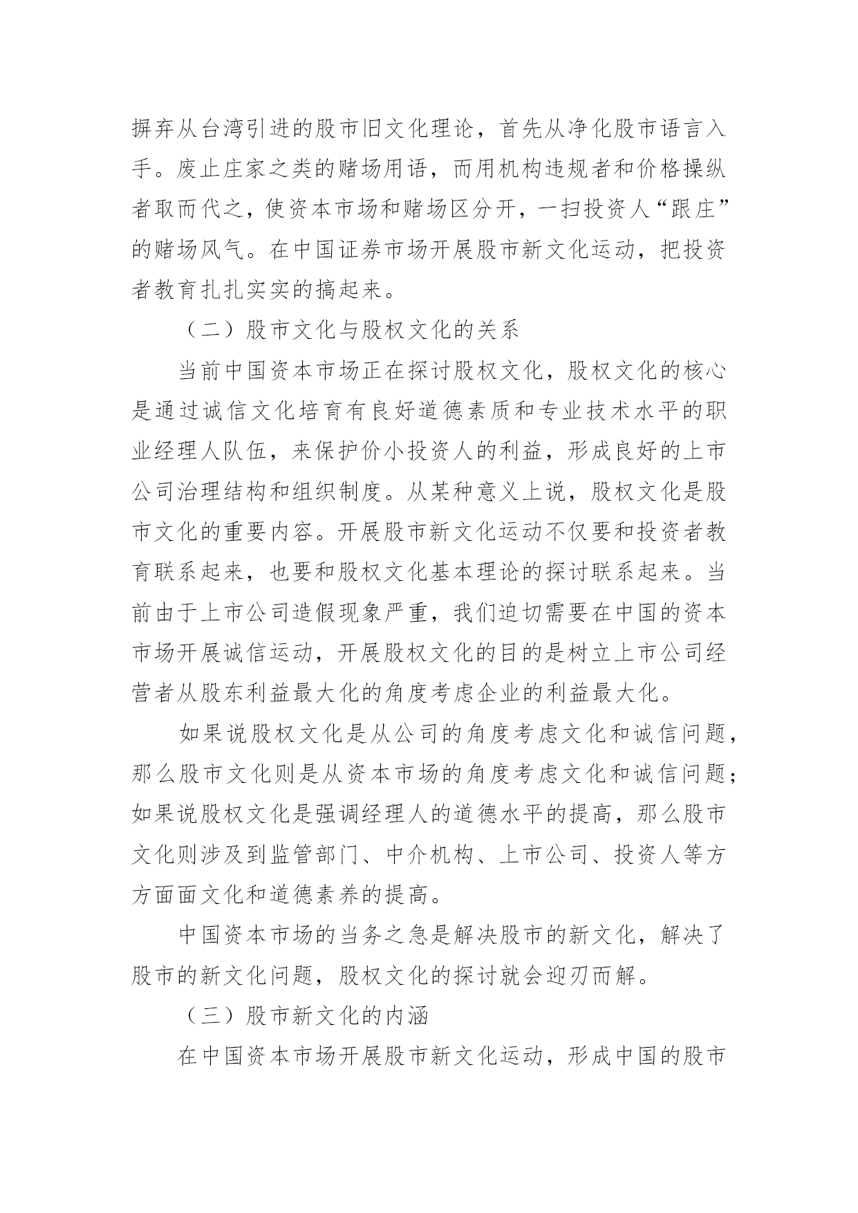 股市新文化理论初探股市新文化理论初探具体说,目前压在中国股市头上有三座大山。其一,股权分裂的大山。高达2/3的非流通股在中国资本市场与可流通股并存,既是上市公司一股独大和一股独霸的根源所在,又压得中国资本市场喘不过气来。其二,股票交易所垄断的大山。必须尽快完成多元化、多层次化资本市场体系的建立,实现股市结构调整,摆脱“千军万马过独木桥”,假货、赝品充斥“精品店”的被动局面。其三,股市旧文化的大山。十年发展,我们不仅没有弄清股市的本质和基本功能,而且在台湾股市旧文化的影响下,庄家、发牌、出局、筹码等近二十种赌场术语在股市中泛滥,使人们技资股市如置身于赌场之中。不仅买股票的人谈到股票投资总是不能理直气壮,而且其投资行为也是以跟风撞大运取代理性分析和判断。这三座大山使今无中国资本市场的规范化发展举步维艰。中国资本市场面临第二个十年,这一时期的根本任务不在于扩容,而在于调养生息,进行结构调整。具体说,就是要推倒压在中国股市上的三座大山。本文是从资本市场基础理论研究出发,在建立股市新文化、树立正确投资观问题上,作一探讨。二、股市基础理论探讨,刻不容缓中国股市不平凡的十年是在巨大的理论争议和现实波动中发展起来的。从早期“股份制是私有化”的政治观点之争,到今天中国的资本市场是否像“老鼠会和赌场”的文化歧见,这种风风雨雨始终与中国资本市场的高速扩容相伴随。如果说,前者是主张和反对建立资本市场的两种力量之争,这已在“摸着石头过河”和不辩解、不争论的指导思想下,回避了意识形态方面很多矛盾和干扰,我们已建成了初具规模的资本市场。那么后者则主要是在主张培育发展中国资本市场的实践中,如何使中国的资本市场得以健康发展而产生的不同观点,尽管其都主张规范发展资本市场,但路径的不同往往会产生不同的结果。事实上,我国资本市场理论的研究始终落后于资本市场发展的实践,不仅对资本市场在我国社会主义市场经济中的作用和地位没有论证清楚并广为宣传,而且对资本市场的许多概念和技术层面的资本运作分析技术也没有形成一个良好的培训和普及环境。令人遗憾的是,我们采用了回避争议和矛盾的做法,这些资本市场的重大理论问题始终。没有突破,人们普遍还在资本市场就是赌场,要么跟庄搞投机,要么随机撞大运的投资理念中徘徊。概括起来,中国股市有三个没底:1.上市公司造假没底上市公司造假既有资本经济作为股权虚拟经济监管难度大的原因,也是我国特殊国情下的一股独大所致。上市公司是资本市场发展的基石,上市公司质量的真、假、优、劣是决定中国资本市场是投资场所还是赌场的关键。正确投资观应是建立在投资人对上市公司的理性判断并作出相应用脚投票选择基础上,来促使上市公司以自身价值提高给投资人带来良好投资回报的投资机制。它是投资人对投资对象在“蛋糕做大”基础上来实现投资人投资收益的体现,而绝不仅仅是在二级市场上机构和中小投资人之间利益分配的“零和游戏”。但中国的上市公司到底还有多少个银广厦、吉林通海、蓝田股份,人们心里没底。2.政策没底我国资本市场政策市特征明显,这是新兴转轨市场的必然现象。因此,政策决定股市,是把政策作为一个长期的调控手段来炫耀,使中国的股市处于一涨就怕、一怕就打、一打就跌、一跌也怕、一怕又托、一托又涨的恶性循环。最终是政府调控股市,形成典型的政策市。而人们却看不见那只“看得见的手”,人们不知道它什么时候想干什么。3.股市理论的探讨没底中国股市到底是赌场、老鼠会,人们置身其中是在撞大运、尔虞我诈的场所,还是社会主义市场经济中不可缺少的组成部分,在我国的经济中承担着不可或缺的重要作用。这个市场的基本功能,这个市场培育的投资人在市场经济中究竟发挥着何种作用,都亟待理论的证明。而资本市场监管的各种政策的出台,也是建立在正确的股市理论的基础上。但目前我们的股市理论体系极不清晰和完善。解决三个没底的核心是探讨并完善股市的基本理论。基础理论问题对上可以影响政策,影响决策者那只“手”;对下则可动摇资本市场投资人的信念和信心。因此,在这三个没底当中,对我国股市基本理论的探讨最为重要。研究我国的股市基本理论,当务之急是要解决两大问题。第一是在社会主义资本经济条件下,股市的基本功能探讨,使人们对资本市场首先有一个认识上的突破。第二是股市新文化和股权新文化的建立。解决这两个问题,不仅能教育股民建立正确投资观,更重要的是让决策者和监管部门都能正确认识资本市场的本质和基本功能。在转轨特征明显的中国股市的监管上,有效地发挥那只看“得见的手”的作用。三、股市基本功能探讨我国股市的每一次波动,都跟股市的基本理论不清、扰乱人们的思想密切相关。十年来,我国的资本市场发展迅速,但资本市场理论的研究却严重落后于实践。股市大讨论虽然目前暂时处于平息状态,但是只要不从根本上解决这一理论问题,一旦市场发生波动,否定我国股市的声音,像赌场论、老鼠
