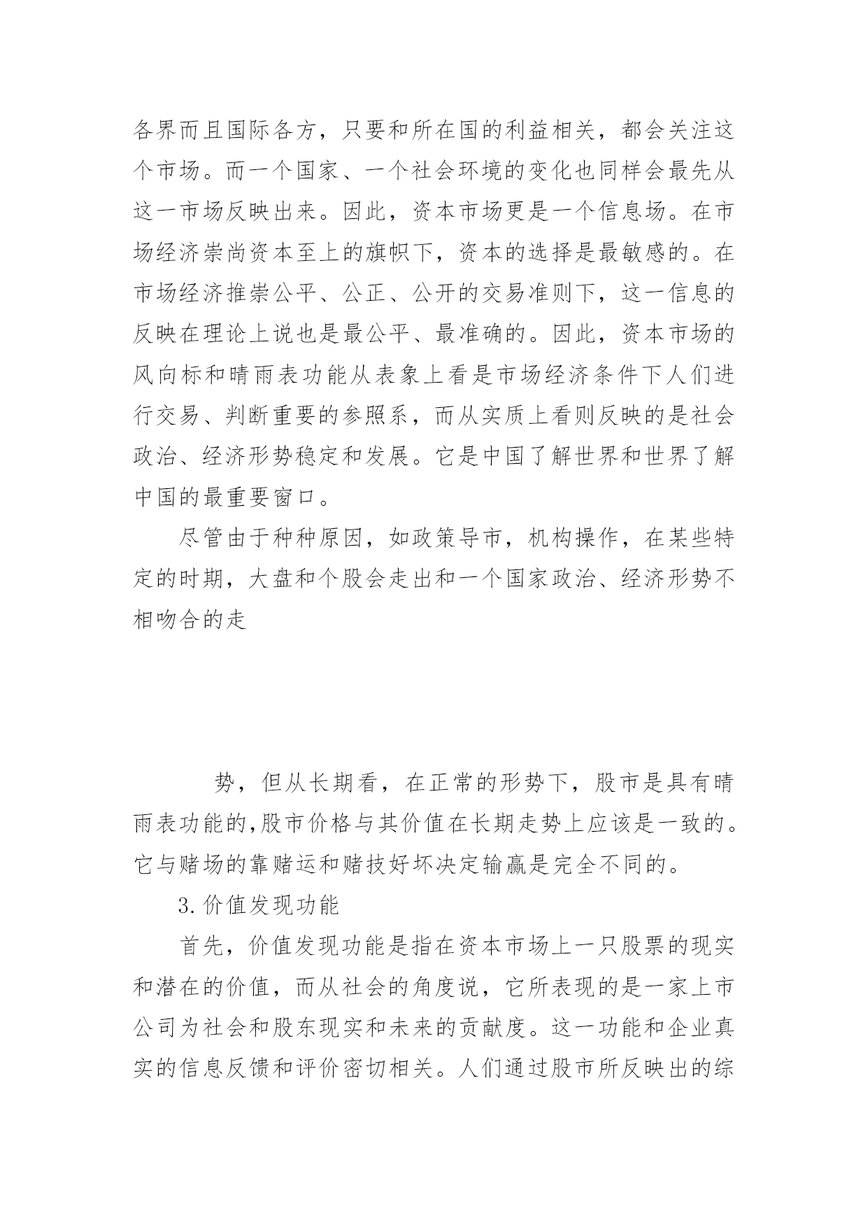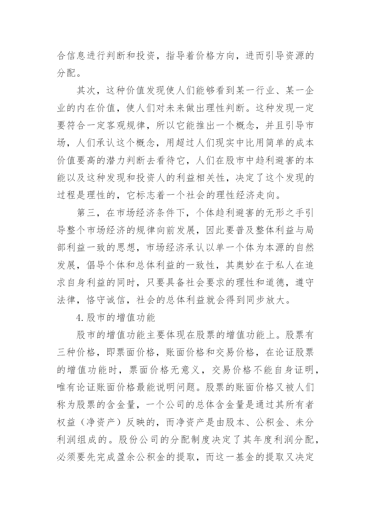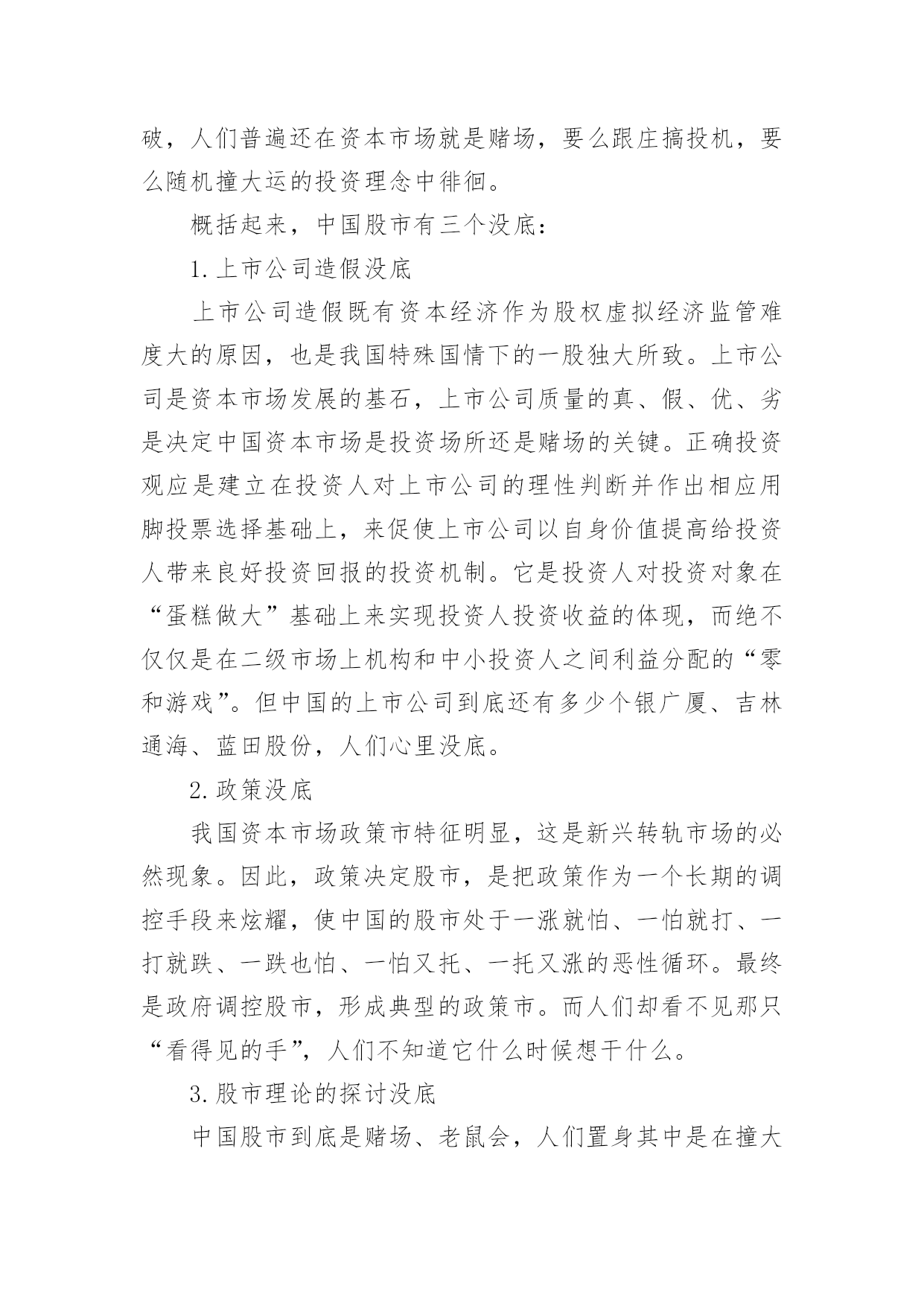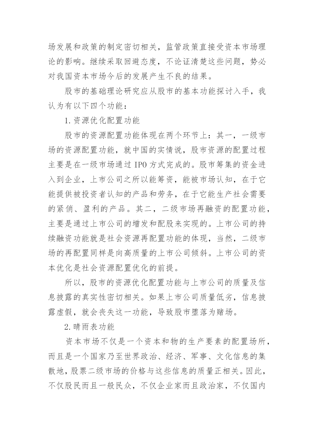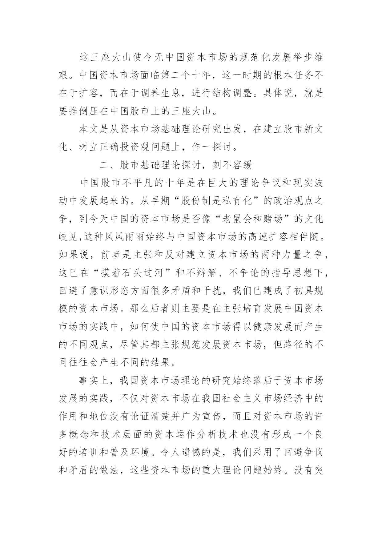 股市新文化理论初探股市新文化理论初探具体说,目前压在中国股市头上有三座大山。其一,股权分裂的大山。高达2/3的非流通股在中国资本市场与可流通股并存,既是上市公司一股独大和一股独霸的根源所在,又压得中国资本市场喘不过气来。其二,股票交易所垄断的大山。必须尽快完成多元化、多层次化资本市场体系的建立,实现股市结构调整,摆脱“千军万马过独木桥”,假货、赝品充斥“精品店”的被动局面。其三,股市旧文化的大山。十年发展,我们不仅没有弄清股市的本质和基本功能,而且在台湾股市旧文化的影响下,庄家、发牌、出局、筹码等近二十种赌场术语在股市中泛滥,使人们技资股市如置身于赌场之中。不仅买股票的人谈到股票投资总是不能理直气壮,而且其投资行为也是以跟风撞大运取代理性分析和判断。这三座大山使今无中国资本市场的规范化发展举步维艰。中国资本市场面临第二个十年,这一时期的根本任务不在于扩容,而在于调养生息,进行结构调整。具体说,就是要推倒压在中国股市上的三座大山。本文是从资本市场基础理论研究出发,在建立股市新文化、树立正确投资观问题上,作一探讨。二、股市基础理论探讨,刻不容缓中国股市不平凡的十年是在巨大的理论争议和现实波动中发展起来的。从早期“股份制是私有化”的政治观点之争,到今天中国的资本市场是否像“老鼠会和赌场”的文化歧见,这种风风雨雨始终与中国资本市场的高速扩容相伴随。如果说,前者是主张和反对建立资本市场的两种力量之争,这已在“摸着石头过河”和不辩解、不争论的指导思想下,回避了意识形态方面很多矛盾和干扰,我们已建成了初具规模的资本市场。那么后者则主要是在主张培育发展中国资本市场的实践中,如何使中国的资本市场得以健康发展而产生的不同观点,尽管其都主张规范发展资本市场,但路径的不同往往会产生不同的结果。事实上,我国资本市场理论的研究始终落后于资本市场发展的实践,不仅对资本市场在我国社会主义市场经济中的作用和地位没有论证清楚并广为宣传,而且对资本市场的许多概念和技术层面的资本运作分析技术也没有形成一个良好的培训和普及环境。令人遗憾的是,我们采用了回避争议和矛盾的做法,这些资本市场的重大理论问题始终。没有突破,人们普遍还在资本市场就是赌场,要么跟庄搞投机,要么随机撞大运的投资理念中徘徊。概括起来,中国股市有三个没底:1.上市公司造假没底上市公司造假既有资本经济作为股权虚拟经济监管难度大的原因,也是我国特殊国情下的一股独大所致。上市公司是资本市场发展的基石,上市公司质量的真、假、优、劣是决定中国资本市场是投资场所还是赌场的关键。正确投资观应是建立在投资人对上市公司的理性判断并作出相应用脚投票选择基础上,来促使上市公司以自身价值提高给投资人带来良好投资回报的投资机制。它是投资人对投资对象在“蛋糕做大”基础上来实现投资人投资收益的体现,而绝不仅仅是在二级市场上机构和中小投资人之间利益分配的“零和游戏”。但中国的上市公司到底还有多少个银广厦、吉林通海、蓝田股份,人们心里没底。2.政策没底我国资本市场政策市特征明显,这是新兴转轨市场的必然现象。因此,政策决定股市,是把政策作为一个长期的调控手段来炫耀,使中国的股市处于一涨就怕、一怕就打、一打就跌、一跌也怕、一怕又托、一托又涨的恶性循环。最终是政府调控股市,形成典型的政策市。而人们却看不见那只“看得见的手”,人们不知道它什么时候想干什么。3.股市理论的探讨没底中国股市到底是赌场、老鼠会,人们置身其中是在撞大运、尔虞我诈的场所,还是社会主义市场经济中不可缺少的组成部分,在我国的经济中承担着不可或缺的重要作用。这个市场的基本功能,这个市场培育的投资人在市场经济中究竟发挥着何种作用,都亟待理论的证明。而资本市场监管的各种政策的出台,也是建立在正确的股市理论的基础上。但目前我们的股市理论体系极不清晰和完善。解决三个没底的核心是探讨并完善股市的基本理论。基础理论问题对上可以影响政策,影响决策者那只“手”;对下则可动摇资本市场投资人的信念和信心。因此,在这三个没底当中,对我国股市基本理论的探讨最为重要。研究我国的股市基本理论,当务之急是要解决两大问题。第一是在社会主义资本经济条件下,股市的基本功能探讨,使人们对资本市场首先有一个认识上的突破。第二是股市新文化和股权新文化的建立。解决这两个问题,不仅能教育股民建立正确投资观,更重要的是让决策者和监管部门都能正确认识资本市场的本质和基本功能。在转轨特征明显的中国股市的监管上,有效地发挥那只看“得见的手”的作用。三、股市基本功能探讨我国股市的每一次波动,都跟股市的基本理论不清、扰乱人们的思想密切相关。十年来,我国的资本市场发展迅速,但资本市场理论的研究却严重落后于实践。股市大讨论虽然目前暂时处于平息状态,但是只要不从根本上解决这一理论问题,一旦市场发生波动,否定我国股市的声音,像赌场论、老鼠