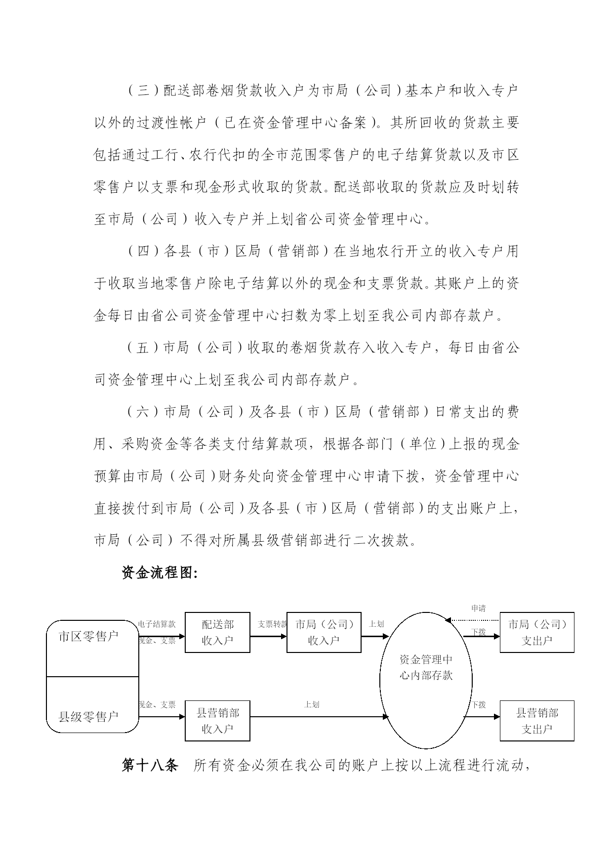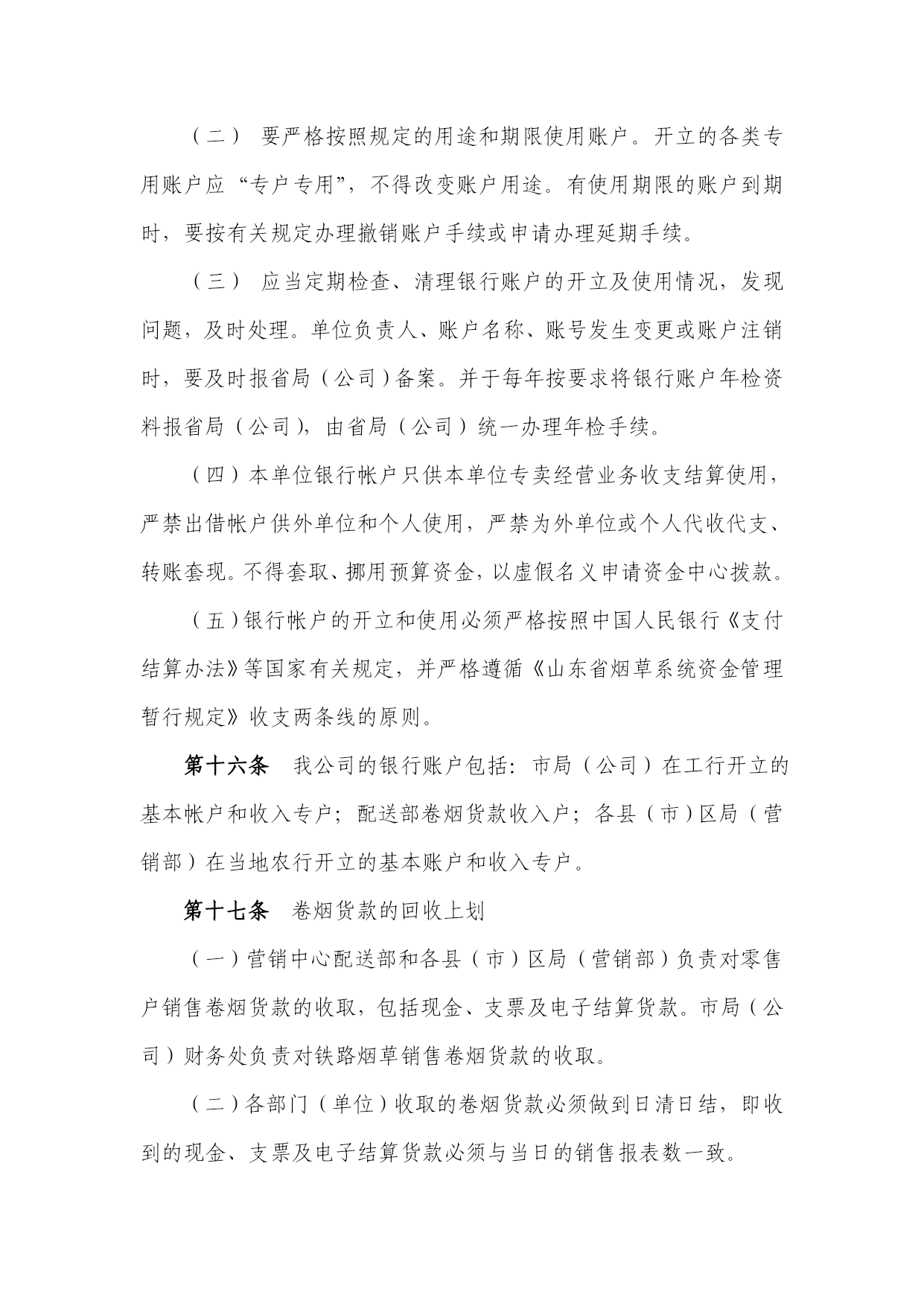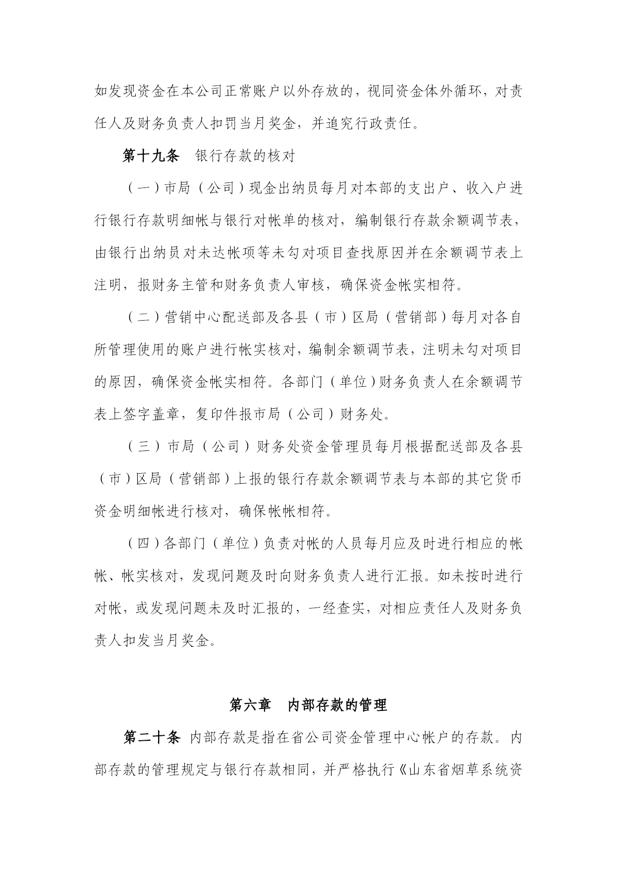 济南市烟草专卖局山东济南烟草有限公司文件8济烟财〔2006〕4号-----------------------------------------------------------------------------关于印发《济南市烟草专卖局(公司)货币资金管理办法》的通知各县(市)区局(营销部),营销中心各部,各处室:现将《济南市烟草专卖局(公司)货币资金管理办法》印发给你们,请认真贯彻执行。二○○六年四月二十九日主题词:财政财务资金办法通知济南市烟草专卖局办公室2006年4月29日印发打字:李萍校对:马莹(共印30份)济南市烟草专卖局(公司)货币资金管理办法第一章总则第一条为加强对货币资金的控制和管理,保证货币资金收支的合法性,确保货币资金的安全,提高货币资金的使用效益,根据《中华人民共和国会计法》和《内部会计控制规范—基本规范(试行)》等法律法规,制订本办法。第二条本办法所指货币资金包括,现金、银行存款、省烟草系统内部存款、其他货币资金。第三条本办法适用于各县(市)区局(营销部)、营销中心各部、市局(公司)各处室。第二章货币资金业务岗位设置第四条岗位设置包括:现金出纳员、银行出纳员、资金结算员、资金管理员。(一)现金出纳员负责库存现金管理、日常费用结算报销等现金收付业务。(二)银行出纳员负责支票、汇票等银行票据的管理、结算、收付业务。(三)资金结算员负责烟草系统资金管理中心内部往来、购销确认、资金划拨等业务。(四)资金管理员负责各县(市)区局(营销部)、营销中心配送部及市局(公司)收入货款上划、帐务核对工作。第五条财务处应明确货币资金相关岗位的职责权限,确保办理货币资金业务的不相容岗位相互分离、制约和监督。(一)出纳人员不得兼任稽核、会计档案保管和收入、支出、费用、债权债务账目的登记工作。(二)不得由一人办理货币资金业务的全过程。(三)核对银行对账单和银行存款余额的人员应与负责银行存款账、现金账、应收账款、应付账款的人员分离。(四)货币资金支出的审批人应同出纳人员、支票保管员和记账员分离。(五)货币资金收付及保管只能由经授权的出纳员负责处理。第三章银行印鉴及票据的管理第六条银行账户印鉴的保管(一)银行帐户的印鉴必须由至少两名以上人员分别保管。市局(公司)的财务专用章由银行出纳员保管,各县(市)区局(营销部)、营销中心配送部的财务专用章由各单位财务部门负责人保管。人名章由本人或授权各部门(单位)现金出纳员保管,被授权人必须是保管财务专用章以外的人员。(二)任何人不得擅自将自己保管的印鉴交他人使用,财务部门要建立“印鉴使用登记簿”,除办理货币资金结算业务外因工作需要使用或借用印章的必须进行登记。(三)保管印鉴的人员因出差等原因需离岗的,应办理授权及交接手续,并登记交接记录本,交接记录视同档案管理。(四)如发现不按上述规定进行印鉴保管和使用的,一经查实,扣发责任人及部门(单位)财务负责人的当月奖金。给公司造成损失的,由责任人履行赔偿责任,并根据情节轻重对责任人与部门(单位)财务负责人进行相应的经济处罚或追究行政责任。第七条银行票据的使用管理(一)公司日常使用的银行票据包括:现金支票、转账支票、电汇凭证。(二)银行票据的购买、保管与开具由银行出纳员专人负责。(三)异地结算支付业务只办理电汇结算。(四)财务部门要建立票据领用登记簿,由业务经办人员登记票据的编号、金额、时间、用途、签名等。(五)现金支票仅限于出纳人员提取备用金时使用。如确有特殊情况需领用现金支票,必须由财务部门负责人签署意见注明。(六)严禁将空白支票或其它转账凭证交由业务人员外出办理业务,自行填制各项栏目。(七)开具支票及其他转账凭证必须按照《济南市烟草专卖局(公司)结算报销管理办法》经过相关负责人和财务部门负责人的审批。(八)开具的支票及其它转账凭证必须填写收款人、出票日期、大小写金额等内容,并在背面加盖“不得背书转让”印章。不得签发空白、空头及远期支票。如特殊情况金额无法确定的,必须在借款凭证上注明,并以“¥”在支票小写金额栏封住。(九)作废或过期的支票必须加盖“作废”戳记。(十)收取支票时应重点检查付款单位是否为业务发生的相关单位,与取得发票上的印鉴是否一致;出票日期填写是否正确,是否在有效期内;大小写金额、收款单位名称是否正确,有无涂抹;财务印鉴是否清晰、完整。第四章库存现金的管理第八条现金出纳人员提取备用金须填写《备用金提取凭证》,由财务部门负责人签字后,方可提取。第九条市局(公司)每日库存限额为4000元,县(市)区局(营销部)为3000元,要严格执行库存现金限额,超过库存限额的现金应每日下班前及时存入银行。第十条现金出纳必须日