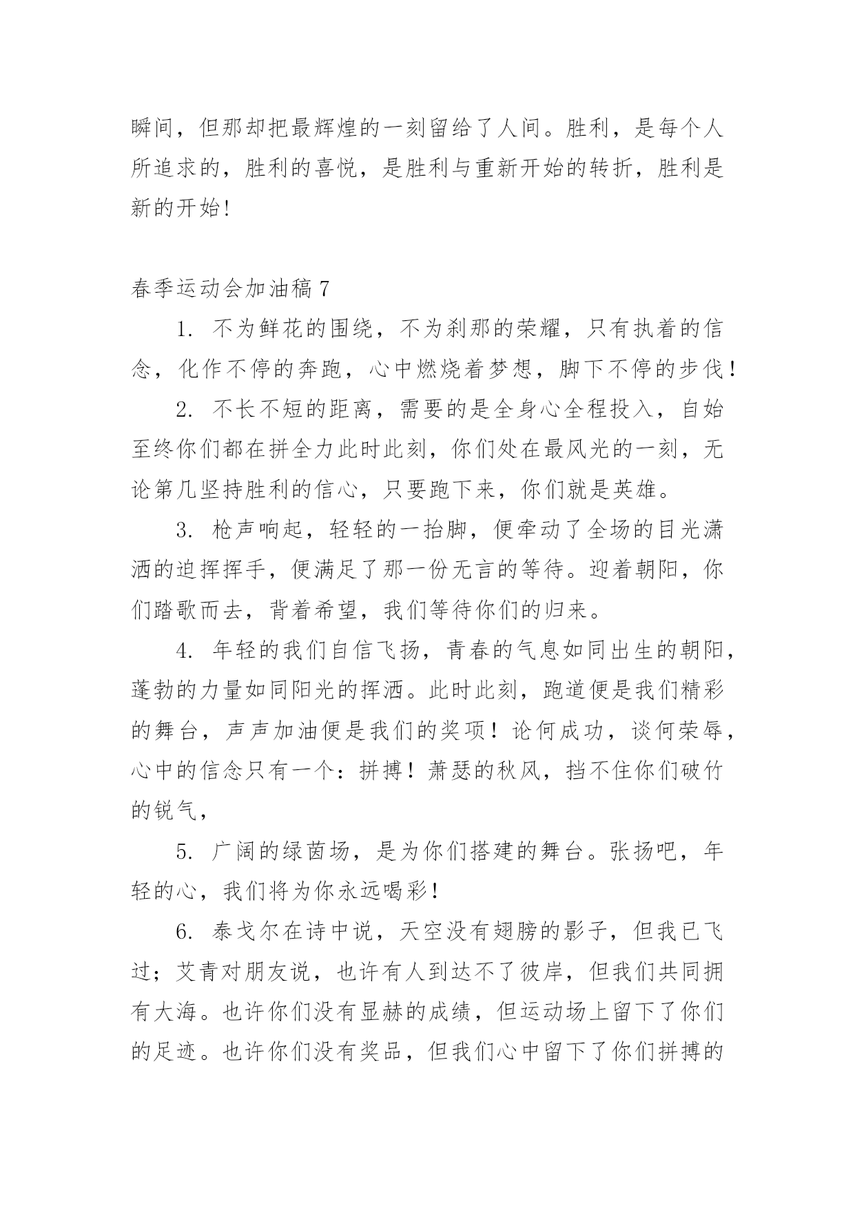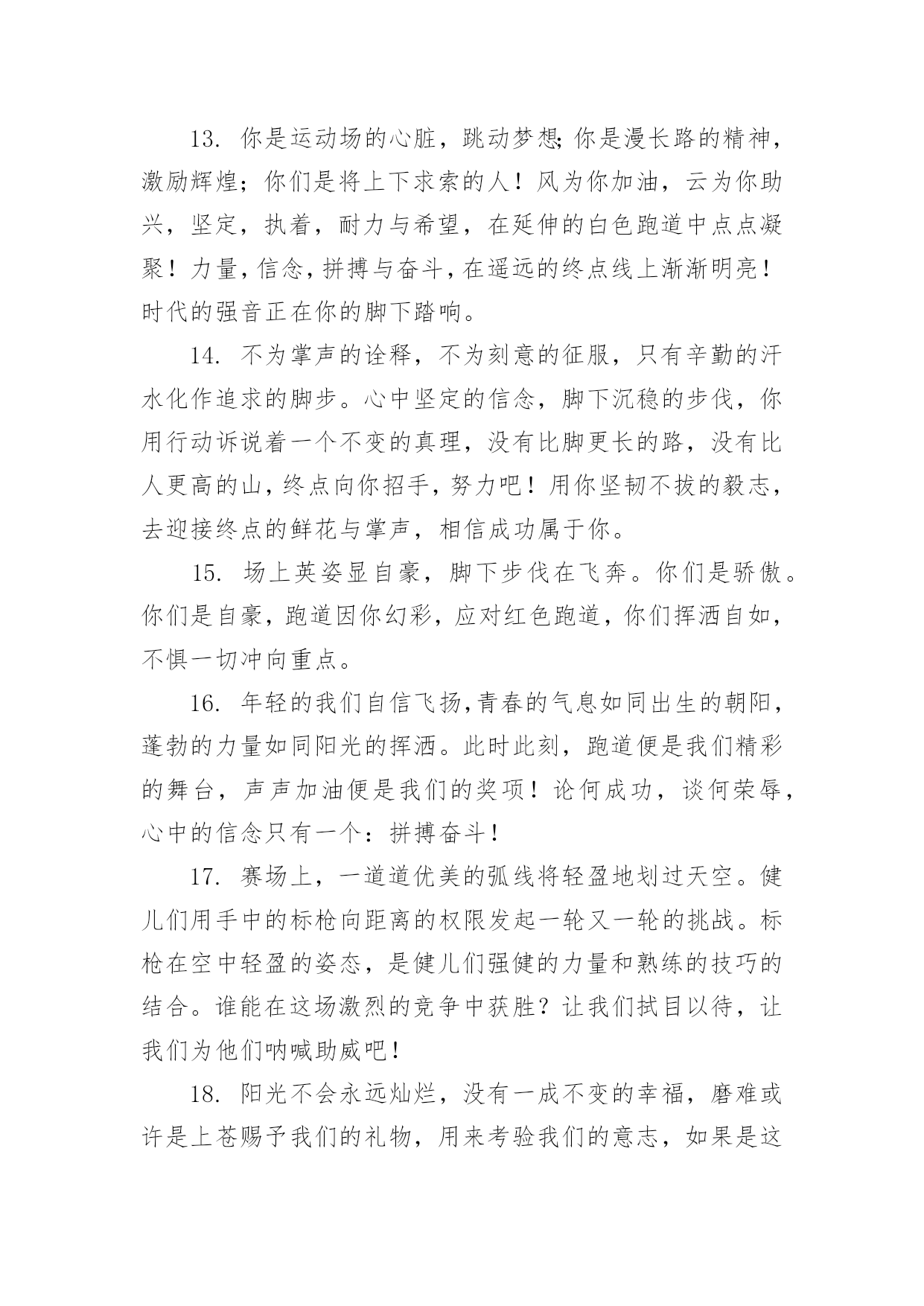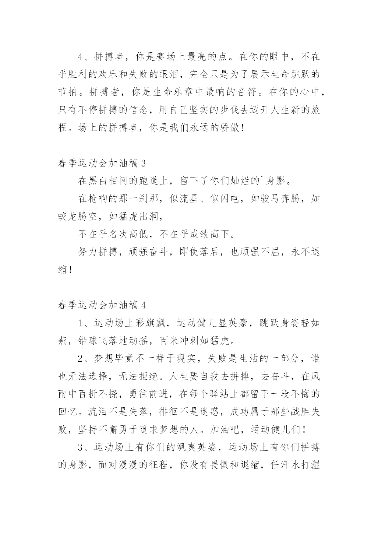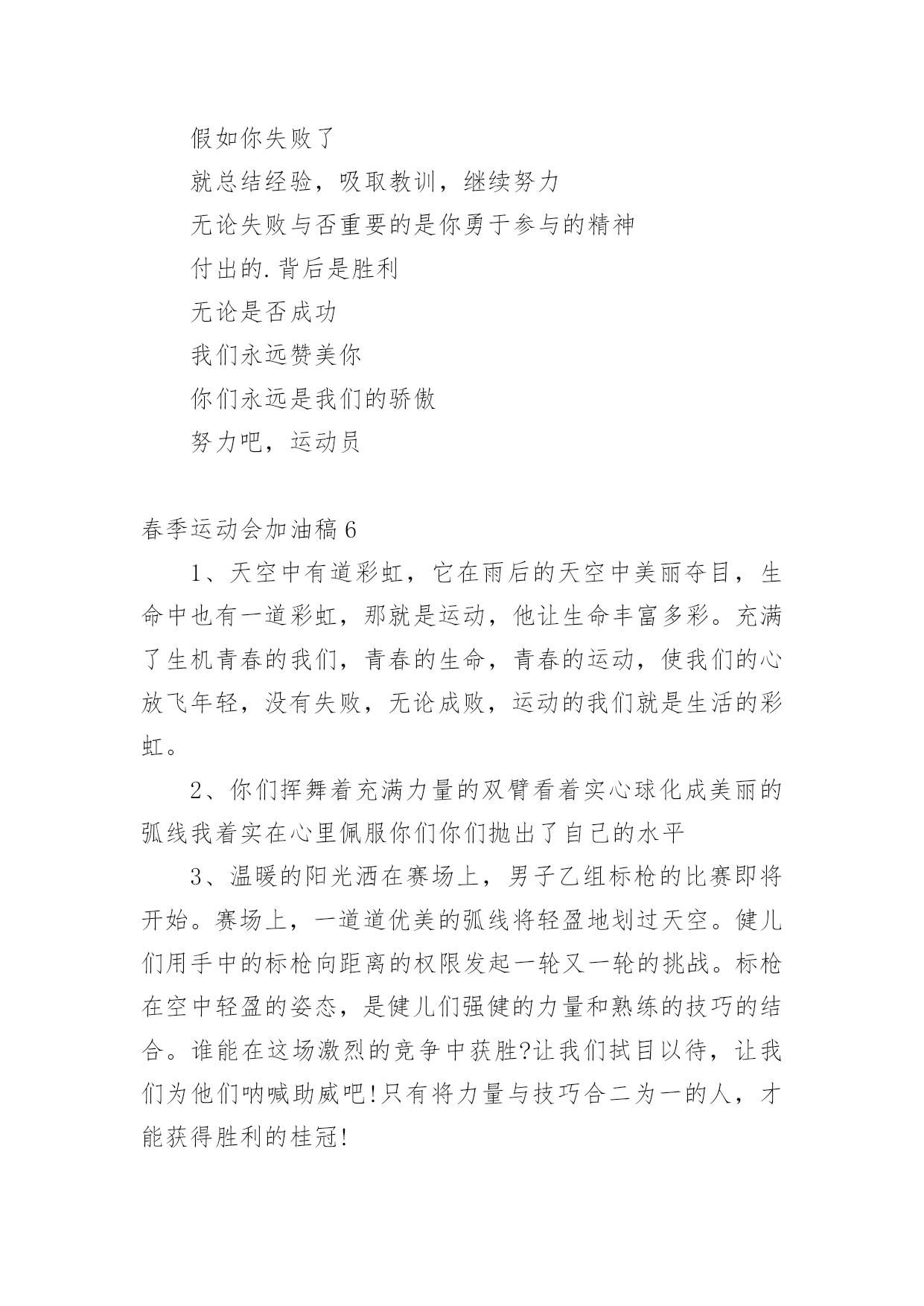 春季运动会加油稿春季运动会加油稿集合15篇在学习、工作生活中,很多地方都会使用到加油稿,借助加油稿可以给对方传达鼓励。写起加油稿来就毫无头绪?下面是小编整理的春季运动会加油稿,欢迎阅读与收藏。春季运动会加油稿1在赤色的长廊上,有两圈弧长,在绿色场地上,有你的明亮,画出两圈生命的轨迹,夺得无数由衷的惊喜。迈出不一样的生活旋律,奏出不同凡响的歌曲!你的表演场,让你自由徜徉!我们为你呐喊,虽然喊的火热朝天,但却希望给你送去荫凉,因为我们看到那液体来不及蒸发,滚落下来,又被溅起。我们并不期待什么,你已经是我们的'英雄。成败得失远不能与竞技快感相比,跌倒爬起,重新开始,比拼的是毅力和意志。无形的考验让你们不知所措,但竞技的遗憾让你们清醒自明,焕发挑战的斗志和激情。重在参与,享受这样的直白体验。淬炼自身,升华面对不快的心境。每段青春都要风吹雨打,才会别致;每寸记忆只有心存感恩,才会感动。年华似水,充实让生命精彩,努力让目标实现。雄鹰展翅,天空是舞台;音符跳动,青春因你们而悠扬婉转。春季运动会加油稿21、每一份辛劳都有一份收获,每一次的痛苦都是快乐的开始,每一声呐喊都是力量的呼唤。我们有着大浪拍岸的豪迈,所以你不必在乎小荷初露的恬静,我们有着春日的阳光明媚,所以不用去羡慕冬日乱玉碎琼,我们是雨天的一把伞,是寒冷冬日里的一盆碳火,温暖的不只是你我,而是大家的心。运动场上的健儿,掌声属于你们,鲜花属于你们,成功也是属于你们!2、面对艰苦的征程,你们毫不畏惧,接力棒在你们手中传递着集体的力量,听,我们在为你呐喊,你们诠释着奥运的精神,你们是我们心中的骄傲,深深的.呼吸,等待你的是艰难的800米。相信胜利会属于你们,但在这征途上,需要你勇敢的心去面对。我们在为你加油,你是否听到了我们发自内心的呐喊,困难和胜利都在向你招手,去呀,不要犹豫,快去击败困难,快去夺取胜利,相信你会送给我们一个汗水浸湿的微笑。3、你是运动场的心脏,跳动梦想;你是漫长路的精神,激励辉煌;你们是将上下求索的人!风为你加油,云为你助兴,坚定,执着,耐力与希望,在延伸的白色跑道中点点凝聚!力量,信念,拼搏与奋斗,在遥远的终点线上渐渐明亮!时代的强音正在你的脚下踏响。4、拼搏者,你是赛场上最亮的点。在你的眼中,不在乎胜利的欢乐和失败的眼泪,完全只是为了展示生命跳跃的节拍。拼搏者,你是生命乐章中最响的音符。在你的心中,只有不停拼搏的信念,用自己坚实的步伐去迈开人生新的旅程。场上的拼搏者,你是我们永远的骄傲!春季运动会加油稿3在黑白相间的跑道上,留下了你们灿烂的`身影。在枪响的那一刹那,似流星、似闪电,如骏马奔腾,如蛟龙腾空,如猛虎出洞,不在乎名次高低,不在乎成绩高下。努力拼搏,顽强奋斗,即使落后,也顽强不屈,永不退缩!春季运动会加油稿41、运动场上彩旗飘,运动健儿显英豪,跳跃身姿轻如燕,铅球飞落地动摇,百米冲刺如猛虎。2、梦想毕竟不一样于现实,失败是生活的一部分,谁也无法选择,无法拒绝。人生要自我去拼搏,去奋斗,在风雨中百折不挠,勇往前进,在每个驿站上都留下一段不悔的回忆。流泪不是失落,徘徊不是迷惑,成功属于那些战胜失败,坚持不懈勇于追求梦想的人。加油吧,运动健儿们!3、运动场上有你们的飒爽英姿,运动场上有你们拼搏的身影,面对漫漫的征程,你没有畏惧和退缩,任汗水打湿脊背,任疲惫爬满全身,依然奋力追赶,仅有一个目标,仅有一个信念,为班级赢得荣誉,拼搏吧,我为你们呐喊,加油!4、环形的跑道一圈又一圈的坚持,毅力与精神活跃在会场上,湿透的衣衫,满头的大汗,无限追求,奋力追赶,我们为你欢呼跳跃,我们为你骄傲。5、面对艰苦的征程,你们毫不畏惧,接力棒在你们手中传递着团体的力量,听,我们在为你呐喊,你们诠释着奥运的精神,你们是我们心中的骄傲。6、这是意志的拼搏,这是速度的挑战,胜利在向你们招手,胜利在向你们呼唤!7、面对的依然是蓝色的天空,依然是金色的阳光,依然是绿色的草地,依然是红色的跑道,依然是你,勇敢的你,坚强的你。不一样的是,天空更加蔚蓝,阳光更加灿烂,草地更如翡翠一般,跑道更加的鲜艳,而你,定会更加的自信,你的成绩,必然更加辉煌。8、你们挥舞着充满力量的双臂,看着实心球化成美丽的弧线,我着实在心里佩服你们,你们抛出了自我的水平!9、你的毅力令我们全班折服,你的努力,令我们全班佩服,你是我们班的焦点,你是全班的'中心,不屈不挠,坚持不懈,你让我们真正体会到奥运精神,我们为你而骄傲,为你而喝彩。10、年轻的我们自信飞扬,青春的气息如同初升的朝阳,蓬勃的力量如同阳光的挥洒。此时此刻,跑道便是我们精彩的舞台,声声加油便是我们的奖项!论何成功,谈何荣辱,心中的信念仅有一个:拼搏!萧瑟的风,挡不住你们破竹的锐气。春季运动会加油稿5今日校园人心欢畅,运动场上彩旗飘扬。锣鼓喧天,运动员健儿分批传喜报