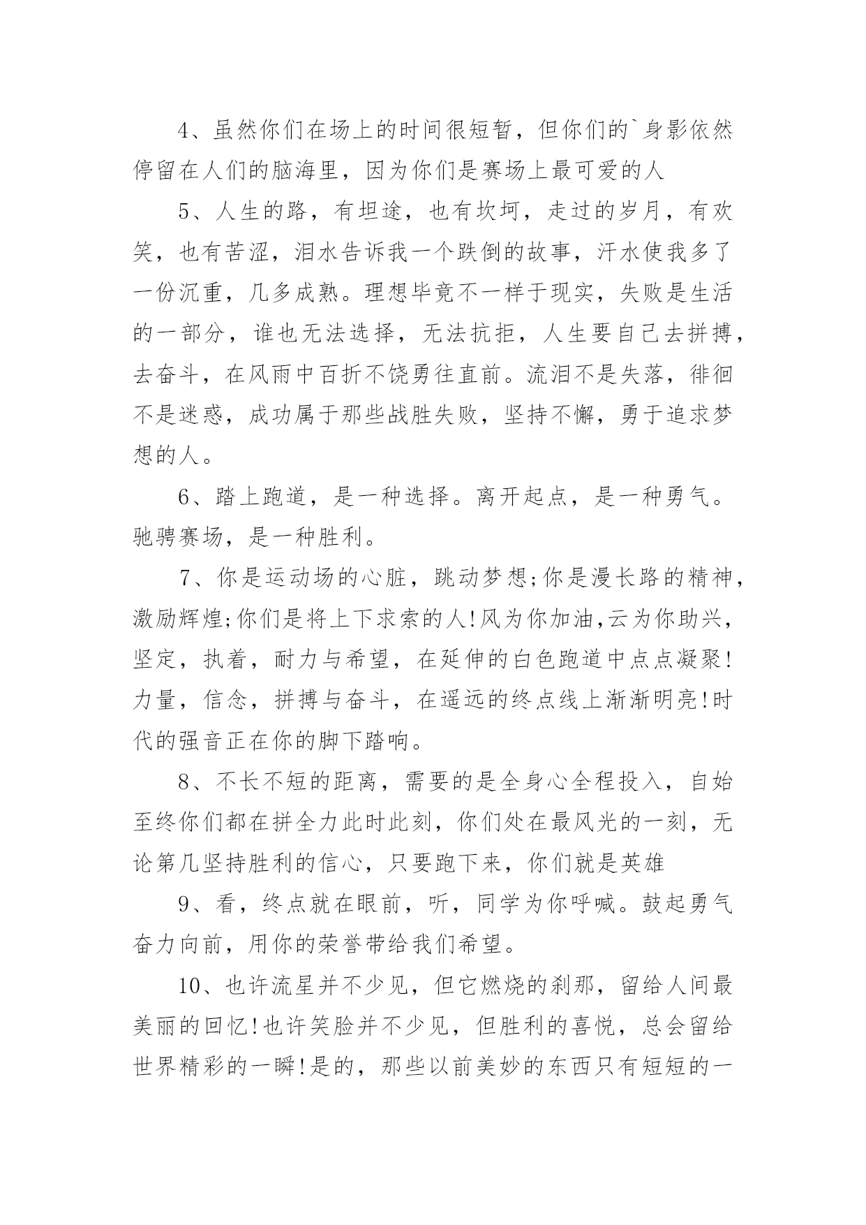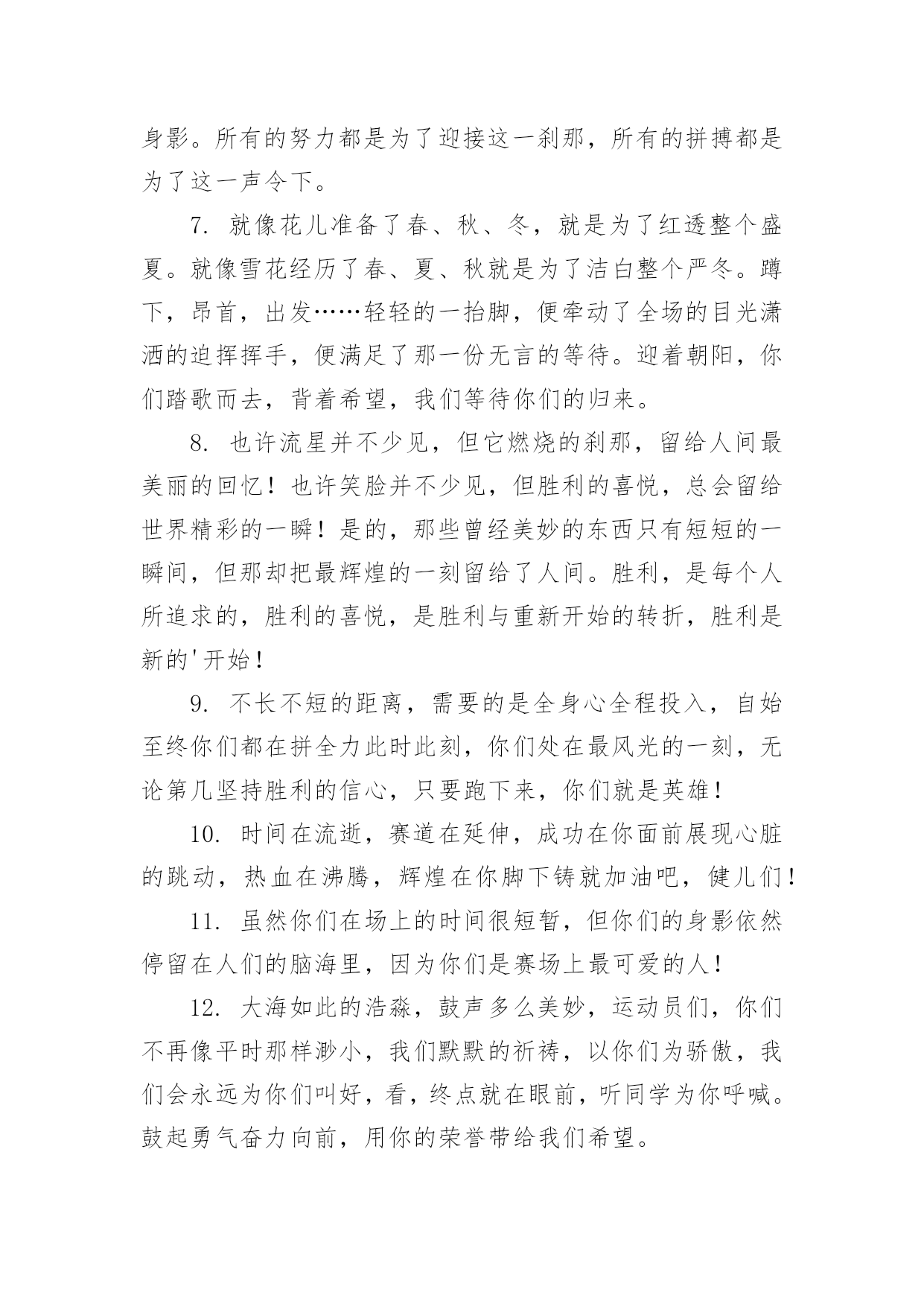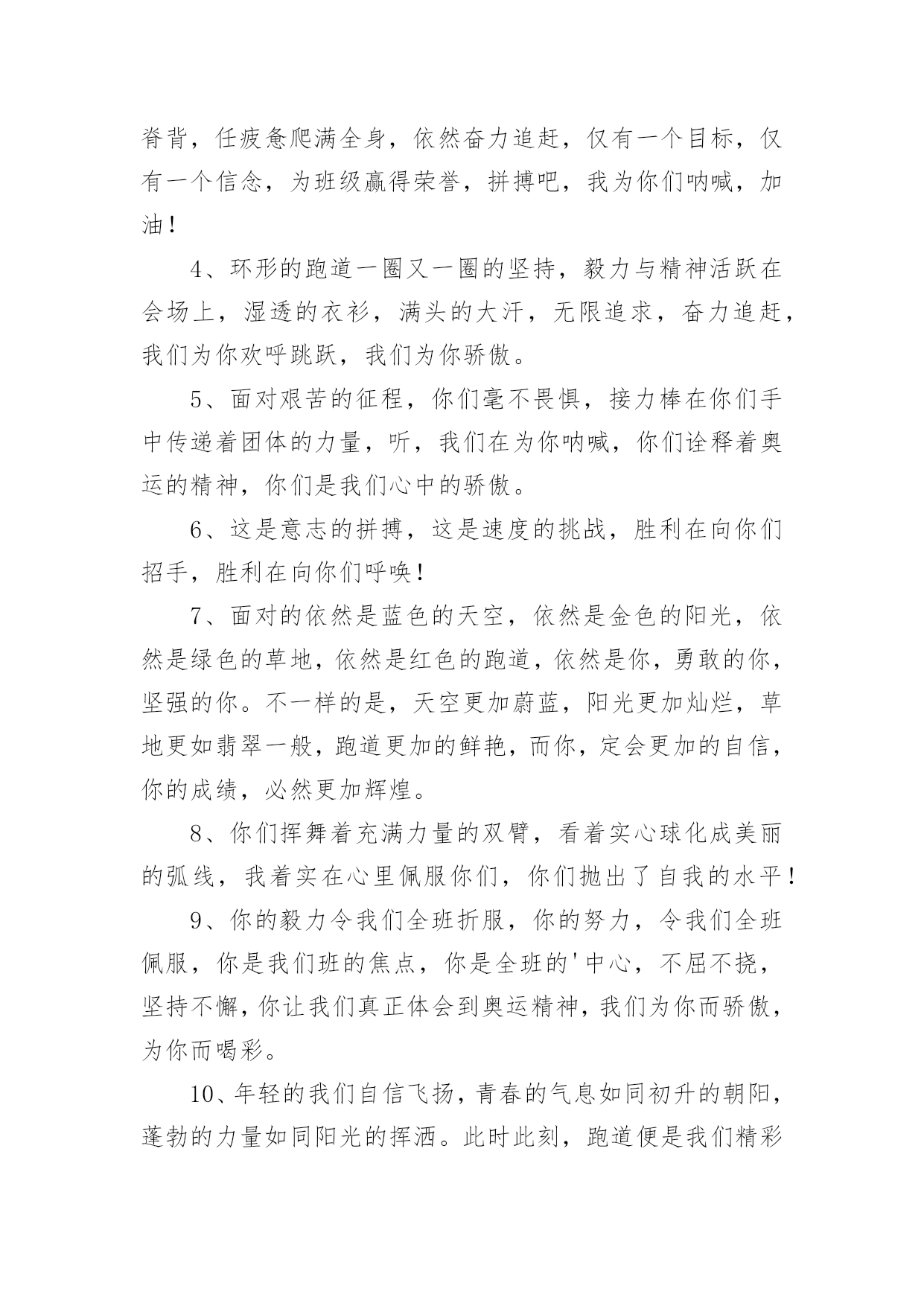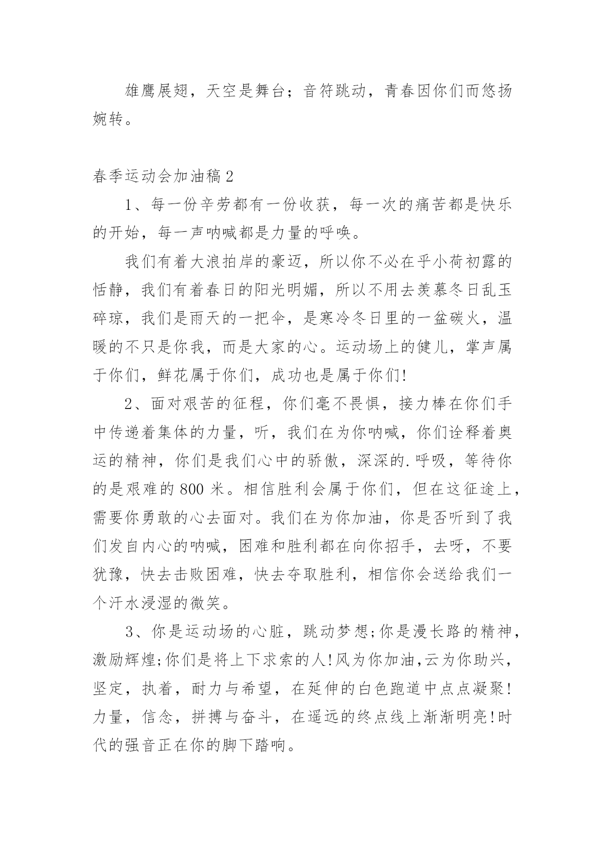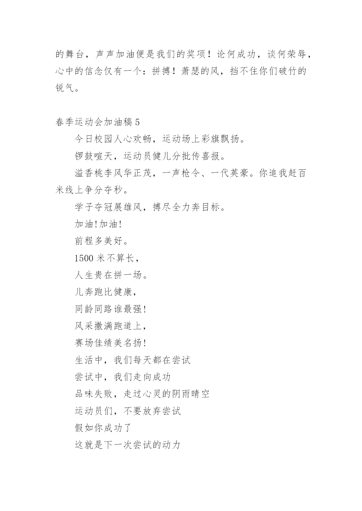 春季运动会加油稿春季运动会加油稿集合15篇在学习、工作生活中,很多地方都会使用到加油稿,借助加油稿可以给对方传达鼓励。写起加油稿来就毫无头绪?下面是小编整理的春季运动会加油稿,欢迎阅读与收藏。春季运动会加油稿1在赤色的长廊上,有两圈弧长,在绿色场地上,有你的明亮,画出两圈生命的轨迹,夺得无数由衷的惊喜。迈出不一样的生活旋律,奏出不同凡响的歌曲!你的表演场,让你自由徜徉!我们为你呐喊,虽然喊的火热朝天,但却希望给你送去荫凉,因为我们看到那液体来不及蒸发,滚落下来,又被溅起。我们并不期待什么,你已经是我们的'英雄。成败得失远不能与竞技快感相比,跌倒爬起,重新开始,比拼的是毅力和意志。无形的考验让你们不知所措,但竞技的遗憾让你们清醒自明,焕发挑战的斗志和激情。重在参与,享受这样的直白体验。淬炼自身,升华面对不快的心境。每段青春都要风吹雨打,才会别致;每寸记忆只有心存感恩,才会感动。年华似水,充实让生命精彩,努力让目标实现。雄鹰展翅,天空是舞台;音符跳动,青春因你们而悠扬婉转。春季运动会加油稿21、每一份辛劳都有一份收获,每一次的痛苦都是快乐的开始,每一声呐喊都是力量的呼唤。我们有着大浪拍岸的豪迈,所以你不必在乎小荷初露的恬静,我们有着春日的阳光明媚,所以不用去羡慕冬日乱玉碎琼,我们是雨天的一把伞,是寒冷冬日里的一盆碳火,温暖的不只是你我,而是大家的心。运动场上的健儿,掌声属于你们,鲜花属于你们,成功也是属于你们!2、面对艰苦的征程,你们毫不畏惧,接力棒在你们手中传递着集体的力量,听,我们在为你呐喊,你们诠释着奥运的精神,你们是我们心中的骄傲,深深的.呼吸,等待你的是艰难的800米。相信胜利会属于你们,但在这征途上,需要你勇敢的心去面对。我们在为你加油,你是否听到了我们发自内心的呐喊,困难和胜利都在向你招手,去呀,不要犹豫,快去击败困难,快去夺取胜利,相信你会送给我们一个汗水浸湿的微笑。3、你是运动场的心脏,跳动梦想;你是漫长路的精神,激励辉煌;你们是将上下求索的人!风为你加油,云为你助兴,坚定,执着,耐力与希望,在延伸的白色跑道中点点凝聚!力量,信念,拼搏与奋斗,在遥远的终点线上渐渐明亮!时代的强音正在你的脚下踏响。4、拼搏者,你是赛场上最亮的点。在你的眼中,不在乎胜利的欢乐和失败的眼泪,完全只是为了展示生命跳跃的节拍。拼搏者,你是生命乐章中最响的音符。在你的心中,只有不停拼搏的信念,用自己坚实的步伐去迈开人生新的旅程。场上的拼搏者,你是我们永远的骄傲!春季运动会加油稿3在黑白相间的跑道上,留下了你们灿烂的`身影。在枪响的那一刹那,似流星、似闪电,如骏马奔腾,如蛟龙腾空,如猛虎出洞,不在乎名次高低,不在乎成绩高下。努力拼搏,顽强奋斗,即使落后,也顽强不屈,永不退缩!春季运动会加油稿41、运动场上彩旗飘,运动健儿显英豪,跳跃身姿轻如燕,铅球飞落地动摇,百米冲刺如猛虎。2、梦想毕竟不一样于现实,失败是生活的一部分,谁也无法选择,无法拒绝。人生要自我去拼搏,去奋斗,在风雨中百折不挠,勇往前进,在每个驿站上都留下一段不悔的回忆。流泪不是失落,徘徊不是迷惑,成功属于那些战胜失败,坚持不懈勇于追求梦想的人。加油吧,运动健儿们!3、运动场上有你们的飒爽英姿,运动场上有你们拼搏的身影,面对漫漫的征程,你没有畏惧和退缩,任汗水打湿脊背,任疲惫爬满全身,依然奋力追赶,仅有一个目标,仅有一个信念,为班级赢得荣誉,拼搏吧,我为你们呐喊,加油!4、环形的跑道一圈又一圈的坚持,毅力与精神活跃在会场上,湿透的衣衫,满头的大汗,无限追求,奋力追赶,我们为你欢呼跳跃,我们为你骄傲。5、面对艰苦的征程,你们毫不畏惧,接力棒在你们手中传递着团体的力量,听,我们在为你呐喊,你们诠释着奥运的精神,你们是我们心中的骄傲。6、这是意志的拼搏,这是速度的挑战,胜利在向你们招手,胜利在向你们呼唤!7、面对的依然是蓝色的天空,依然是金色的阳光,依然是绿色的草地,依然是红色的跑道,依然是你,勇敢的你,坚强的你。不一样的是,天空更加蔚蓝,阳光更加灿烂,草地更如翡翠一般,跑道更加的鲜艳,而你,定会更加的自信,你的成绩,必然更加辉煌。8、你们挥舞着充满力量的双臂,看着实心球化成美丽的弧线,我着实在心里佩服你们,你们抛出了自我的水平!9、你的毅力令我们全班折服,你的努力,令我们全班佩服,你是我们班的焦点,你是全班的'中心,不屈不挠,坚持不懈,你让我们真正体会到奥运精神,我们为你而骄傲,为你而喝彩。10、年轻的我们自信飞扬,青春的气息如同初升的朝阳,蓬勃的力量如同阳光的挥洒。此时此刻,跑道便是我们精彩的舞台,声声加油便是我们的奖项!论何成功,谈何荣辱,心中的信念仅有一个:拼搏!萧瑟的风,挡不住你们破竹的锐气。春季运动会加油稿5今日校园人心欢畅,运动场上彩旗飘扬。锣鼓喧天,运动员健儿分批传喜报