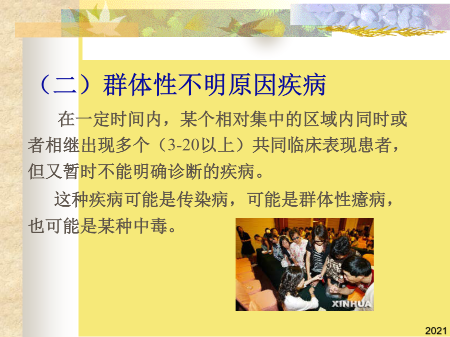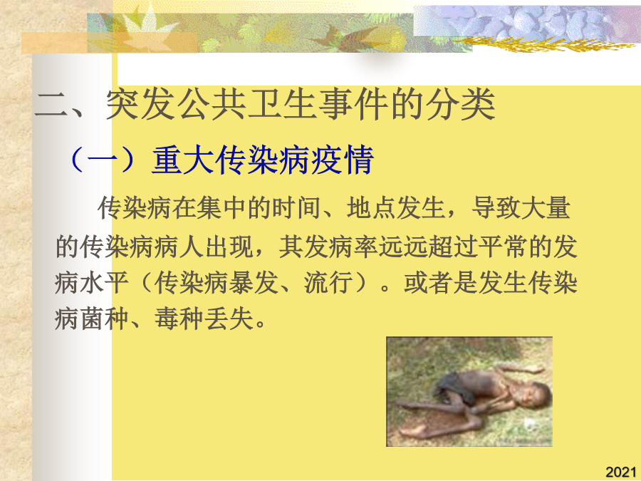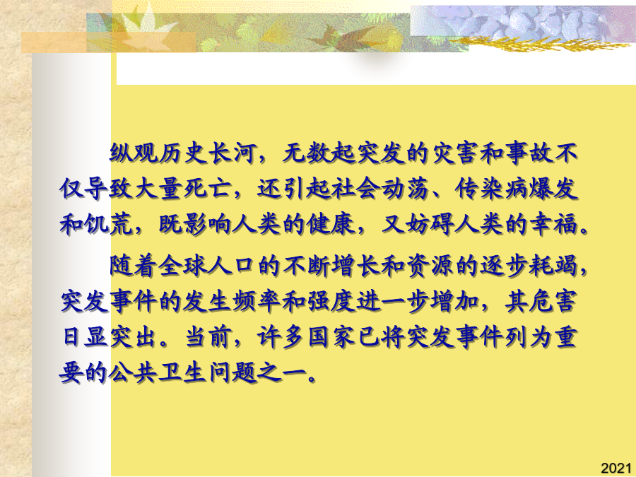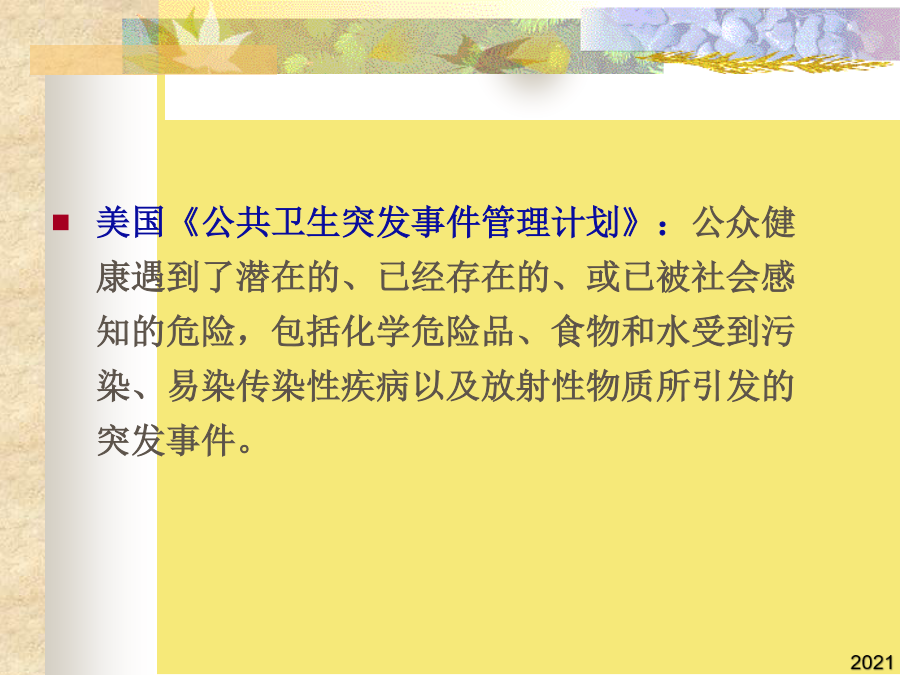 第二章突发公共卫生事件美国《公共卫生突发事件管理计划》:公众健康遇到了潜在的、已经存在的、或已被社会感知的危险,包括化学危险品、食物和水受到污染、易染传染性疾病以及放射性物质所引发的突发事件。纵观历史长河,无数起突发的灾害和事故不仅导致大量死亡,还引起社会动荡、传染病爆发和饥荒,既影响人类的健康,又妨碍人类的幸福。随着全球人口的不断增长和资源的逐步耗竭,突发事件的发生频率和强度进一步增加,其危害日显突出。当前,许多国家已将突发事件列为重要的公共卫生问题之一。二、突发公共卫生事件的分类发生新传染病或我国尚未发现的传染病发生或传入,并有扩散趋势,或发现我国已消灭的传染病重新流行。1986年4月26日凌晨1点23分,前苏联切尔诺贝利核电站四号反应堆突然发生猛烈爆炸。1984年12月3日,天还没亮,含有该厂生产的农药成分的毒云笼罩了全城,当时市民们仍在睡梦中。(三)较大突发公共卫生事件(Ⅲ级)控制蔓延--切断途径,保护危险人群(四)一次发生急性职业中毒9人以下,未出现死亡病例。根据突发公共卫生事件性质、危害程度、涉及范围,突发公共卫生事件划分为:2006年4月13日,在切尔诺贝利核电站30公里隔离区内,一个洋娃娃和一个防毒面具遗留在一所荒废的幼儿园里。(二)霍乱在一个县(市)行政区域内发生,1周内发病9例以下。①突发性,不易预测。霍乱在一个县(市)行政区域内发生,1周内发病10-29例,或波及2个以上县(市),或市(地)级以上城市的市区首次发生。①突发性,不易预测。松花江流域污染属重大环境污染事件(一)腺鼠疫在一个县(市)行政区域内发生,一个平均潜伏期内病例数未超过10例。1986年4月26日凌晨1点23分,前苏联切尔诺贝利核电站四号反应堆突然发生猛烈爆炸。2006年4月13日,在切尔诺贝利核电站30公里隔离区内,一个洋娃娃和一个防毒面具遗留在一所荒废的幼儿园里。这是人类有史以来最严重的核泄漏事故,也是人类利用核能的一大悲剧。美联社报道(二)群体性不明原因疾病在一定时间内,某个相对集中的区域内同时或者相继出现多个(3-20以上)共同临床表现患者,但又暂时不能明确诊断的疾病。这种疾病可能是传染病,可能是群体性癔病,也可能是某种中毒。(三)重大食物中毒事件(四)环境污染中毒事件全球气候变暖臭氧层空洞90年代以来水体污染日趋严重天灾&人祸?(五)意外事故印度博帕尔灾难1980年,印度博帕尔化工厂开始生产一些专治危害小麦害虫的化学农药。1984年12月3日,天还没亮,含有该厂生产的农药成分的毒云笼罩了全城,当时市民们仍在睡梦中。人们从朦胧中被毒气熏醒,头重脚轻,四肢无力,而且得不到任何帮助,约1万人躺在了博帕尔市的大街上,再也没有起来,另外10万人不同程度地中毒。(三)一次食物中毒人数30-99人,未出现死亡病例。腺鼠疫发生流行,在一个县(市)行政区域内,一个平均潜伏期内连续发病10例以上,或波及2个以上县(市)。在一个县(市)行政区域内,一个平均潜伏期内(6天)发生5例以上肺鼠疫、肺炭疽病例;(二)霍乱在一个县(市)行政区域内发生,1周内发病9例以下。(二)霍乱在一个县(市)行政区域内发生,1周内发病9例以下。④处理不及时或不恰当可能影响公众心理,影响社会稳定,造成严重的经济损失。(三)重大食物中毒事件①突发性,不易预测。突发公共卫生事件的主要特征:2006年4月13日,在切尔诺贝利核电站30公里隔离区内,一个洋娃娃和一个防毒面具遗留在一所荒废的幼儿园里。霍乱在一个市(地)行政区域内流行,1周内发病30例以上,或波及2个以上市(地),有扩散趋势。太湖湖体富营养化已从中度向重度转变,全湖富营养化水体面积比例已从39%增加到63%。(五)县级以上人民政府卫生行政部门认定的其它一般突发公共卫生事件。《国家突发公共卫生事件应急预案》:突然发生,造成或者可能造成社会公众身心健康严重损害的重大传染病、群体性不明原因疾病、重大食物和职业中毒以及因自然灾害、事故灾难或社会安全等事件引起的严重影响公众身心健康的公共卫生事件。根据突发公共卫生事件性质、危害程度、涉及范围,突发公共卫生事件划分为:2002年9月14日早晨,南京市江宁区汤山镇作厂中学和东湖丽岛工地部分学生和民工因食用了饮食店内的油条、烧饼、麻团等食物后发生中毒。切尔诺贝利核电站爆炸④处理不及时或不恰当可能影响公众心理,影响社会稳定,造成严重的经济损失。传染病在集中的时间、地点发生,导致大量的传染病病人出现,其发病率远远超过平常的发病水平(传染病暴发、流行)。outbreaksofdisease这是人类有史以来最严重的核泄漏事故,也是人类利用核能的一大悲剧。在一个县(市)行政区域内发现群体性不