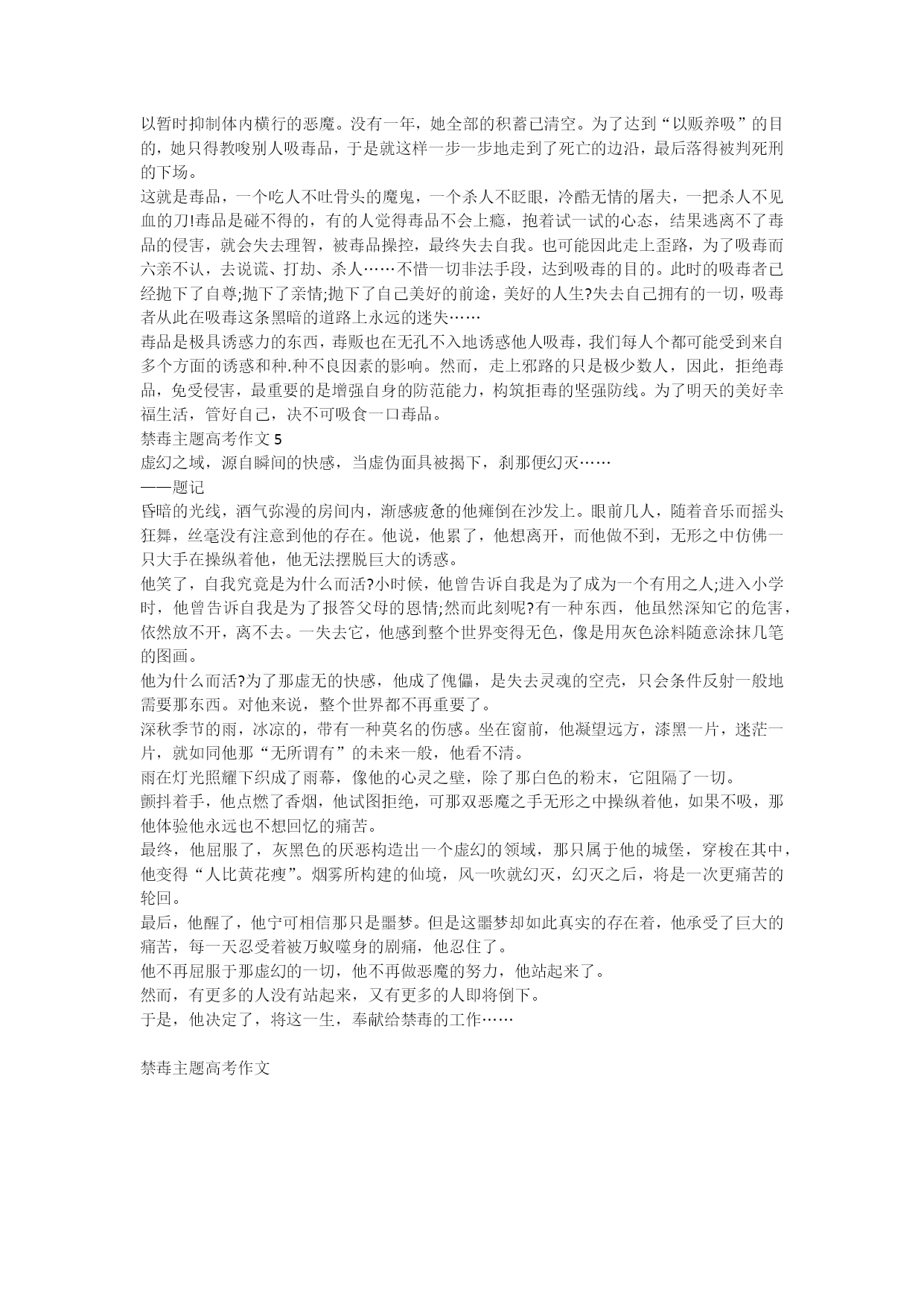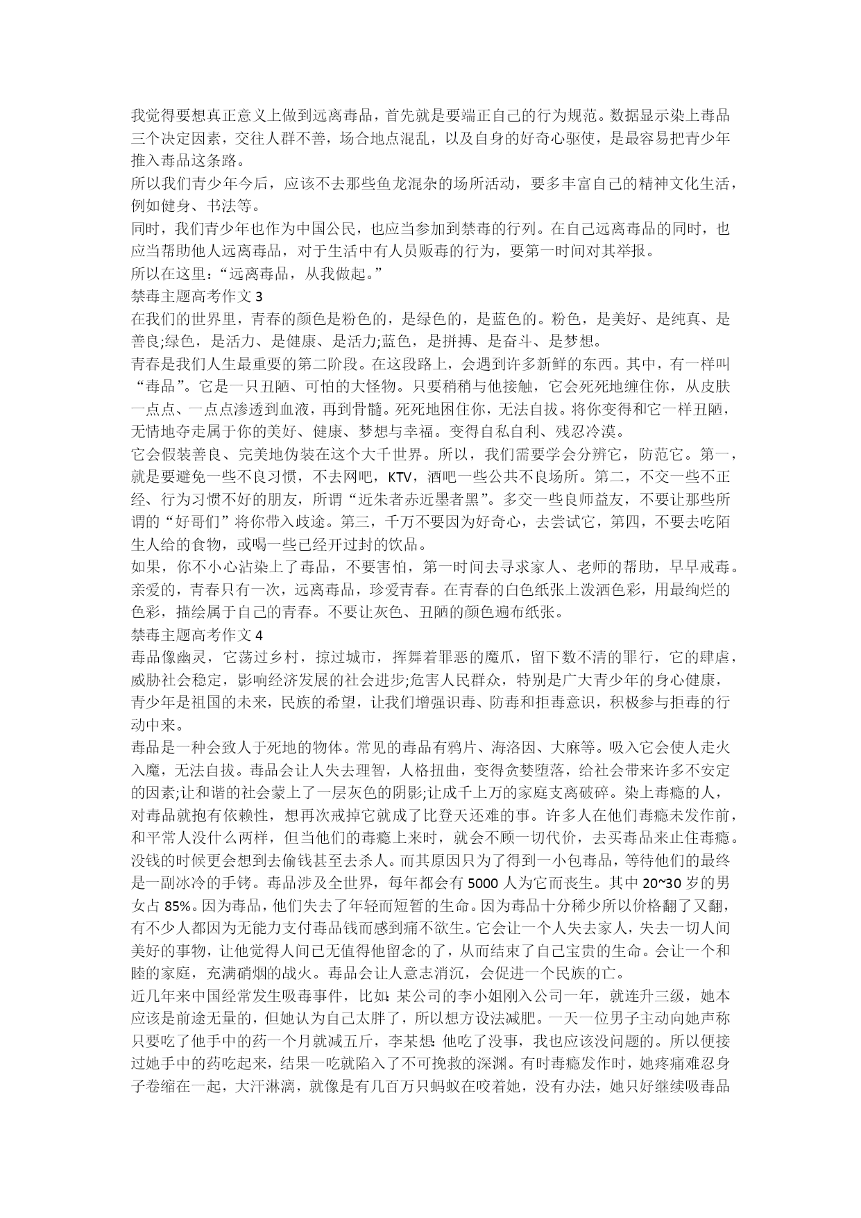 禁毒主题高考作文一讲到禁毒,有同学就会认为:禁毒跟我很遥远,与我无关。其实不然,毒,万恶不赦。下面是xx整理分享的禁毒主题高考作文,欢迎阅读与借鉴,希望对你们有帮助!禁毒主题高考作文1毒品,是一种一旦碰上就再也不能自拔的东西。应对它们,我们要时刻持续警惕,不能被它们迷惑。毒品虽然外表美丽,但是它们的内心却是无比的邪恶。早在100多年前,毒品的一种——鸦片,就已经悄无声息地来到了中国,英国人为了牟取暴利,不断地向腐败昏庸的清朝运输这种令人倾家荡产的恶魔。古老的中国从此陷入了资本主义的漩涡。有着5000多年光辉历史的国度在鸦片的折磨下,屡战屡败,也落了一个“东亚病夫”的耻辱称号。还好大臣林则徐禁烟、缴烟、销烟,最后在历史的舞台上留下了应有的尊严。在新中国成立几十年后,毒品又在社会上横行霸道了:海洛因、摇头丸、K粉、冰毒。越来越多的新型毒品出现了,也有越来越多的人家破人亡,前途堪忧。要禁毒,就要先了解毒品的种类。先说一种比较常见的吧。冰毒,即“甲基苯丙胺”,外观为纯白结晶体,故被称为“冰”。对人体中枢神经系统具有极强的刺激作用,且毒性强烈。冰毒的精神依靠性很强,吸食后会产生强烈的生理兴奋,超多消耗人的体力和降低免疫功能,严重损害心脏、大脑组织甚至导致死亡。还会造成精神障碍,表现出妄想、好斗、错觉,从而引发暴力行为。可想而知,不管是哪一种毒品,危害都是不堪设想的。一旦沾上瘾,不仅仅仅家庭会陷入经济破产、亲属离散、甚至家破人亡的困难境地。还会对社会造成财富的巨大损失和浪费,同时毒品活动还造成环境恶化,缩小了人类的生存空间。它还能扰乱社会治安,给社会安定带来巨大威胁。毒品不仅仅会危害成年人,对青少年也会造成难以想象的摧残,它能使花季少年走向犯罪的道路。还记得云南省前两年发生的一齐凶杀案,凶手竟然是四名十六岁的花季少年!那起凶杀案发生在云南昆明的一所豪华住宅里,那所住宅的主人很有钱。一天,他刚走出家门准备去买东西,被四个从门后跳出来的少年推回屋中,全身被捅十几刀。他们走了几万元的现金。原先这四位十六岁的少年为了吸毒,先是偷拿家里的钱,变卖家里的东西,而后就发展到去社会上偷和骗,最后竟合伙实施了这起杀人抢钱案。由此可见,毒品的危害是多么的大!我们是祖国的花朵,是祖国的期望。吸毒不仅仅会危害我们自我,而且对国家的将来也不利。为了我们的祖国,我们要铭记中国以前因鸦片而堕落的屈辱史,抵制别人的诱惑,也要保护自我的亲人朋友不受毒品威胁,让我们一齐珍爱生命,远离毒品吧!禁毒主题高考作文2有一句说:“吸毒一口,落入虎口。”1839年,震惊中外的“虎门销烟”告诫世人要认识到毒品的危害,以及毒品严重危害人类发展的严重性。今天,在多媒体的ppt展示中,我对毒品有了更进一步的了解,以及现在毒品吸食逐渐呈低龄化。其实,在之前的我认为,毒品还离我很遥远,总会对这方面的事情掉以轻心。可是毒品就潜伏在我们身边。正如视频当中所说,现在的毒品伪装各种样子,也不易察觉、发现。例如;K粉,很多时候会掺杂在饮料当中,而且进入液体当中不会有明显的变化,就连味道也不会有太大差别。换句话说可能一不注意,就跌入到毒品的万丈深渊当中。在视频中,我看到很多青少年,本该享受青春的阳光,却因好奇心驱使,染上了吸毒的恶习。终日脑子想着毒品,不惜任何代价吸食毒品,甚至有人走火入魔,断送了自己的生命。根据国家《禁毒法》规定,对于满16岁至18岁吸食毒品对其长达2年的强制管教。不过,试问谁的青春有第二次?可能就是一时糊涂,断送了自己的前程,失去老师父母对自己的期望,这又是多么可悲的事情!我觉得要想真正意义上做到远离毒品,首先就是要端正自己的行为规范。数据显示染上毒品三个决定因素,交往人群不善,场合地点混乱,以及自身的好奇心驱使,是最容易把青少年推入毒品这条路。所以我们青少年今后,应该不去那些鱼龙混杂的场所活动,要多丰富自己的精神文化生活,例如健身、书法等。同时,我们青少年也作为中国公民,也应当参加到禁毒的行列。在自己远离毒品的同时,也应当帮助他人远离毒品,对于生活中有人员贩毒的行为,要第一时间对其举报。所以在这里:“远离毒品,从我做起。”禁毒主题高考作文3在我们的世界里,青春的颜色是粉色的,是绿色的,是蓝色的。粉色,是美好、是纯真、是善良;绿色,是活力、是健康、是活力;蓝色,是拼搏、是奋斗、是梦想。青春是我们人生最重要的第二阶段。在这段路上,会遇到许多新鲜的东西。其中,有一样叫“毒品”。它是一只丑陋、可怕的大怪物。只要稍稍与他接触,它会死死地缠住你,从皮肤一点点、一点点渗透到血液,再到骨髓。死死地困住你,无法自拔。将你变得和它一样丑陋,无情地夺走属于你的美好、健康、梦想与幸福。变得自私自利、残忍冷漠。它会假装善良、完美地伪装在这个大千世界。所以,我们需要学会分辨