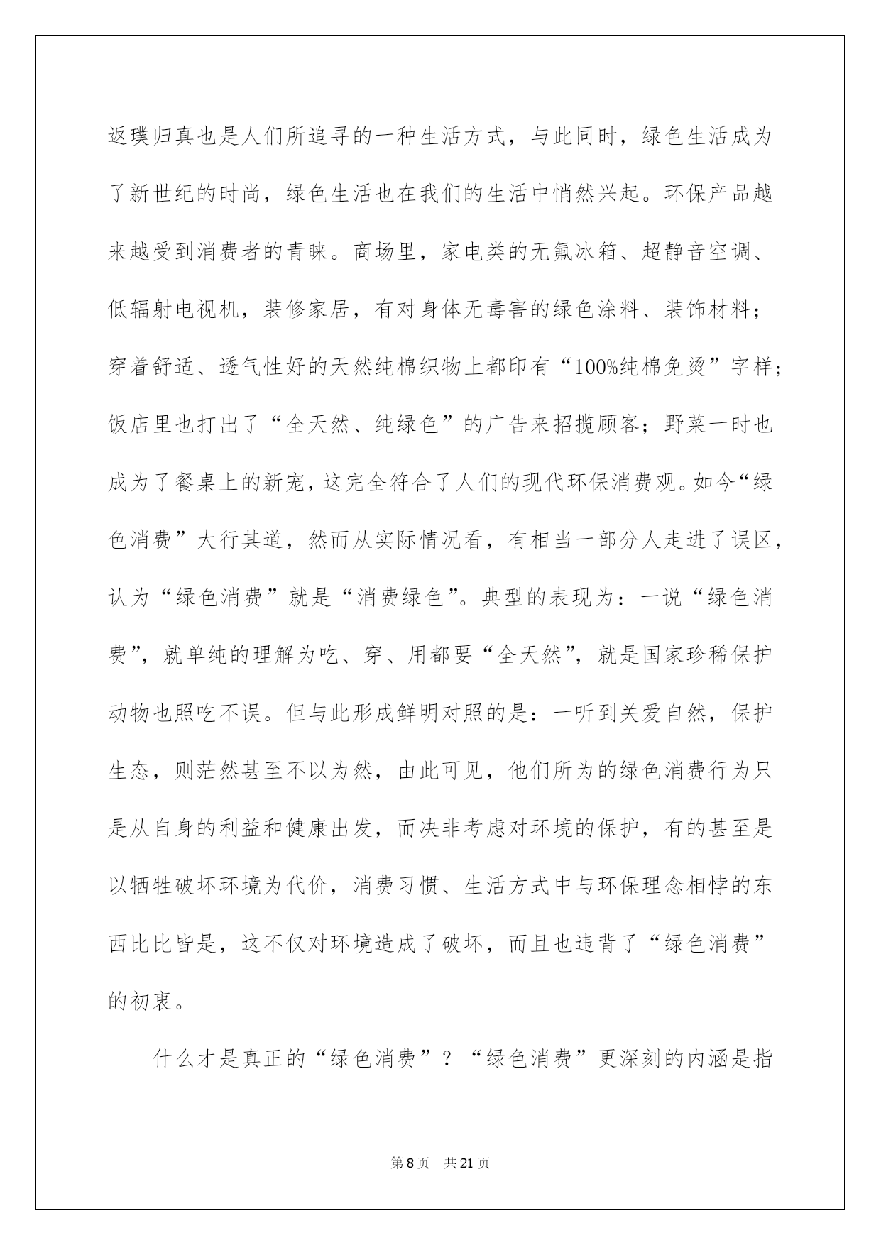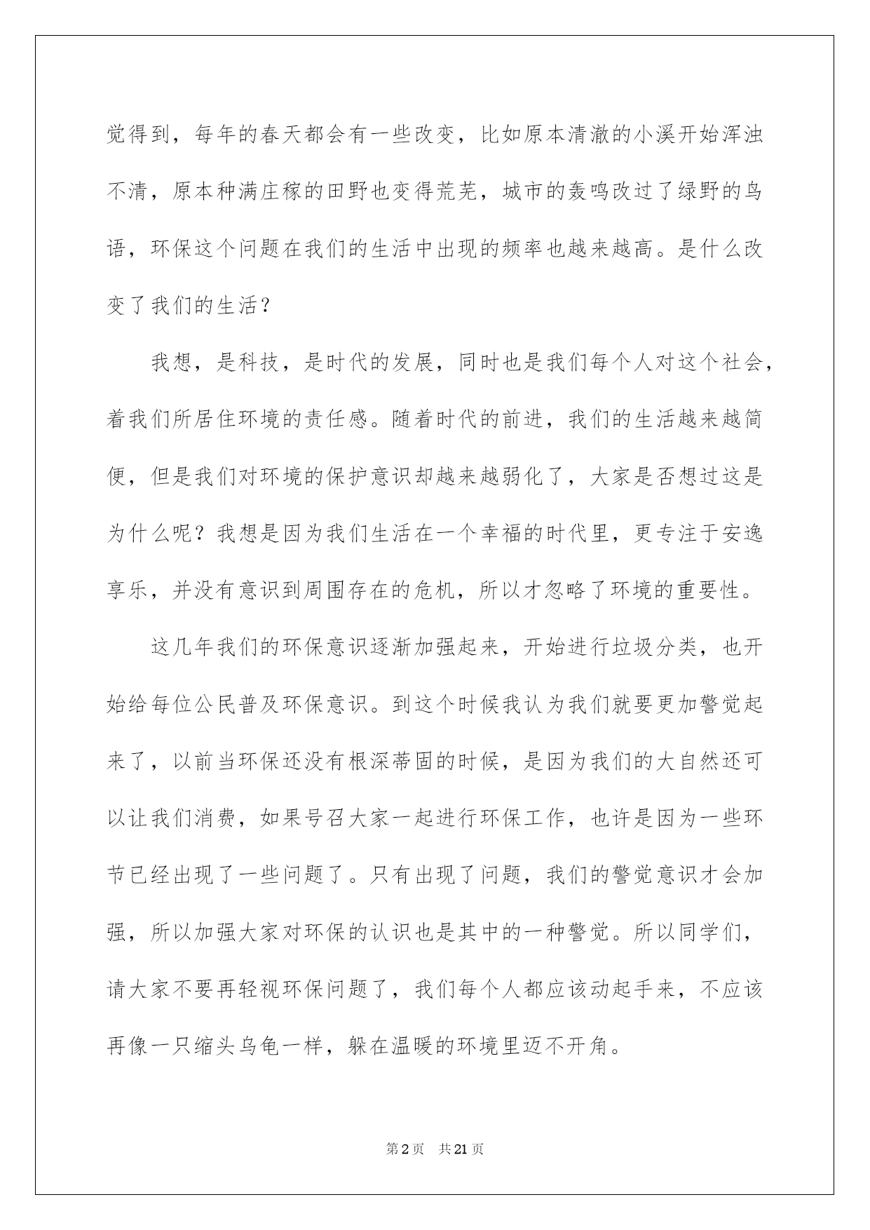 第PAGE\*Arabic\*MERGEFORMAT21页共NUMPAGES\*Arabic\*MERGEFORMAT21页第PAGE\*MERGEFORMAT21页共NUMPAGES\*MERGEFORMAT21页第PAGE\*MERGEFORMAT21页共NUMPAGES\*MERGEFORMAT21页第PAGE\*MERGEFORMAT21页共NUMPAGES\*MERGEFORMAT21页第PAGE\*MERGEFORMAT21页共NUMPAGES\*MERGEFORMAT21页第PAGE\*MERGEFORMAT21页共NUMPAGES\*MERGEFORMAT21页第PAGE\*MERGEFORMAT21页共NUMPAGES\*MERGEFORMAT21页第PAGE\*MERGEFORMAT21页共NUMPAGES\*MERGEFORMAT21页第PAGE\*MERGEFORMAT21页共NUMPAGES\*MERGEFORMAT21页第PAGE\*MERGEFORMAT21页共NUMPAGES\*MERGEFORMAT21页第PAGE\*MERGEFORMAT21页共NUMPAGES\*MERGEFORMAT21页2022绿色环保演讲稿绿色环保演讲稿演讲稿的写法比较灵活,可以根据会议的内容、一件事事后的感想、需要等情况而有所区别。在快速变化和不断变革的新时代,演讲稿使用的情况越来越多,你知道演讲稿怎样才能写的好吗?以下是我收集整理的绿色环保演讲稿,欢迎阅读与收藏。绿色环保演讲稿1尊敬的老师,亲爱的同学:大家好!非常开心我们能够再一次的相聚在一起,看着大家生机勃勃的脸庞,我仿佛看到了漫山遍野的鲜花和绿草,在春天的抚摸之中,更加的激动澎湃。我们一谈到生机,就会想到春天,因为在春天,有着一年之中最大的生机感,大地一夜之间复苏,而我们也迎来了一个五彩缤纷的世界。在如此美好的景象一边,堆放着的一堆问号。大家猜猜是什么?那就是我们的生态环境,春天是美好的,但是大家也应该能够感觉得到,每年的春天都会有一些改变,比如原本清澈的小溪开始浑浊不清,原本种满庄稼的田野也变得荒芜,城市的轰鸣改过了绿野的鸟语,环保这个问题在我们的生活中出现的频率也越来越高。是什么改变了我们的生活?我想,是科技,是时代的发展,同时也是我们每个人对这个社会,着我们所居住环境的责任感。随着时代的前进,我们的生活越来越简便,但是我们对环境的保护意识却越来越弱化了,大家是否想过这是为什么呢?我想是因为我们生活在一个幸福的时代里,更专注于安逸享乐,并没有意识到周围存在的危机,所以才忽略了环境的重要性。这几年我们的环保意识逐渐加强起来,开始进行垃圾分类,也开始给每位公民普及环保意识。到这个时候我认为我们就要更加警觉起来了,以前当环保还没有根深蒂固的时候,是因为我们的大自然还可以让我们消费,如果号召大家一起进行环保工作,也许是因为一些环节已经出现了一些问题了。只有出现了问题,我们的警觉意识才会加强,所以加强大家对环保的认识也是其中的一种警觉。所以同学们,请大家不要再轻视环保问题了,我们每个人都应该动起手来,不应该再像一只缩头乌龟一样,躲在温暖的环境里迈不开角。绿色环保,是我们今后生活的一道主题,也是我们平时生活中最应该去注重的一部分,为地球妈妈创建一个好的环境,她也会回馈于我们更好的未来。天地之间,太多的循环,而我们人类也是其中的一环。所以为了这个大环境,为了我们的世界,就让我们一起动起手来,去保护我们的地球吧!去保护我们的未来吧!去保护未来的世界吧!绿色环保演讲稿2尊敬的老师,亲爱的同学们:大家好!今天我演讲的题目是:绿色环保,从我做起随着我们的环境日益恶化,这就引起了很多空气的问题,比如人类乱扔垃圾、工厂排放出的烟雾、汽车里面的汽油等,这些环境恶化的问题,是与我们人类息息相关的,所以我们要保护环境。现在人们出行都坐汽车,可是你们知道吗?汽车尾气中含有过量的有毒气体,这样的气体排放在空气中对人体有毒,对空气也有很大的污染,虽然对我们的出行很方便,但那是对空气有很大的污染,希望大家以后少坐汽车,骑一下自行车。还有就是有一些化工厂常常排放出一些烟雾,这些排放出的烟雾对空气也是有污染的,也是有毒的,希望少排出这些烟雾。当然只保护空气是远远不够的,也有一个同样严重的问题,大家都知道树木有很多的好处,它可以为人们遮风挡雨,当然它对环境保护也有很多的好处,含有水源、保护水土等,现在很多地方都能用到木头,我们平时用的书、本、家具等,都会用到木头,树木也可以美化环境,所以树木和我们生活息息相关,几乎每天都有人砍伐树木,如果没有了