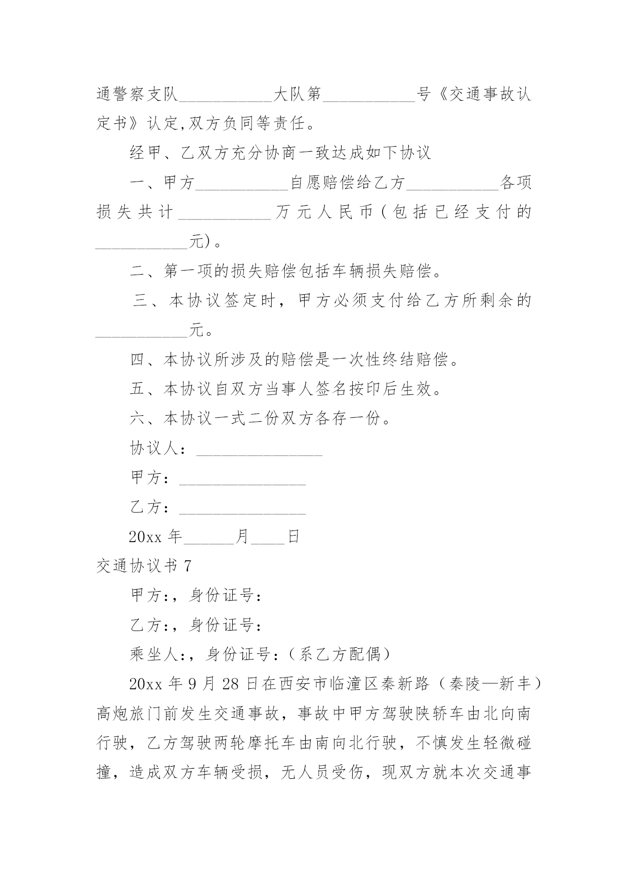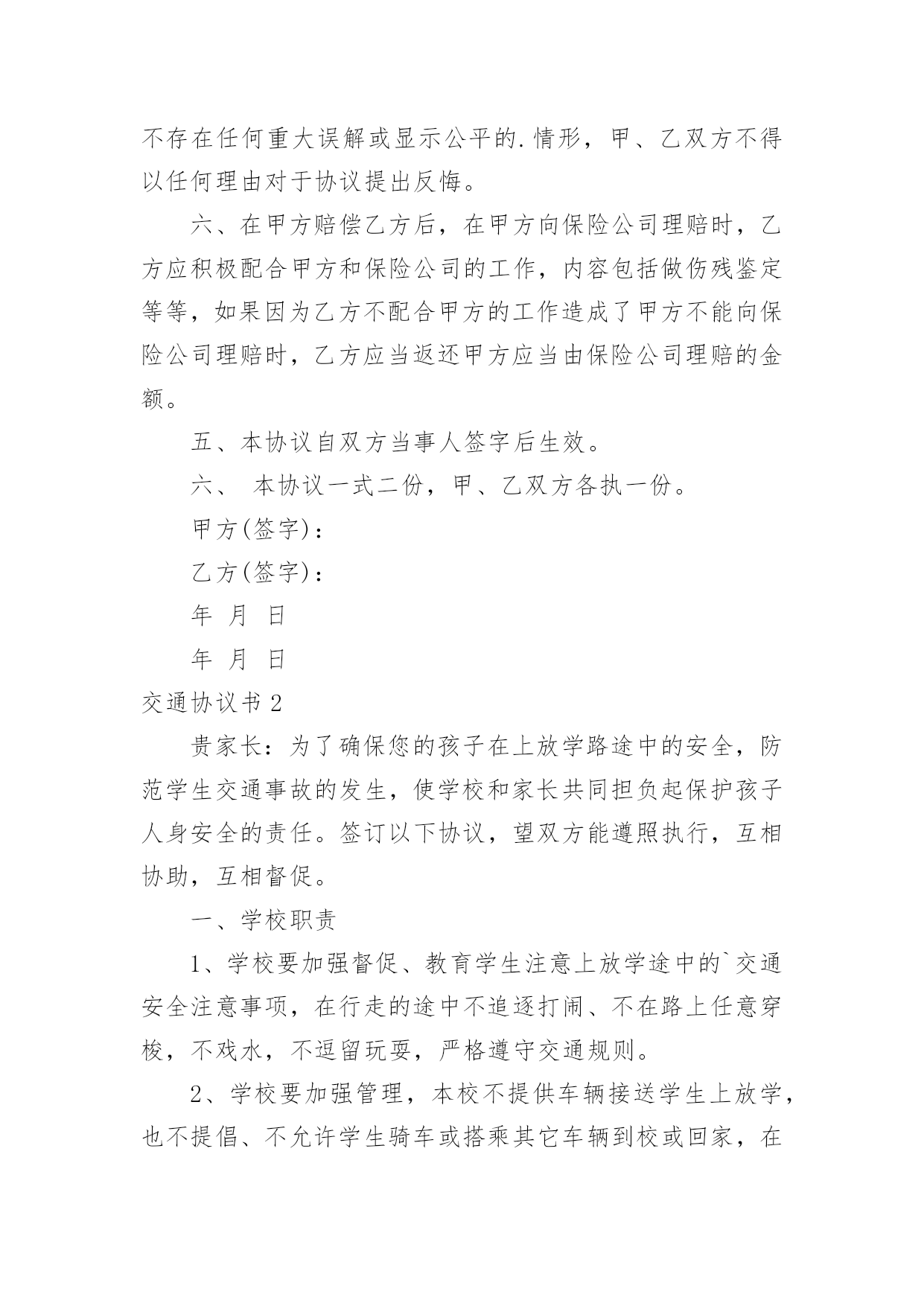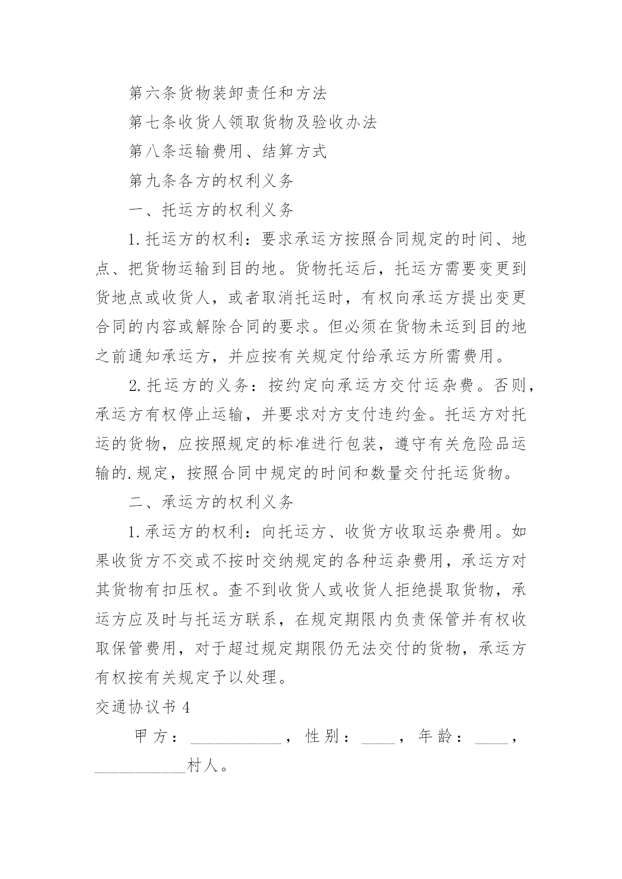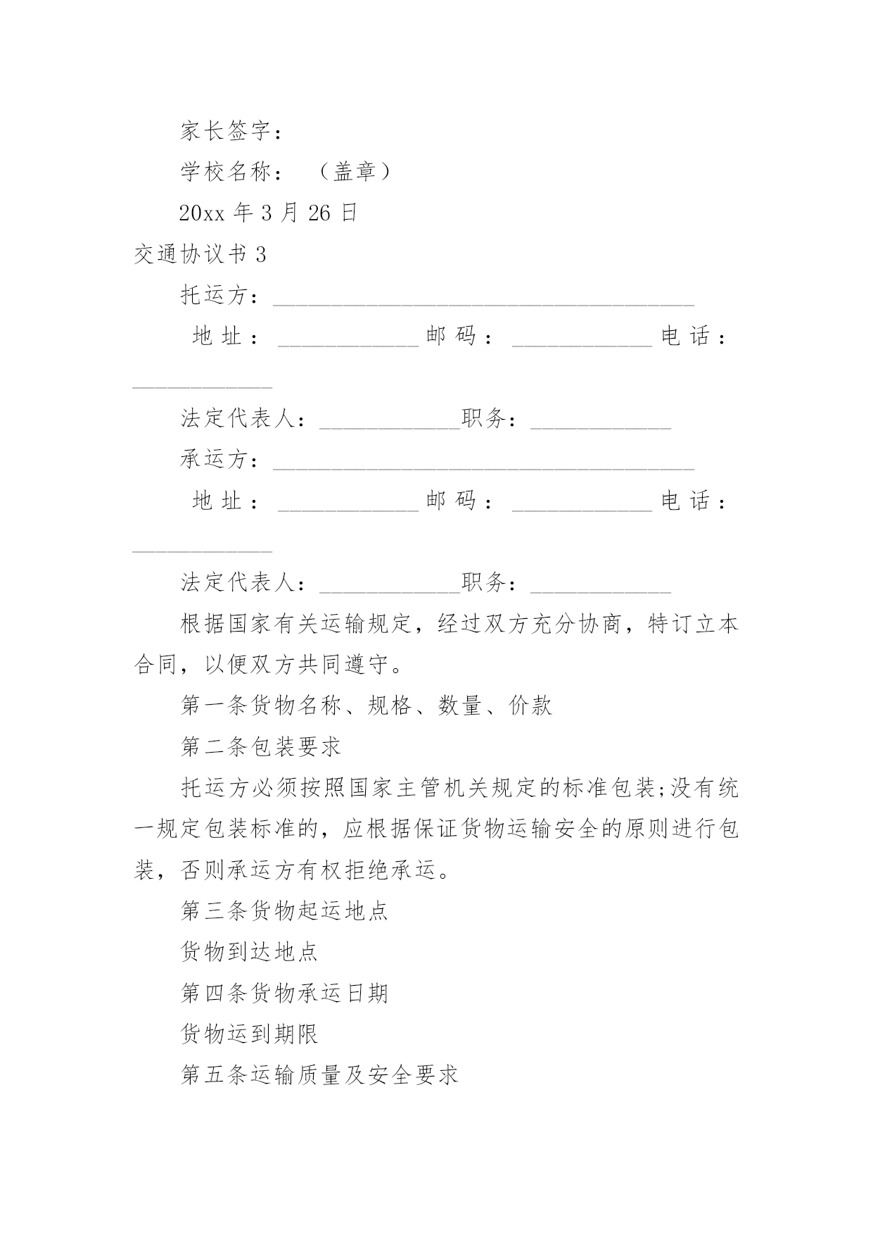 交通协议书交通协议书在发展不断提速的社会中,很多情况下我们需要用到协议,签订协议可以解决现实生活中的纠纷。我敢肯定,大部分人都对拟定协议很是头疼的,以下是小编整理的交通协议书,仅供参考,大家一起来看看吧。交通协议书1甲方:乙方:对于年月日发生的交通事故,经甲、乙双方充分协商一致达成如下协议:一、甲方自愿赔偿给乙方各项损失共计元人民币(包括已经支付的元)。二、损失赔偿包括乙方的交通费、护理费、误工费、伙食住宿费、被扶养人生活费、后续治疗费、精神损失费、残疾赔偿金等各项损失赔偿。三、本协议签定时,甲方须支付给乙方所剩余的元。四、本协议所涉及的赔偿是一次性终结赔偿,甲方支付乙方费用后,今后乙方不得以任何理由向甲方主张任何权利,甲方不再负有任何赔偿责任。五、本协议签订时,双方均是在自愿的情形下签订的,不存在任何重大误解或显示公平的.情形,甲、乙双方不得以任何理由对于协议提出反悔。六、在甲方赔偿乙方后,在甲方向保险公司理赔时,乙方应积极配合甲方和保险公司的工作,内容包括做伤残鉴定等等,如果因为乙方不配合甲方的工作造成了甲方不能向保险公司理赔时,乙方应当返还甲方应当由保险公司理赔的金额。五、本协议自双方当事人签字后生效。六、本协议一式二份,甲、乙双方各执一份。甲方(签字):乙方(签字):年月日年月日交通协议书2贵家长:为了确保您的孩子在上放学路途中的安全,防范学生交通事故的发生,使学校和家长共同担负起保护孩子人身安全的责任。签订以下协议,望双方能遵照执行,互相协助,互相督促。一、学校职责1、学校要加强督促、教育学生注意上放学途中的`交通安全注意事项,在行走的途中不追逐打闹、不在路上任意穿梭,不戏水,不逗留玩耍,严格遵守交通规则。2、学校要加强管理,本校不提供车辆接送学生上放学,也不提倡、不允许学生骑车或搭乘其它车辆到校或回家,在路上不与陌生人或不相干的人搭话,以确保学生在行走途中的安全。二、家长职责(一)交通安全1、对于12周岁以下的学生需要家长亲自接送。2、对于距学校较远、家长又不便每天接送的学生,家长可安排学生乘坐经交管部门检查证照齐全、车况良好、符合营运要求的车辆。(二)安全教育1、请教育您的孩子在路途中一定要注意安全,遵守交通规则。2、教育孩子听从老师和学校的管理,如果您的孩子因事因病请假不能来上学,望您能及时通知相应的班主任或学校。3、如果您的孩子是骑车、租车上学或回家,不要让您的孩子乘坐,并教育、监督您的孩子不要乘坐下列车辆:报废车辆,无牌、无证、无保险合格证车辆,超员车辆,货运车、摩托车、机动三轮车、农用车等非客运车辆,否则一旦出现交通安全问题,一切责任与学校无关。尊敬的家长,您孩子上学、放学途中的安全是我们学校工作的重点,也是家长关心的问题,今本校特制定此协议书,望我们双方相互沟通,相互协作,相互配合,共同遵守此协议所列的各项条款,确保您的孩子在上放学途中的安全。学生年级姓名:家长签字:学校名称:(盖章)20xx年3月26日交通协议书3托运方:____________________________________地址:____________邮码:____________电话:____________法定代表人:____________职务:____________承运方:____________________________________地址:____________邮码:____________电话:____________法定代表人:____________职务:____________根据国家有关运输规定,经过双方充分协商,特订立本合同,以便双方共同遵守。第一条货物名称、规格、数量、价款第二条包装要求托运方必须按照国家主管机关规定的标准包装;没有统一规定包装标准的,应根据保证货物运输安全的原则进行包装,否则承运方有权拒绝承运。第三条货物起运地点货物到达地点第四条货物承运日期货物运到期限第五条运输质量及安全要求第六条货物装卸责任和方法第七条收货人领取货物及验收办法第八条运输费用、结算方式第九条各方的权利义务一、托运方的权利义务1.托运方的权利:要求承运方按照合同规定的时间、地点、把货物运输到目的地。货物托运后,托运方需要变更到货地点或收货人,或者取消托运时,有权向承运方提出变更合同的内容或解除合同的要求。但必须在货物未运到目的地之前通知承运方,并应按有关规定付给承运方所需费用。2.托运方的义务:按约定向承运方交付运杂费。否则,承运方有权停止运输,并要求对方支付违约金。托运方对托运的货物,应按照规定的标准进行包装,遵守有关危险品运输的.规定,按照合同中规定的时间和数量交付托运货物。二、承运方的权利义务1.承运方的权利:向托运方、收货方收取运杂费用。如果收货方不交或不按时交纳规定的各种运杂费用,承运方对其货物有