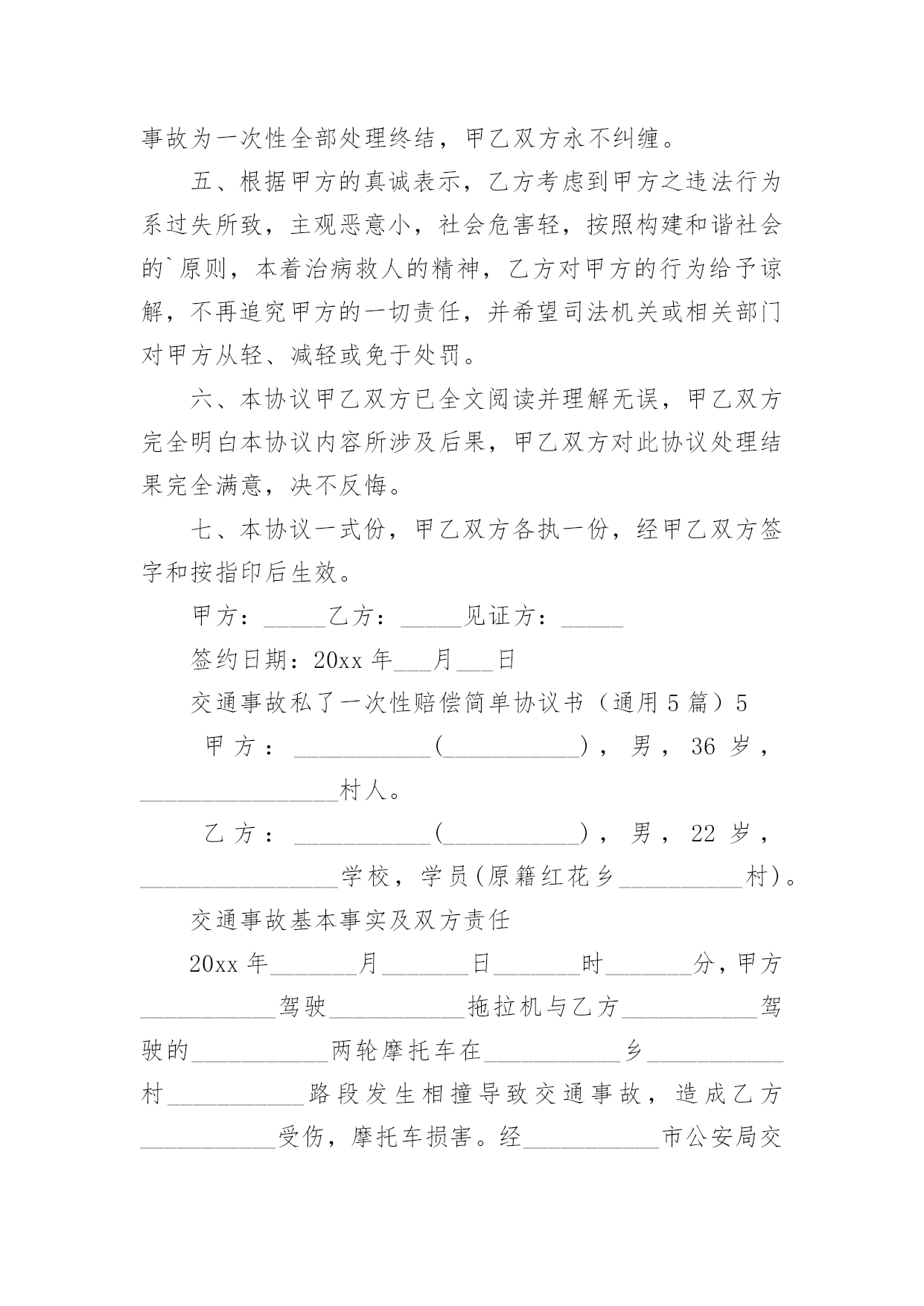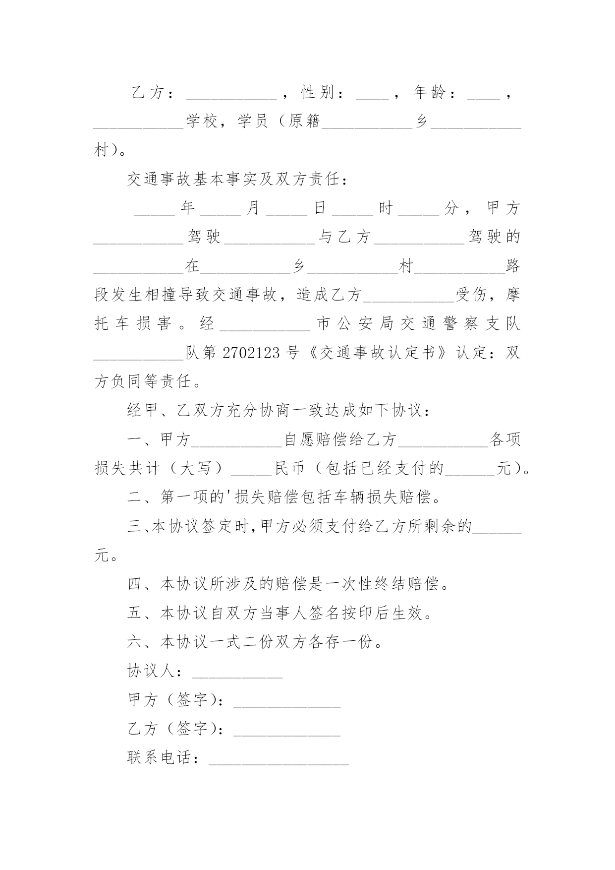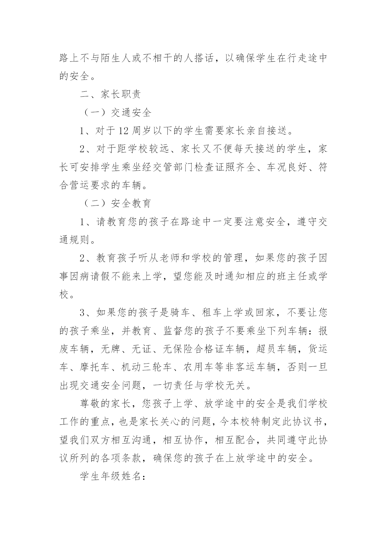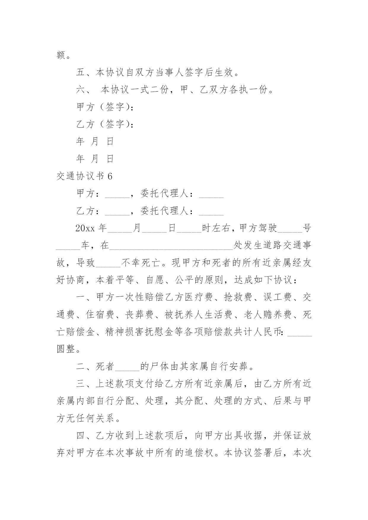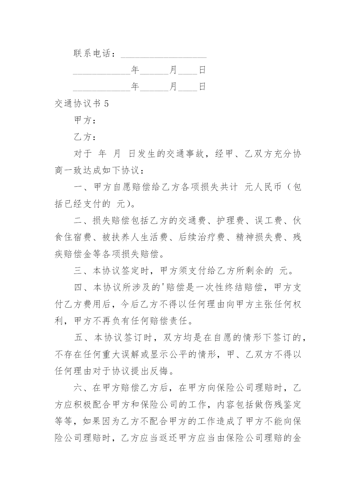 交通协议书交通协议书在发展不断提速的社会中,很多情况下我们需要用到协议,签订协议可以解决现实生活中的纠纷。我敢肯定,大部分人都对拟定协议很是头疼的,以下是小编整理的交通协议书,仅供参考,大家一起来看看吧。交通协议书1甲方:乙方:对于年月日发生的交通事故,经甲、乙双方充分协商一致达成如下协议:一、甲方自愿赔偿给乙方各项损失共计元人民币(包括已经支付的元)。二、损失赔偿包括乙方的交通费、护理费、误工费、伙食住宿费、被扶养人生活费、后续治疗费、精神损失费、残疾赔偿金等各项损失赔偿。三、本协议签定时,甲方须支付给乙方所剩余的元。四、本协议所涉及的赔偿是一次性终结赔偿,甲方支付乙方费用后,今后乙方不得以任何理由向甲方主张任何权利,甲方不再负有任何赔偿责任。五、本协议签订时,双方均是在自愿的情形下签订的,不存在任何重大误解或显示公平的.情形,甲、乙双方不得以任何理由对于协议提出反悔。六、在甲方赔偿乙方后,在甲方向保险公司理赔时,乙方应积极配合甲方和保险公司的工作,内容包括做伤残鉴定等等,如果因为乙方不配合甲方的工作造成了甲方不能向保险公司理赔时,乙方应当返还甲方应当由保险公司理赔的金额。五、本协议自双方当事人签字后生效。六、本协议一式二份,甲、乙双方各执一份。甲方(签字):乙方(签字):年月日年月日交通协议书2贵家长:为了确保您的孩子在上放学路途中的安全,防范学生交通事故的发生,使学校和家长共同担负起保护孩子人身安全的责任。签订以下协议,望双方能遵照执行,互相协助,互相督促。一、学校职责1、学校要加强督促、教育学生注意上放学途中的`交通安全注意事项,在行走的途中不追逐打闹、不在路上任意穿梭,不戏水,不逗留玩耍,严格遵守交通规则。2、学校要加强管理,本校不提供车辆接送学生上放学,也不提倡、不允许学生骑车或搭乘其它车辆到校或回家,在路上不与陌生人或不相干的人搭话,以确保学生在行走途中的安全。二、家长职责(一)交通安全1、对于12周岁以下的学生需要家长亲自接送。2、对于距学校较远、家长又不便每天接送的学生,家长可安排学生乘坐经交管部门检查证照齐全、车况良好、符合营运要求的车辆。(二)安全教育1、请教育您的孩子在路途中一定要注意安全,遵守交通规则。2、教育孩子听从老师和学校的管理,如果您的孩子因事因病请假不能来上学,望您能及时通知相应的班主任或学校。3、如果您的孩子是骑车、租车上学或回家,不要让您的孩子乘坐,并教育、监督您的孩子不要乘坐下列车辆:报废车辆,无牌、无证、无保险合格证车辆,超员车辆,货运车、摩托车、机动三轮车、农用车等非客运车辆,否则一旦出现交通安全问题,一切责任与学校无关。尊敬的家长,您孩子上学、放学途中的安全是我们学校工作的重点,也是家长关心的问题,今本校特制定此协议书,望我们双方相互沟通,相互协作,相互配合,共同遵守此协议所列的各项条款,确保您的孩子在上放学途中的安全。学生年级姓名:家长签字:学校名称:(盖章)20xx年3月26日交通协议书3托运方:____________________________________地址:____________邮码:____________电话:____________法定代表人:____________职务:____________承运方:____________________________________地址:____________邮码:____________电话:____________法定代表人:____________职务:____________根据国家有关运输规定,经过双方充分协商,特订立本合同,以便双方共同遵守。第一条货物名称、规格、数量、价款第二条包装要求托运方必须按照国家主管机关规定的标准包装;没有统一规定包装标准的,应根据保证货物运输安全的原则进行包装,否则承运方有权拒绝承运。第三条货物起运地点货物到达地点第四条货物承运日期货物运到期限第五条运输质量及安全要求第六条货物装卸责任和方法第七条收货人领取货物及验收办法第八条运输费用、结算方式第九条各方的权利义务一、托运方的权利义务1.托运方的权利:要求承运方按照合同规定的时间、地点、把货物运输到目的地。货物托运后,托运方需要变更到货地点或收货人,或者取消托运时,有权向承运方提出变更合同的内容或解除合同的要求。但必须在货物未运到目的地之前通知承运方,并应按有关规定付给承运方所需费用。2.托运方的义务:按约定向承运方交付运杂费。否则,承运方有权停止运输,并要求对方支付违约金。托运方对托运的货物,应按照规定的标准进行包装,遵守有关危险品运输的.规定,按照合同中规定的时间和数量交付托运货物。二、承运方的权利义务1.承运方的权利:向托运方、收货方收取运杂费用。如果收货方不交或不按时交纳规定的各种运杂费用,承运方对其货物有