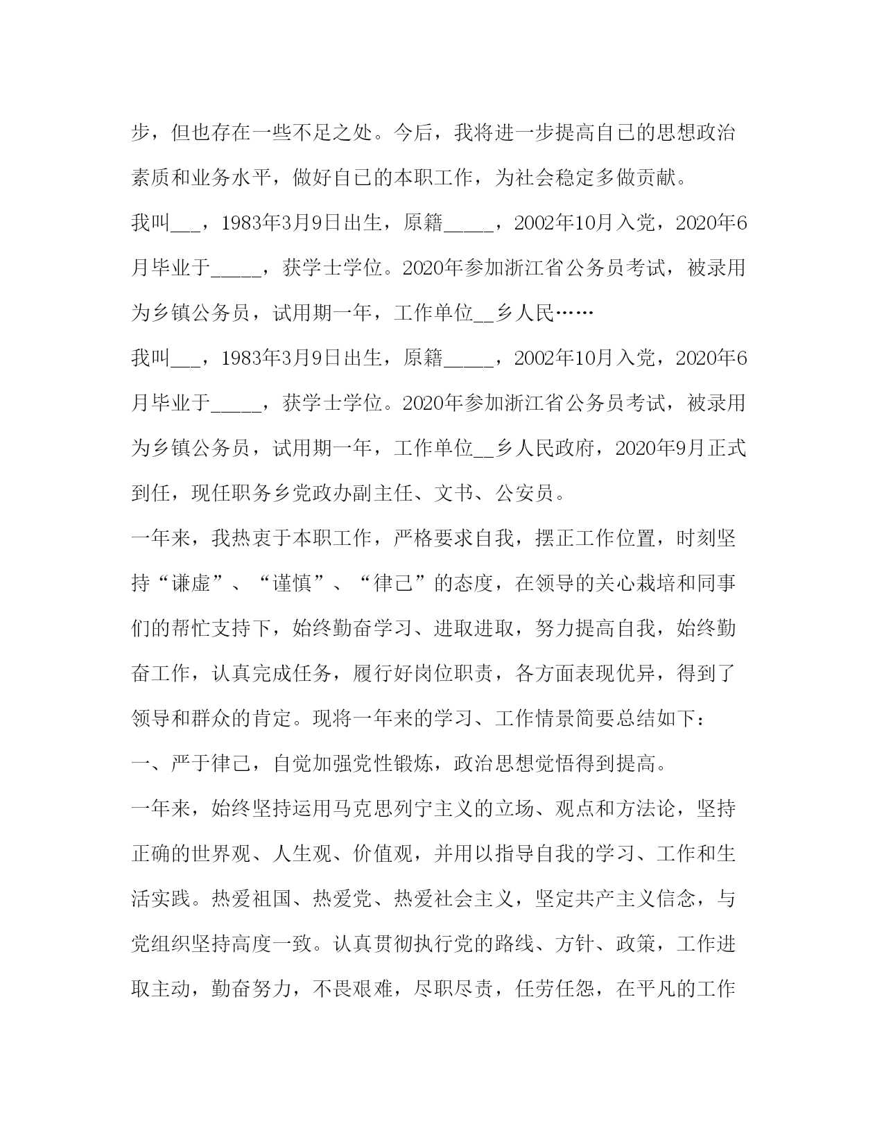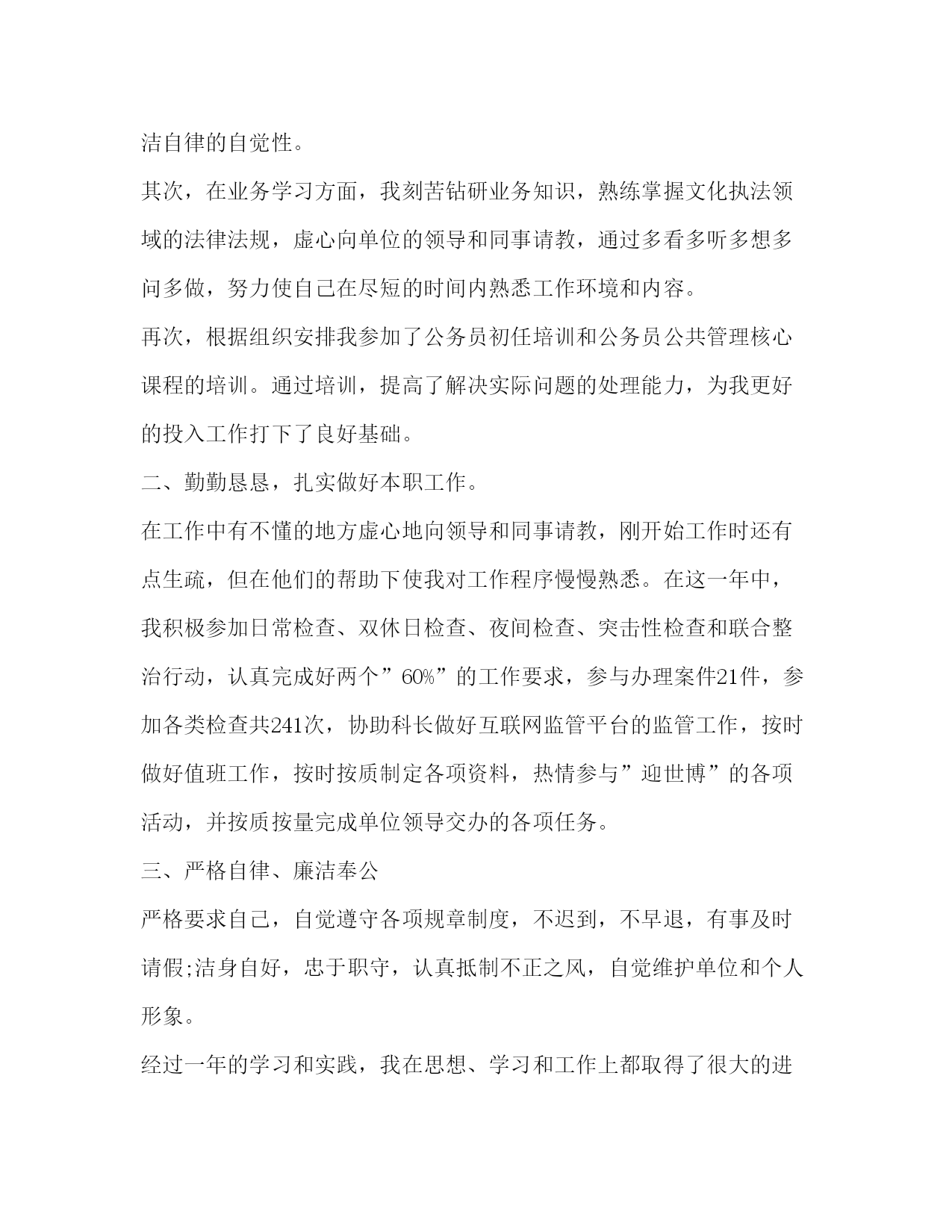 PAGE此资料由网络收集而来,如有侵权请告知上传者立即删除。资料共分享,我们负责传递知识。公务员转正个人总结怎么写?每一个员工都要对自己的工作进行阶段性的总结,在总结中发现问题,吸收经验教训。下面是小编给大家精心挑选的工作总结,希望能帮助到大家!被评为全省司法行政系统公务员基本素质教育考试考核组织工作先进个人,按照领导的安排撰写好各类文字材料,本人一直负责起草年度及各阶段培训计划。近某年来,本人在局党组的正确领导下,政治立场坚定,工作兢兢业业,生活作风严谨。出色完成了领导交办的各项工作任务。已连续两年在公务员年度测评中被确定为优秀等次,__年还被市委、市政府授予“政法系统先进工作者”称号,现将近年来工作情况总结如下:一、加强学习,不断提高自身素质首先,加强理论学习,认真学习“三个代表”的重要思想,并积极参加局里组织的各种政治学习,不断提高自己的理论水平,从政治思想上同局党组保持高度一致。同时,加强了业务知识及文化知识的学习,为了适应工作需要,我报考了省委党校举办的法律本科班,利用业余时间自修了全部课程,现已毕业。同时,按照上级要求,结合自身工作实际,认真学习了司法行政系统公务员基本素质教育考试的全部内容。并在全国司法行政系统公务员考试中取得了十分优异的成绩,并被评为全省司法行政系统公务员基本素质教育考试考核组织工作先进个人。另外,结合自己的工作实际,认真学习了“四五”普法相关的法律知识,为更好的开展工作打下了基础。二、勤勤恳恳,扎实做好本职工作1、全面掌握全区法制宣传教育工作情况,做好各阶段工作总结,并撰写有关材料。宣教科是普法和依法治区的办事机构,上接区委、人大、政府和上级业务部门,下连各个基层单位,作为宣教科副科长,我充当了全区普法工作第一联络员的角色。几年来,我在自己的岗位上,充分发挥自己的主观能动性和创造性,按照领导的安排撰写好各类文字材料,做好上传下达及各类典型经验的推广。每年撰写的各种材料都在40篇以上,确保了普法工作的顺利开展。2、管理文件、资料,做好分类、登记和建档工作,并按上级要求,及时、准确填报各种报表。由于普法工作涉及的各种文件、资料不仅量大,而且比较繁杂,我除平时认真作好各种文件、资料的及时处理外,在“三五”普法验收准备期间在科里其他同志协助下,按照省、市验收小组的统一要求,对“三五”普法五年来的文件、资料进行了重新装订、整理,共装订档案60余卷。确保了验收工作的顺利进行,并受到市考核组领导的一致好评。3、按照局领导的安排,抓好全区普法培训工作。按照省市统一部署及局领导安排,自法培中心成立以来,本人一直负责起草年度及各阶段培训计划,并负责培训班大纲、资料、通知、试卷、课程设置等的准备及起草工作,确保了各类培训班的顺利进行。成功举办了各类培训班100多期,不仅赢得了社会效益,也创造了可观的经济效益,促进了普法工作的全面开展。近年来,本人虽然在工作中取得了一定成绩,但也存在许多不足,比较突出的是工作上不够主动、大胆。在今后的工作中,我将努力克服自身不足,发扬成绩,争取在工作中取得更加突出的成绩。我是20_年9月进入单位工作的,在这一年里,我严格要求自己,认真学习党的十八届三中六中精神,深入贯彻落实科学发展观,刻苦钻研业务知识,不断提高自己业务水平,一丝不苟地完成工作任务,在领导的培养帮助、同事们的关心支持下,我在思想、学习和工作能力等方面都有很大提高,现总结如下:一、加强学习,不断提高自身素质首先,自觉加强政治理论学习,积极参加单位的集体政治学习和观看廉政教育片等活动,进一步认识和了解党的十七大精神和科学发展观,不断提高自己的理论水平与政治素质。在工作中,我牢固树立马克思主义的世界观、人生观、价值观,抵制各种腐朽思想,在各种诱惑面前做到一身正气,保证了自己在思想上和党保持一致性,强化了廉洁自律的自觉性。其次,在业务学习方面,我刻苦钻研业务知识,熟练掌握文化执法领域的法律法规,虚心向单位的领导和同事请教,通过多看多听多想多问多做,努力使自己在尽短的时间内熟悉工作环境和内容。再次,根据组织安排我参加了公务员初任培训和公务员公共管理核心课程的培训。通过培训,提高了解决实际问题的处理能力,为我更好的投入工作打下了良好基础。二、勤勤恳恳,扎实做好本职工作。在工作中有不懂的地方虚心地向领导和同事请教,刚开始工作时还有点生疏,但在他们的帮助下使我对工作程序慢慢熟悉。在这一年中,我积极参加日常检查、双休日检查、夜间检查、突击性检查和联合整治行动,认真完成好两个”60%”的工作要求,参与办理案件21件,参加各类检查共241次,协助科长做好互联网监管平台的监管工作,按时做好值班工作,按时按质制定各项资料,热情参与”迎世博”的各项活动,并按质按量完成单位领导交办的各项任务。三、严