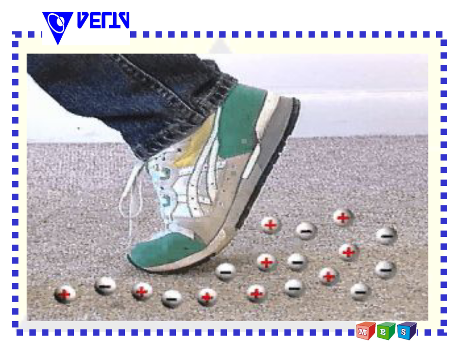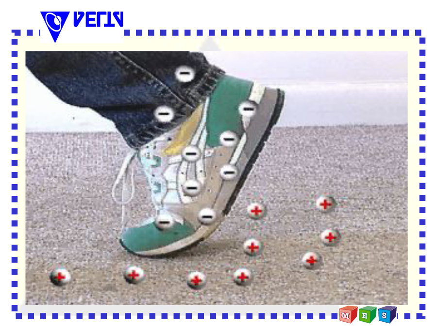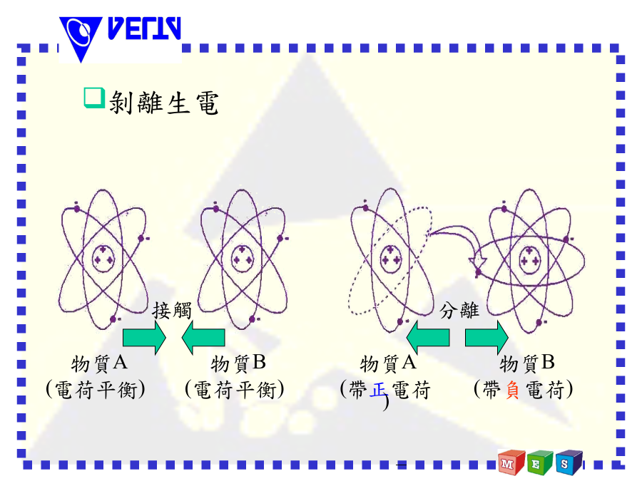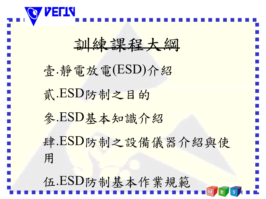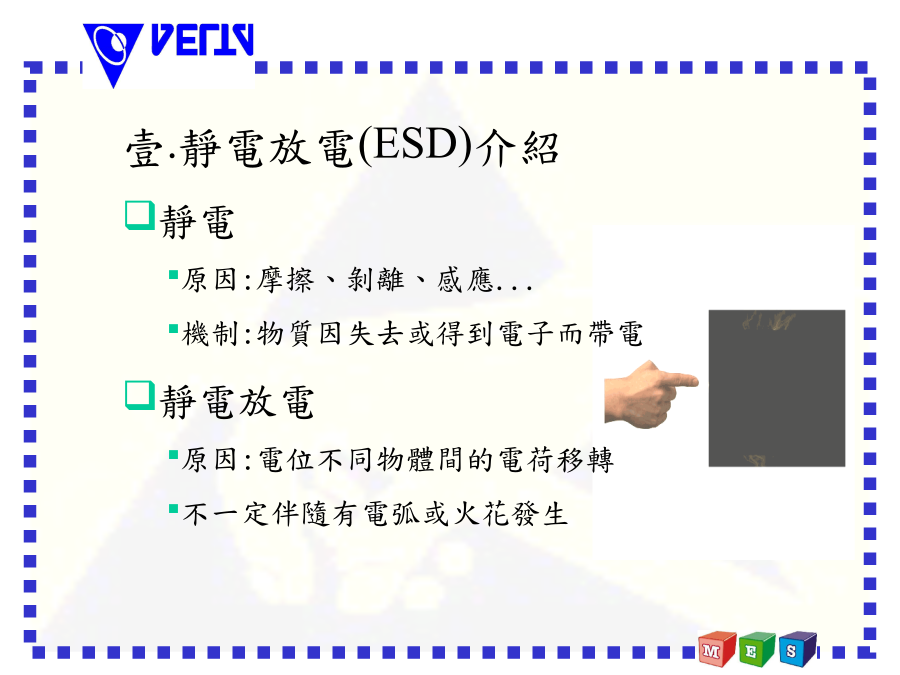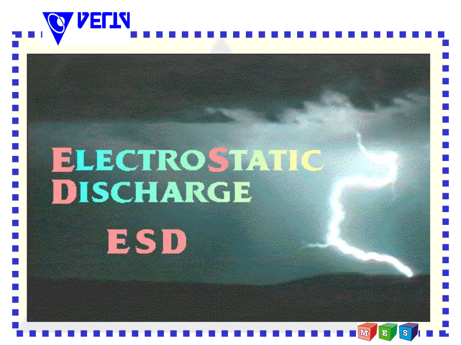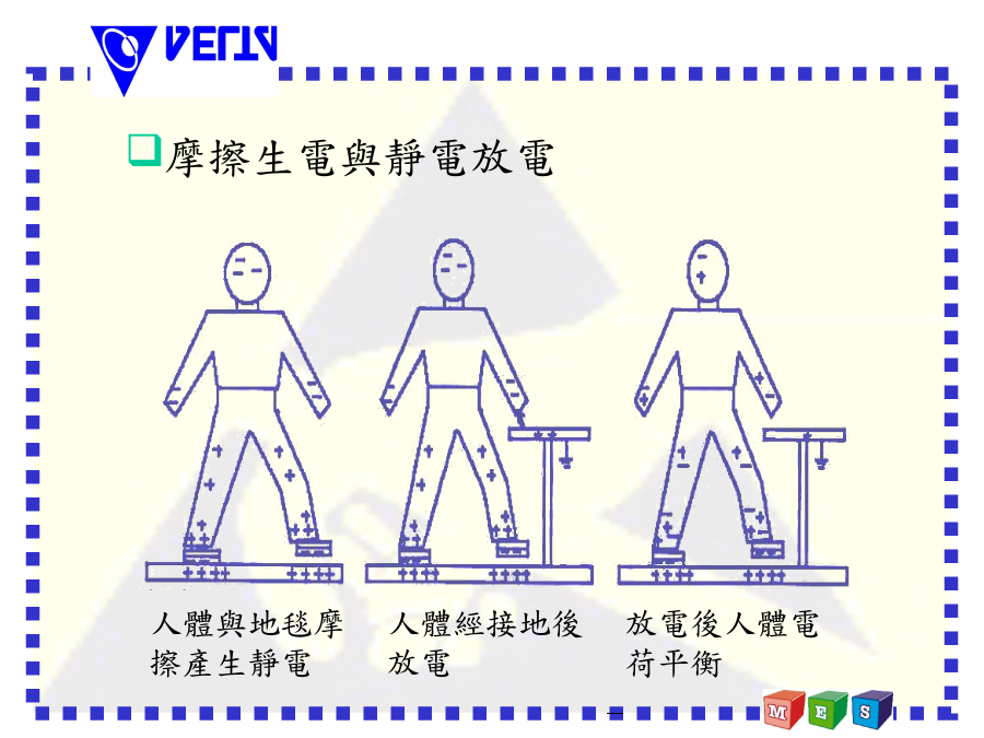 ESD教育訓練教材訓練課程大綱壹.靜電放電(ESD)介紹貳.ESD防制之目的參.ESD基本知識介紹肆.ESD防制之設備儀器介紹與使用伍.ESD防制基本作業規範壹.靜電放電(ESD)介紹靜電原因:摩擦、剝離、感應...機制:物質因失去或得到電子而帶電靜電放電原因:電位不同物體間的電荷移轉不一定伴隨有電弧或火花發生摩擦生電與靜電放電剝離生電感應生電--金屬葉片驗電器Metal-leafElectroscope靜電放電模式人體放電模式(HBM)的ESD是指因人體在地上走動磨擦或其他因素在人體上已累積了靜電,當此人去碰觸到IC時,人體上的靜電便經由IC的腳(pin)而進入IC內,再經由IC放電到地上去。此放電的過程會在短到幾百毫微秒(ns,nanosecond,10-9sec)的時間內產生數安培的瞬間放電電流,電流會把IC內的元件給燒毀。機器放電模式(MM)的ESD是指機器(例如機器手臂)本身累積了靜電,當此機器去碰觸到IC時,該靜電便經由IC的pin放電。因為大多數機器都是用金屬製造的,其機器放電的等效電阻為0;由於機器放電模式的等效電阻為零,故其放電的過程更短,在幾毫微秒到幾十毫微秒之內會有數安培的瞬間放電電流產生,因此對元件的破壞力更大。此放電模式(CDM)是指IC先因磨擦或其他因素而在IC內部累積了靜電,但在靜電累積的過程中IC並未受傷。此帶有靜電的IC在處理過程中,當其pin去碰觸到接地面時,IC內部的靜電便會經由pin自IC內部流出來,而造成了放電的現象。此種模式的放電時間更短,僅約幾毫微秒之內,而且此放電現象更難以真實的被模擬。ESD三種模式比較貳.ESD防制之目的參.ESD基本知識介紹影響靜電荷產生量的因素相對溼度物質材料(摩擦電序列)接觸的面積摩擦頻率摩擦電序列靜電防治材料特性接地系統ESDGround(SoftGround)靜電放電接地能夠使靜電產生源(人或物)藉由此路徑到接地的端點、排線、金屬線或其他接地系統。(EIA-625)Ground(HardGround)實接地藉由電子線路或特殊設備和大地(Earth)連接的導電接點,和大地間具零電位差。接地線用導體接地用導體需要有足夠的機械強度、耐腐蝕且不會發生斷線之電線或金屬導體。固定設備的接地用導體須用1.25mm2以上的600V級PVC絕緣電線,絕緣被覆採用綠色。(經濟部工業局)移動設備的接地用導體須用1.25mm2以上的橡膠、人造橡膠或塑膠絕緣柔性(可繞)電線。移動及震動頻繁設備的接地用導線須用1.25mm2以上絞線、網線。為容易發現斷線,最好是未加絕緣的電線。使用鏈子做接地導體(搬運車),應確定其不因腐蝕、生鏽影響導通情況,且不因其不連性而接觸不良。1.接地斷路警報器操作說明與校正、認證。2.接地線接地是否良好,以“接地斷路警報器”偵測結果為評斷標準。3.警報器之安裝位置必須在接地線末端。4.接地線必須以電木支撐固定,不可以其他導電物體固定或接觸。5.工作桌面之接地線架設連接方式,如下圖所示。接地斷路警報器正確方式:接地線必須以電木支撐固定,不可以其它導電物體固定或接觸。錯誤方式:接地線以鋁製導體支撐固定,易與其它導電物體接觸,造成斷路警報器誤判。接地線連接方式與CONNECTOR型式工作桌面接地線連接方式與CONNECTOR型式CD法則(CDRule)基本法則(BasicRule)基本法則的落實肆.ESD防制之設備儀器介紹與使用表面阻抗測試器靜電壓測試器接地斷路警報系統靜電環測試器靜電環表面阻抗測試器靜電壓測試器功能:自動偵測AC電源極性及接地系統有無異常確保作業人員及儀器安全接地斷路警報系統操作說明靜電環測試器靜電環測試器靜電環功能:主要為防止HBM對於ESDS元件的破壞型式:粘帶式、金屬、紡織品、鬆緊帶式安全性:必須要有限流電阻(通常為1M,1/4W)來保護人體安全,接地線與靜電環分離的拉力為1-5lb.伍.ESD防制基本作業規範ESD管制標誌及標籤所有放置ESD敏感元件之容器應於顯而易見的位置貼上ESD靜電防護標籤。靜電安全工作站之作業指導書應附有ESD靜電防護標籤。靜電安全工作區域中無法避免之絕緣材料(OI架、資料夾…)時,應使用靜電消散液覆蓋其表面,並定期檢測是否失效。電腦螢幕(陰極射線管)應予以接地屏蔽或使用離子風扇,平衡產生之電荷。於靜電安全工作區外一公尺範圍內,所有物體之靜電壓須小於100V。工作桌墊須確實接地並將每月之檢測結果記錄於桌墊後。導電地板區域內,台車須連結接地鏈(一般區域以接地線接地),且台車各層桌墊須予以連結導通;裝載未完成品之台車須予以適當之防靜電遮蔽。所有人員進入靜電安全