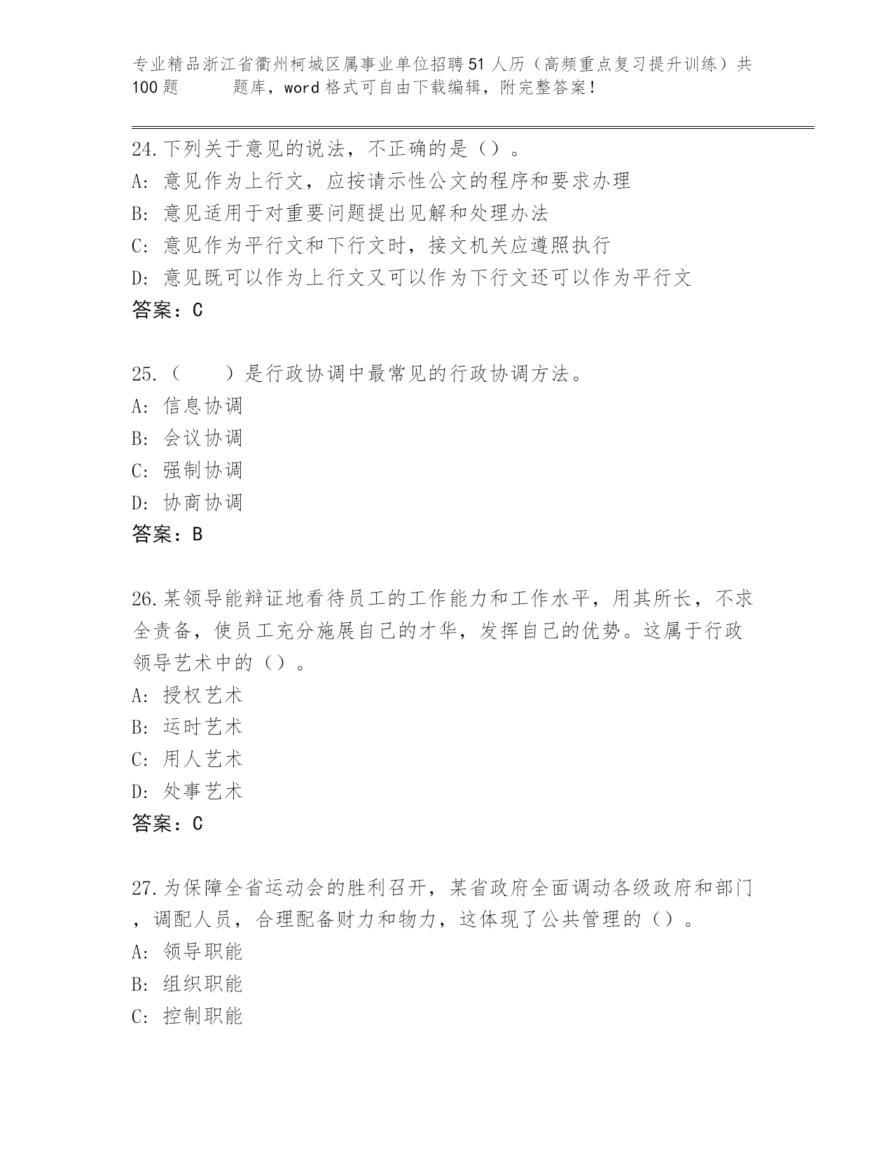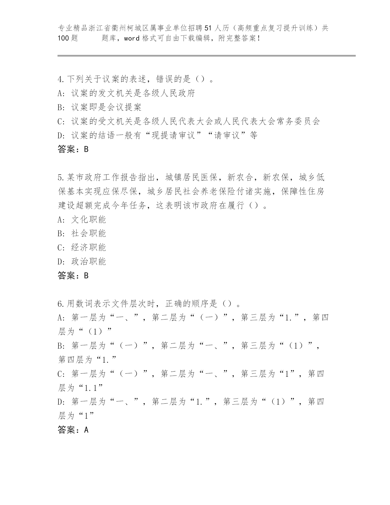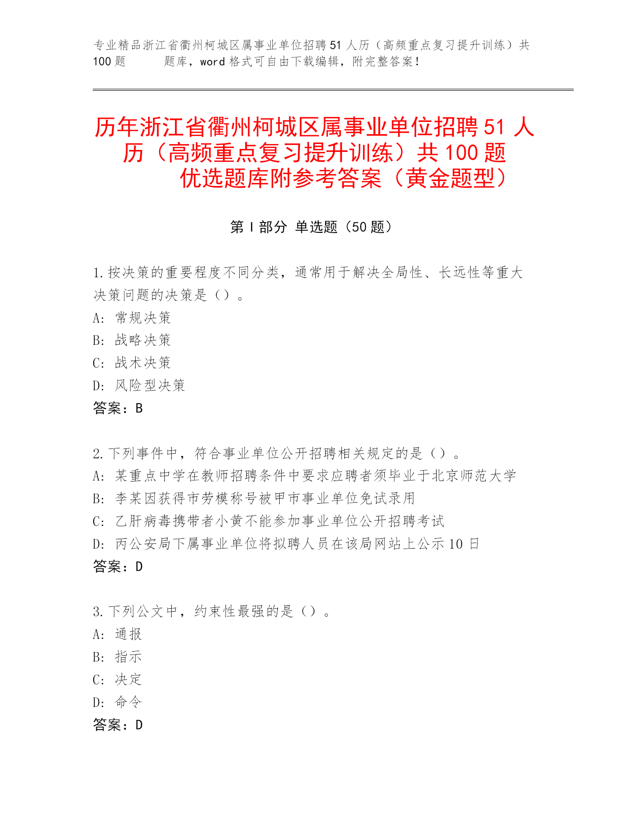 优选浙江省衢州柯城区属事业单位招聘51人历(高频重点复习提升训练)共100题 通用题库(名校卷)