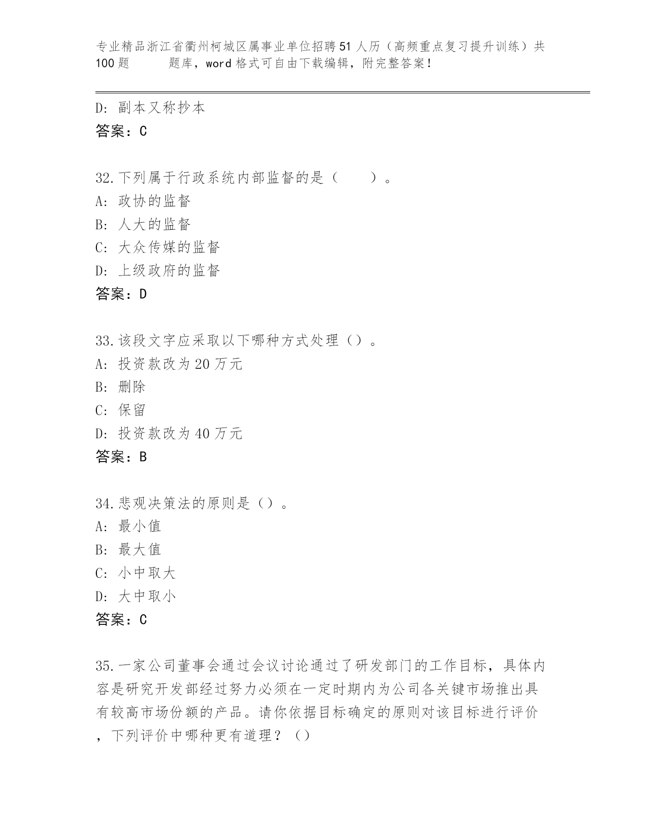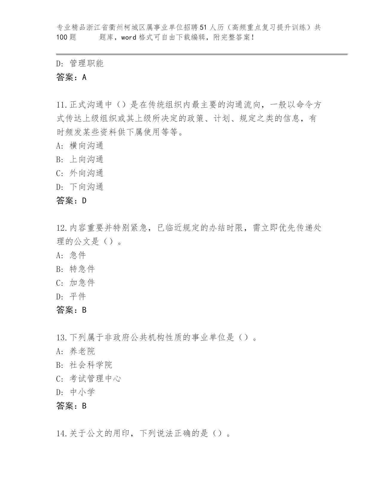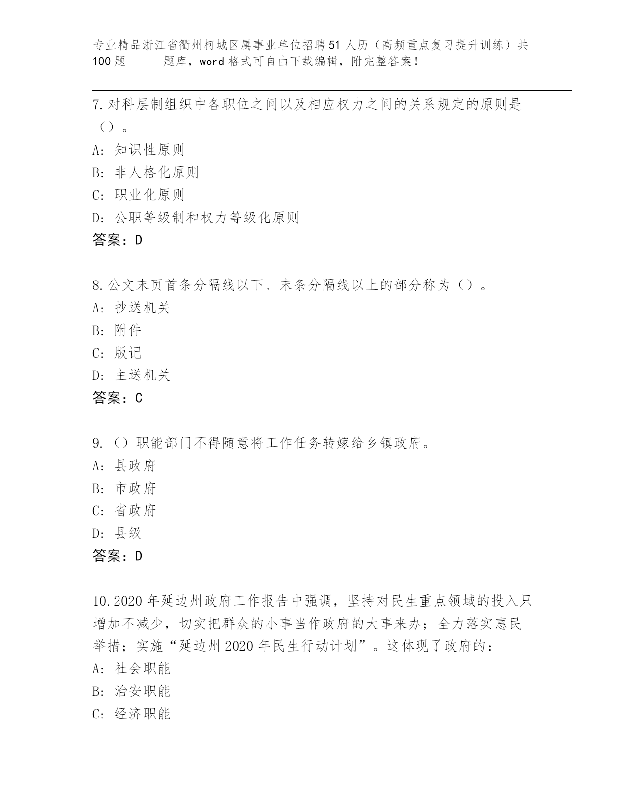 优选浙江省衢州柯城区属事业单位招聘51人历(高频重点复习提升训练)共100题 通用题库(名校卷)