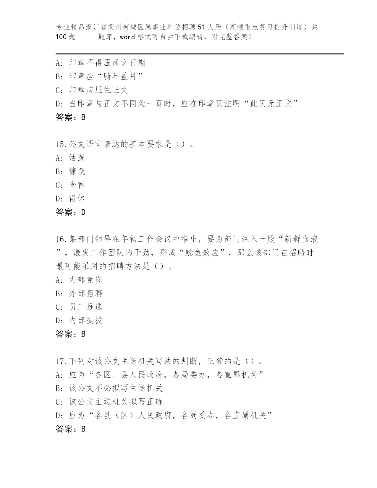 历年浙江省衢州柯城区属事业单位招聘51人历(高频重点复习提升训练)共100题 王牌题库【培优B卷】