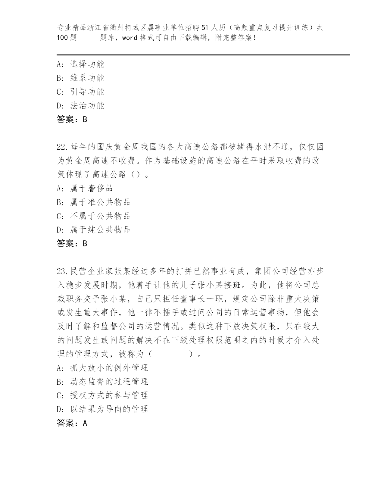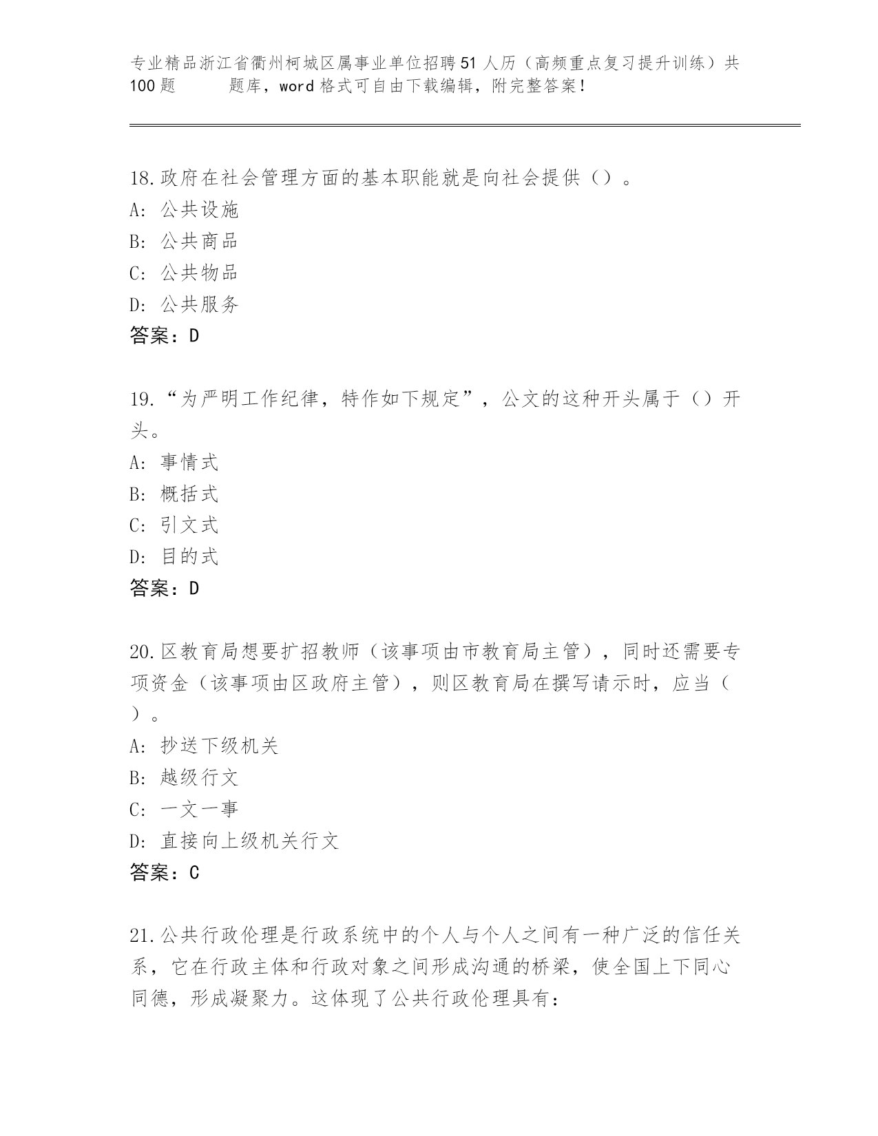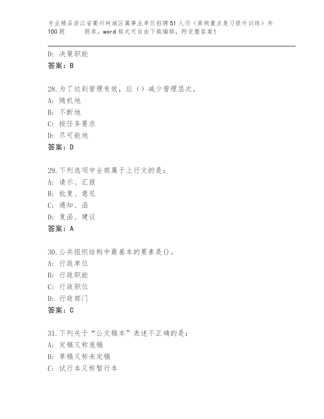 优选浙江省衢州柯城区属事业单位招聘51人历(高频重点复习提升训练)共100题 王牌题库带答案(基础题)