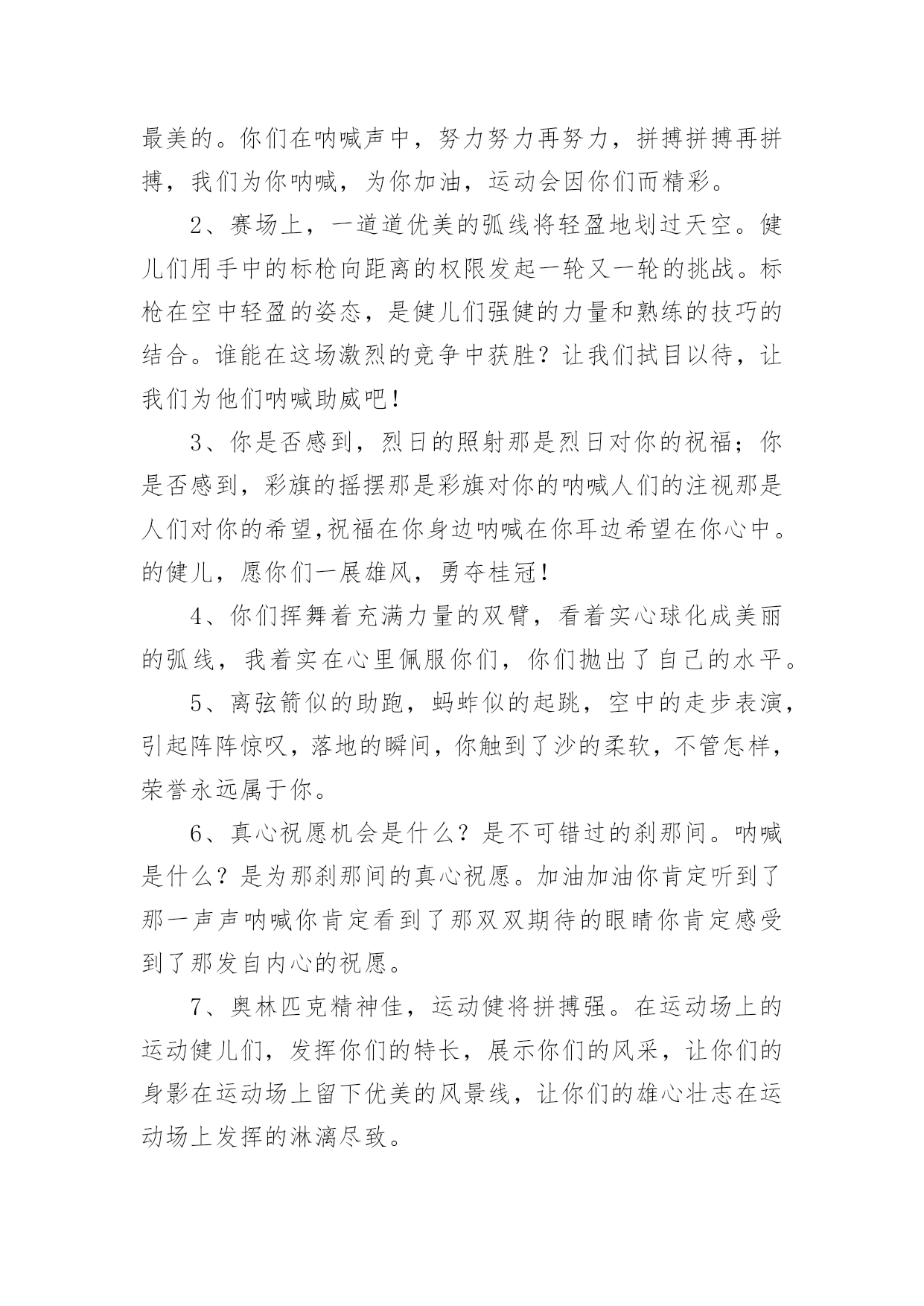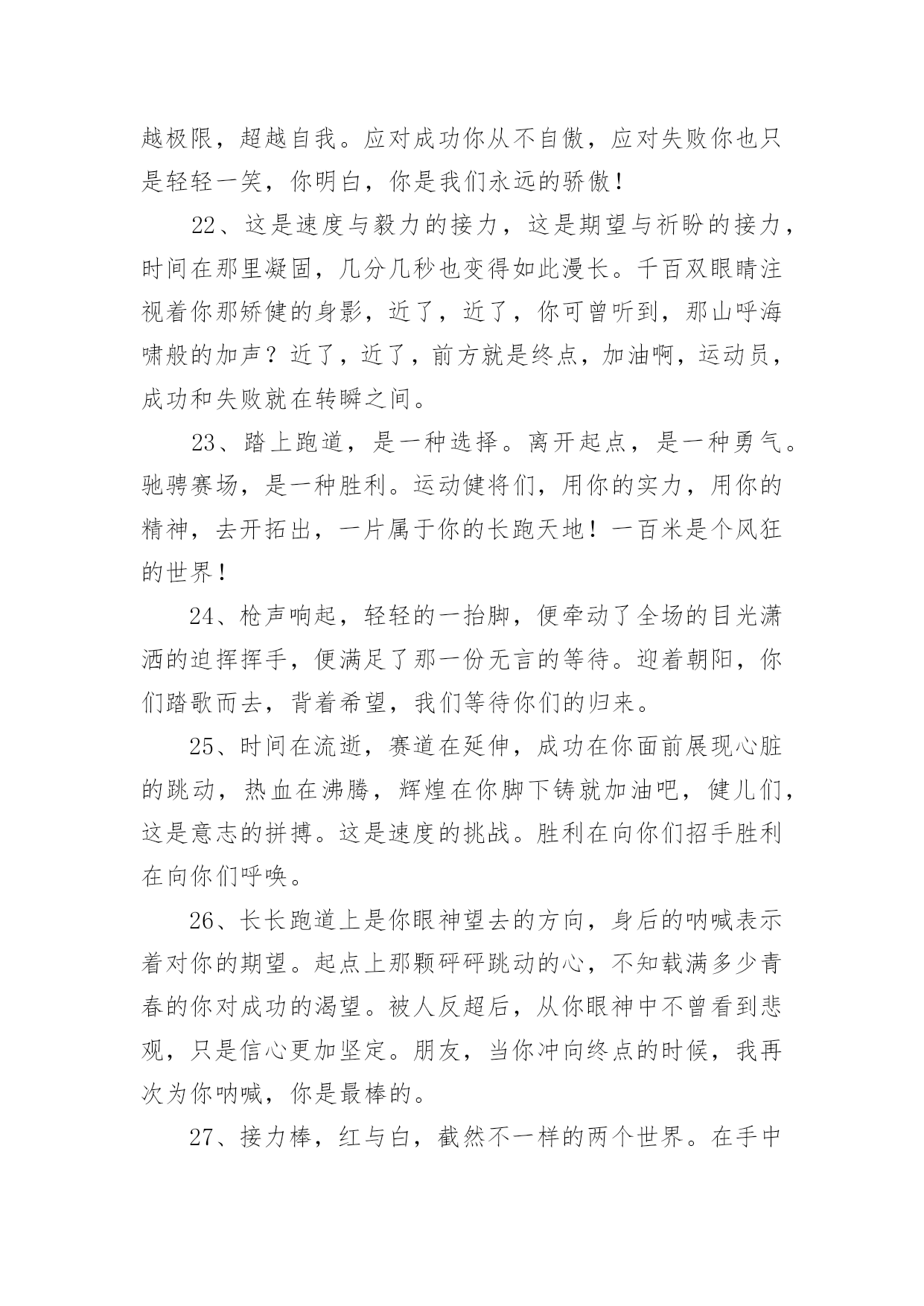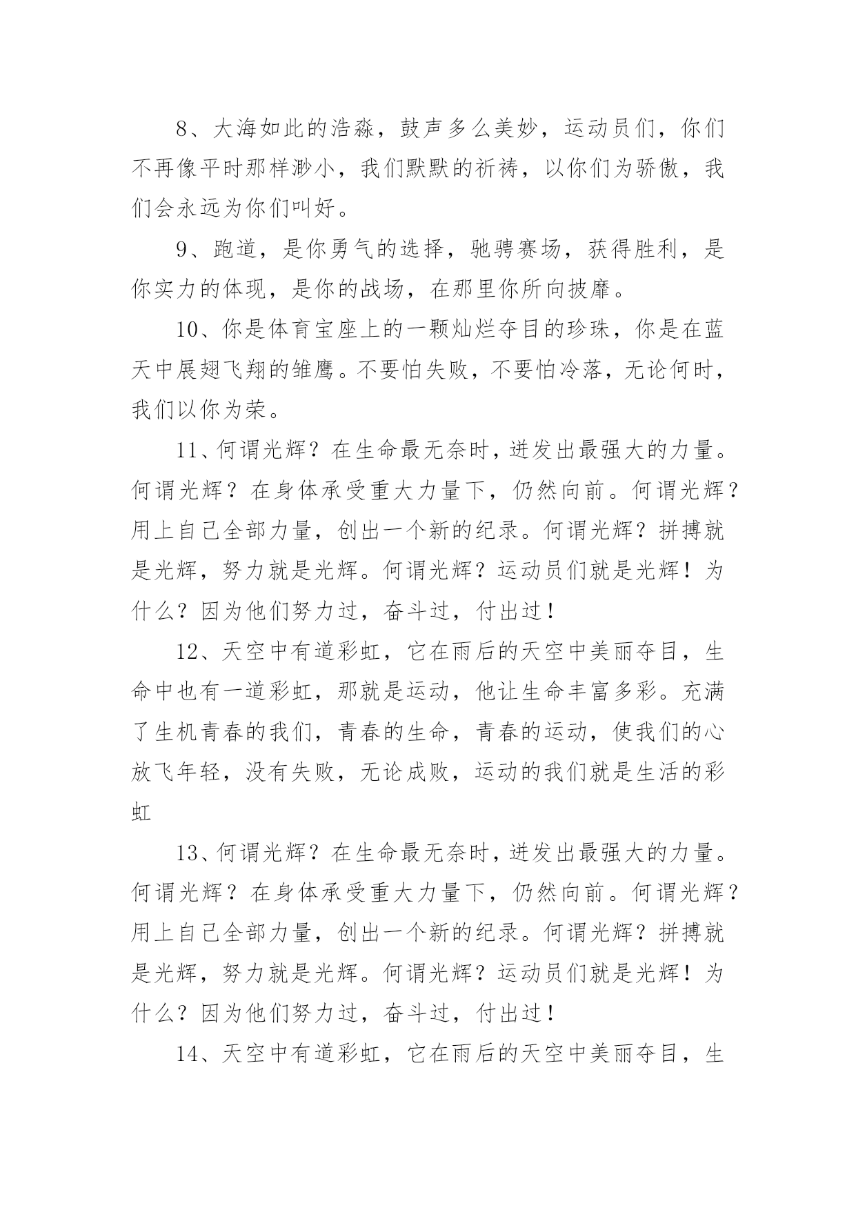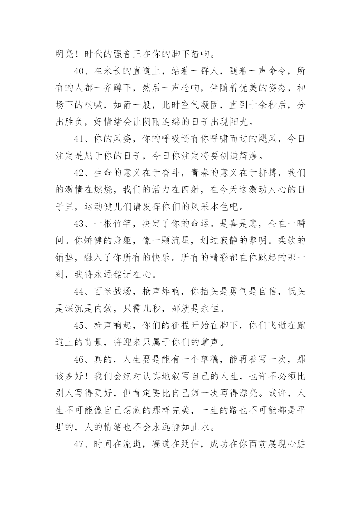 运动会加油稿运动会加油稿15篇(精)在发展不断提速的社会中,各种加油稿频频出现,借助加油稿可以给对方传达鼓励。那么你有了解过加油稿吗?以下是小编收集整理的运动会加油稿,仅供参考,希望能够帮助到大家。运动会加油稿11、在同一片晴空下,我们相聚一起,或欢乐或失落或兴奋或悲伤,尽数写在我们的脸旁。我们曾一起悲伤,在那个败北的沙坑上;我们也一起击掌,在这红色的跑道上。在同一片晴空下,我们拼搏,为美丽的目标;我们奋斗,为班级的辉煌。这就是团结奋进礼貌的企管班。2、青春是不老的誓言,飞扬是年轻的梦想,金色的十月,让我们在这长长的跑道上青春飞扬,现出飒爽的风姿,亮出真我的风采,带上同学们的热情,载着同伴们的希望,背负老师的嘱托,在这活力四射的校园里,放飞你的青春活力和运动激情。3、热情地释放光芒的红日,被阵阵此起彼伏的加油声震撼,慌张地投入到乌云的怀抱那群北飞的候鸟却因为热火朝天的场面而盘旋在运动场上,留恋着那里与寂静的天空截然不一样的热闹围绕在运动场边的.树木,在秋风的频繁光顾下奏鸣出悦耳的树叶的交响曲,仿佛是为了配合场上的拉拉队,为奋斗的运动员们加油鼓劲4、飞吧!胜利在向你微笑。青春的旋律永远回荡在耳畔虽然你我都已尽力最终事实却是残酷的毕竟冠军只有一个然而我们就这样心灰意冷了?不!决不!我们会再次扬起风帆向着终点冲刺我们坚信胜利会再次向我们招手的成功与失败就在一瞬间但不管成功或失败你们都冲过了心中的终点你们永远是好样的永远是我们心中最美的你们在呐喊声中努力努力再努力拼搏拼搏再拼搏我们为你呐喊为你加油运动会因你们而精彩运动之歌风对我耳语:5、加油吧!让这激动人心的时刻,一向回荡在我们心中!致M运动员无论结局是好是坏,无怨无悔是我们的选择,每当运动员奔驰在米跑道上时,我们为你祝福为你喝彩。运动会加油稿2成功了!终于成功了!我们为你喝彩,我们为你欢呼!。你是最棒的,因为你相信自己,你是最厉害的,因为你有实力。你也是最可爱的,因为你展现着自己的风采。你,梁青青,自动化的自豪,你为自动化拉开夺分的序幕,也为运动员们拉开了竞争的氛围。GO!向前冲!你站着是一座丰碑,向前跑起更是一面旗帜。向前冲!胜利属于你。Becausewebelieveyou!你象一只雄鹰,翱翔在晴空之中你象一颗金星,闪烁在宇宙之中你象一匹骏马,驰骋在战场之中。没象是头猎豹,疾驰在草原之中你象一艘快艇,飞奔在海洋之中胜利的果实等你摘取希望的高峰等待你去攀登百米跑道虽不长,运动健儿志高扬。摸拳擦掌跃欲试,分秒必争勇夺魁。高三七班有勇女,巾帼岂将须眉让。古有木兰冲杀场,今有郎萍跑百米。立志创新校记录,勇夺奥运第一枚勇敢的.冲吧!一年一度的运动会如期而至。“沙场秋点兵”的壮阔,想必给了我们难以言喻的激情。于是,我放下手中的笔,去感受脉搏与心跳的激烈。在期盼中,在意料中,是悲是喜,是欢是狂,都未可知,但可知的是我们拥有这样一场运动盛会。我们曾经不计成本地付出都将在这和梦碰撞的季节里得到肯定和兑现,结局并不重要,让我们的智力、体力得以平等竞争,在竞争中透出我们执着的精神、自信的精神。我们渴望,我们支持,我们为登上领奖台的英雄喝彩,我们也为失败者鼓掌。因为,短短的一瞬间可以凝固成永恒的画面,述说不老的追求,演绎勇敢的品质。柳树抽出新芽,怎能忘了春风的吹拂?小草钻出泥土,怎能忘了春雨的滋润?花儿绽开美丽笑脸,怎能忘了太阳爱抚?孩子们的成长更不能忘记老师的培养。今天,我们成绩的取得,怎能忘记您,公正成功属于奋斗者收获闪光的金牌,无私的裁判员老师。运动会加油稿31、成功与失败就在一瞬间,但不管成功或失败,你们都冲过了心中的终点,你们永远是好样的,永远是我们心中最美的。你们在呐喊声中,努力努力再努力,拼搏拼搏再拼搏,我们为你呐喊,为你加油,运动会因你们而精彩。2、赛场上,一道道优美的弧线将轻盈地划过天空。健儿们用手中的标枪向距离的权限发起一轮又一轮的挑战。标枪在空中轻盈的姿态,是健儿们强健的力量和熟练的技巧的结合。谁能在这场激烈的竞争中获胜?让我们拭目以待,让我们为他们呐喊助威吧!3、你是否感到,烈日的照射那是烈日对你的祝福;你是否感到,彩旗的摇摆那是彩旗对你的呐喊人们的注视那是人们对你的希望,祝福在你身边呐喊在你耳边希望在你心中。的健儿,愿你们一展雄风,勇夺桂冠!4、你们挥舞着充满力量的双臂,看着实心球化成美丽的弧线,我着实在心里佩服你们,你们抛出了自己的水平。5、离弦箭似的助跑,蚂蚱似的起跳,空中的走步表演,引起阵阵惊叹,落地的瞬间,你触到了沙的柔软,不管怎样,荣誉永远属于你。6、真心祝愿机会是什么?是不可错过的刹那间。呐喊是什么?是为那刹那间的真心祝愿。加油加油你肯定听到了那一声声呐喊你肯定看到了那双双期待的眼睛你肯定感受到了那发自内心的祝愿。7、奥林匹克精神佳,运动健将拼搏强。在运动场上