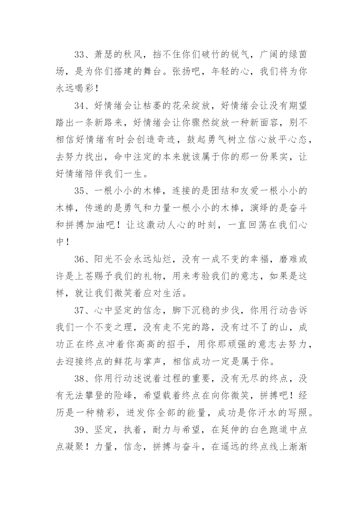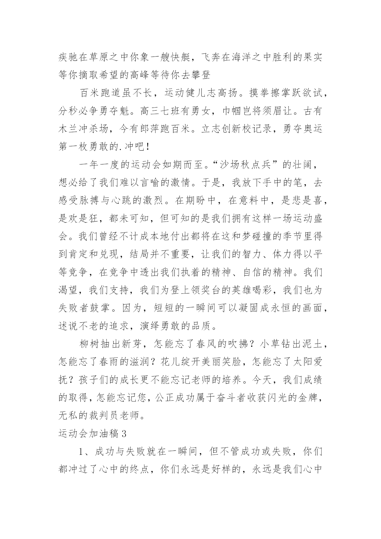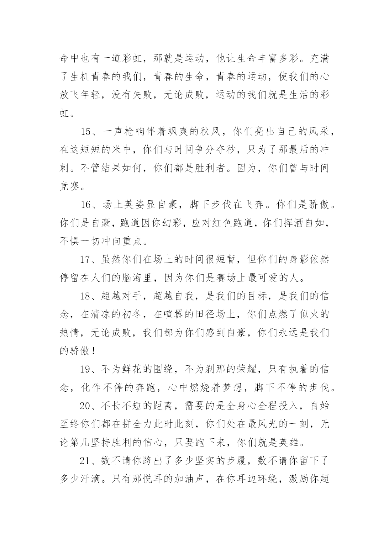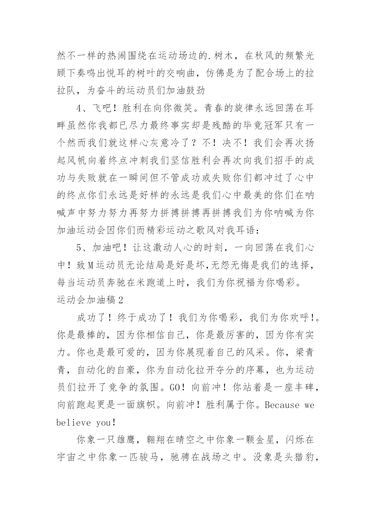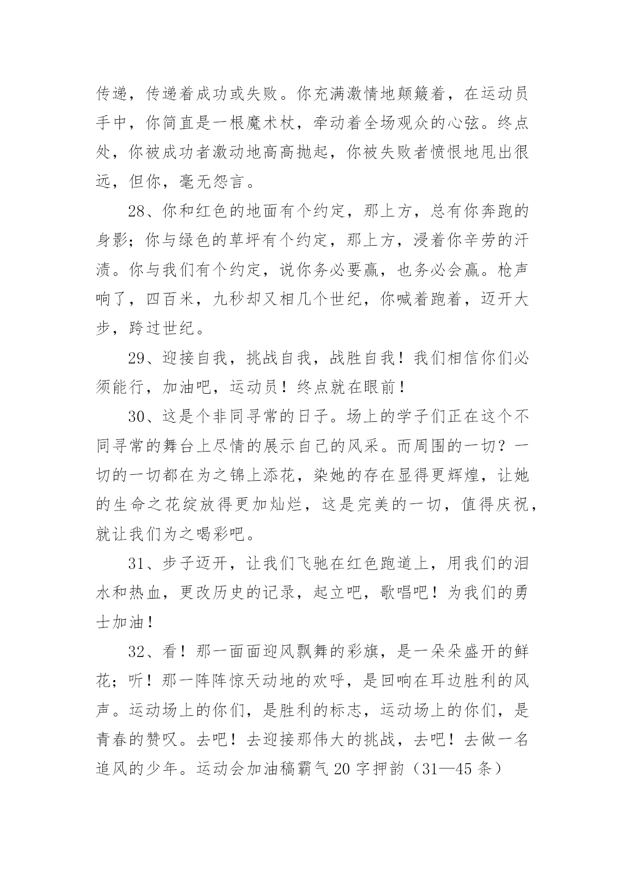 运动会加油稿运动会加油稿15篇(精)在发展不断提速的社会中,各种加油稿频频出现,借助加油稿可以给对方传达鼓励。那么你有了解过加油稿吗?以下是小编收集整理的运动会加油稿,仅供参考,希望能够帮助到大家。运动会加油稿11、在同一片晴空下,我们相聚一起,或欢乐或失落或兴奋或悲伤,尽数写在我们的脸旁。我们曾一起悲伤,在那个败北的沙坑上;我们也一起击掌,在这红色的跑道上。在同一片晴空下,我们拼搏,为美丽的目标;我们奋斗,为班级的辉煌。这就是团结奋进礼貌的企管班。2、青春是不老的誓言,飞扬是年轻的梦想,金色的十月,让我们在这长长的跑道上青春飞扬,现出飒爽的风姿,亮出真我的风采,带上同学们的热情,载着同伴们的希望,背负老师的嘱托,在这活力四射的校园里,放飞你的青春活力和运动激情。3、热情地释放光芒的红日,被阵阵此起彼伏的加油声震撼,慌张地投入到乌云的怀抱那群北飞的候鸟却因为热火朝天的场面而盘旋在运动场上,留恋着那里与寂静的天空截然不一样的热闹围绕在运动场边的.树木,在秋风的频繁光顾下奏鸣出悦耳的树叶的交响曲,仿佛是为了配合场上的拉拉队,为奋斗的运动员们加油鼓劲4、飞吧!胜利在向你微笑。青春的旋律永远回荡在耳畔虽然你我都已尽力最终事实却是残酷的毕竟冠军只有一个然而我们就这样心灰意冷了?不!决不!我们会再次扬起风帆向着终点冲刺我们坚信胜利会再次向我们招手的成功与失败就在一瞬间但不管成功或失败你们都冲过了心中的终点你们永远是好样的永远是我们心中最美的你们在呐喊声中努力努力再努力拼搏拼搏再拼搏我们为你呐喊为你加油运动会因你们而精彩运动之歌风对我耳语:5、加油吧!让这激动人心的时刻,一向回荡在我们心中!致M运动员无论结局是好是坏,无怨无悔是我们的选择,每当运动员奔驰在米跑道上时,我们为你祝福为你喝彩。运动会加油稿2成功了!终于成功了!我们为你喝彩,我们为你欢呼!。你是最棒的,因为你相信自己,你是最厉害的,因为你有实力。你也是最可爱的,因为你展现着自己的风采。你,梁青青,自动化的自豪,你为自动化拉开夺分的序幕,也为运动员们拉开了竞争的氛围。GO!向前冲!你站着是一座丰碑,向前跑起更是一面旗帜。向前冲!胜利属于你。Becausewebelieveyou!你象一只雄鹰,翱翔在晴空之中你象一颗金星,闪烁在宇宙之中你象一匹骏马,驰骋在战场之中。没象是头猎豹,疾驰在草原之中你象一艘快艇,飞奔在海洋之中胜利的果实等你摘取希望的高峰等待你去攀登百米跑道虽不长,运动健儿志高扬。摸拳擦掌跃欲试,分秒必争勇夺魁。高三七班有勇女,巾帼岂将须眉让。古有木兰冲杀场,今有郎萍跑百米。立志创新校记录,勇夺奥运第一枚勇敢的.冲吧!一年一度的运动会如期而至。“沙场秋点兵”的壮阔,想必给了我们难以言喻的激情。于是,我放下手中的笔,去感受脉搏与心跳的激烈。在期盼中,在意料中,是悲是喜,是欢是狂,都未可知,但可知的是我们拥有这样一场运动盛会。我们曾经不计成本地付出都将在这和梦碰撞的季节里得到肯定和兑现,结局并不重要,让我们的智力、体力得以平等竞争,在竞争中透出我们执着的精神、自信的精神。我们渴望,我们支持,我们为登上领奖台的英雄喝彩,我们也为失败者鼓掌。因为,短短的一瞬间可以凝固成永恒的画面,述说不老的追求,演绎勇敢的品质。柳树抽出新芽,怎能忘了春风的吹拂?小草钻出泥土,怎能忘了春雨的滋润?花儿绽开美丽笑脸,怎能忘了太阳爱抚?孩子们的成长更不能忘记老师的培养。今天,我们成绩的取得,怎能忘记您,公正成功属于奋斗者收获闪光的金牌,无私的裁判员老师。运动会加油稿31、成功与失败就在一瞬间,但不管成功或失败,你们都冲过了心中的终点,你们永远是好样的,永远是我们心中最美的。你们在呐喊声中,努力努力再努力,拼搏拼搏再拼搏,我们为你呐喊,为你加油,运动会因你们而精彩。2、赛场上,一道道优美的弧线将轻盈地划过天空。健儿们用手中的标枪向距离的权限发起一轮又一轮的挑战。标枪在空中轻盈的姿态,是健儿们强健的力量和熟练的技巧的结合。谁能在这场激烈的竞争中获胜?让我们拭目以待,让我们为他们呐喊助威吧!3、你是否感到,烈日的照射那是烈日对你的祝福;你是否感到,彩旗的摇摆那是彩旗对你的呐喊人们的注视那是人们对你的希望,祝福在你身边呐喊在你耳边希望在你心中。的健儿,愿你们一展雄风,勇夺桂冠!4、你们挥舞着充满力量的双臂,看着实心球化成美丽的弧线,我着实在心里佩服你们,你们抛出了自己的水平。5、离弦箭似的助跑,蚂蚱似的起跳,空中的走步表演,引起阵阵惊叹,落地的瞬间,你触到了沙的柔软,不管怎样,荣誉永远属于你。6、真心祝愿机会是什么?是不可错过的刹那间。呐喊是什么?是为那刹那间的真心祝愿。加油加油你肯定听到了那一声声呐喊你肯定看到了那双双期待的眼睛你肯定感受到了那发自内心的祝愿。7、奥林匹克精神佳,运动健将拼搏强。在运动场上