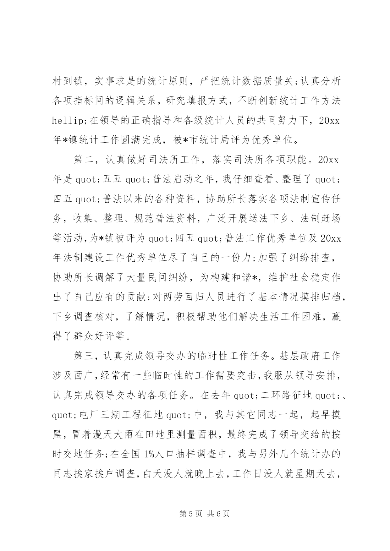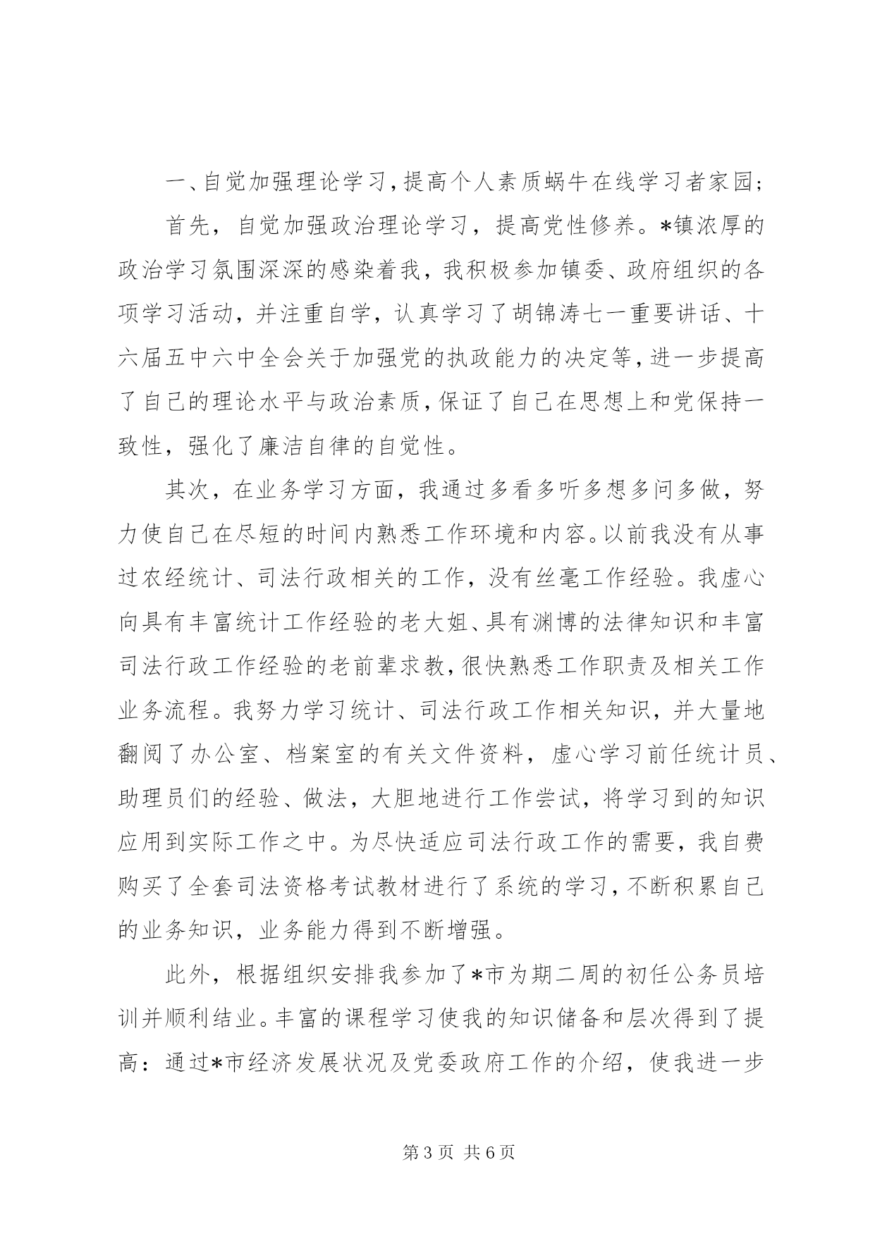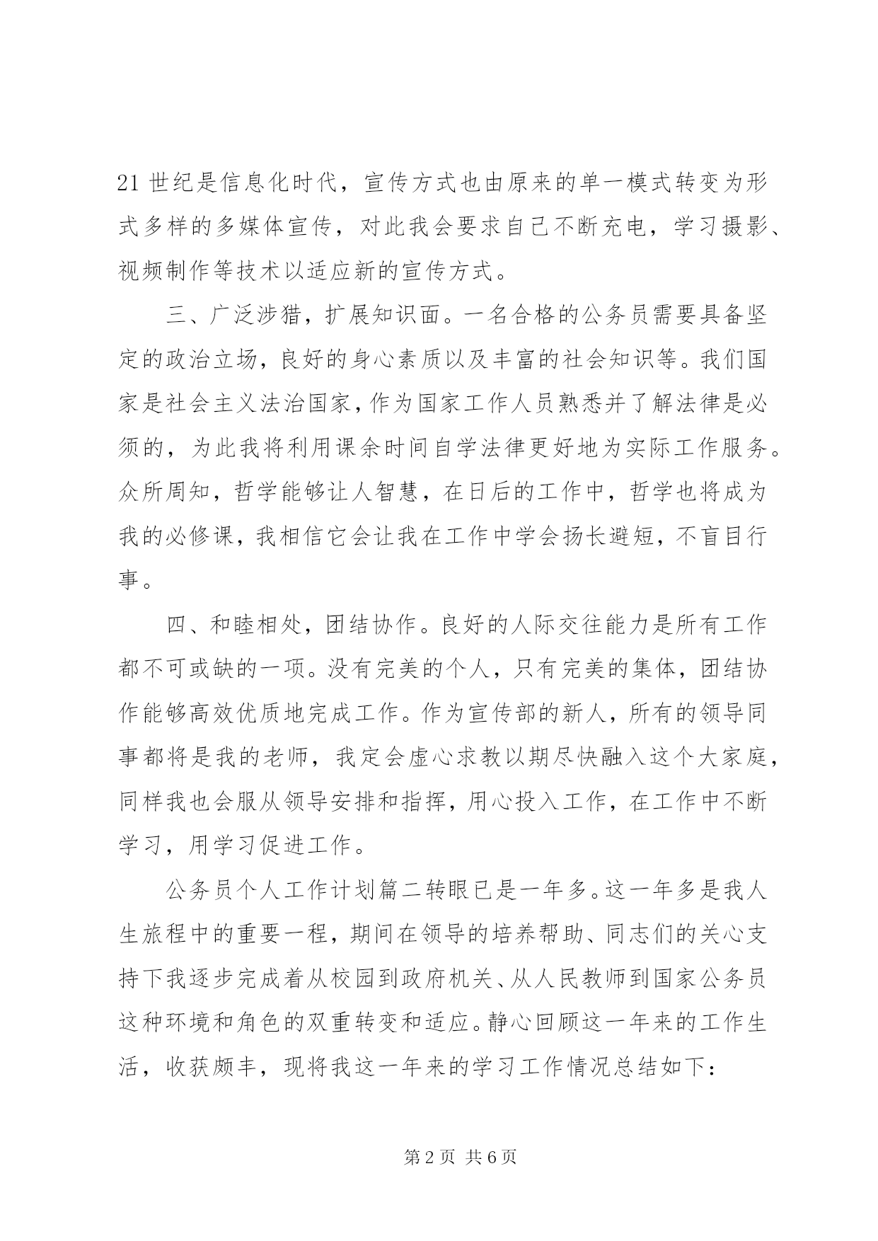 第PAGE\*Arabic\*MERGEFORMAT6页共NUMPAGES\*MERGEFORMAT6页公务员个人工作计划公务员个人工作计划篇一人非生而知之,学而知之也,我现在所掌握的知识都来自于学习,也只有不断的学习,人才能进步。我热爱学习,学习之于我就像是阳光之于植物一般不可缺少,回顾过往的学习,我心存感激,它使我更加了解这个世界。然而,对于一个公务员来说,我深知自己所掌握的知识还远远不够,为了能够尽快地融入宣传部这个大家庭,更好地完成领导和同事交付的事情,我为自己制定了以下学习计划:首先、理论知识的学习对我来说至关重要。从普通人到公务员身份的转变要求我必须掌握足够多的理论知识,为了弥补这一薄弱环节,我准备从以下着手,用心研读十七大报告中关于科学发展观的论述,尽最大努力领悟其内涵,并运用于实际工作中;通过每天观看《新闻联播》,《长安新闻》,阅读人民日报、西安日报、长安开发等报刊杂志以及浏览人民网、长安新闻网最新资讯等方式及时了解国家大政方针,时刻关注时政要闻,以达到提高政治素养和理论水平的目的。二、巩固专业知识,提升工作技能。为了日后工作的顺利开展,夯实并进一步地提高写作功底是当务之急。因此我决定,每周背诵一首唐诗或宋词,提升文学素养;每月至少消化一本理论书籍,并写出学习心得;每年阅读不少于五本名著。我坚信勤能补拙,只要坚持不懈地努力,我的写作水准会一步一步得到提高。21世纪是信息化时代,宣传方式也由原来的单一模式转变为形式多样的多媒体宣传,对此我会要求自己不断充电,学习摄影、视频制作等技术以适应新的宣传方式。三、广泛涉猎,扩展知识面。一名合格的公务员需要具备坚定的政治立场,良好的身心素质以及丰富的社会知识等。我们国家是社会主义法治国家,作为国家工作人员熟悉并了解法律是必须的,为此我将利用课余时间自学法律更好地为实际工作服务。众所周知,哲学能够让人智慧,在日后的工作中,哲学也将成为我的必修课,我相信它会让我在工作中学会扬长避短,不盲目行事。四、和睦相处,团结协作。良好的人际交往能力是所有工作都不可或缺的一项。没有完美的个人,只有完美的集体,团结协作能够高效优质地完成工作。作为宣传部的新人,所有的领导同事都将是我的老师,我定会虚心求教以期尽快融入这个大家庭,同样我也会服从领导安排和指挥,用心投入工作,在工作中不断学习,用学习促进工作。公务员个人工作计划篇二转眼已是一年多。这一年多是我人生旅程中的重要一程,期间在领导的培养帮助、同志们的关心支持下我逐步完成着从校园到政府机关、从人民教师到国家公务员这种环境和角色的双重转变和适应。静心回顾这一年来的工作生活,收获颇丰,现将我这一年来的学习工作情况总结如下:一、自觉加强理论学习,提高个人素质蜗牛在线学习者家园;首先,自觉加强政治理论学习,提高党性修养。*镇浓厚的政治学习氛围深深的感染着我,我积极参加镇委、政府组织的各项学习活动,并注重自学,认真学习了胡锦涛七一重要讲话、十六届五中六中全会关于加强党的执政能力的决定等,进一步提高了自己的理论水平与政治素质,保证了自己在思想上和党保持一致性,强化了廉洁自律的自觉性。其次,在业务学习方面,我通过多看多听多想多问多做,努力使自己在尽短的时间内熟悉工作环境和内容。以前我没有从事过农经统计、司法行政相关的工作,没有丝毫工作经验。我虚心向具有丰富统计工作经验的老大姐、具有渊博的法律知识和丰富司法行政工作经验的老前辈求教,很快熟悉工作职责及相关工作业务流程。我努力学习统计、司法行政工作相关知识,并大量地翻阅了办公室、档案室的有关文件资料,虚心学习前任统计员、助理员们的经验、做法,大胆地进行工作尝试,将学习到的知识应用到实际工作之中。为尽快适应司法行政工作的需要,我自费购买了全套司法资格考试教材进行了系统的学习,不断积累自己的业务知识,业务能力得到不断增强。此外,根据组织安排我参加了*市为期二周的初任公务员培训并顺利结业。丰富的课程学习使我的知识储备和层次得到了提高:通过*市经济发展状况及党委政府工作的介绍,使我进一步理解了我市quot;一路三化quot;战略、quot;两地一中心quot;奋斗目标,看到了我市经济腾飞的巨大潜力,增强了对我市的了解和热爱;通过公务员宗旨和行为规范的教育,使我树立了正确的权力观,增强了全心全意为人民服务的宗旨意识;通过公文写作课程的学习,使我了解了公文写作的内涵,提高了办公室日常事务、文件资料的处理能力,为我更好的投入工作打下了良好基础。我还参加了*市司法局组织的人民调解员培训,学习了有关人民调解的知识及技能技巧,并获得了XX市人民调解委员会颁发的人民调解员证从而成为了一名合格的人民调解员;我还参加了众多与业务工作相关的统计、法建工作培训,业务工作能力得到了很好的培养与提高。二、踏实肯干,努力