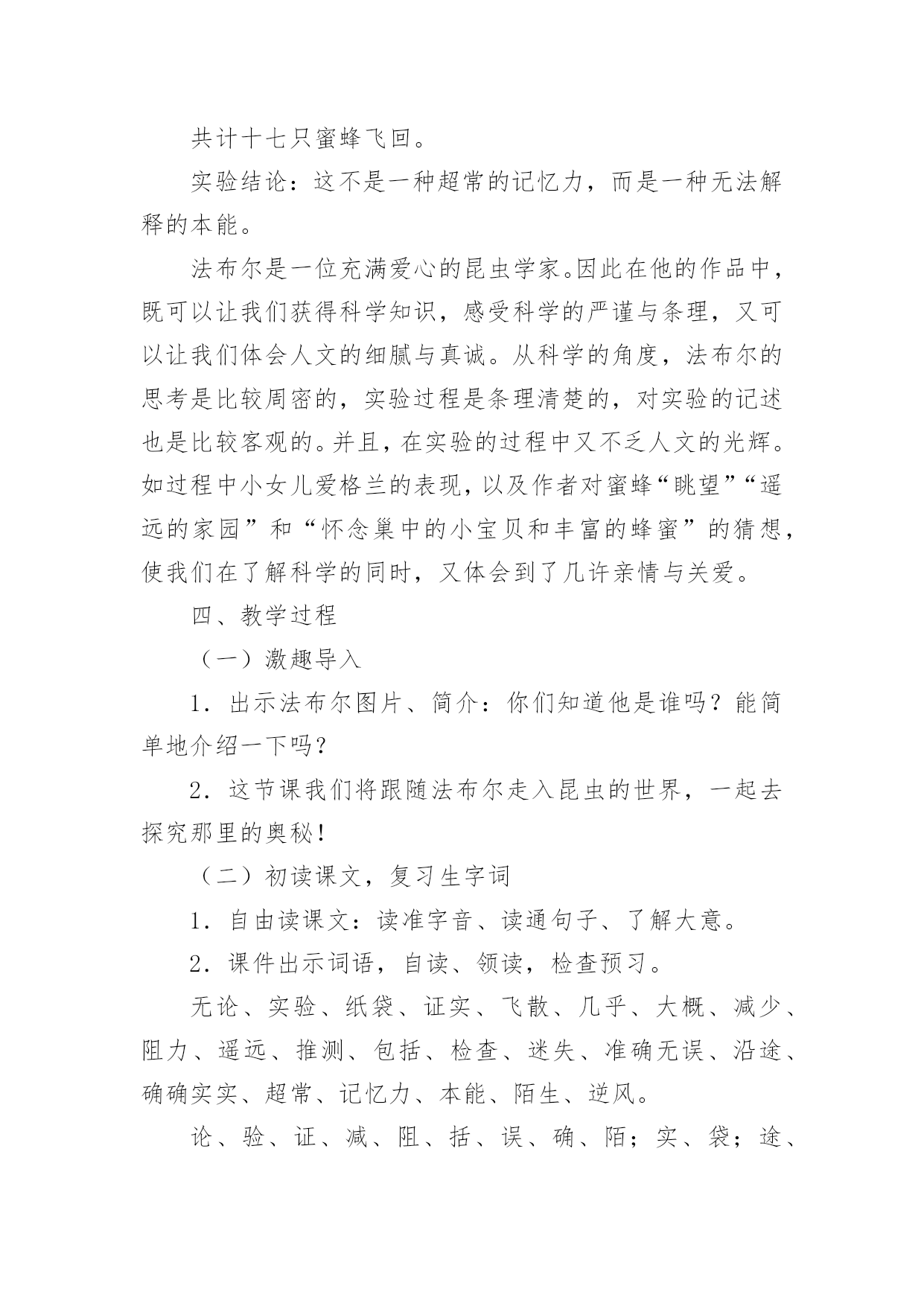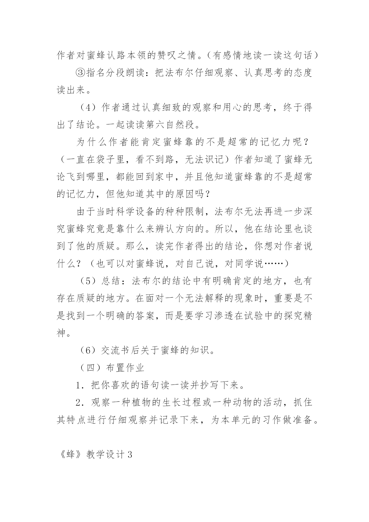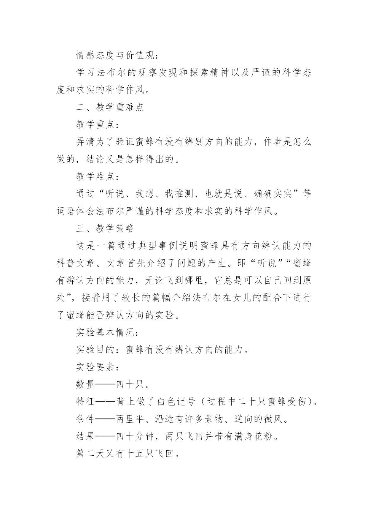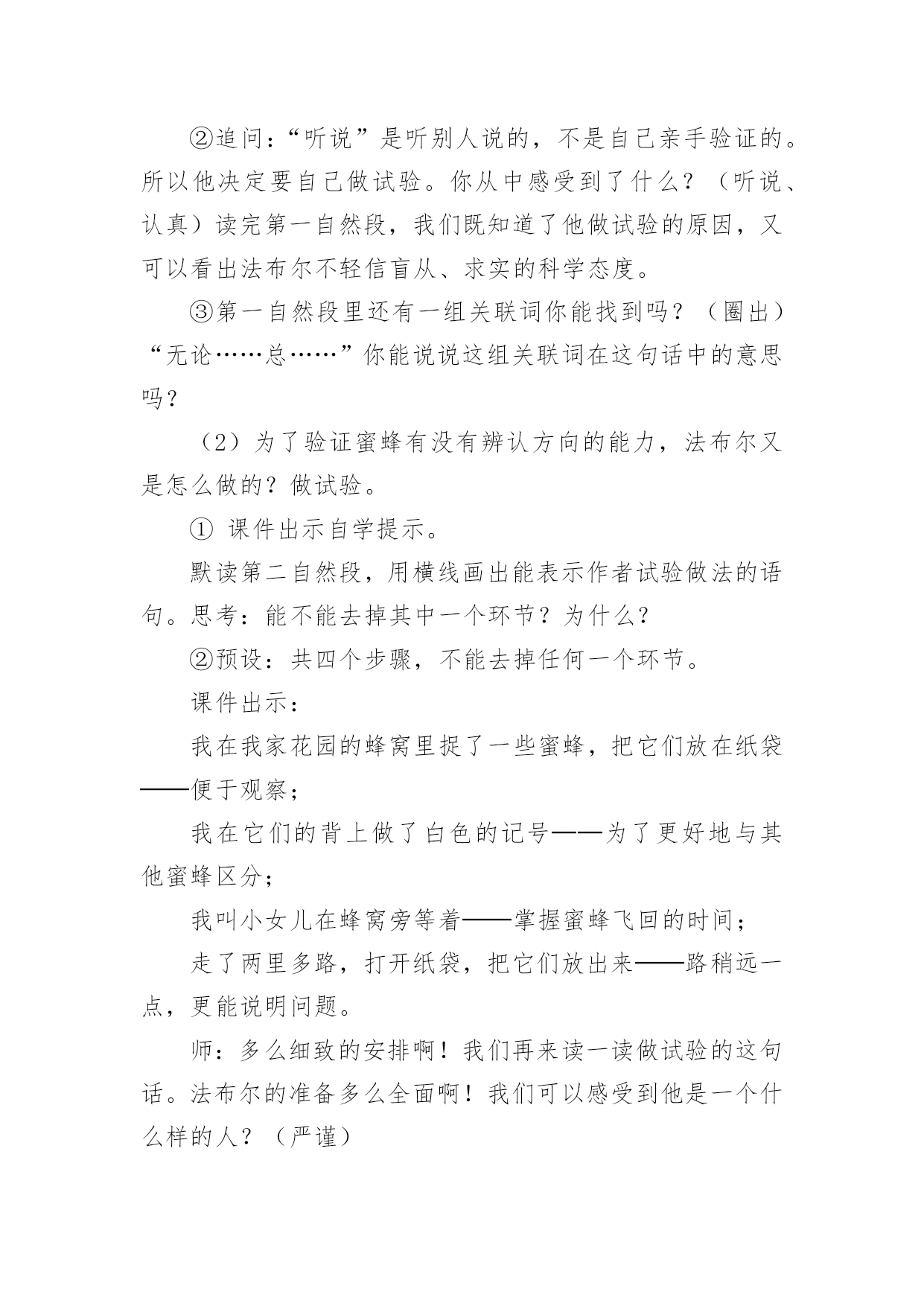 《蜂》教学设计作为一名为他人授业解惑的教育工作者,通常会被要求编写教学设计,教学设计是实现教学目标的计划性和决策性活动。我们该怎么去写教学设计呢?以下是小编收集整理的《蜂》教学设计,供大家参考借鉴,希望可以帮助到有需要的朋友。《蜂》教学设计1教学目标:1、通过了解课文内容,理解“我”思想感情的变化,让学生懂得做事不要冲动、要冷静,不要逞强好胜,要考虑到事情的危险性。2、学会在学习中发现问题、提出问题、并尝试着能自己解决问题,发展创造性思考。3、正确、流利、有感情地朗读课文。教学重点:1、通过了解课文内容,理解“我”思想感情的变化,让学生懂得做事不要冲动、要冷静,不要逞强好胜,要考虑到事情的危险性。2、有感情地朗读课文,尤其是文中的对话,要根据课文的内容读出不同的语气。教学难点:通过了解课文内容,理解“我”思想感情的变化,让学生懂得做事不要冲动、要冷静,不要逞强好胜,要考虑到事情的危险性。教学过程:1、导入由于我们的幼稚,这些小小的冒失给别人,也给自己带来一些小小的伤害,然而当我们回想往事,回想童年,我们心中充溢着的却是美好和甜蜜。A.谈话导入,揭示课题B.教师板书“马蜂”,谁来说说你所了解的“马蜂”,它有什么威力?C.教师接着板书“窝”,那“蜂窝”又是什么意思?D.教师继续板书“捅”,如果捅了马蜂窝会怎么样?E.教师完成板书“了”。今天我们就学习一篇课文,课文的主人公就捅了马蜂窝。请同学们齐读课题。F.读了课文,你有些什么想法?G.下面就让我们带着这些问题来研究课文。2、自主学文,整体感知,理清层次。A.自读课文:借助工具书,用自己喜欢的方式自由读课文。要求读准字音,读通课文。B.教师询问在自读过程中是否遇到什么困难,学生讨论解决。C.读后交流:课文写了一件什么事?分几个自然段写出来的?D.分自然段读课文。E.研究谈论:这么长的一篇课文,我们分几个部分来学习比较好理解呢?F.教师小结。3、细读课文,读中感悟,理解内涵。(1)研究第一部分,这段主要讲了什么?你认为哪些词语比较重要?为什么?(2)研究第二部分A“我”在打猎途中遇到了什么事情?B“我”看到了什么情景?读一读,这说明了什么?(读,感受孩子们的恐惧。)C马蜂窝什么样呢?谁来读一下?(3)研究第三部分A“我”和这群孩子们怎样对话?B这群孩子对“我”是什么态度?从那里看出来的?C“我”又是什么态度?“我”的内心有怎样的变化?D读出对话中不同的语气。E我被激怒以后,是怎么做的?画出相关的动作的词语。F“我”的举动引来了什么样的后果?请结合教材中的插图,说一说当时的情景。G在面对着突如其来的情况,“我”又是怎么做的呢?H分角色朗读这一段内容,体会孩子们对“我”的刺激,及“我”是如何被激怒而逞强的。(4)研究第四部分。A“我”被蛰得怎么样?B此时我又是怎么想的?C你想对主人公说些什么?(5)教师总结全文A通过对课文的学习,你能不能说一说,“我”明知道捅马蜂窝是危险的,为什么还要去捅?B如果是你,你会怎么做?C读了课文后,你明白了什么道理?能说给同学们听一听吗?D分角色表演“我”、斜挎皮带的孩子和头发淡黄的孩子的对话。教学反思:捅了马蜂窝这篇课文,是苏联作家瓦·切尔内绍夫写的一篇文章。看到这篇课文,看到这么长的文章,一波三折,尤其看到教学用书上那些要求,我很发怵,不知道该如何引领学生学习。虽然课文非常口语化,但学生读起来也会有困难。带着这种心情,这种胆怯的思想,我走进了课堂。为了更好的理解课文,我提前让同学们预习了,听着同学们流利的读课文,我的心渐渐放松了,对同学们,对自己也有了更大的信心。果不其然,同学们对马蜂的了解出乎我的意料之外,了解的实在是太全面了,真为我的学生自豪。给学生充分的预习时间,课堂上就会节省很多时间。读书,总结课文的主要内容,同学们说的很好。对于课文的学习,我采用循序渐进的方法,一点一点的引领学生一步步发现马蜂窝、捅马蜂窝的经过、捅马蜂窝的结果。尤其是捅马蜂的过程,让学生表演,随着学生的表演,作者捅马蜂的情景就再现在同学们的面前。通过分角色的朗读更让学生理解了捅的原因,捅后的后悔。当课文的学习到了尾声的时候,下课铃适时的响了,但同学们还意犹未尽,这一波三折的学习也给了我很多的启示,决不能忽视学生的预习,决不能小看学生的思维。《蜂》教学设计2一、教学目标知识与能力:1.认识十个生字,会写十四个字;能正确读写“无论、试验、纸袋”等二十个词语。2.学习默读课文,感受说明时语言运用的准确并能积累好词佳句。过程与方法:1.通过导学导议,让学生理解、感悟关键词句。2.充分发挥学生主体性,引发学生自主思考,有自己独特的阅读体会。情感态度与价值观:学习法布尔的观察发现和探索精神以及严谨的科学态度和求实的科学作风。二、教学重难点教学重点:弄清为了验证蜜蜂有没有辨别方向的能力,
