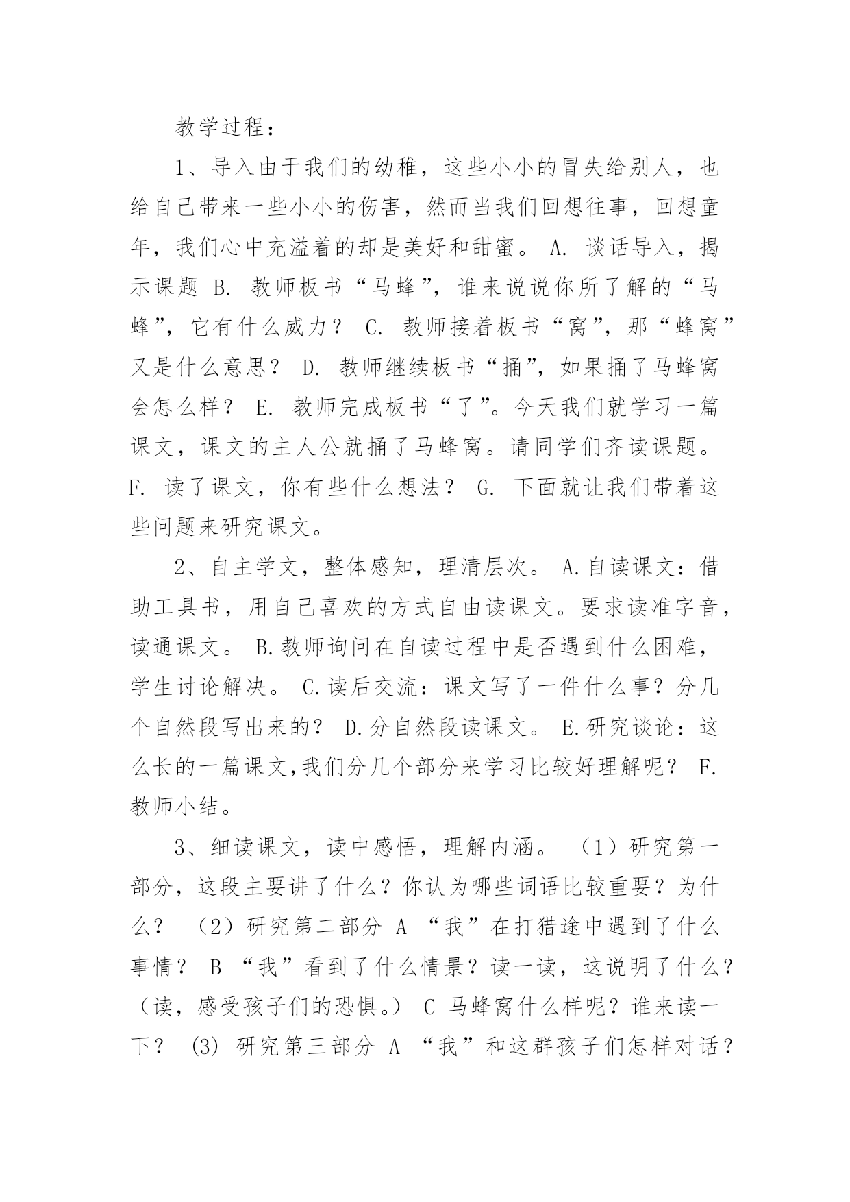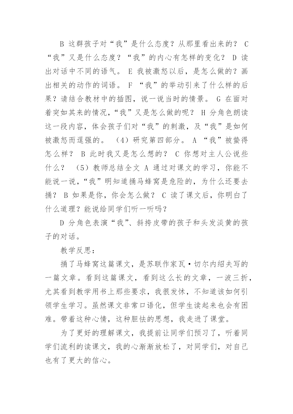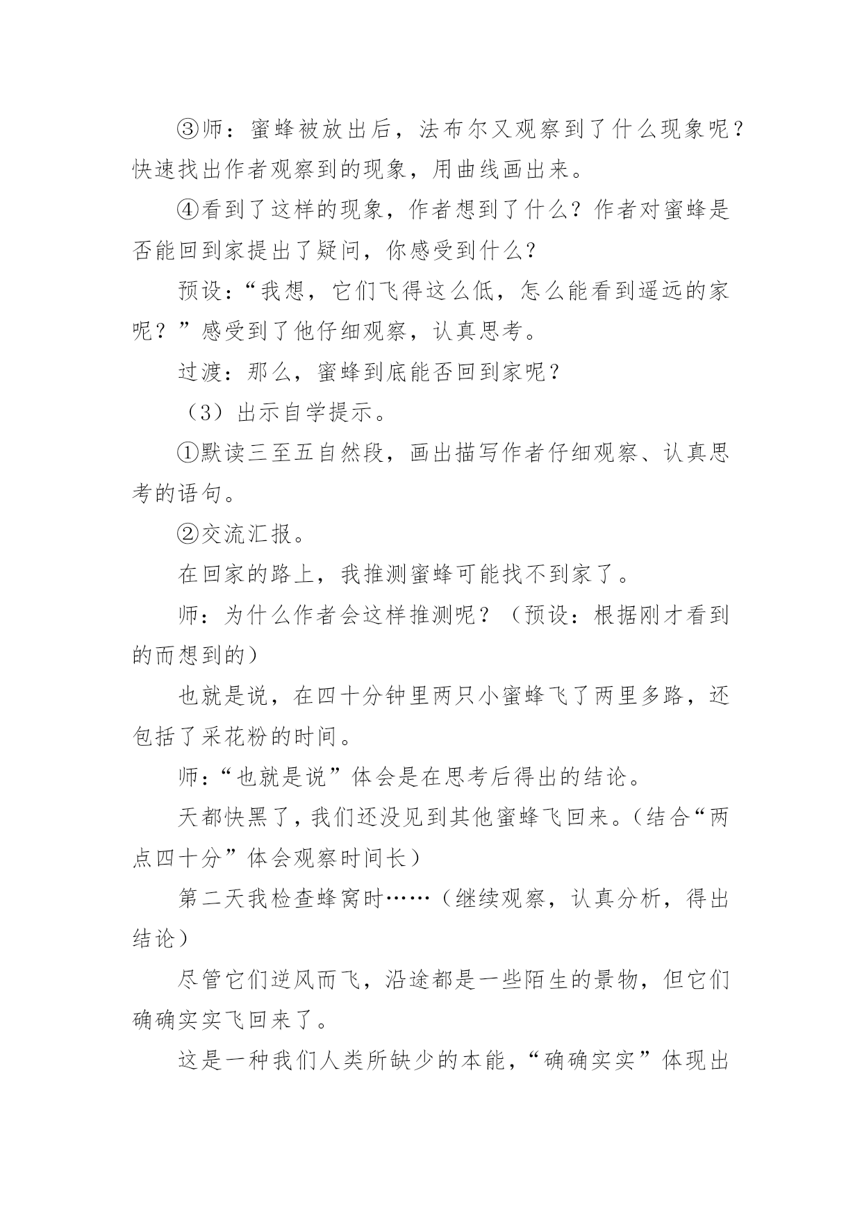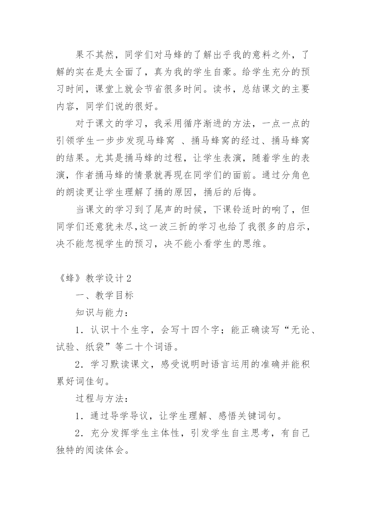 《蜂》教学设计作为一名为他人授业解惑的教育工作者,通常会被要求编写教学设计,教学设计是实现教学目标的计划性和决策性活动。我们该怎么去写教学设计呢?以下是小编收集整理的《蜂》教学设计,供大家参考借鉴,希望可以帮助到有需要的朋友。《蜂》教学设计1教学目标:1、通过了解课文内容,理解“我”思想感情的变化,让学生懂得做事不要冲动、要冷静,不要逞强好胜,要考虑到事情的危险性。2、学会在学习中发现问题、提出问题、并尝试着能自己解决问题,发展创造性思考。3、正确、流利、有感情地朗读课文。教学重点:1、通过了解课文内容,理解“我”思想感情的变化,让学生懂得做事不要冲动、要冷静,不要逞强好胜,要考虑到事情的危险性。2、有感情地朗读课文,尤其是文中的对话,要根据课文的内容读出不同的语气。教学难点:通过了解课文内容,理解“我”思想感情的变化,让学生懂得做事不要冲动、要冷静,不要逞强好胜,要考虑到事情的危险性。教学过程:1、导入由于我们的幼稚,这些小小的冒失给别人,也给自己带来一些小小的伤害,然而当我们回想往事,回想童年,我们心中充溢着的却是美好和甜蜜。A.谈话导入,揭示课题B.教师板书“马蜂”,谁来说说你所了解的“马蜂”,它有什么威力?C.教师接着板书“窝”,那“蜂窝”又是什么意思?D.教师继续板书“捅”,如果捅了马蜂窝会怎么样?E.教师完成板书“了”。今天我们就学习一篇课文,课文的主人公就捅了马蜂窝。请同学们齐读课题。F.读了课文,你有些什么想法?G.下面就让我们带着这些问题来研究课文。2、自主学文,整体感知,理清层次。A.自读课文:借助工具书,用自己喜欢的方式自由读课文。要求读准字音,读通课文。B.教师询问在自读过程中是否遇到什么困难,学生讨论解决。C.读后交流:课文写了一件什么事?分几个自然段写出来的?D.分自然段读课文。E.研究谈论:这么长的一篇课文,我们分几个部分来学习比较好理解呢?F.教师小结。3、细读课文,读中感悟,理解内涵。(1)研究第一部分,这段主要讲了什么?你认为哪些词语比较重要?为什么?(2)研究第二部分A“我”在打猎途中遇到了什么事情?B“我”看到了什么情景?读一读,这说明了什么?(读,感受孩子们的恐惧。)C马蜂窝什么样呢?谁来读一下?(3)研究第三部分A“我”和这群孩子们怎样对话?B这群孩子对“我”是什么态度?从那里看出来的?C“我”又是什么态度?“我”的内心有怎样的变化?D读出对话中不同的语气。E我被激怒以后,是怎么做的?画出相关的动作的词语。F“我”的举动引来了什么样的后果?请结合教材中的插图,说一说当时的情景。G在面对着突如其来的情况,“我”又是怎么做的呢?H分角色朗读这一段内容,体会孩子们对“我”的刺激,及“我”是如何被激怒而逞强的。(4)研究第四部分。A“我”被蛰得怎么样?B此时我又是怎么想的?C你想对主人公说些什么?(5)教师总结全文A通过对课文的学习,你能不能说一说,“我”明知道捅马蜂窝是危险的,为什么还要去捅?B如果是你,你会怎么做?C读了课文后,你明白了什么道理?能说给同学们听一听吗?D分角色表演“我”、斜挎皮带的孩子和头发淡黄的孩子的对话。教学反思:捅了马蜂窝这篇课文,是苏联作家瓦·切尔内绍夫写的一篇文章。看到这篇课文,看到这么长的文章,一波三折,尤其看到教学用书上那些要求,我很发怵,不知道该如何引领学生学习。虽然课文非常口语化,但学生读起来也会有困难。带着这种心情,这种胆怯的思想,我走进了课堂。为了更好的理解课文,我提前让同学们预习了,听着同学们流利的读课文,我的心渐渐放松了,对同学们,对自己也有了更大的信心。果不其然,同学们对马蜂的了解出乎我的意料之外,了解的实在是太全面了,真为我的学生自豪。给学生充分的预习时间,课堂上就会节省很多时间。读书,总结课文的主要内容,同学们说的很好。对于课文的学习,我采用循序渐进的方法,一点一点的引领学生一步步发现马蜂窝、捅马蜂窝的经过、捅马蜂窝的结果。尤其是捅马蜂的过程,让学生表演,随着学生的表演,作者捅马蜂的情景就再现在同学们的面前。通过分角色的朗读更让学生理解了捅的原因,捅后的后悔。当课文的学习到了尾声的时候,下课铃适时的响了,但同学们还意犹未尽,这一波三折的学习也给了我很多的启示,决不能忽视学生的预习,决不能小看学生的思维。《蜂》教学设计2一、教学目标知识与能力:1.认识十个生字,会写十四个字;能正确读写“无论、试验、纸袋”等二十个词语。2.学习默读课文,感受说明时语言运用的准确并能积累好词佳句。过程与方法:1.通过导学导议,让学生理解、感悟关键词句。2.充分发挥学生主体性,引发学生自主思考,有自己独特的阅读体会。情感态度与价值观:学习法布尔的观察发现和探索精神以及严谨的科学态度和求实的科学作风。二、教学重难点教学重点:弄清为了验证蜜蜂有没有辨别方向的能力,
