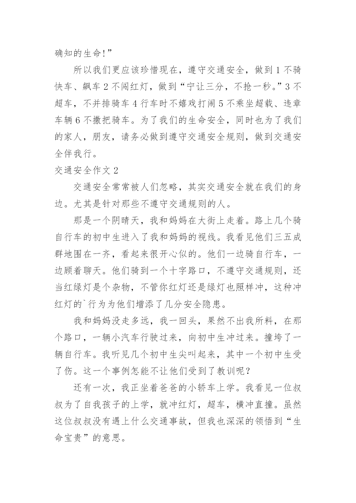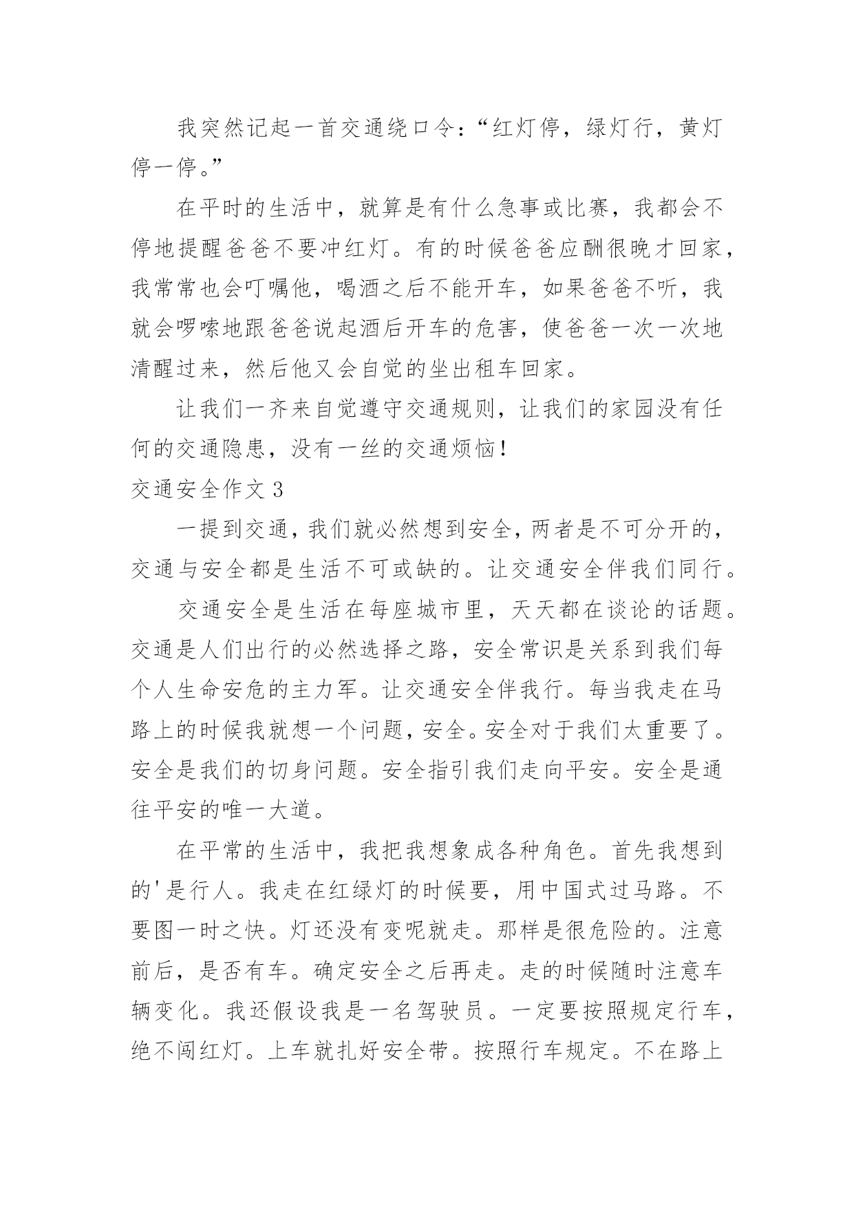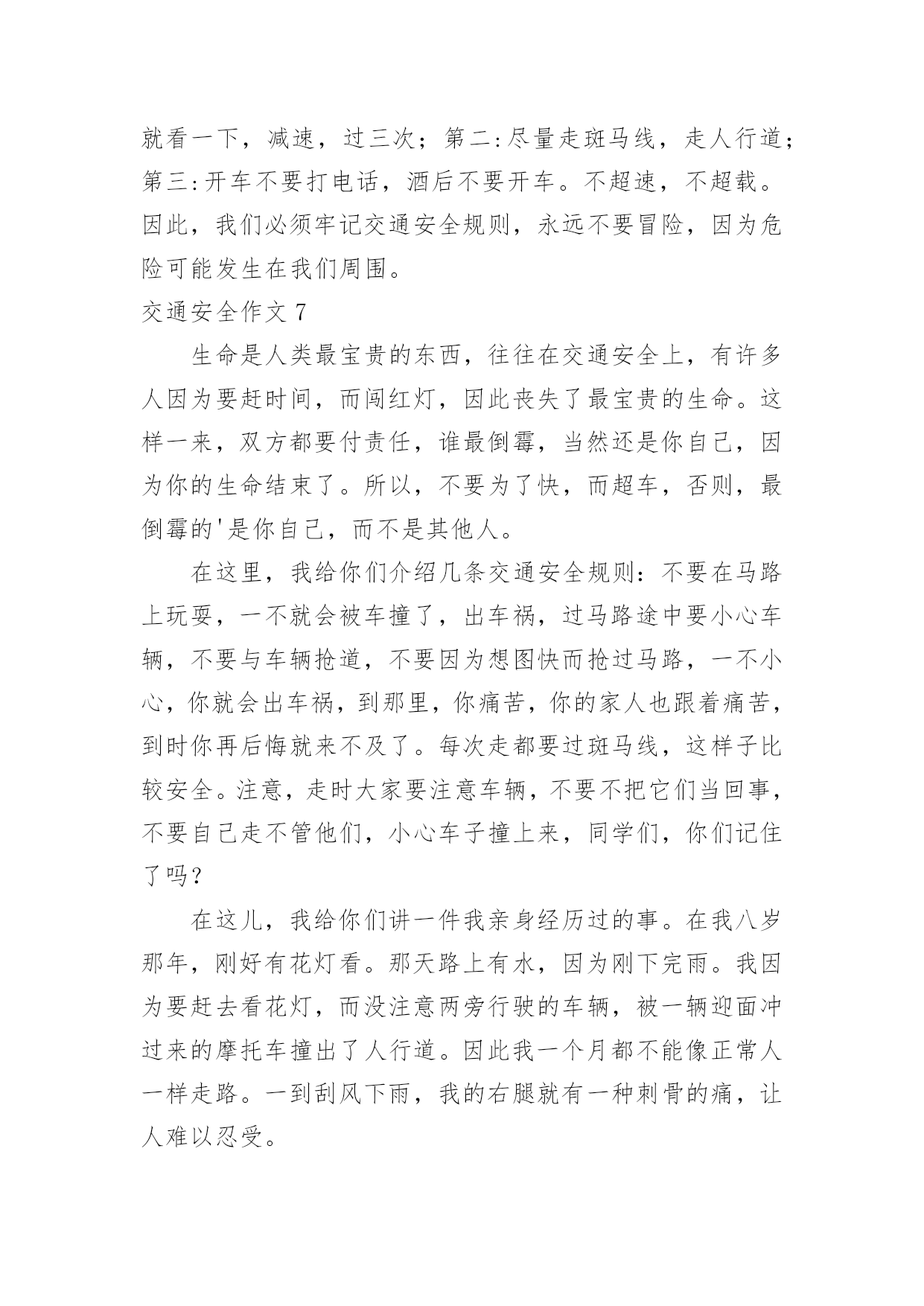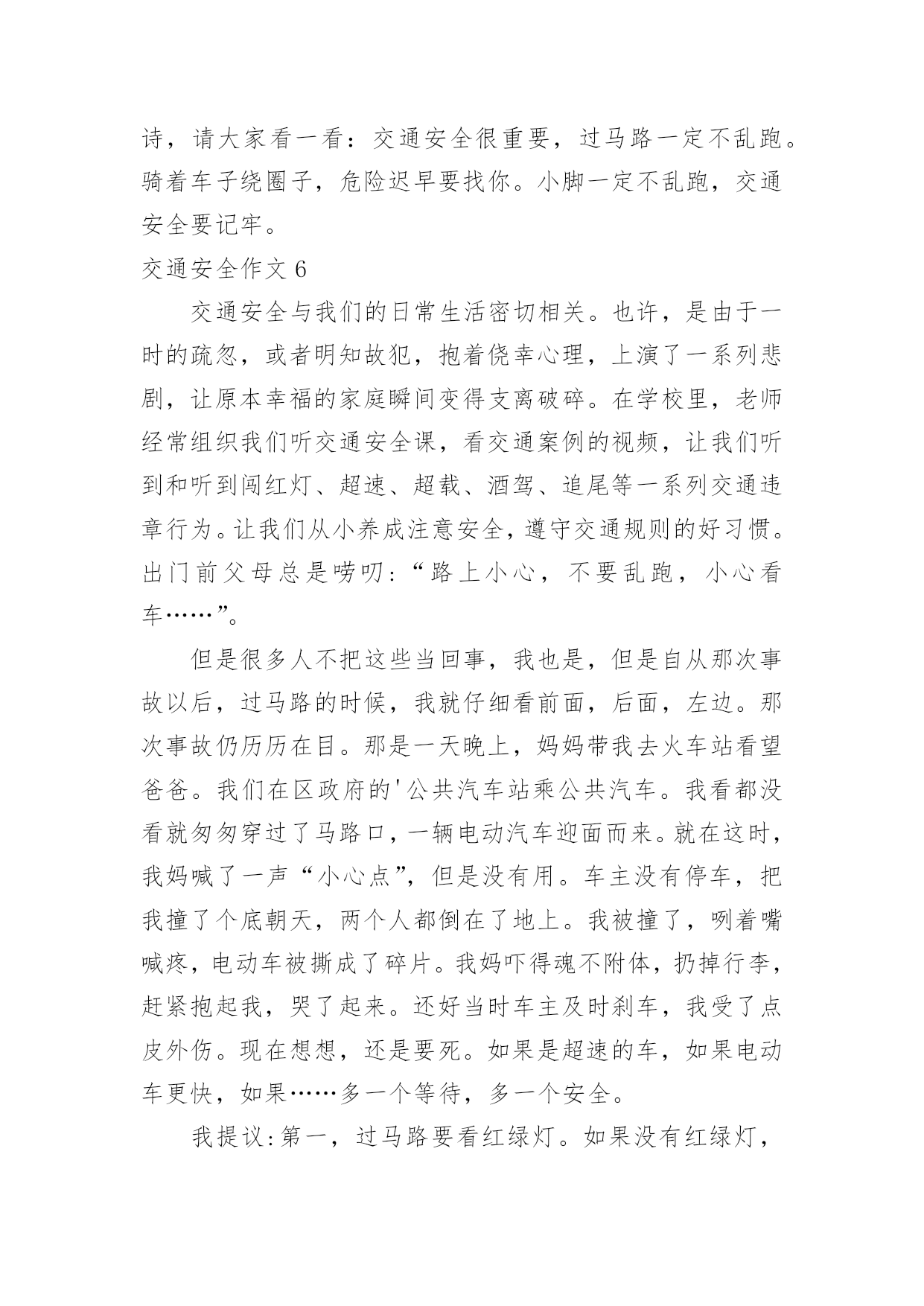 交通安全作文(优)交通安全作文在平平淡淡的学习、工作、生活中,大家都接触过作文吧,作文根据体裁的不同可以分为记叙文、说明文、应用文、议论文。你知道作文怎样写才规范吗?下面是小编为大家收集的交通安全作文,仅供参考,大家一起来看看吧。交通安全作文1随着现在社会经济水平的发展,现在人们的生活水平也在不断的提高。交通也是在不断的进步,马路的的车也是越来越多。交通安全现在已经和我们的生活息息相关,不可分割,交通安全文明应该人人须知,人人都应该遵守。可是我们是否每天都有在遵守交通规则呢?你是否有因为赶时间而闯了红绿灯呢?在回家的.路上是否有很你的好朋友并排着骑车聊天呢?或者是和你的好朋友在街上并排着一路横行呢。也许你没有,也许你有可是现在还是健康安全。可是你是否有想到,我们时时刻刻在交通之间徘徊,也许,就一刹那的疏忽,就会给我们带来终身的遗憾。不要心存侥幸,不要感觉没什么。因为如果真的有什么的时候你后悔莫及。所以,为了我们的家人,为了我们的朋友,为了我们自己,我们应该做到遵守交通安全,做到交通安全伴我行。一句格言写的非常好:“今天就是生命——是惟一你能确知的生命!”所以我们更应该珍惜现在,遵守交通安全,做到1不骑快车、飙车2不闯红灯,做到“宁让三分,不抢一秒。”3不超车,不并排骑车4行车时不嬉戏打闹5不乘坐超载、违章车辆6不撒把骑车。为了我们的生命安全,同时也为了我们的家人,朋友,请务必做到遵守交通安全规则,做到交通安全伴我行。交通安全作文2交通安全常常被人们忽略,其实交通安全就在我们的身边。尤其是针对那些不遵守交通规则的人。那是一个阴晴天,我和妈妈在大街上走着。路上几个骑自行车的初中生进入了我和妈妈的视线。我看见他们三五成群地围在一齐,看起来很开心似的。他们一边骑自行车,一边顾着聊天。他们骑到一个十字路口,不遵守交通规则,还当红绿灯是个杂物,不管你红灯还是绿灯也照样冲,这种冲红灯的`行为为他们增添了几分安全隐患。我和妈妈没走多远,我一回头,果然不出我所料,在那个路口,一辆小汽车行驶过来,向初中生冲过来。撞垮了一辆自行车。我听见几个初中生尖叫起来,其中一个初中生受了伤。这一个事例怎能不让他们受到了教训呢?还有一次,我正坐着爸爸的小轿车上学。我看见一位叔叔为了自我孩子的上学,就冲红灯,超车,横冲直撞。虽然这位叔叔没有遇上什么交通事故,但我也深深的领悟到“生命宝贵”的意思。我突然记起一首交通绕口令:“红灯停,绿灯行,黄灯停一停。”在平时的生活中,就算是有什么急事或比赛,我都会不停地提醒爸爸不要冲红灯。有的时候爸爸应酬很晚才回家,我常常也会叮嘱他,喝酒之后不能开车,如果爸爸不听,我就会啰嗦地跟爸爸说起酒后开车的危害,使爸爸一次一次地清醒过来,然后他又会自觉的坐出租车回家。让我们一齐来自觉遵守交通规则,让我们的家园没有任何的交通隐患,没有一丝的交通烦恼!交通安全作文3一提到交通,我们就必然想到安全,两者是不可分开的,交通与安全都是生活不可或缺的。让交通安全伴我们同行。交通安全是生活在每座城市里,天天都在谈论的话题。交通是人们出行的必然选择之路,安全常识是关系到我们每个人生命安危的主力军。让交通安全伴我行。每当我走在马路上的时候我就想一个问题,安全。安全对于我们太重要了。安全是我们的切身问题。安全指引我们走向平安。安全是通往平安的唯一大道。在平常的生活中,我把我想象成各种角色。首先我想到的'是行人。我走在红绿灯的时候要,用中国式过马路。不要图一时之快。灯还没有变呢就走。那样是很危险的。注意前后,是否有车。确定安全之后再走。走的时候随时注意车辆变化。我还假设我是一名驾驶员。一定要按照规定行车,绝不闯红灯。上车就扎好安全带。按照行车规定。不在路上开飞车、不文明车。不并道,不硬超车。我还假设我是个自行车行驶人。我应该在应该走的路上走,不逆行,不去机动车路上去。其实交通就像是人生一样,一条大路,但前提是把安全带上在上路,检查好安全。这就能不违法,不走歪路、不走无图知返的路。交通安全是人生的一条大道,我们在路上的时候就是主载着,主栽我们自己生命的使者。交通安全是必然相拥的俩个兄弟。让我们走在大路上的是候,把这两个好兄弟带上吧。走向安全的港湾。交通安全作文4对于交通安全,我们天天讲,可是就有某些人“左耳朵进,右耳朵出”.没有关系到自家生命安危,或许就觉得与己无关。难道非要有惨痛的教训才会醒悟吗?当你横穿马路不走斑马线时,当你闯红灯时,当你骑车违规时,当你开着奔驰,不系安全带时------够了!!我感到可怕的事就会在我们的身边发生。新闻里一个个触目惊心的案例,难道还不能让你感到注意交通安全的重要性吗?那么,我再给你讲一个发生再我身边的事。就在去年的“安全生产日”,我家发生了讽刺性的一幕。我表舅出了车祸,住院半年多,右脚五级残废,所受的.痛苦,那是不可言喻的。