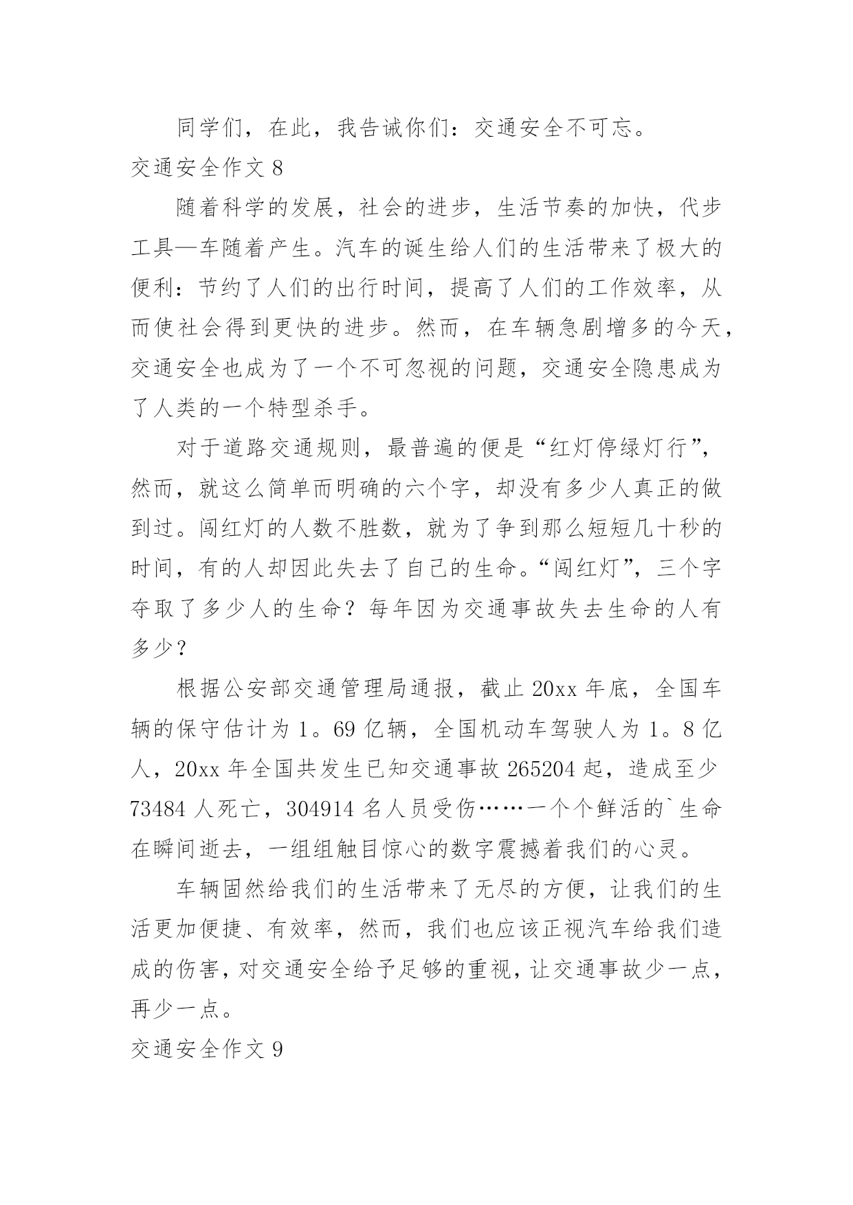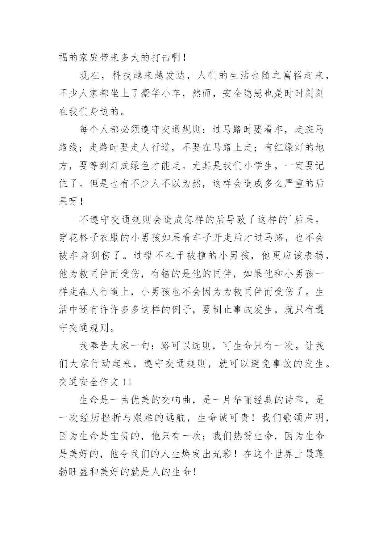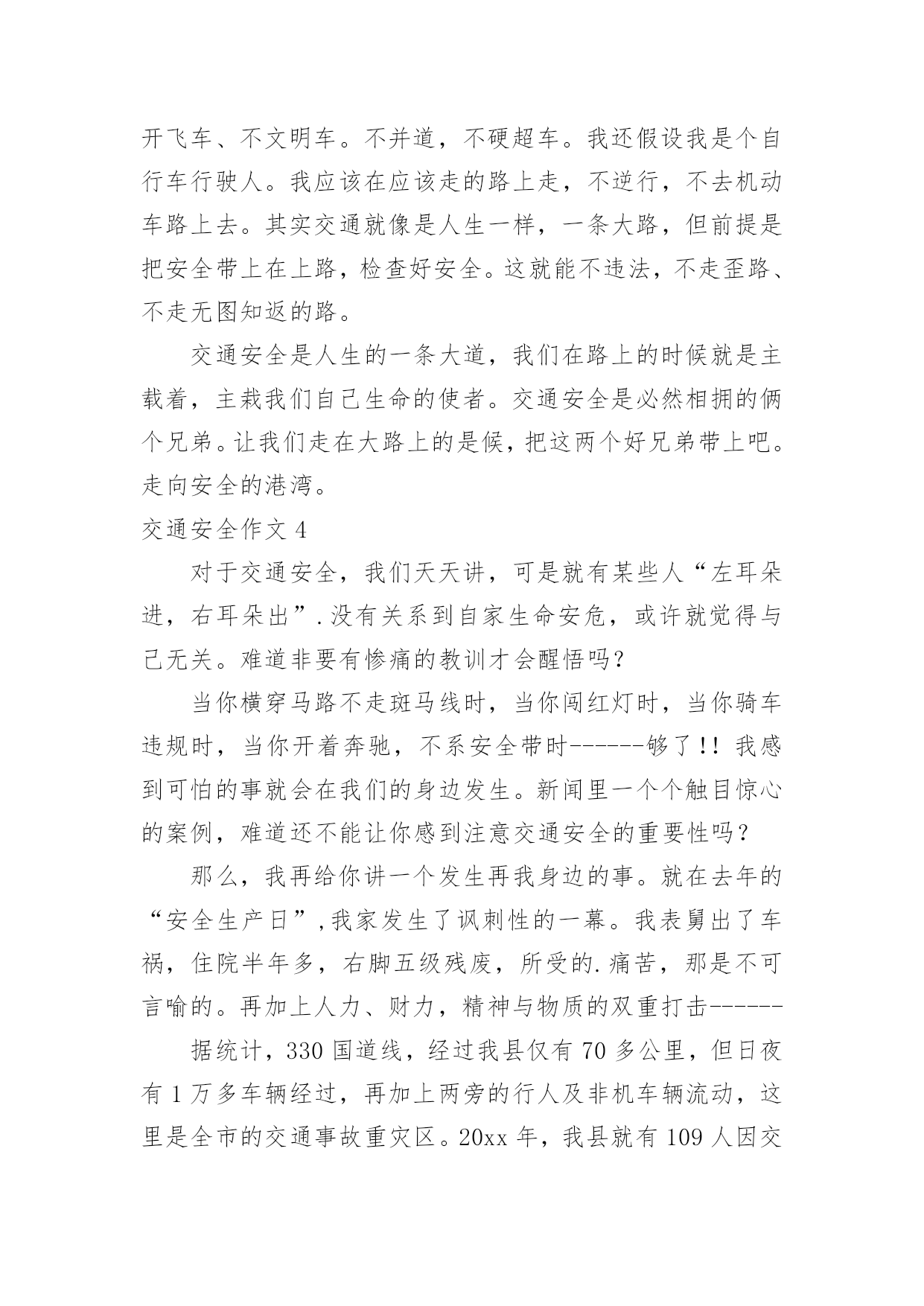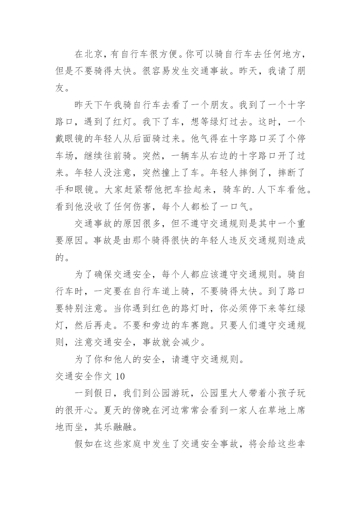 交通安全作文(优)交通安全作文在平平淡淡的学习、工作、生活中,大家都接触过作文吧,作文根据体裁的不同可以分为记叙文、说明文、应用文、议论文。你知道作文怎样写才规范吗?下面是小编为大家收集的交通安全作文,仅供参考,大家一起来看看吧。交通安全作文1随着现在社会经济水平的发展,现在人们的生活水平也在不断的提高。交通也是在不断的进步,马路的的车也是越来越多。交通安全现在已经和我们的生活息息相关,不可分割,交通安全文明应该人人须知,人人都应该遵守。可是我们是否每天都有在遵守交通规则呢?你是否有因为赶时间而闯了红绿灯呢?在回家的.路上是否有很你的好朋友并排着骑车聊天呢?或者是和你的好朋友在街上并排着一路横行呢。也许你没有,也许你有可是现在还是健康安全。可是你是否有想到,我们时时刻刻在交通之间徘徊,也许,就一刹那的疏忽,就会给我们带来终身的遗憾。不要心存侥幸,不要感觉没什么。因为如果真的有什么的时候你后悔莫及。所以,为了我们的家人,为了我们的朋友,为了我们自己,我们应该做到遵守交通安全,做到交通安全伴我行。一句格言写的非常好:“今天就是生命——是惟一你能确知的生命!”所以我们更应该珍惜现在,遵守交通安全,做到1不骑快车、飙车2不闯红灯,做到“宁让三分,不抢一秒。”3不超车,不并排骑车4行车时不嬉戏打闹5不乘坐超载、违章车辆6不撒把骑车。为了我们的生命安全,同时也为了我们的家人,朋友,请务必做到遵守交通安全规则,做到交通安全伴我行。交通安全作文2交通安全常常被人们忽略,其实交通安全就在我们的身边。尤其是针对那些不遵守交通规则的人。那是一个阴晴天,我和妈妈在大街上走着。路上几个骑自行车的初中生进入了我和妈妈的视线。我看见他们三五成群地围在一齐,看起来很开心似的。他们一边骑自行车,一边顾着聊天。他们骑到一个十字路口,不遵守交通规则,还当红绿灯是个杂物,不管你红灯还是绿灯也照样冲,这种冲红灯的`行为为他们增添了几分安全隐患。我和妈妈没走多远,我一回头,果然不出我所料,在那个路口,一辆小汽车行驶过来,向初中生冲过来。撞垮了一辆自行车。我听见几个初中生尖叫起来,其中一个初中生受了伤。这一个事例怎能不让他们受到了教训呢?还有一次,我正坐着爸爸的小轿车上学。我看见一位叔叔为了自我孩子的上学,就冲红灯,超车,横冲直撞。虽然这位叔叔没有遇上什么交通事故,但我也深深的领悟到“生命宝贵”的意思。我突然记起一首交通绕口令:“红灯停,绿灯行,黄灯停一停。”在平时的生活中,就算是有什么急事或比赛,我都会不停地提醒爸爸不要冲红灯。有的时候爸爸应酬很晚才回家,我常常也会叮嘱他,喝酒之后不能开车,如果爸爸不听,我就会啰嗦地跟爸爸说起酒后开车的危害,使爸爸一次一次地清醒过来,然后他又会自觉的坐出租车回家。让我们一齐来自觉遵守交通规则,让我们的家园没有任何的交通隐患,没有一丝的交通烦恼!交通安全作文3一提到交通,我们就必然想到安全,两者是不可分开的,交通与安全都是生活不可或缺的。让交通安全伴我们同行。交通安全是生活在每座城市里,天天都在谈论的话题。交通是人们出行的必然选择之路,安全常识是关系到我们每个人生命安危的主力军。让交通安全伴我行。每当我走在马路上的时候我就想一个问题,安全。安全对于我们太重要了。安全是我们的切身问题。安全指引我们走向平安。安全是通往平安的唯一大道。在平常的生活中,我把我想象成各种角色。首先我想到的'是行人。我走在红绿灯的时候要,用中国式过马路。不要图一时之快。灯还没有变呢就走。那样是很危险的。注意前后,是否有车。确定安全之后再走。走的时候随时注意车辆变化。我还假设我是一名驾驶员。一定要按照规定行车,绝不闯红灯。上车就扎好安全带。按照行车规定。不在路上开飞车、不文明车。不并道,不硬超车。我还假设我是个自行车行驶人。我应该在应该走的路上走,不逆行,不去机动车路上去。其实交通就像是人生一样,一条大路,但前提是把安全带上在上路,检查好安全。这就能不违法,不走歪路、不走无图知返的路。交通安全是人生的一条大道,我们在路上的时候就是主载着,主栽我们自己生命的使者。交通安全是必然相拥的俩个兄弟。让我们走在大路上的是候,把这两个好兄弟带上吧。走向安全的港湾。交通安全作文4对于交通安全,我们天天讲,可是就有某些人“左耳朵进,右耳朵出”.没有关系到自家生命安危,或许就觉得与己无关。难道非要有惨痛的教训才会醒悟吗?当你横穿马路不走斑马线时,当你闯红灯时,当你骑车违规时,当你开着奔驰,不系安全带时------够了!!我感到可怕的事就会在我们的身边发生。新闻里一个个触目惊心的案例,难道还不能让你感到注意交通安全的重要性吗?那么,我再给你讲一个发生再我身边的事。就在去年的“安全生产日”,我家发生了讽刺性的一幕。我表舅出了车祸,住院半年多,右脚五级残废,所受的.痛苦,那是不可言喻的。
