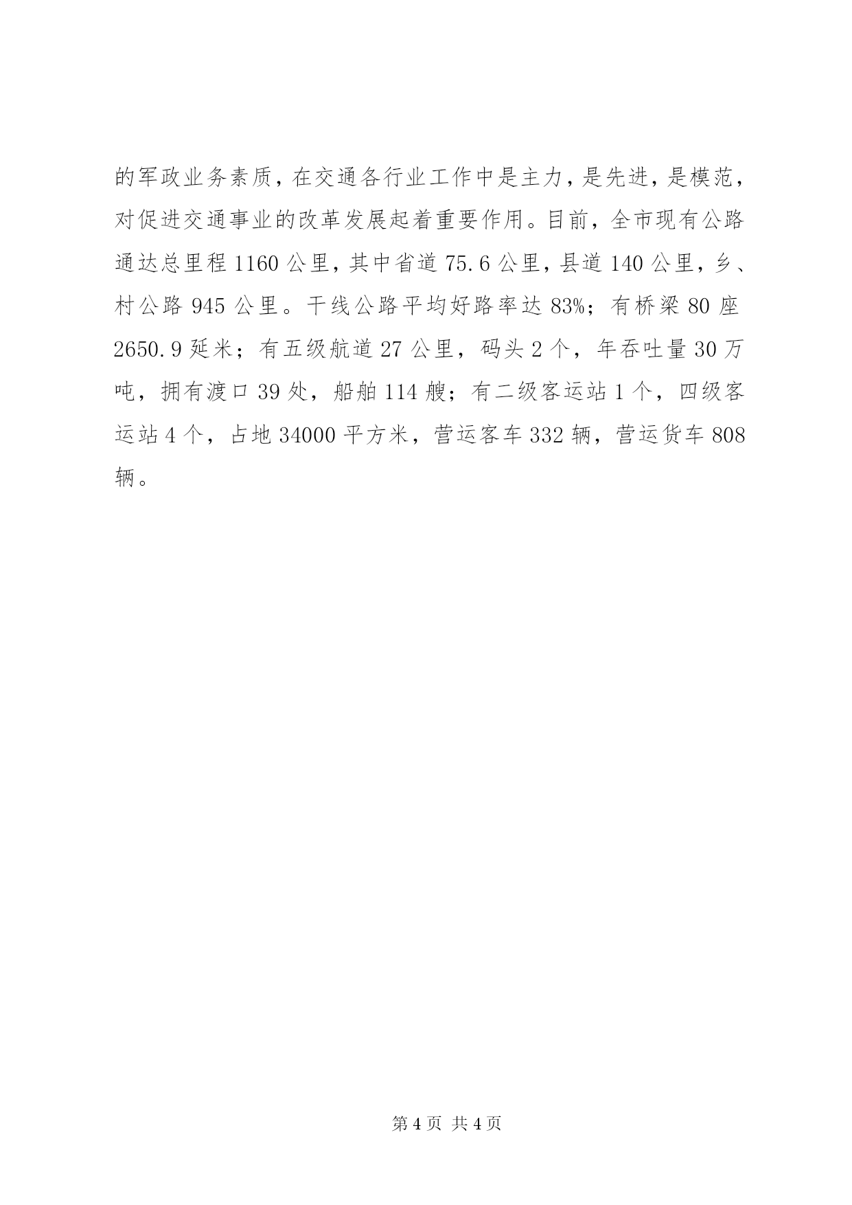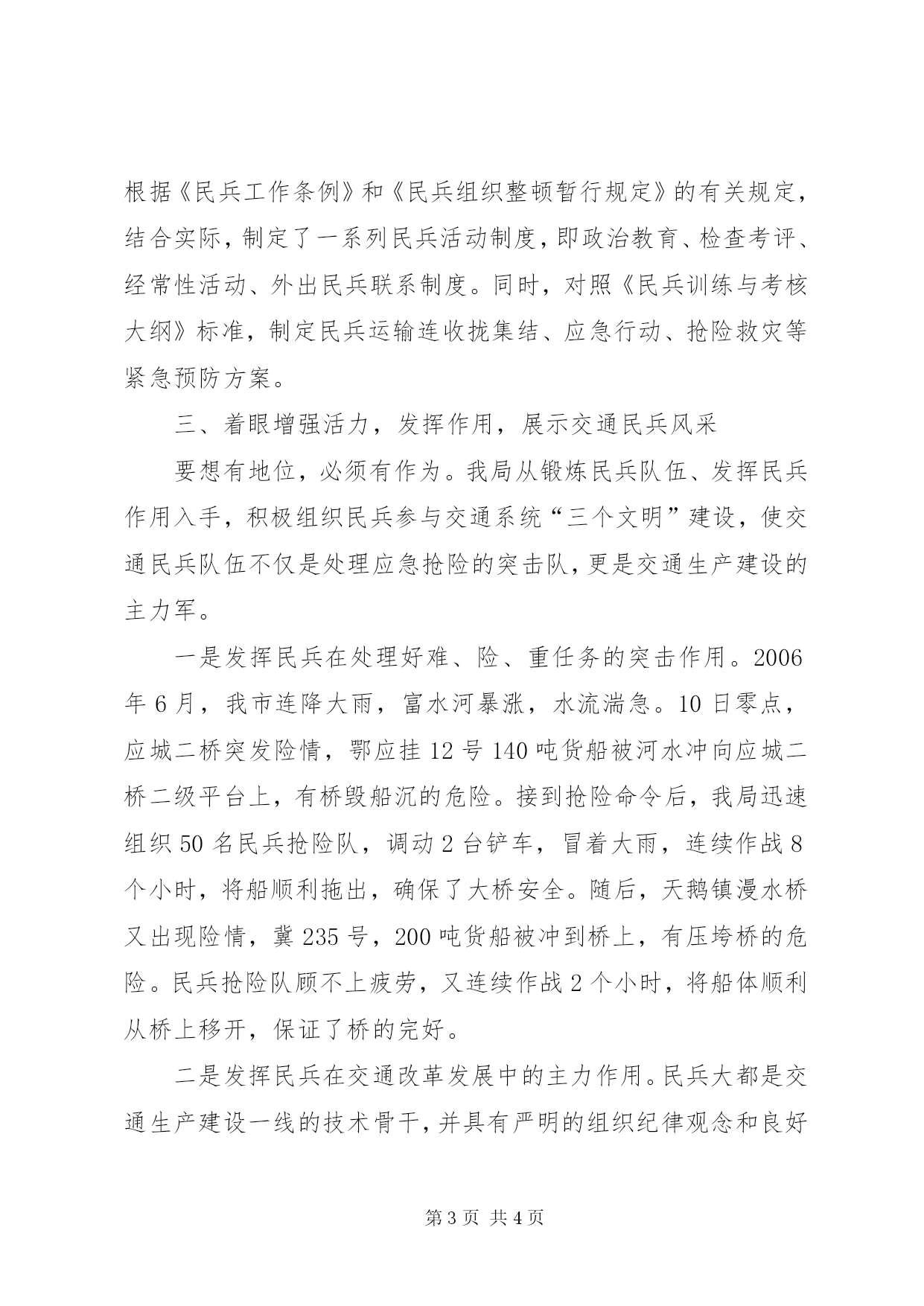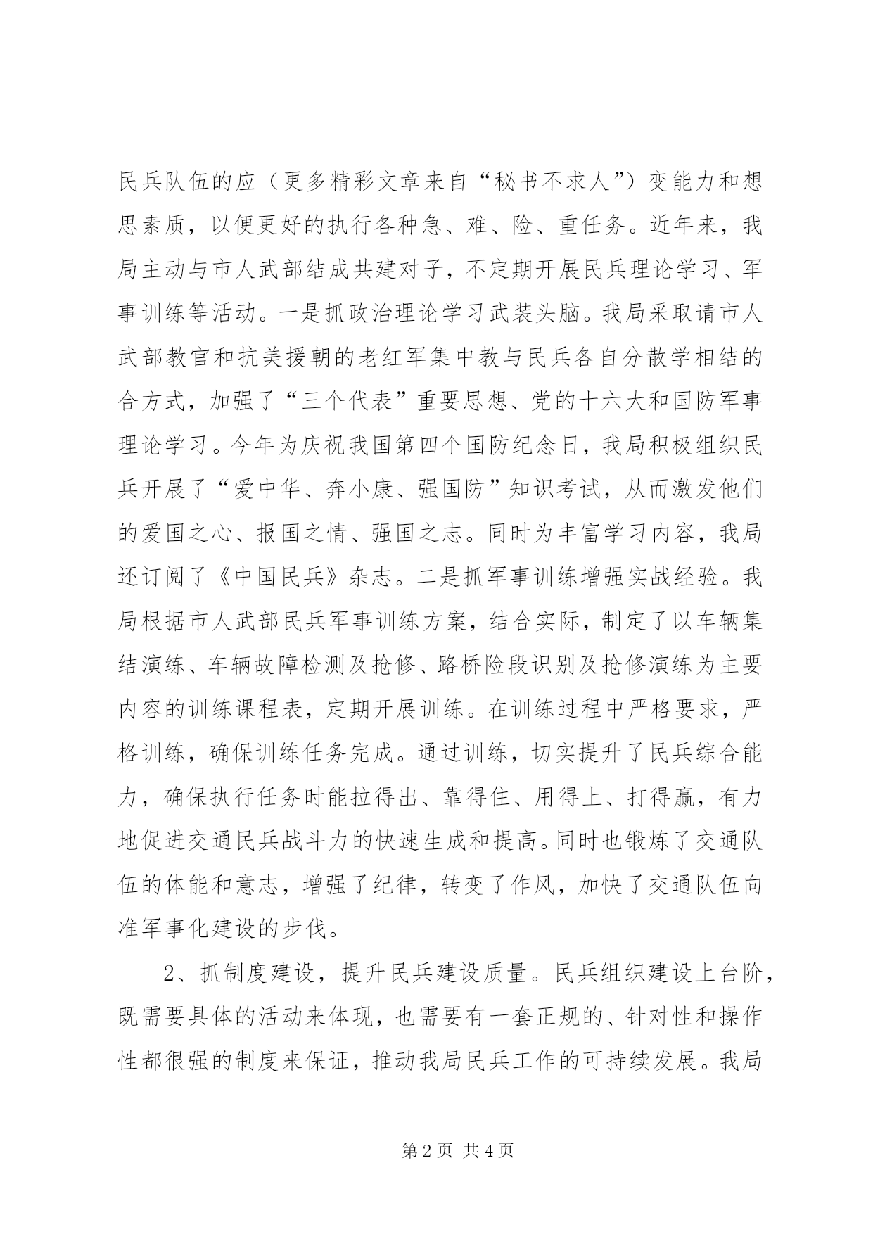 第PAGE\*Arabic\*MERGEFORMAT4页共NUMPAGES\*MERGEFORMAT4页交通局民兵工作总结...近年来,在市委、市政府和市人武部的正确领导和指导下,我局坚持发扬党管武装优良传统,持之以恒重视、支持民兵建设,按照“组织落实、军事落实、政治落实”的要求,不断加强对民兵工作的组织领导,创新机制,狠抓建设,民兵工作呈现出机制灵活、形式多样、活动经常的良好局面。一、着眼认识提高,加强领导,健全民兵工作组织认识是行动的先导。近年来,我局在民兵工作中从抓思想认识入手,加强领导,深入宣传,使民兵工作意识不断增强,民兵工作组织不断健全。一是局总支高度重视,把民兵组织建设摆上重要位置。我局在市人武部门的指导下,依据政策法规,本着“编为用,建为战”的原则,组建了以副局长范志虹为连长、副局长丁焕生为指导员的对口民兵专业分队。该分队分三个排,共50人,主要承担着交通运输、汽车修理、反恐应急抢修路桥等职责。二是加强宣传引导。我局积极开展以民兵性质、任务和职能为主要内容的宣传教育,不断提高民兵的法制意识,切实增强了民兵的国防观念和依法参加民兵组织的自觉性,为组建民兵工作提供了思想保证。二、着眼人本理念,结合实际,狠抓民兵工作落实1、抓教育训练,提高民兵队伍素质。教育训练目的是提高民兵队伍的应(更多精彩文章来自“秘书不求人”)变能力和想思素质,以便更好的执行各种急、难、险、重任务。近年来,我局主动与市人武部结成共建对子,不定期开展民兵理论学习、军事训练等活动。一是抓政治理论学习武装头脑。我局采取请市人武部教官和抗美援朝的老红军集中教与民兵各自分散学相结的合方式,加强了“三个代表”重要思想、党的十六大和国防军事理论学习。今年为庆祝我国第四个国防纪念日,我局积极组织民兵开展了“爱中华、奔小康、强国防”知识考试,从而激发他们的爱国之心、报国之情、强国之志。同时为丰富学习内容,我局还订阅了《中国民兵》杂志。二是抓军事训练增强实战经验。我局根据市人武部民兵军事训练方案,结合实际,制定了以车辆集结演练、车辆故障检测及抢修、路桥险段识别及抢修演练为主要内容的训练课程表,定期开展训练。在训练过程中严格要求,严格训练,确保训练任务完成。通过训练,切实提升了民兵综合能力,确保执行任务时能拉得出、靠得住、用得上、打得赢,有力地促进交通民兵战斗力的快速生成和提高。同时也锻炼了交通队伍的体能和意志,增强了纪律,转变了作风,加快了交通队伍向准军事化建设的步伐。2、抓制度建设,提升民兵建设质量。民兵组织建设上台阶,既需要具体的活动来体现,也需要有一套正规的、针对性和操作性都很强的制度来保证,推动我局民兵工作的可持续发展。我局根据《民兵工作条例》和《民兵组织整顿暂行规定》的有关规定,结合实际,制定了一系列民兵活动制度,即政治教育、检查考评、经常性活动、外出民兵联系制度。同时,对照《民兵训练与考核大纲》标准,制定民兵运输连收拢集结、应急行动、抢险救灾等紧急预防方案。三、着眼增强活力,发挥作用,展示交通民兵风采要想有地位,必须有作为。我局从锻炼民兵队伍、发挥民兵作用入手,积极组织民兵参与交通系统“三个文明”建设,使交通民兵队伍不仅是处理应急抢险的突击队,更是交通生产建设的主力军。一是发挥民兵在处理好难、险、重任务的突击作用。2006年6月,我市连降大雨,富水河暴涨,水流湍急。10日零点,应城二桥突发险情,鄂应挂12号140吨货船被河水冲向应城二桥二级平台上,有桥毁船沉的危险。接到抢险命令后,我局迅速组织50名民兵抢险队,调动2台铲车,冒着大雨,连续作战8个小时,将船顺利拖出,确保了大桥安全。随后,天鹅镇漫水桥又出现险情,冀235号,200吨货船被冲到桥上,有压垮桥的危险。民兵抢险队顾不上疲劳,又连续作战2个小时,将船体顺利从桥上移开,保证了桥的完好。二是发挥民兵在交通改革发展中的主力作用。民兵大都是交通生产建设一线的技术骨干,并具有严明的组织纪律观念和良好的军政业务素质,在交通各行业工作中是主力,是先进,是模范,对促进交通事业的改革发展起着重要作用。目前,全市现有公路通达总里程1160公里,其中省道75.6公里,县道140公里,乡、村公路945公里。干线公路平均好路率达83%;有桥梁80座2650.9延米;有五级航道27公里,码头2个,年吞吐量30万吨,拥有渡口39处,船舶114艘;有二级客运站1个,四级客运站4个,占地34000平方米,营运客车332辆,营运货车808辆。