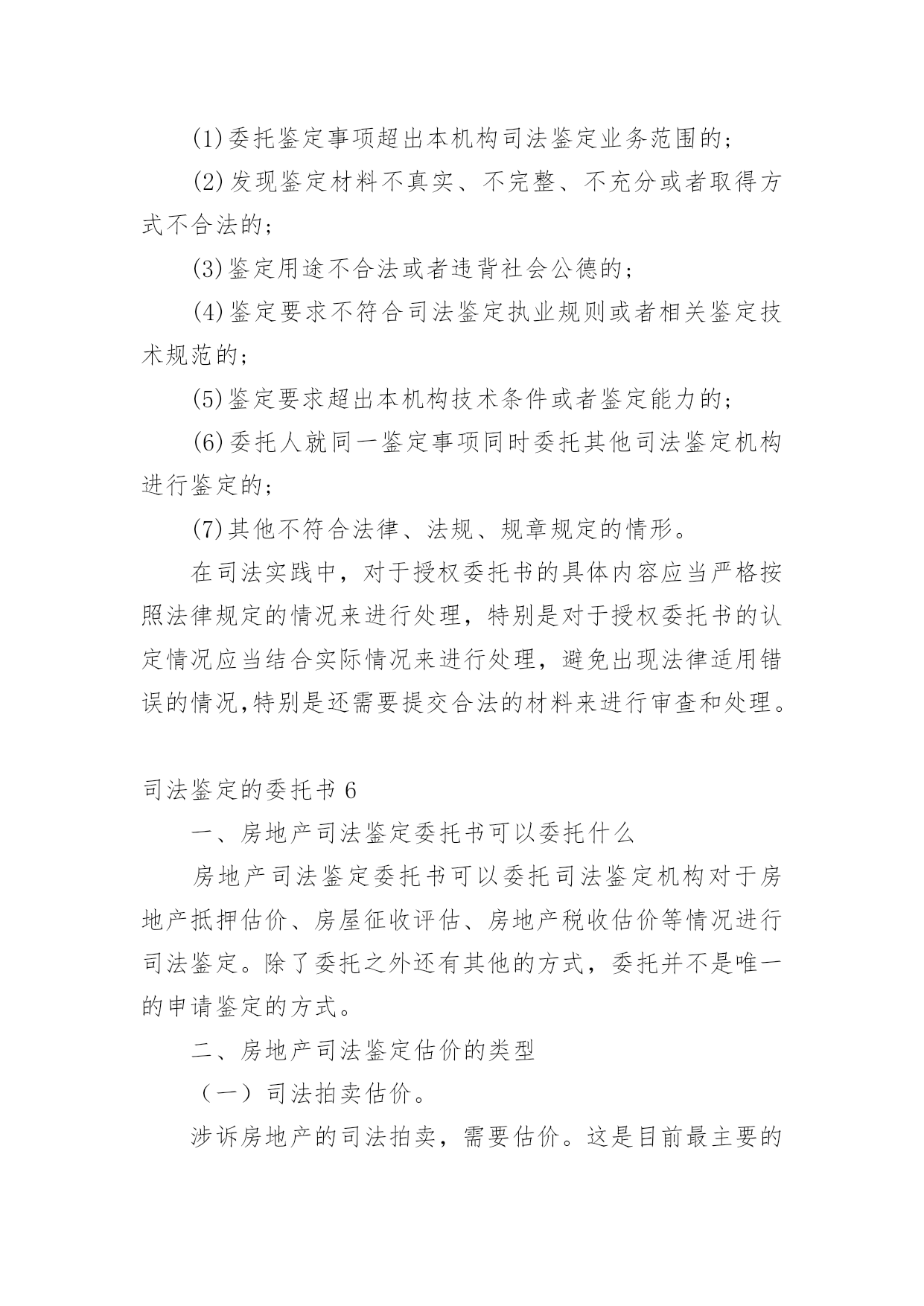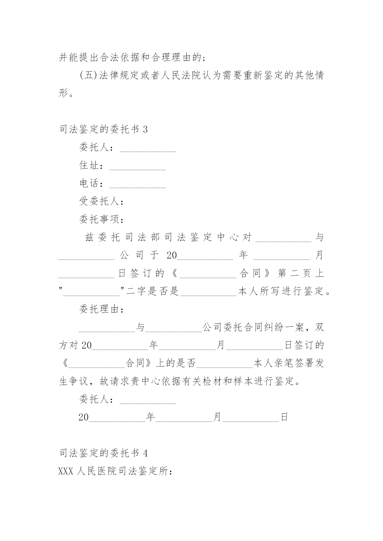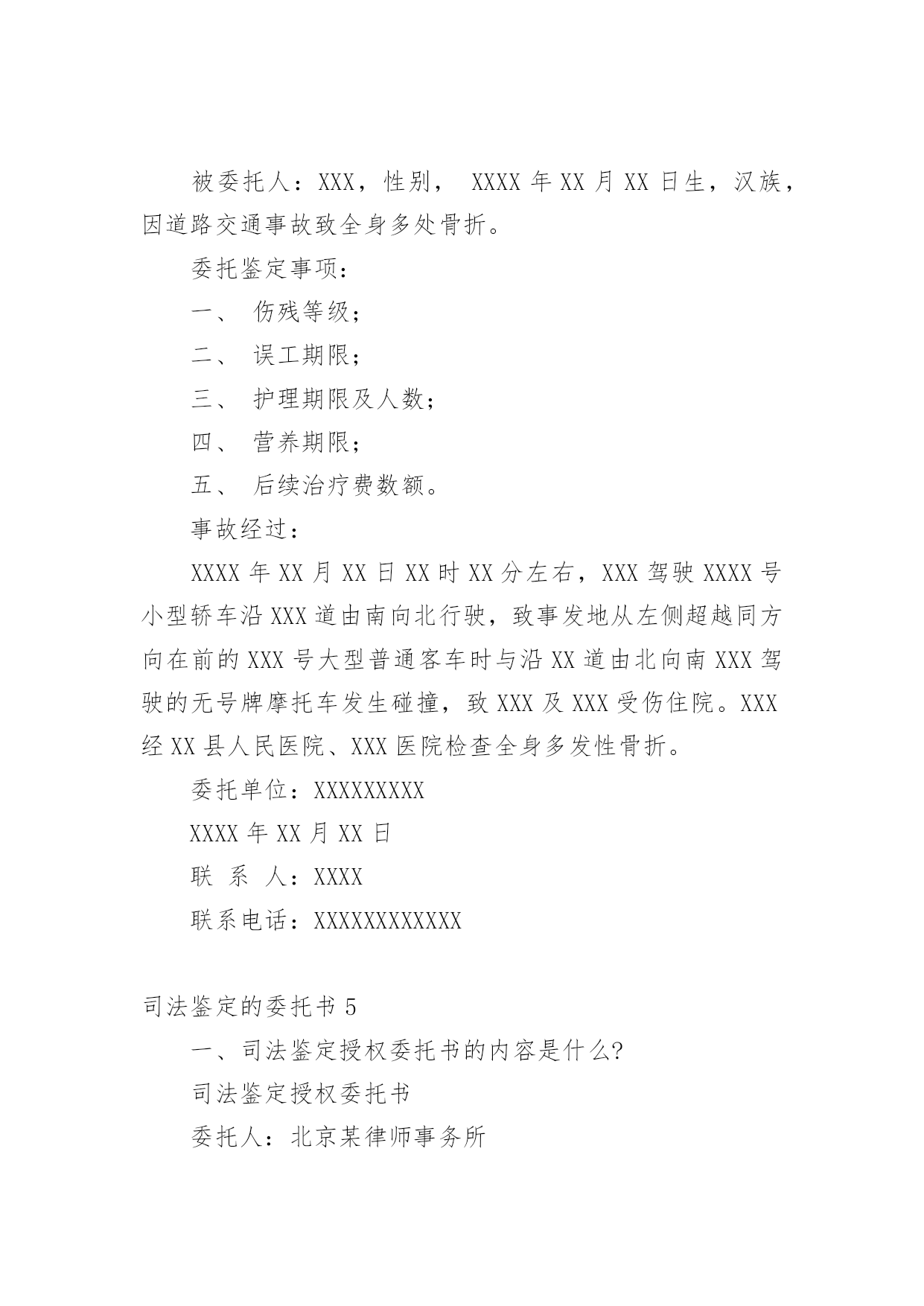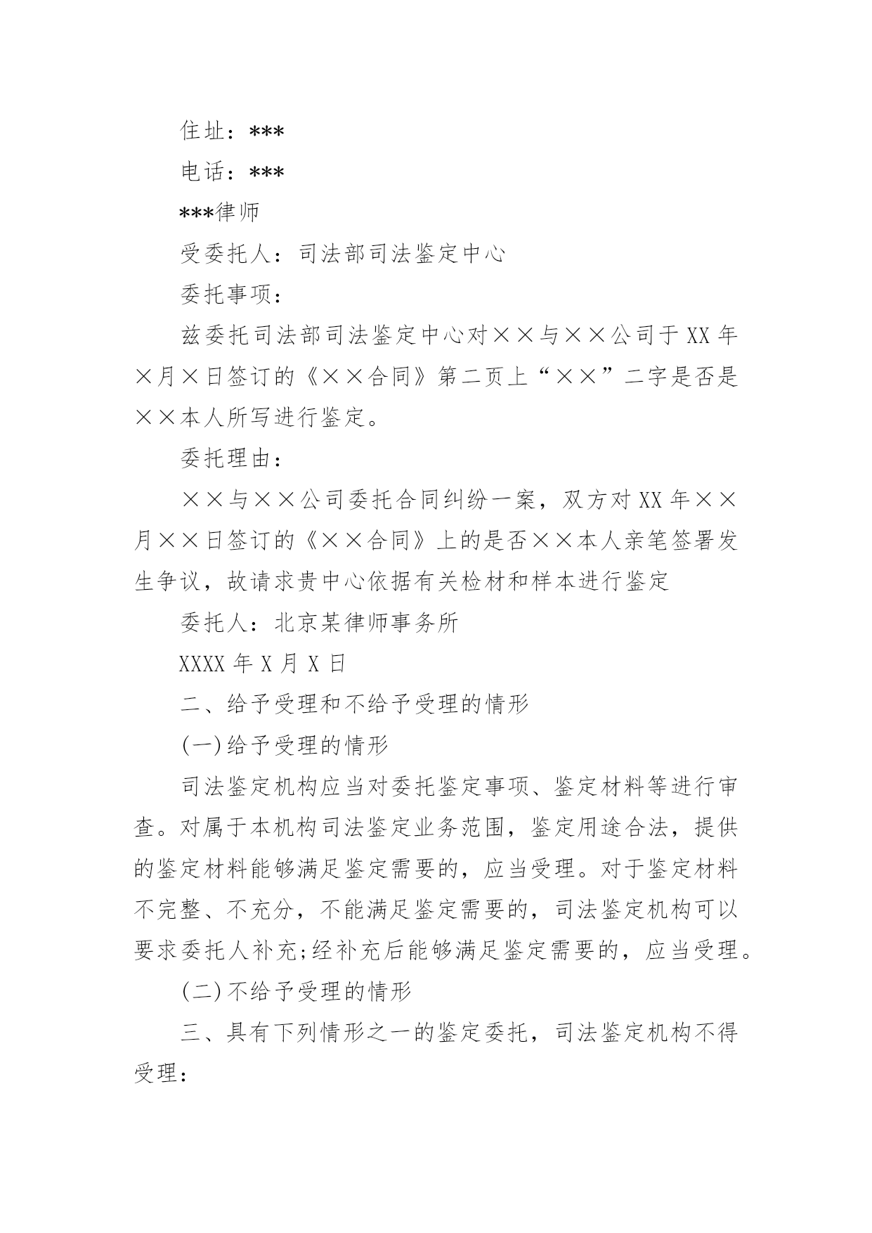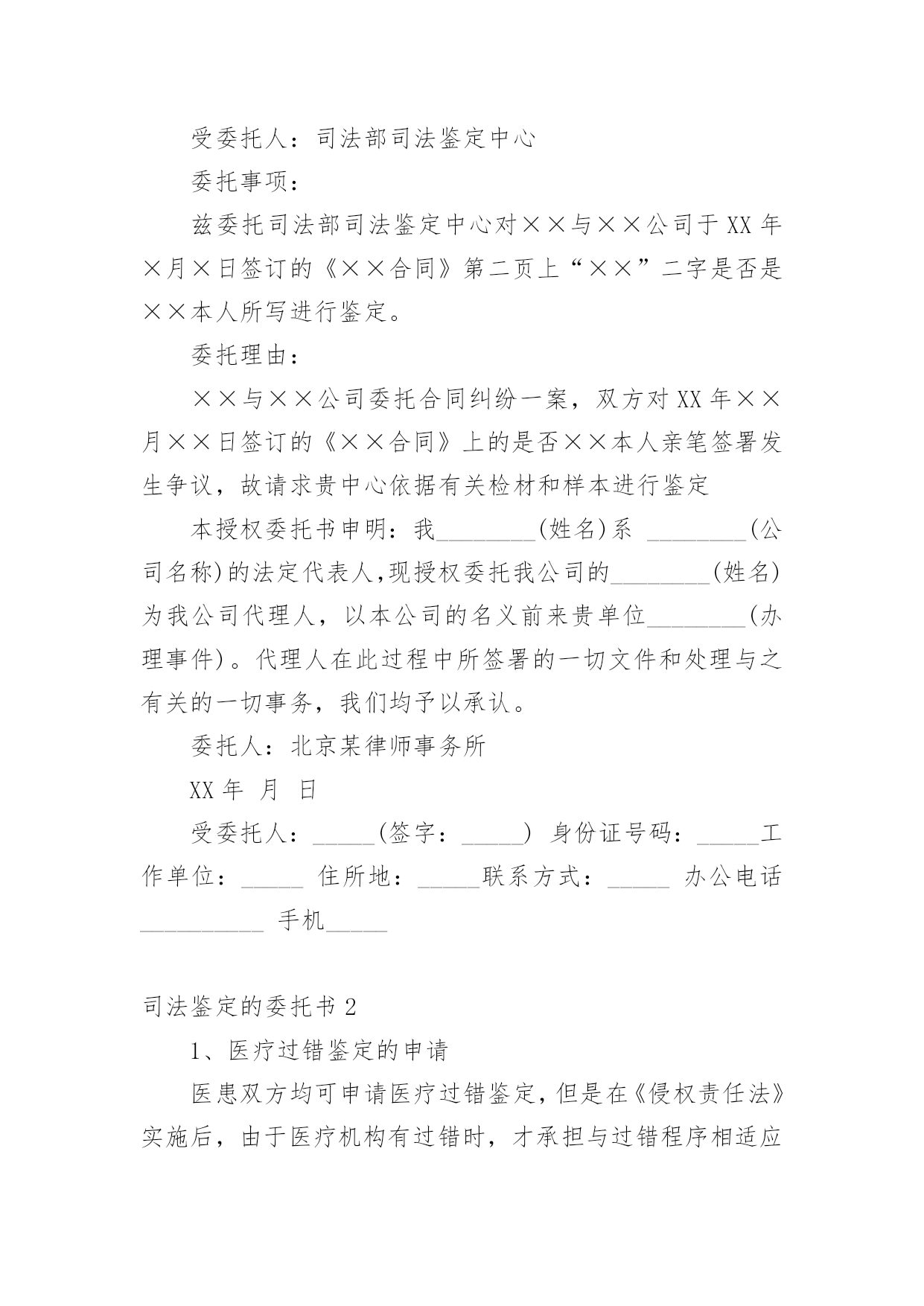 司法鉴定的委托书委托他人代表自己行使自己的合法权益,被委托人在行使权力时需出具委托人的法律文书叫委托书。在不断进步的时代,委托书在处理事务上使用的情况越来越多,写起委托书来就毫无头绪?以下是小编为大家整理的司法鉴定的委托书,欢迎阅读与收藏。司法鉴定的委托书1委托人:北京某律师事务所住址:***电话:******律师我单位因业务需要,现委托作为我单位合法委托代理单位,授权其代表我单位与贵公司进行代收款工作。在代收款过程中,该代理单位的一切行为,均代表本单位。委托方:____________受托方:_______________身份证号码:_______________委托方因业务需要,特委托__________在其与__________(付款单位)的业务往来中,作为_____(款项)的收款代理人。代收金额:人民币_____拾_____万_____仟_____佰_____拾_____元_____角_____分(¥_____)。付款单位对以下受托方账号的付款行为即视为向委托方完成付款。委托方委托收款行为所引起的一切经济及法律责任与付款单位无关。受委托人:司法部司法鉴定中心委托事项:兹委托司法部司法鉴定中心对××与××公司于XX年×月×日签订的《××合同》第二页上“××”二字是否是××本人所写进行鉴定。委托理由:××与××公司委托合同纠纷一案,双方对XX年××月××日签订的《××合同》上的是否××本人亲笔签署发生争议,故请求贵中心依据有关检材和样本进行鉴定本授权委托书申明:我________(姓名)系________(公司名称)的法定代表人,现授权委托我公司的________(姓名)为我公司代理人,以本公司的名义前来贵单位________(办理事件)。代理人在此过程中所签署的一切文件和处理与之有关的一切事务,我们均予以承认。委托人:北京某律师事务所XX年月日受委托人:_____(签字:_____)身份证号码:_____工作单位:_____住所地:_____联系方式:_____办公电话__________手机_____司法鉴定的委托书21、医疗过错鉴定的申请医患双方均可申请医疗过错鉴定,但是在《侵权责任法》实施后,由于医疗机构有过错时,才承担与过错程序相适应的赔偿责任,举证责任由患方来承担。在发生医疗纠纷时,患方如果不能证明医疗机构有过错,医疗机构不承担赔偿责任。因此,医疗过错鉴定往往由患方提出申请。2、鉴定材料的质证患方提出医疗过错鉴定后,要向法院提交证明医疗机构有过错的鉴定材料;医疗机构也可以提出证据证明医疗机构无过错。材料提交法院后,法院会确定一个时间由双方来质证。质证时,双方主要对材料的真实性表示有无异议,至于其证明力无需辩论。3、鉴定机构的选择法院将材料移交技术科后,技术科会确定一个时间由医患双方共同挑选一个司法鉴定机构进行医疗过错鉴定。如果医患双方不能达成一致意见,可以通过抽签、摇号的方式来决定鉴定机构。4、鉴定前的听证法院技术科选定鉴定机构后,会将鉴定材料移送鉴定机构,鉴定机构接到鉴定材料后通过审查决定是否受理。鉴定机构决定受理后,在鉴定前会组织医患双方听证会,由医患双方提交材料陈述各自意见。5、鉴定材料的补充鉴定机构在鉴定过程中,如果认为双方所提交的材料有所遗漏的,可以通知法院要求医患双方提交鉴定所需要的补充材料。法院会通知医患双方提交鉴定所需补充材料,然后经质证后的材料移交技术科,由技术科移送鉴定机构。6、鉴定结果的出具鉴定机构根据医患双方所提交的材料和陈述,组织专家进行鉴定,然后出具司法鉴定书载明医疗机构是否有过错及过错参与度。7、补充鉴定的情况如果在鉴定的过程中,有下列情形之一的,司法鉴定机构可以根据委托人的请求进行补充鉴定:(一)委托人增加新的鉴定要求的;(二)委托人发现委托的鉴定事项有遗漏的;(三)委托人在鉴定过程中又提供或者补充了新的鉴定材料的;(四)其他需要补充鉴定的情形。补充鉴定是原委托鉴定的组成部分、是对原司法鉴定结论的补充。与原鉴定结论具有同等的法律效力。如果对鉴定结论不服的应当重新申请鉴定,不能够通过补充鉴定达到重新鉴定的目的。8、重新鉴定的情况有下列情形之一的,司法鉴定机构可以接受委托进行重新鉴定:(一)原司法鉴定人不具有从事原委托事项鉴定执业资格的;(二)原司法鉴定机构超出登记的业务范围组织鉴定的;(三)原司法鉴定人按规定应当回避没有回避的;(四)委托人或者其他诉讼当事人对原鉴定意见有异议,并能提出合法依据和合理理由的;(五)法律规定或者人民法院认为需要重新鉴定的其他情形。司法鉴定的委托书3委托人:___________住址:___________电话:___________受委托人:委托事项:兹委托司法部司法鉴定中心对___________与___________公司于20________