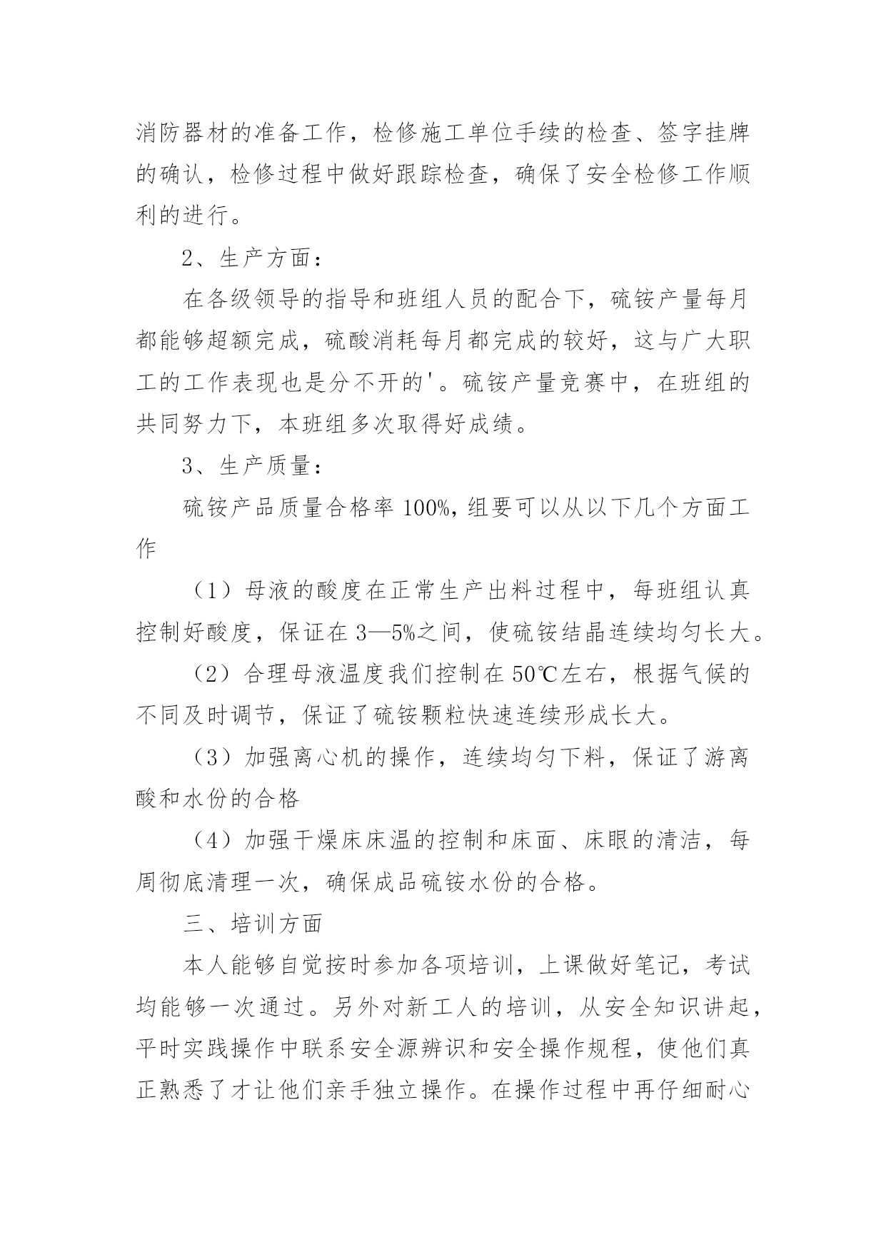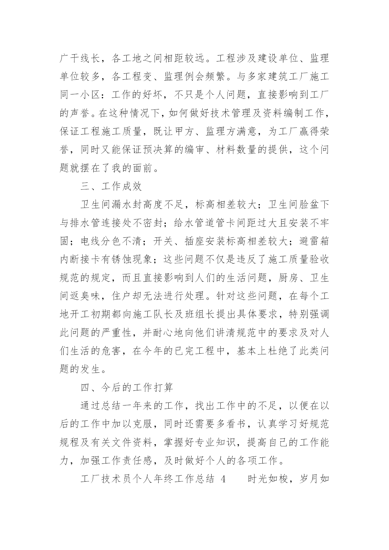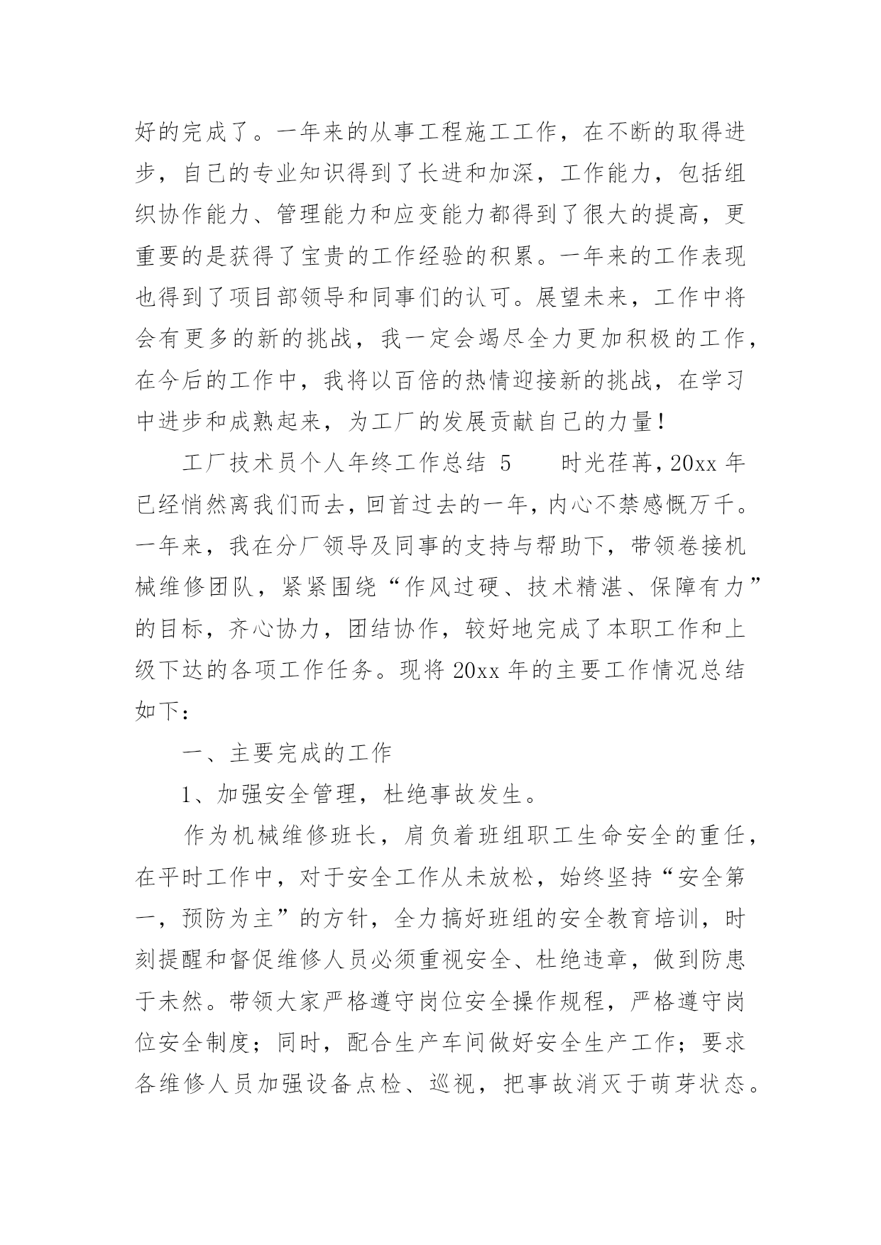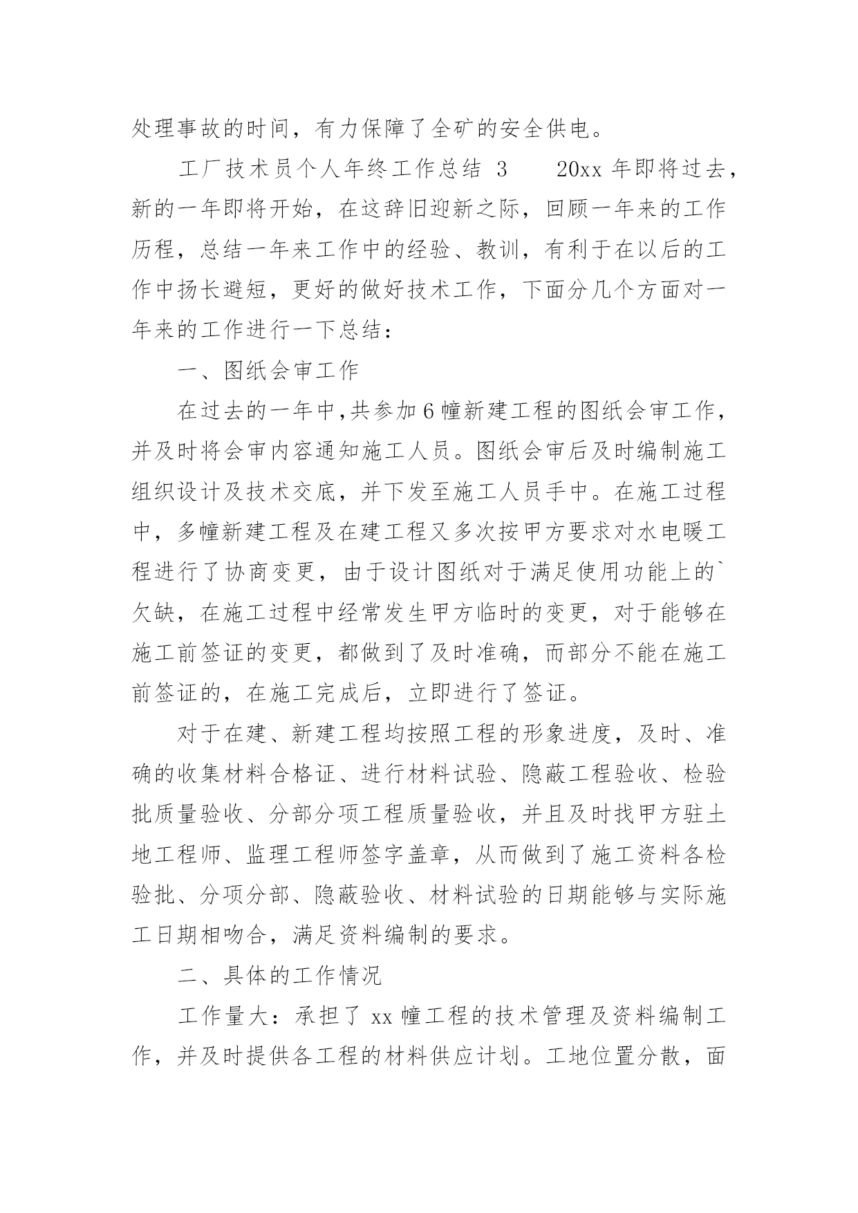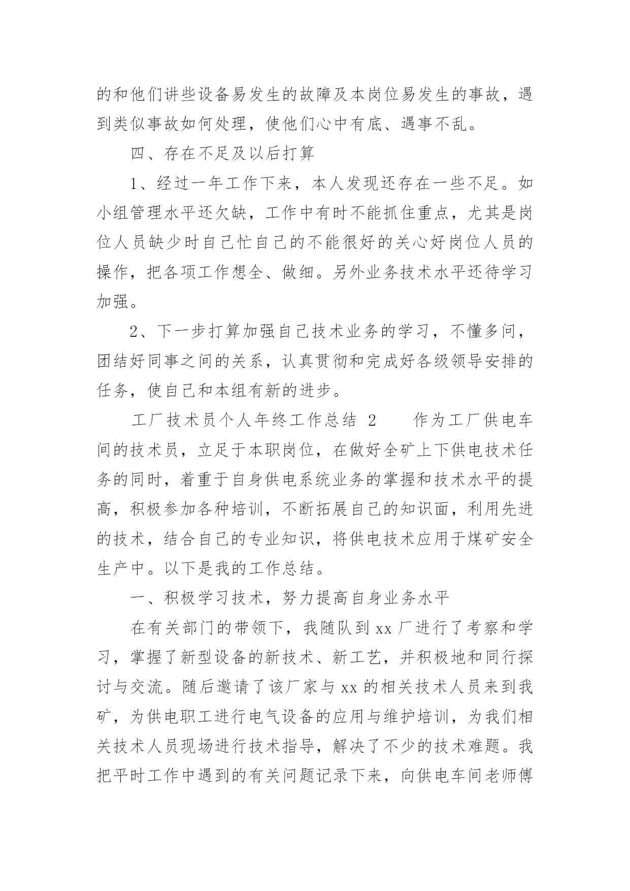 工厂技术员个人年终工作总结工厂技术员个人年终工作总结(精选18篇)总结是事后对某一阶段的学习或工作情况作加以回顾检查并分析评价的书面材料,它可以使我们更有效率,为此要我们写一份总结。那么我们该怎么去写总结呢?以下是小编整理的工厂技术员个人年终工作总结,欢迎大家分享。工厂技术员个人年终工作总结1转眼20xx年即将过去,回忆即将过去的一年个人的工作,学习了一些新知识,同时发现了一些不足,现将主要工作总结如下:一、劳动纪律,思想作风方面本人能遵守好xx的各项规章制度,按时上下班,无迟到、早退现象。班中不做与工作无关的事严格按照操作规程操作,团结好同事,相互关心并认真贯彻和执行好上级领导的有关文件精神和要求,自觉维护好企业形象。二、安全生产方面1、安全方面:本人上班前能够自觉的穿戴好劳保用品,认真参加各项安全培训,做好笔记。牢固树立起“安全第一,预防为主”的思想,并认真贯彻到每位组员,真正做到生产在忙安全不忘。从而保证了本组各类安全事故为“零”,在1—10月份本班组涉及到危险、一级动火作业几十起,如在焊接满流槽,离心机回流管、结晶槽补焊、母液储槽补焊等,在每次检修前都能做好安全检修工作的准备工作,如个槽的清扫工作,消防器材的准备工作,检修施工单位手续的检查、签字挂牌的确认,检修过程中做好跟踪检查,确保了安全检修工作顺利的进行。2、生产方面:在各级领导的指导和班组人员的配合下,硫铵产量每月都能够超额完成,硫酸消耗每月都完成的较好,这与广大职工的工作表现也是分不开的'。硫铵产量竞赛中,在班组的共同努力下,本班组多次取得好成绩。3、生产质量:硫铵产品质量合格率100%,组要可以从以下几个方面工作(1)母液的酸度在正常生产出料过程中,每班组认真控制好酸度,保证在3—5%之间,使硫铵结晶连续均匀长大。(2)合理母液温度我们控制在50℃左右,根据气候的不同及时调节,保证了硫铵颗粒快速连续形成长大。(3)加强离心机的操作,连续均匀下料,保证了游离酸和水份的合格(4)加强干燥床床温的控制和床面、床眼的清洁,每周彻底清理一次,确保成品硫铵水份的合格。三、培训方面本人能够自觉按时参加各项培训,上课做好笔记,考试均能够一次通过。另外对新工人的培训,从安全知识讲起,平时实践操作中联系安全源辨识和安全操作规程,使他们真正熟悉了才让他们亲手独立操作。在操作过程中再仔细耐心的和他们讲些设备易发生的故障及本岗位易发生的事故,遇到类似事故如何处理,使他们心中有底、遇事不乱。四、存在不足及以后打算1、经过一年工作下来,本人发现还存在一些不足。如小组管理水平还欠缺,工作中有时不能抓住重点,尤其是岗位人员缺少时自己忙自己的不能很好的关心好岗位人员的操作,把各项工作想全、做细。另外业务技术水平还待学习加强。2、下一步打算加强自己技术业务的学习,不懂多问,团结好同事之间的关系,认真贯彻和完成好各级领导安排的任务,使自己和本组有新的进步。工厂技术员个人年终工作总结2作为工厂供电车间的技术员,立足于本职岗位,在做好全矿上下供电技术任务的同时,着重于自身供电系统业务的掌握和技术水平的提高,积极参加各种培训,不断拓展自己的知识面,利用先进的技术,结合自己的专业知识,将供电技术应用于煤矿安全生产中。以下是我的工作总结。一、积极学习技术,努力提高自身业务水平在有关部门的带领下,我随队到xx厂进行了考察和学习,掌握了新型设备的新技术、新工艺,并积极地和同行探讨与交流。随后邀请了该厂家与xx的相关技术人员来到我矿,为供电职工进行电气设备的应用与维护培训,为我们相关技术人员现场进行技术指导,解决了不少的技术难题。我把平时工作中遇到的有关问题记录下来,向供电车间老师傅们求教,直至弄明白为止。每当厂家相关技术人员来矿解决设备大的故障时,我更积极向他们进行请教。在不断地学习和实践中,我逐步的熟悉了井下供电系统和高低压设备的应用,提高了自己的业务水平。二、合理供电系统设计,科学编制技术措施在分管供电科长的指导下,我逐渐进行各采区工作面的.供电系统设计。由于对工作面及其机械设备不熟悉,为合理的布置高低压电缆线路的走向,我经常跑现场,测量距离,科学整定计算,合理选择电气设备和电缆型号,不仅满足实际需要,还能节省不少人力物力。三、安全质量标准化,工作任务显成效为贯彻落实矿下达的质量标准化工作,针对供电班组对井下主要巷道及变电所的电缆按标准化要求进行整理吊挂的情况,提出合理化建议,并制定科学的安全施工技术措施。四、做好本职工作,提高职工技能水平在日常工作中,我针对井上、下高低压供电系统有变动的地方及时对供电系统图进行修改,可以随时了解各变电所所带负荷,并负责对井下远程监控系统的维护。同时,我对矿井的高压继电保护装置的整定参数进行了重新计算和对井下高低压电缆统计。在系统领导的指导下,不定期地组织电工进行技能培