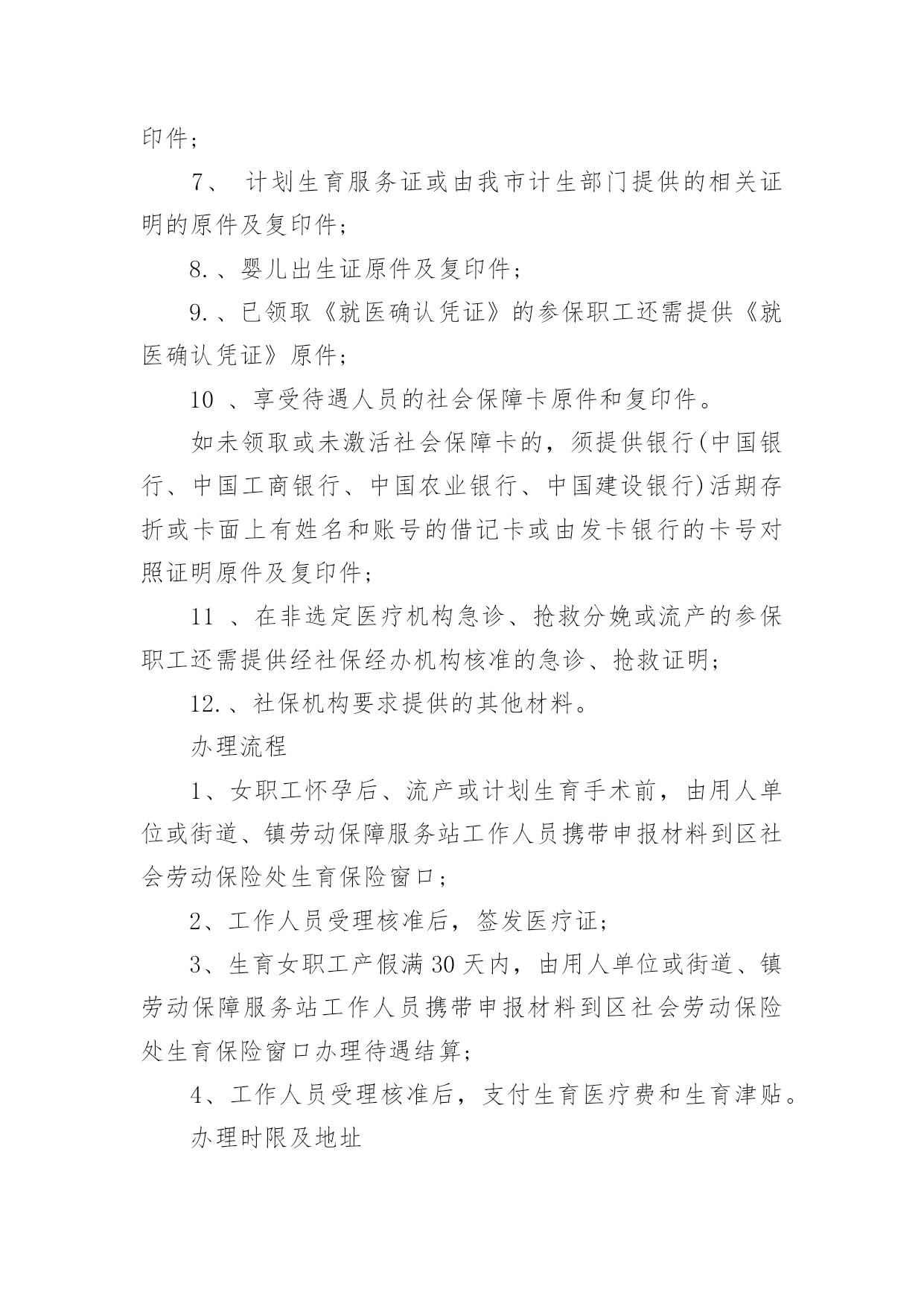 日照生育保险报销条件日照生育保险报销条件生育保险,是国家给我们设定的一种保险制度,这是我为大家带来的日照生育保险报销条件,希望对大家有所帮助。日照生育保险报销条件报销标准1、生育保险基金以生育津贴形式对单位予以补偿补偿标准为:女职工妊娠7个月(含7个月)以上顺产分娩或妊娠不足7个月早产的,享受3个月的生育津贴;难产及实施剖宫产手术的,增加半个月的生育津贴,多胞胎生育的,每多生一个婴儿,增加半个月的生育津贴;妊娠3个月(含3个月)以上、7个月以下流产、引产的,享受1个半月的生育津贴,妊娠3个月以内因病理原因流产的,享受1个月的生育津贴。生育津贴以女职工产前或计划生育手术前12个月的生育保险月平均缴费工资为计发基数。2、生育营养补贴与围产保健补贴凡符合享受国家规定90天(含90天)以上产假的生育女职工可享受生育营养补贴300元、围产保健补贴700元。3、一次性生育补贴原在单位参加生育保险的女职工失业后,在领取失业保险金期间,符合计划生育规定生育时,可享受一次性生育补贴。一次性生育补贴:流产400元、顺产2400元、难产和多胞胎生育4000元,对参加生育保险的男职工,其配偶未列入生育保险范围,符合计划生育规定生育第一胎时,可享受50%的一次性生育补贴。4、职工产假津贴生育津贴补偿到单位,参保女职工产假期间本人基本工资、奖金及福利费由单位照发。5、计划生育手术费包括因计划生育需要,实施放置(取出)宫内节育器、流产术、引产术、皮埋术、绝育及复通手术所发生的费用,列入生育保险基金结付范围。报销条件职工享受生育保险待遇,应当同时具备下列条件:1、用人单位为职工累计缴费满1年以上,并且继续为其缴费;2、符合国家和省人口与计划生育规定。报销材料1、享受待遇人员的身份证明原件及复印件;2、代办人身份证原件及复印件;3、财税部门印制的加盖医疗机构财务印章的医疗费用专用收据或发票原件;4、与收据(发票)金额及日期相符的.医疗费用明细清单原件;5、加盖医疗机构印章的疾病诊断证明原件;6、加盖医疗机构印章的出院小结或门诊病历原件及复印件;7、计划生育服务证或由我市计生部门提供的相关证明的原件及复印件;8.、婴儿出生证原件及复印件;9.、已领取《就医确认凭证》的参保职工还需提供《就医确认凭证》原件;10、享受待遇人员的社会保障卡原件和复印件。如未领取或未激活社会保障卡的,须提供银行(中国银行、中国工商银行、中国农业银行、中国建设银行)活期存折或卡面上有姓名和账号的借记卡或由发卡银行的卡号对照证明原件及复印件;11、在非选定医疗机构急诊、抢救分娩或流产的参保职工还需提供经社保经办机构核准的急诊、抢救证明;12.、社保机构要求提供的其他材料。办理流程1、女职工怀孕后、流产或计划生育手术前,由用人单位或街道、镇劳动保障服务站工作人员携带申报材料到区社会劳动保险处生育保险窗口;2、工作人员受理核准后,签发医疗证;3、生育女职工产假满30天内,由用人单位或街道、镇劳动保障服务站工作人员携带申报材料到区社会劳动保险处生育保险窗口办理待遇结算;4、工作人员受理核准后,支付生育医疗费和生育津贴。办理时限及地址办理时限:15个工作日办理地址:日照市社会保障局地址:日照市北京路128号劳动大厦电话:0633-12333东港区社会保障局地址:兴海路50-1号电话:0633-3663333岚山区社会保障局地址:日照市岚山区岚山中路电话:0633-2611153五莲县社会保障局地址:五莲县城富强路218号电话:0633-7986001莒县社会保障局地址:莒县城区振兴东路59号电话:0633-6222475