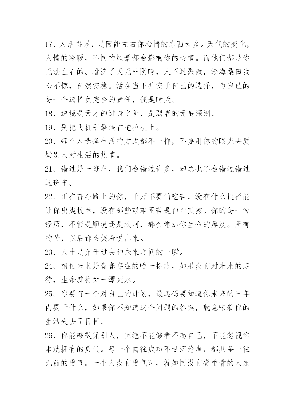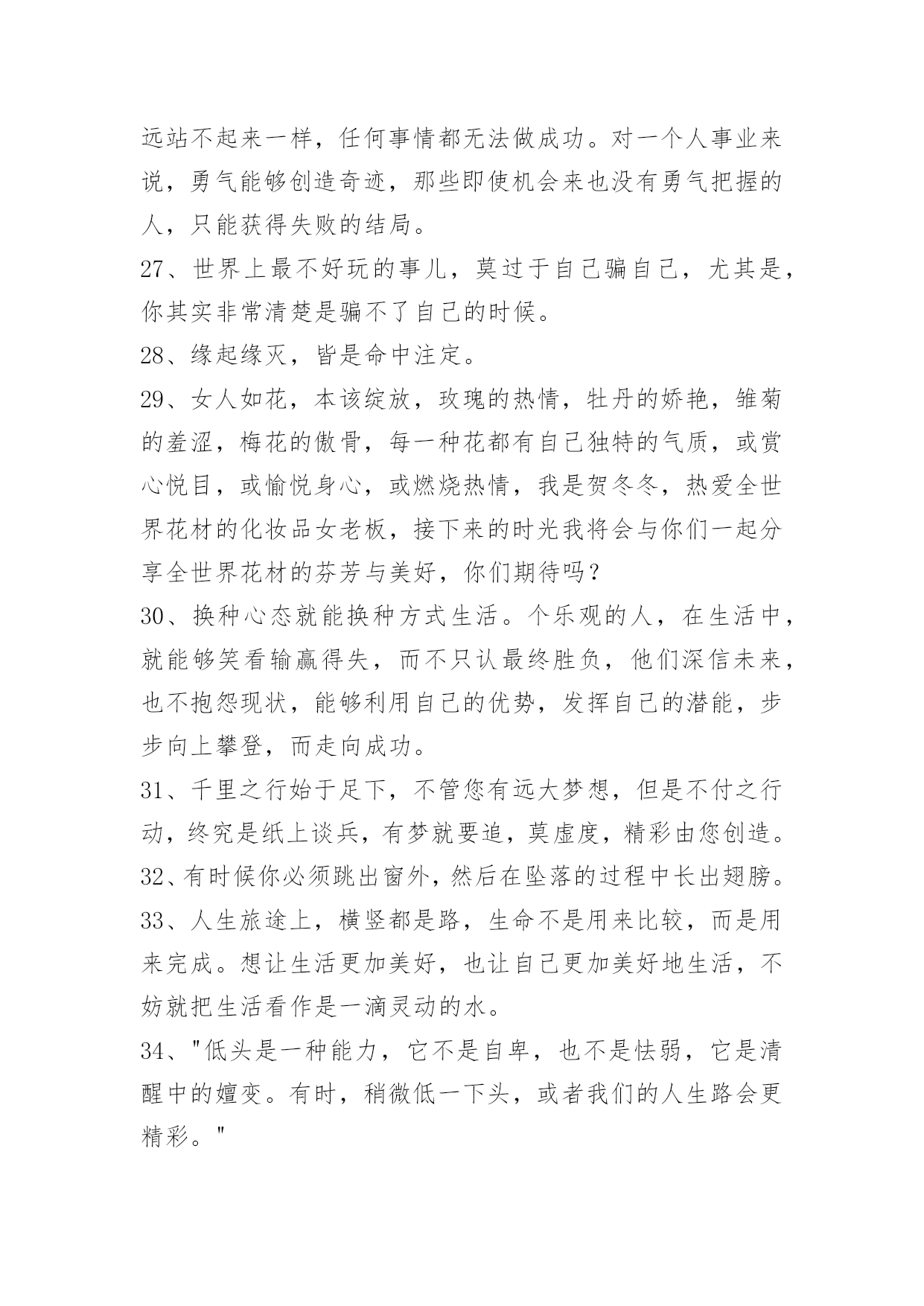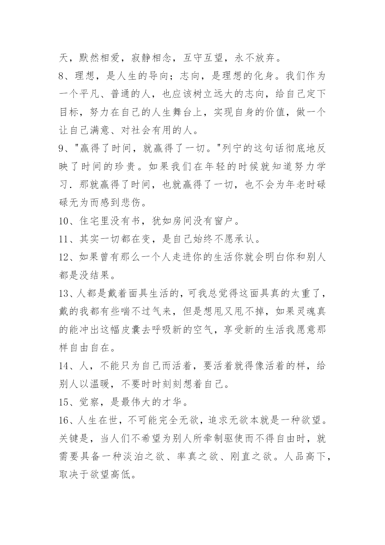 人生感悟短句50条【必备】2022年人生感悟短句锦集50条我的世界我做主,我的梦想我追逐,我的明天我守护,我的永远是幸福。以下是小编为大家整理推荐的人生感悟短句50条,欢迎阅读,希望能够对大家有所帮助。1、奇怪的是,佛陀不化妆、不整容、不吃营养补品,每天只吃两顿饭,过了午时便不再进食,吃的东西毫不讲究,施主给什么就吃什么,或精致或粗劣,从不挑剔;有时参禅打坐,几天只吃一顿饭,一般人过这样的日子,必然营养不良、身体消瘦、肤色枯干,佛陀为什么能身具"八十种好"呢?因为美化形象的最好办法不是物质方法而是精神方法,而且方法非常简单,只需看空过去、未来,"于现前而活",心里的杂念少了,烦恼没有了,自然"肤色清润",年轻时固然青春俊美,年老了也"妙相端庄",男为漂亮老先生,女为美貌老太太。2、能驾驭你的人,都是你心甘情愿,视如生命爱的人。3、亚伯拉罕·林肯说:"只要心里想着快乐,绝大部分人都能如愿以偿。"要养成快乐的习惯,就要善于调整自己的心态。首先,我们可以拟定一份有关快乐心情想法的清单,然后,利用每天的闲暇时间来想这些快乐的事,如果中途有悲观、消沉的想法进入大脑,要立即将其摒除掉,让快乐的念头时刻围绕着我们。另外,每天早晨睁开眼时,不妨在床上舒畅地想想快乐的事情,同时在脑海中描绘一下,今天还要做哪些快乐的事。4、我看见你就想笑。寒窗数载,你鼻梁上的眼镜也不断升级。同学们几次郊游,忘情于青山绿水,你却总是画地为牢,隔岸观望。冲出小天地吧,学习之余应有自己五彩缤纷的生活。希望有一天,你能摘下眼镜,与大家一起开怀大笑。5、你遇见一个人。你喜欢他。你把他放在心上,却不必为他牵挂。因为他是他而你是你。因为他有他的天空而你有你的海洋。因为心灵相依的两个人本来就不必时时刻刻在一起。因为想念着他的你本来就应该给他也想念你的距离。许多时候,你需要他的来临。却也有许多时候,你更需要他的缺席。当你们在一起的时候,只需要单纯地感觉那份明净美好。当你们不在一起的时候,就让穿过天堂的风在你们之间穿梭舞蹈。6、幸福的底线其实就是不贪婪,我们不必去作那些无意义的假设,也不必去奢求那些不切实际的幻想。常常心存感激,感激那些带给我们快乐的人,哪怕那种快乐只有一丁点,只是极短暂的一瞬。想要很多很多幸福的时候,我们往往因为贪婪而得不到幸福。当我们不那么贪得无厌的时候,幸福就是一个天使,他会时常陪伴我们的左右,甚至陪伴我们一生。如果给幸福画一道浅浅的底线,那就是拥有健康的身体和心理。7、落红尘,花事迷离,爱情的种种,不可胜数,有的相濡以沫共白首终成正果,有的相忘江湖陌路天涯不再有瓜葛,有的痛不欲生爱恨情仇牵扯不清,有的只便你若安好便是晴天,默然相爱,寂静相念,互守互望,永不放弃。8、理想,是人生的导向;志向,是理想的化身。我们作为一个平凡、普通的人,也应该树立远大的志向,给自己定下目标,努力在自己的人生舞台上,实现自身的价值,做一个让自己满意、对社会有用的人。9、"赢得了时间,就赢得了一切。"列宁的这句话彻底地反映了时间的珍贵。如果我们在年轻的时候就知道努力学习.那就赢得了时间,也就赢得了一切,也不会为年老时碌碌无为而感到悲伤。10、住宅里没有书,犹如房间没有窗户。11、其实一切都在变,是自己始终不愿承认。12、如果曾有那么一个人走进你的生活你就会明白你和别人都是没结果。13、人都是戴着面具生活的,可我总觉得这面具真的太重了,戴的我都有些喘不过气来,但是想甩又甩不掉,如果灵魂真的能冲出这幅皮囊去呼吸新的空气,享受新的生活我愿意那样自由自在。14、人,不能只为自己而活着,要活着就得像活着的样,给别人以温暖,不要时时刻刻想着自己。15、觉察,是最伟大的才华。16、人生在世,不可能完全无欲,追求无欲本就是一种欲望。关键是,当人们不希望为别人所牵制驱使而不得自由时,就需要具备一种淡泊之欲、率真之欲、刚直之欲。人品高下,取决于欲望高低。17、人活得累,是因能左右你心情的东西太多。天气的变化,人情的冷暖,不同的风景都会影响你的心情。而他们都是你无法左右的。看淡了天无非阴晴,人不过聚散,沧海桑田我心不惊,自然安稳。活在当下并安于自已的选择,为自已的每一个选择负完全的责任,便是晴天。18、逆境是天才的进身之阶,是弱者的无底深渊。19、别把飞机引擎装在拖拉机上。20、每个人选择生活的方式都不一样,不要用你的眼光去质疑别人对生活的热情。21、错过是一班车,我们会错过许多,却总也不会错过错过这班车。22、正在奋斗路上的你,千万不要怕吃苦。没有什么捷径能让你出类拔萃,没有那些艰难困苦是白白煎熬。你的每一份经历,不管是顺境还是坎坷,都会增加你生命的厚度。所有的苦,以后都会笑着说出来。23、人生是介于过去和未来之间的一瞬。24、相信未来是青春存在的唯一标志,如果没有对未来的期待,生命就将如一潭死水。