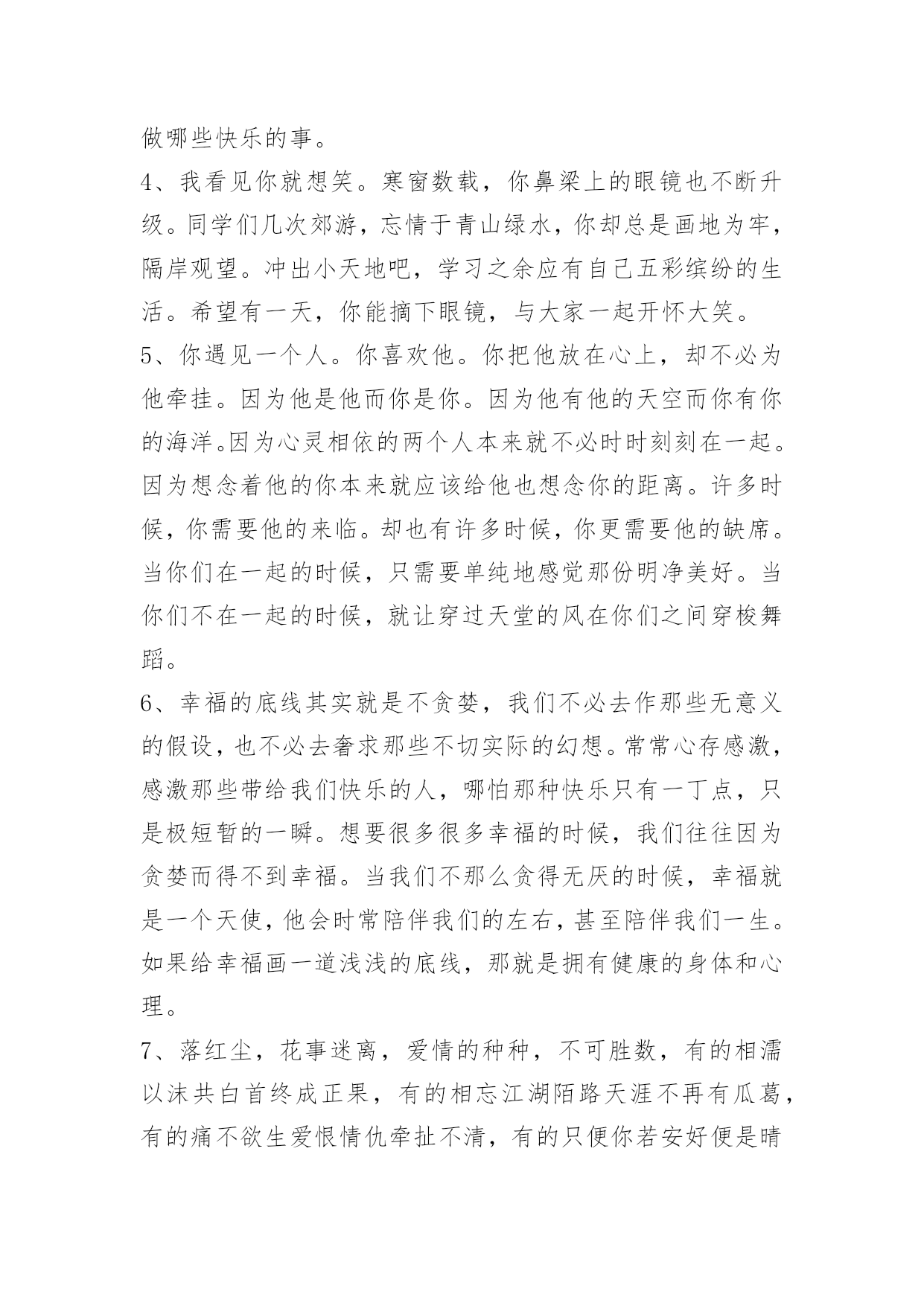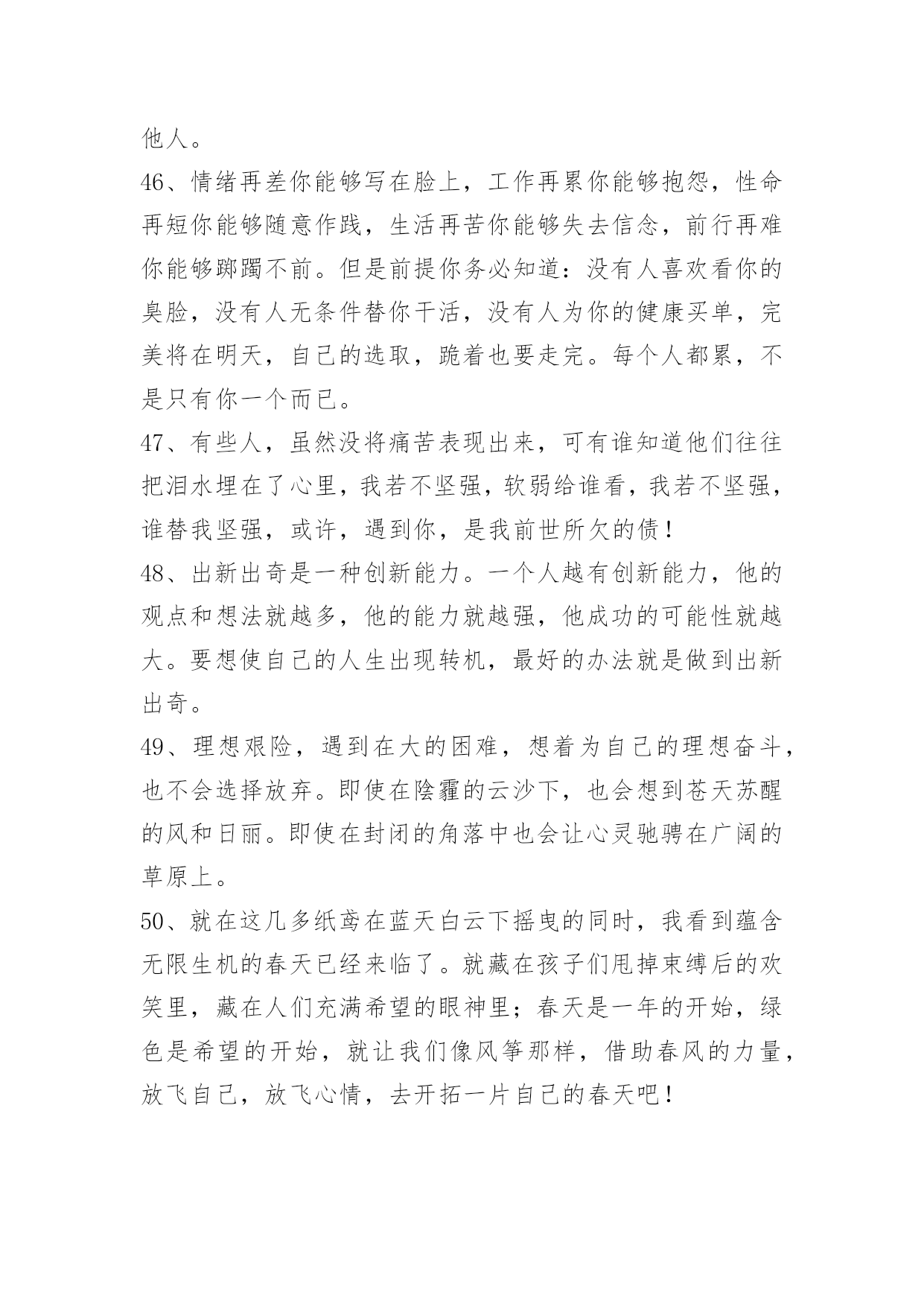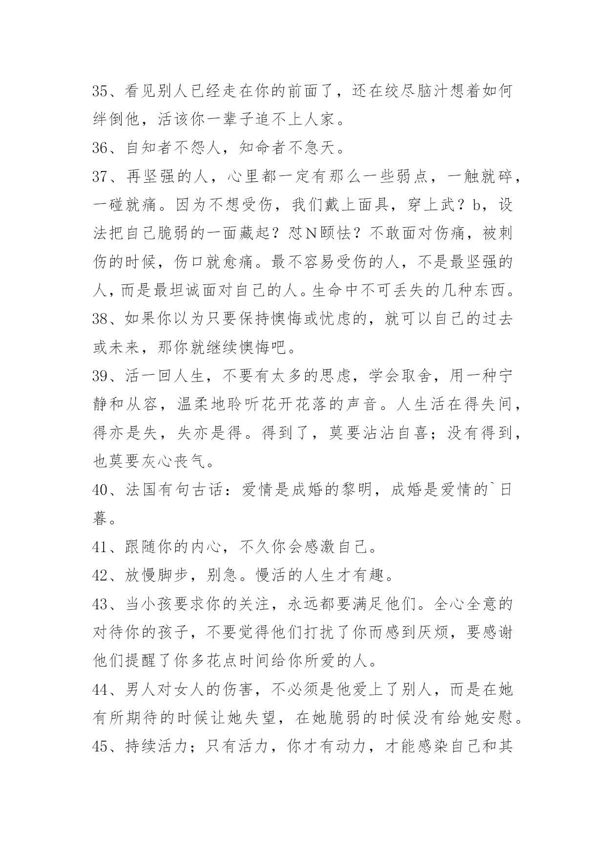 人生感悟短句50条【必备】2022年人生感悟短句锦集50条我的世界我做主,我的梦想我追逐,我的明天我守护,我的永远是幸福。以下是小编为大家整理推荐的人生感悟短句50条,欢迎阅读,希望能够对大家有所帮助。1、奇怪的是,佛陀不化妆、不整容、不吃营养补品,每天只吃两顿饭,过了午时便不再进食,吃的东西毫不讲究,施主给什么就吃什么,或精致或粗劣,从不挑剔;有时参禅打坐,几天只吃一顿饭,一般人过这样的日子,必然营养不良、身体消瘦、肤色枯干,佛陀为什么能身具"八十种好"呢?因为美化形象的最好办法不是物质方法而是精神方法,而且方法非常简单,只需看空过去、未来,"于现前而活",心里的杂念少了,烦恼没有了,自然"肤色清润",年轻时固然青春俊美,年老了也"妙相端庄",男为漂亮老先生,女为美貌老太太。2、能驾驭你的人,都是你心甘情愿,视如生命爱的人。3、亚伯拉罕·林肯说:"只要心里想着快乐,绝大部分人都能如愿以偿。"要养成快乐的习惯,就要善于调整自己的心态。首先,我们可以拟定一份有关快乐心情想法的清单,然后,利用每天的闲暇时间来想这些快乐的事,如果中途有悲观、消沉的想法进入大脑,要立即将其摒除掉,让快乐的念头时刻围绕着我们。另外,每天早晨睁开眼时,不妨在床上舒畅地想想快乐的事情,同时在脑海中描绘一下,今天还要做哪些快乐的事。4、我看见你就想笑。寒窗数载,你鼻梁上的眼镜也不断升级。同学们几次郊游,忘情于青山绿水,你却总是画地为牢,隔岸观望。冲出小天地吧,学习之余应有自己五彩缤纷的生活。希望有一天,你能摘下眼镜,与大家一起开怀大笑。5、你遇见一个人。你喜欢他。你把他放在心上,却不必为他牵挂。因为他是他而你是你。因为他有他的天空而你有你的海洋。因为心灵相依的两个人本来就不必时时刻刻在一起。因为想念着他的你本来就应该给他也想念你的距离。许多时候,你需要他的来临。却也有许多时候,你更需要他的缺席。当你们在一起的时候,只需要单纯地感觉那份明净美好。当你们不在一起的时候,就让穿过天堂的风在你们之间穿梭舞蹈。6、幸福的底线其实就是不贪婪,我们不必去作那些无意义的假设,也不必去奢求那些不切实际的幻想。常常心存感激,感激那些带给我们快乐的人,哪怕那种快乐只有一丁点,只是极短暂的一瞬。想要很多很多幸福的时候,我们往往因为贪婪而得不到幸福。当我们不那么贪得无厌的时候,幸福就是一个天使,他会时常陪伴我们的左右,甚至陪伴我们一生。如果给幸福画一道浅浅的底线,那就是拥有健康的身体和心理。7、落红尘,花事迷离,爱情的种种,不可胜数,有的相濡以沫共白首终成正果,有的相忘江湖陌路天涯不再有瓜葛,有的痛不欲生爱恨情仇牵扯不清,有的只便你若安好便是晴天,默然相爱,寂静相念,互守互望,永不放弃。8、理想,是人生的导向;志向,是理想的化身。我们作为一个平凡、普通的人,也应该树立远大的志向,给自己定下目标,努力在自己的人生舞台上,实现自身的价值,做一个让自己满意、对社会有用的人。9、"赢得了时间,就赢得了一切。"列宁的这句话彻底地反映了时间的珍贵。如果我们在年轻的时候就知道努力学习.那就赢得了时间,也就赢得了一切,也不会为年老时碌碌无为而感到悲伤。10、住宅里没有书,犹如房间没有窗户。11、其实一切都在变,是自己始终不愿承认。12、如果曾有那么一个人走进你的生活你就会明白你和别人都是没结果。13、人都是戴着面具生活的,可我总觉得这面具真的太重了,戴的我都有些喘不过气来,但是想甩又甩不掉,如果灵魂真的能冲出这幅皮囊去呼吸新的空气,享受新的生活我愿意那样自由自在。14、人,不能只为自己而活着,要活着就得像活着的样,给别人以温暖,不要时时刻刻想着自己。15、觉察,是最伟大的才华。16、人生在世,不可能完全无欲,追求无欲本就是一种欲望。关键是,当人们不希望为别人所牵制驱使而不得自由时,就需要具备一种淡泊之欲、率真之欲、刚直之欲。人品高下,取决于欲望高低。17、人活得累,是因能左右你心情的东西太多。天气的变化,人情的冷暖,不同的风景都会影响你的心情。而他们都是你无法左右的。看淡了天无非阴晴,人不过聚散,沧海桑田我心不惊,自然安稳。活在当下并安于自已的选择,为自已的每一个选择负完全的责任,便是晴天。18、逆境是天才的进身之阶,是弱者的无底深渊。19、别把飞机引擎装在拖拉机上。20、每个人选择生活的方式都不一样,不要用你的眼光去质疑别人对生活的热情。21、错过是一班车,我们会错过许多,却总也不会错过错过这班车。22、正在奋斗路上的你,千万不要怕吃苦。没有什么捷径能让你出类拔萃,没有那些艰难困苦是白白煎熬。你的每一份经历,不管是顺境还是坎坷,都会增加你生命的厚度。所有的苦,以后都会笑着说出来。23、人生是介于过去和未来之间的一瞬。24、相信未来是青春存在的唯一标志,如果没有对未来的期待,生命就将如一潭死水。
