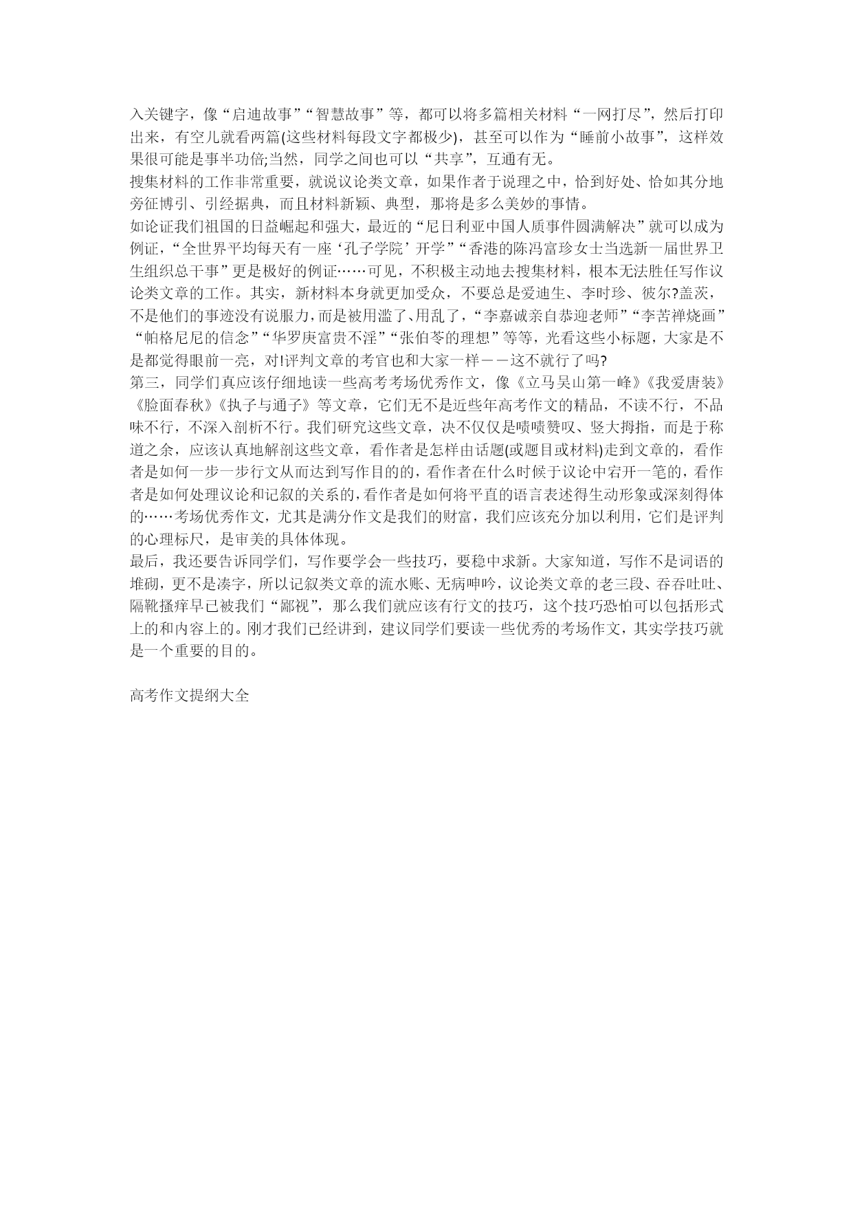 高考作文提纲大全提纲在工作中运用比较普遍,特别是在现在,人们都很繁忙,有时写材料,不把全文写出来,只写一个大体纲要,可以节省不少时间。下面xx给大家分享高考作文提纲大全的内容,希望能够帮助大家,欢迎阅读!高考作文提纲大全编列提纲的具体步骤:第一步要立意。认真审题,仔细研究话题,把头脑中初步的立意写出来的过程,实际上就是对立意锤炼的过程。议论文要明确其中心论点,记叙文要明确其主题思想。第二步要有内容,围绕中心思想,选择自己感受最深的典型材料,尤其是文章的主体部分,要写得完整、精要。第三步要精心构思布局,考虑全文先写什么,后写什么,哪些材料详写,哪些材料略写,怎样开头,怎样结尾等。第四步要有字数上的大体安排。提纲的内容一般应包括文章的中心、重点(主要材料)、材料的组织安排等。不同的文体其构思的方法和侧重点也各有差异。议论文在构思时重在论证结构的安排和论证方法的选择,尤其要尽可能多地联想相关的事实论据和名言警句,以备写作时运用。编列提纲可用五步法:第一步:立论。即在文章开篇首先明确提出论点,给人以论点鲜明的印象。当然,也可以说明论证的背景、缘由等有关前提,通过简单引述,提出论点。第二步:入据。即在上面提出论点后,第一次进入用论据阐述。这一步定位的论据最好选用史实,一般应是较古老的历史论据。有时可以是寓言、传说、历史掌故、名人轶闻轶事等。第三步:结承。即在第二步阐述论据的基础上,进行简要分析,指出其具有的一般意义,进行小结。在此基础上,要随之联系现实生活,对论点加以阐述,承上启下,为下一步论证做准备。第四步:迭据。即在上文小结承转之后,再一次运用现实生活中的事例作论据,进行论证。选用的事例要新,最好是当前媒体中新出现的典型事例。这些论据实际上与第二步中的历史论据形成推进和迭加的关系。这样,一古一今,一旧一新,选择的论据,角度有变化,为论点提供了扎实有效的证明事例。第五步:归纳。在前面双重的事实论据论证的基础上,进行综合分析,以进一步揭示论点在当代的现实意义,或者提出解决问题的思路和方法,对全文加以总结。(本段内容参考“中学语文教学资源网”有关文章)记叙文可以按时间、空间顺序或事情发展变化的过程来安排,先列出中心思想,然后列出各段落的内容要点,人物、时间、地点,主要事件要明确。编列提纲宜简略,只要能体现出文章的思路、所运用的材料及布局、层次的设置、首尾的呼应、详略的安排等内容即可,提纲的语言过于详细则失去了列提纲的价值;而没有提纲则可能会使文章思路不清、中心不明、主次难分、杂乱无章。一句话,编列提纲就是为了定中心、理思路、明主次、选材料、提方法。首先,同学们要问问自己,经过几次月考,在写作上,有没有自己还搞不清的基本概念,是否有一直困扰自己的问题,比如给材料作文中的“材料”在文章中到底怎么应用?比如到底“记叙”和“议论”有什么区别?又如议论文中,记叙这种表达方式该如何摆位……如果有类似问题,一定要想方设法弄明白,这样做是为了避免在考场作文中出现无法挽救的“硬伤”。再有,应该动员一切力量搜集一些写作材料(素材),比如名人逸事、启发故事、智慧故事、感人故事等等,目的是可以在写议论类文章的时候,丰富自己的例证,而不是仅仅停留在所谓的道理论证上;当然,记叙类的文章中,这些材料就可以成为创作的素材、创作原型,为我们的写作增添更多的亮色。这时,同学就问了,怎么能在浩如烟海的资料、信息中迅速搜集、整理写作材料呢?我说了,可以动员一切力量,比如每天抽出15分钟翻翻报纸,一目十行地搜索有写作价值和发挥余地的新闻;或由父母代劳,在互联网上利用搜索引擎,只需键入关键字,像“启迪故事”“智慧故事”等,都可以将多篇相关材料“一网打尽”,然后打印出来,有空儿就看两篇(这些材料每段文字都极少),甚至可以作为“睡前小故事”,这样效果很可能是事半功倍;当然,同学之间也可以“共享”,互通有无。搜集材料的工作非常重要,就说议论类文章,如果作者于说理之中,恰到好处、恰如其分地旁征博引、引经据典,而且材料新颖、典型,那将是多么美妙的事情。如论证我们祖国的日益崛起和强大,最近的“尼日利亚中国人质事件圆满解决”就可以成为例证,“全世界平均每天有一座‘孔子学院’开学”“香港的陈冯富珍女士当选新一届世界卫生组织总干事”更是极好的例证……可见,不积极主动地去搜集材料,根本无法胜任写作议论类文章的工作。其实,新材料本身就更加受众,不要总是爱迪生、李时珍、彼尔?盖茨,不是他们的事迹没有说服力,而是被用滥了、用乱了,“李嘉诚亲自恭迎老师”“李苦禅烧画”“帕格尼尼的信念”“华罗庚富贵不淫”“张伯苓的理想”等等,光看这些小标题,大家是不是都觉得眼前一亮,对!评判文章的考官也和大家一样――这不就行了吗?第三,同学们真应该仔细地读一些高考考场优秀作文,像《立马吴山第一峰》《我