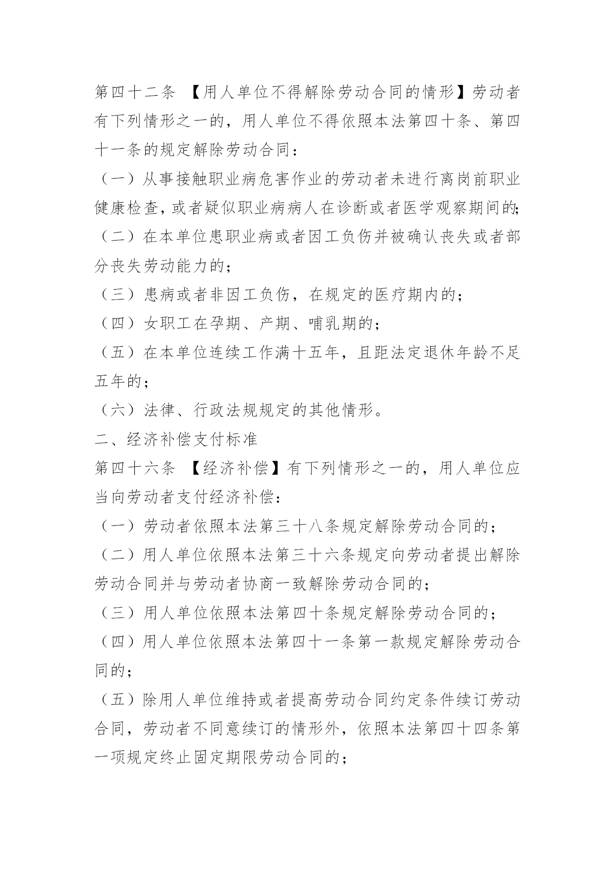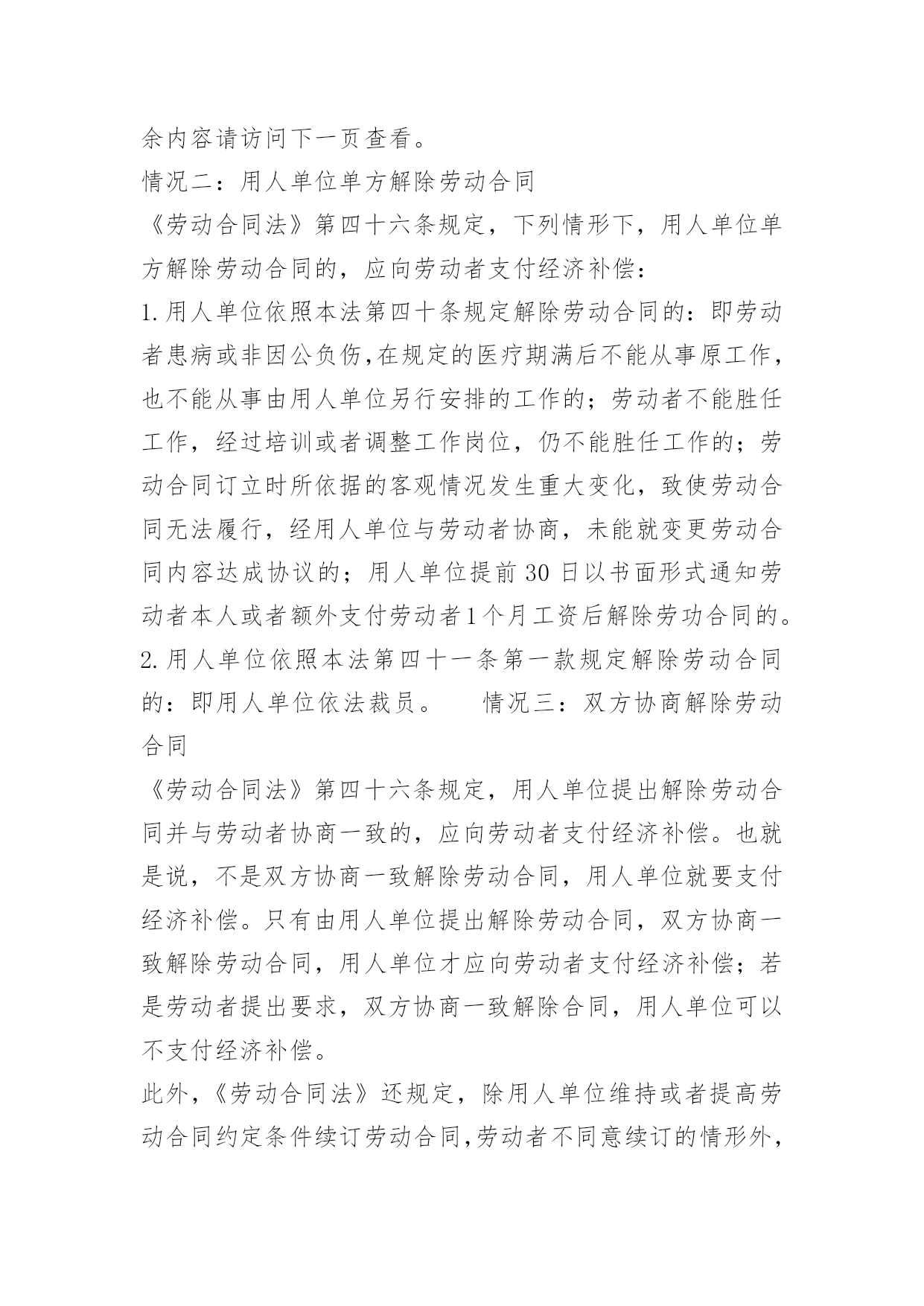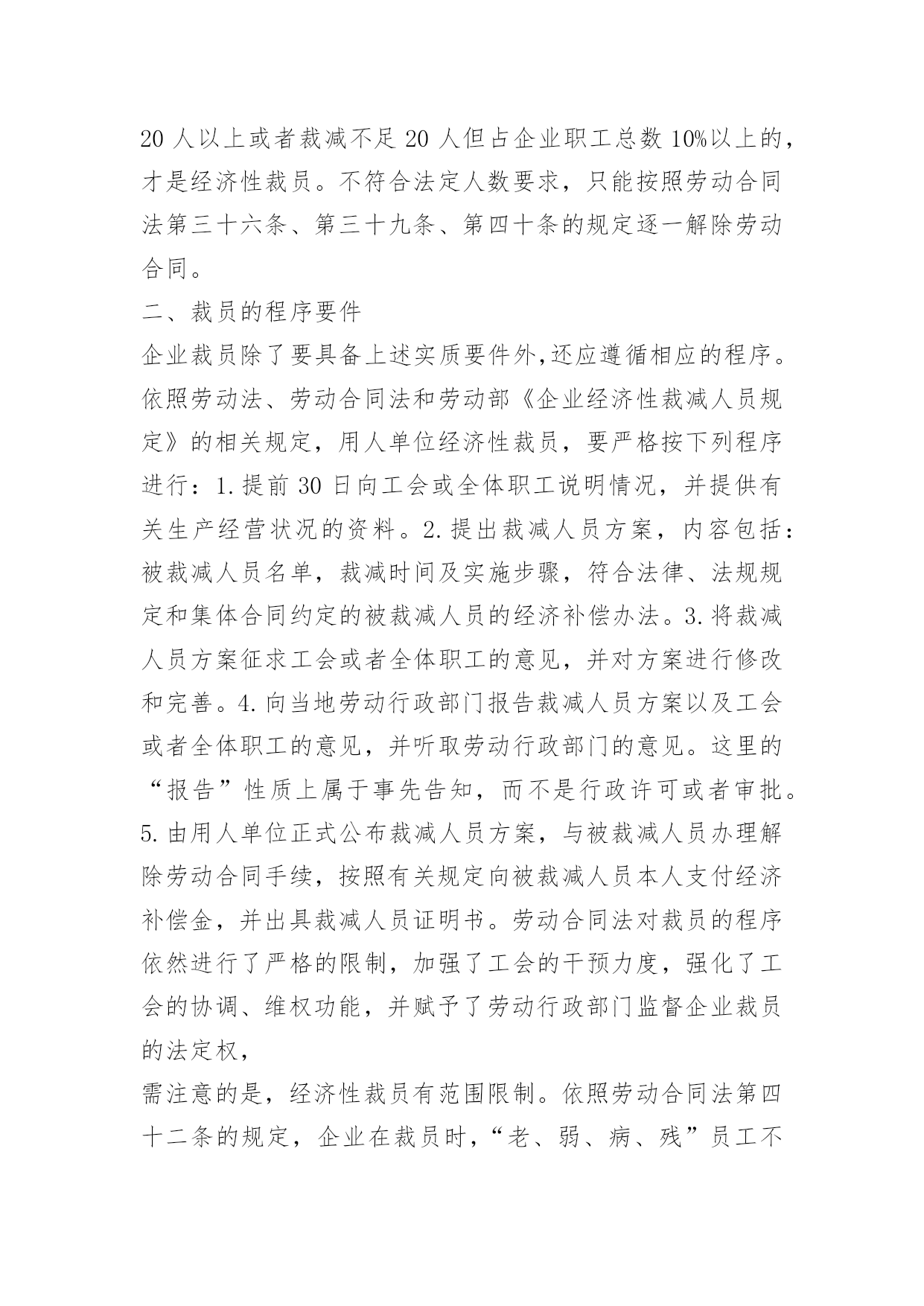 经济性裁员赔偿标准经济性裁员赔偿标准一、经济性裁员的法定情形、禁止性规定及法律依据《中华人民共和国劳动合同法》第四十一条【经济性裁员】有下列情形之一,需要裁减人员二十人以上或者裁减不足二十人但占企业职工总数百分之十以上的,用人单位提前三十日向工会或者全体职工说明情况,听取工会或者职工的意见后,裁减人员方案经向劳动行政部门报告,可以裁减人员:(一)依照企业破产法规定进行重整的;(二)生产经营发生严重困难的;(三)企业转产、重大技术革新或者经营方式调整,经变更劳动合同后,仍需裁减人员的;(四)其他因劳动合同订立时所依据的客观经济情况发生重大变化,致使劳动合同无法履行的。裁减人员时,应当优先留用下列人员:(一)与本单位订立较长期限的固定期限劳动合同的;(二)与本单位订立无固定期限劳动合同的;(三)家庭无其他就业人员,有需要扶养的老人或者未成年人的。用人单位依照本条第一款规定裁减人员,在六个月内重新招用人员的,应当通知被裁减的人员,并在同等条件下优先招用被裁减的人员。第四十二条【用人单位不得解除劳动合同的情形】劳动者有下列情形之一的,用人单位不得依照本法第四十条、第四十一条的规定解除劳动合同:(一)从事接触职业病危害作业的劳动者未进行离岗前职业健康检查,或者疑似职业病病人在诊断或者医学观察期间的;(二)在本单位患职业病或者因工负伤并被确认丧失或者部分丧失劳动能力的;(三)患病或者非因工负伤,在规定的医疗期内的;(四)女职工在孕期、产期、哺乳期的;(五)在本单位连续工作满十五年,且距法定退休年龄不足五年的;(六)法律、行政法规规定的其他情形。二、经济补偿支付标准第四十六条【经济补偿】有下列情形之一的,用人单位应当向劳动者支付经济补偿:(一)劳动者依照本法第三十八条规定解除劳动合同的;(二)用人单位依照本法第三十六条规定向劳动者提出解除劳动合同并与劳动者协商一致解除劳动合同的;(三)用人单位依照本法第四十条规定解除劳动合同的;(四)用人单位依照本法第四十一条第一款规定解除劳动合同的;(五)除用人单位维持或者提高劳动合同约定条件续订劳动合同,劳动者不同意续订的情形外,依照本法第四十四条第一项规定终止固定期限劳动合同的;(六)依照本法第四十四条第四项、第五项规定终止劳动合同的;(七)法律、行政法规规定的其他情形。第四十七条【经济补偿的计算】经济补偿按劳动者在本单位工作的年限,每满一年支付一个月工资的标准向劳动者支付。六个月以上不满一年的,按一年计算;不满六个月的,向劳动者支付半个月工资的经济补偿。劳动者月工资高于用人单位所在直辖市、设区的市级人民政府公布的本地区上年度职工月平均工资三倍的,向其支付经济补偿的标准按职工月平均工资三倍的数额支付,向其支付经济补偿的年限最高不超过十二年。本条所称月工资是指劳动者在劳动合同解除或者终止前十二个月的平均工资。三、“工资”范围及界定《中华人民共和国劳动合同法实施条例》第二十七条劳动合同法第四十七条规定的经济补偿的月工资按照劳动者应得工资计算,包括计时工资或者计件工资以及奖金、津贴和补贴等货币性收入。劳动者在劳动合同解除或者终止前12个月的平均工资低于当地最低工资标准的,按照当地最低工资标准计算。劳动者工作不满12个月的,按照实际工作的月数计算平均工资。《国家统计局关于工资总额组成的规定》第四条工资总额由下列六个部分组成:(一)计时工资;(二)计件工资;(三)奖金;(四)津贴和补贴;(五)加班加点工资;(六)特殊情况下支付的工资。综上,1、经济补偿的月工资按照劳动者应得工资计算,这就意味着经济补偿基数包括社会保险和公积金个人缴纳部分,建议以每月工资条”应发工资”为准;2、建议留存好《劳动合同》、每月工资条、出勤证明、工作证、企业颁发的各类荣誉证书等以免今后发生纠纷,无据可循;3、建议做好工作交接事宜,重要财物交接需有签字并留存。经济性裁员赔偿标准[篇2]情况一:解除或终止合同《劳动合同法》第四十七条规定,此种情况的经济补偿按劳动者在本单位的工作年限,每满一年支付一个月工资的标准支付。六个月以上不满一年的,按一年计算;不满六个月的,向劳动者支付半个月工资。劳动者月工资高于用人单位所在直辖市、省(区)的市级人民政府公布的本地区上年度职工月平均工资三倍的,经济补偿标准为职工月平均工资的三倍,支付年限最高不超过十二年(月工资是指劳动者在劳动合同解除或终止前十二个月的平均工资)。《经济性裁员赔偿标准》全文内容当前网页未完全显示,剩余内容请访问下一页查看。情况二:用人单位单方解除劳动合同《劳动合同法》第四十六条规定,下列情形下,用人单位单方解除劳动合同的,应向劳动者支付经济补偿:1.用人单位依照本法第四十条规定解除劳动合同的:即劳动者患病或非因公负伤,在规定的医疗期满后不能从事原工作,也不能从事由用人单位另行安排的