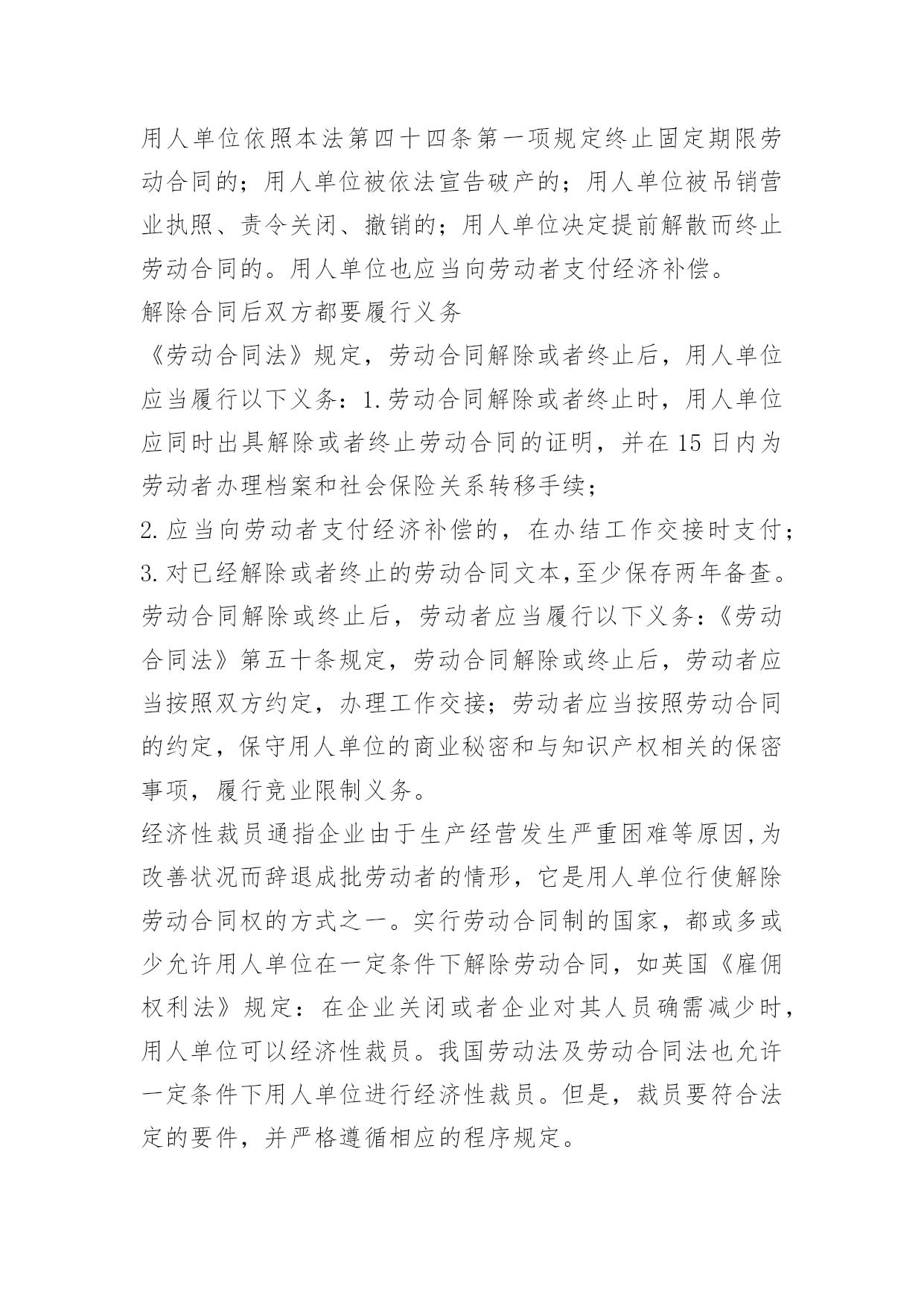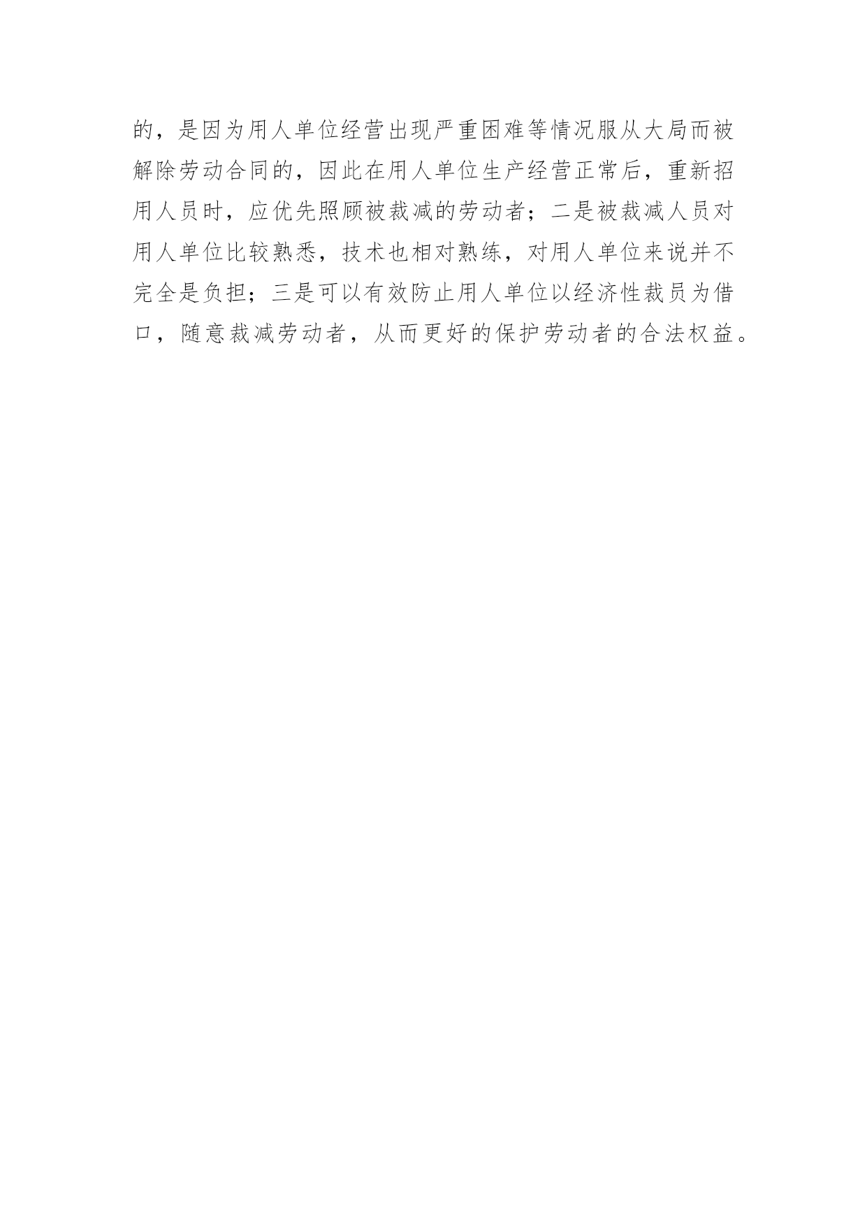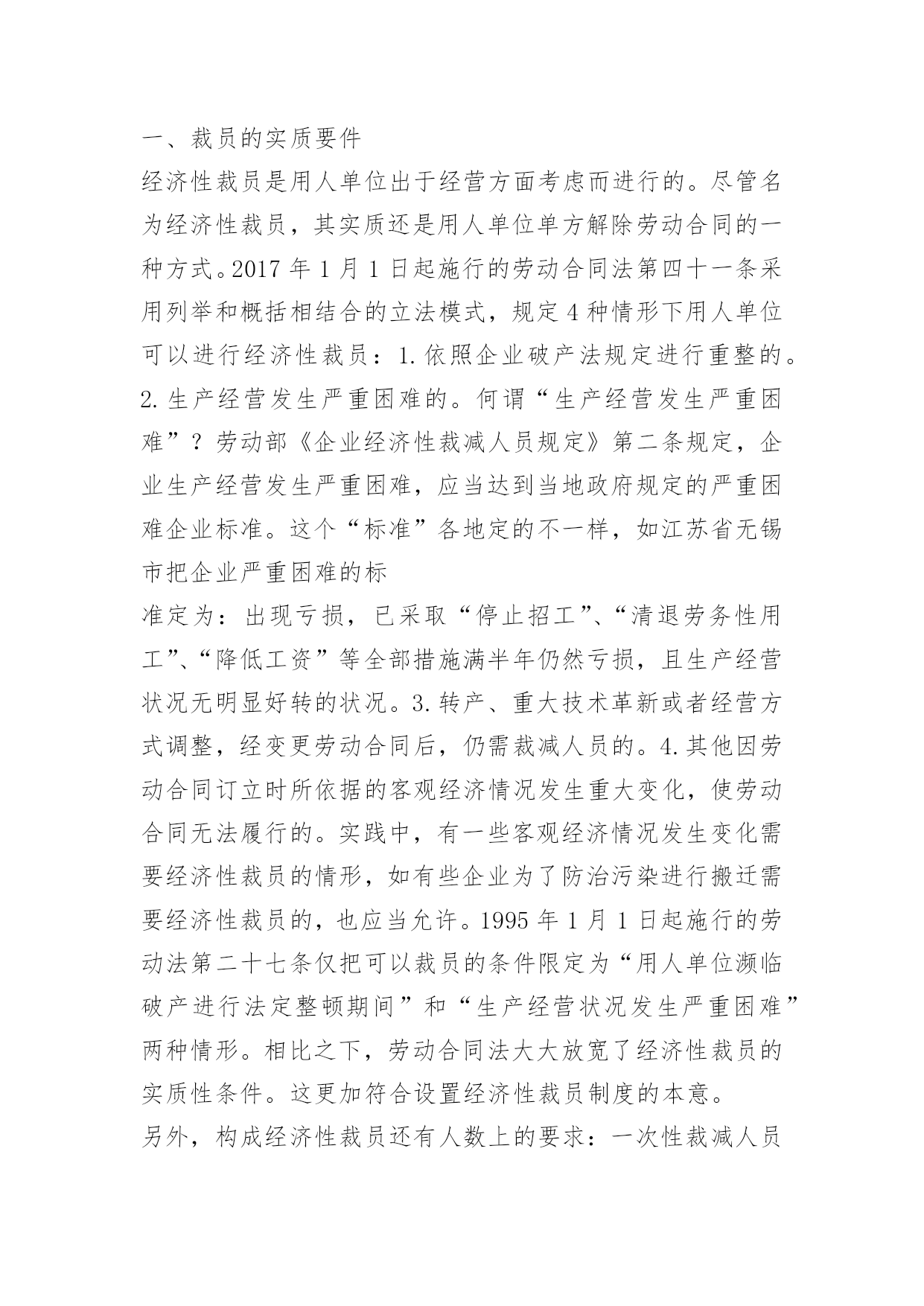 经济性裁员赔偿标准经济性裁员赔偿标准一、经济性裁员的法定情形、禁止性规定及法律依据《中华人民共和国劳动合同法》第四十一条【经济性裁员】有下列情形之一,需要裁减人员二十人以上或者裁减不足二十人但占企业职工总数百分之十以上的,用人单位提前三十日向工会或者全体职工说明情况,听取工会或者职工的意见后,裁减人员方案经向劳动行政部门报告,可以裁减人员:(一)依照企业破产法规定进行重整的;(二)生产经营发生严重困难的;(三)企业转产、重大技术革新或者经营方式调整,经变更劳动合同后,仍需裁减人员的;(四)其他因劳动合同订立时所依据的客观经济情况发生重大变化,致使劳动合同无法履行的。裁减人员时,应当优先留用下列人员:(一)与本单位订立较长期限的固定期限劳动合同的;(二)与本单位订立无固定期限劳动合同的;(三)家庭无其他就业人员,有需要扶养的老人或者未成年人的。用人单位依照本条第一款规定裁减人员,在六个月内重新招用人员的,应当通知被裁减的人员,并在同等条件下优先招用被裁减的人员。第四十二条【用人单位不得解除劳动合同的情形】劳动者有下列情形之一的,用人单位不得依照本法第四十条、第四十一条的规定解除劳动合同:(一)从事接触职业病危害作业的劳动者未进行离岗前职业健康检查,或者疑似职业病病人在诊断或者医学观察期间的;(二)在本单位患职业病或者因工负伤并被确认丧失或者部分丧失劳动能力的;(三)患病或者非因工负伤,在规定的医疗期内的;(四)女职工在孕期、产期、哺乳期的;(五)在本单位连续工作满十五年,且距法定退休年龄不足五年的;(六)法律、行政法规规定的其他情形。二、经济补偿支付标准第四十六条【经济补偿】有下列情形之一的,用人单位应当向劳动者支付经济补偿:(一)劳动者依照本法第三十八条规定解除劳动合同的;(二)用人单位依照本法第三十六条规定向劳动者提出解除劳动合同并与劳动者协商一致解除劳动合同的;(三)用人单位依照本法第四十条规定解除劳动合同的;(四)用人单位依照本法第四十一条第一款规定解除劳动合同的;(五)除用人单位维持或者提高劳动合同约定条件续订劳动合同,劳动者不同意续订的情形外,依照本法第四十四条第一项规定终止固定期限劳动合同的;(六)依照本法第四十四条第四项、第五项规定终止劳动合同的;(七)法律、行政法规规定的其他情形。第四十七条【经济补偿的计算】经济补偿按劳动者在本单位工作的年限,每满一年支付一个月工资的标准向劳动者支付。六个月以上不满一年的,按一年计算;不满六个月的,向劳动者支付半个月工资的经济补偿。劳动者月工资高于用人单位所在直辖市、设区的市级人民政府公布的本地区上年度职工月平均工资三倍的,向其支付经济补偿的标准按职工月平均工资三倍的数额支付,向其支付经济补偿的年限最高不超过十二年。本条所称月工资是指劳动者在劳动合同解除或者终止前十二个月的平均工资。三、“工资”范围及界定《中华人民共和国劳动合同法实施条例》第二十七条劳动合同法第四十七条规定的经济补偿的月工资按照劳动者应得工资计算,包括计时工资或者计件工资以及奖金、津贴和补贴等货币性收入。劳动者在劳动合同解除或者终止前12个月的平均工资低于当地最低工资标准的,按照当地最低工资标准计算。劳动者工作不满12个月的,按照实际工作的月数计算平均工资。《国家统计局关于工资总额组成的规定》第四条工资总额由下列六个部分组成:(一)计时工资;(二)计件工资;(三)奖金;(四)津贴和补贴;(五)加班加点工资;(六)特殊情况下支付的工资。综上,1、经济补偿的月工资按照劳动者应得工资计算,这就意味着经济补偿基数包括社会保险和公积金个人缴纳部分,建议以每月工资条”应发工资”为准;2、建议留存好《劳动合同》、每月工资条、出勤证明、工作证、企业颁发的各类荣誉证书等以免今后发生纠纷,无据可循;3、建议做好工作交接事宜,重要财物交接需有签字并留存。经济性裁员赔偿标准[篇2]情况一:解除或终止合同《劳动合同法》第四十七条规定,此种情况的经济补偿按劳动者在本单位的工作年限,每满一年支付一个月工资的标准支付。六个月以上不满一年的,按一年计算;不满六个月的,向劳动者支付半个月工资。劳动者月工资高于用人单位所在直辖市、省(区)的市级人民政府公布的本地区上年度职工月平均工资三倍的,经济补偿标准为职工月平均工资的三倍,支付年限最高不超过十二年(月工资是指劳动者在劳动合同解除或终止前十二个月的平均工资)。《经济性裁员赔偿标准》全文内容当前网页未完全显示,剩余内容请访问下一页查看。情况二:用人单位单方解除劳动合同《劳动合同法》第四十六条规定,下列情形下,用人单位单方解除劳动合同的,应向劳动者支付经济补偿:1.用人单位依照本法第四十条规定解除劳动合同的:即劳动者患病或非因公负伤,在规定的医疗期满后不能从事原工作,也不能从事由用人单位另行安排的