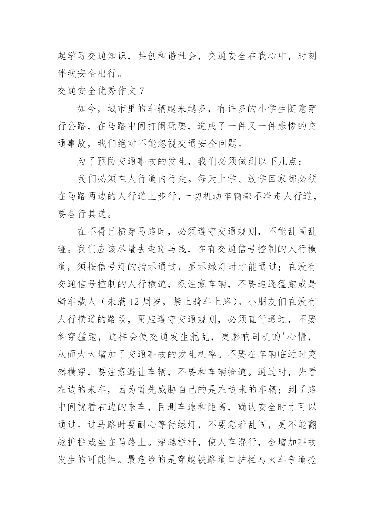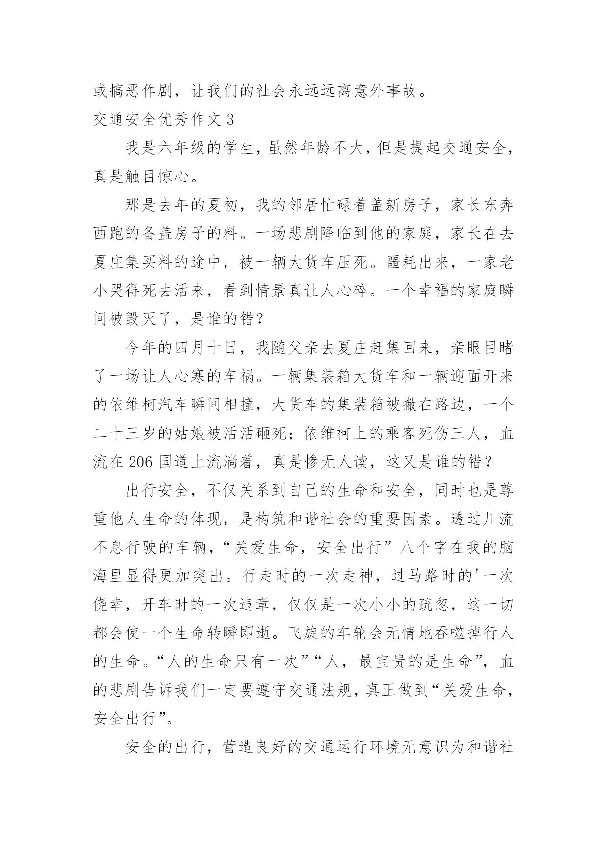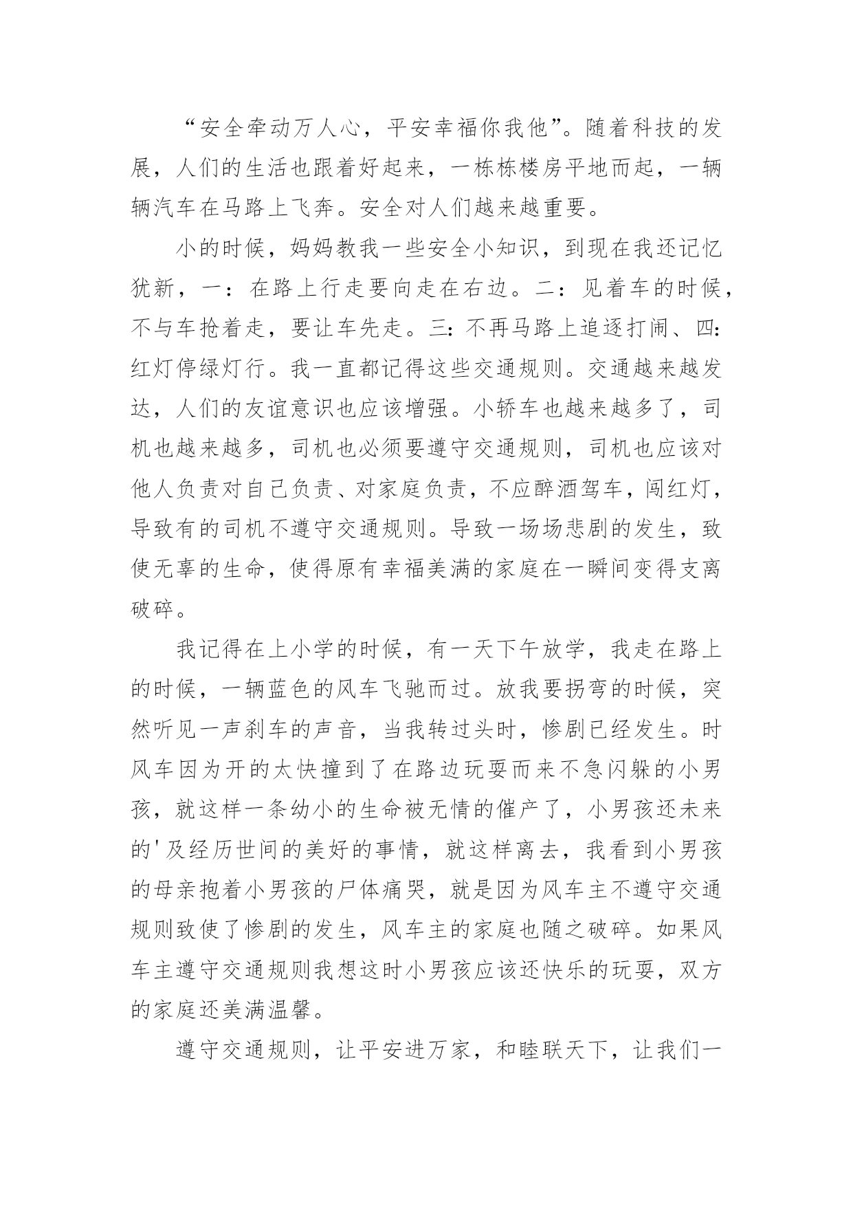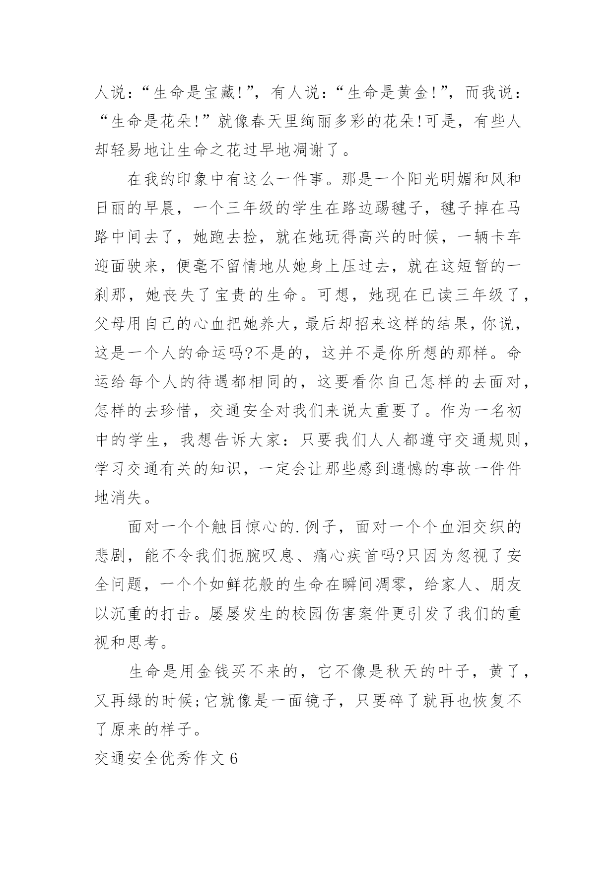 交通安全优秀作文交通安全优秀作文在学习、工作、生活中,大家都尝试过写作文吧,借助作文可以提高我们的语言组织能力。你知道作文怎样才能写的好吗?以下是小编收集整理的交通安全优秀作文,欢迎阅读,希望大家能够喜欢。交通安全优秀作文1当今社会随着经济的发展和交通事业的发展而蓬勃发展,道路上的车流不断。随着道路变得越来越拥挤,交通事故也越来越多。记得前段时间,听别人说黄山区发生了一起严重的车祸。一辆装满石头的大卡车在左转时与迎面而来的另一辆卡车相撞。两具尸体都严重受损。驾驶室被撞得面目全非。两名司机受重伤,被紧急送往最近的医院。救援……后来,据当地交警介绍,两车速度过快,处理不当,是造成事故的主要原因。而每一年,有多少生命被夺走,多少家庭被毁,多少人失去亲人。这些都是血的教训,作为中学生难道不应该被唤醒吗?交通事故往往是人为不遵守交通法规造成的。“不闯红灯、不越过护栏、不呆在马路中间……”这些最流行的交通规则说起来简单,但为什么人们总是不严格遵守呢?由于缺乏安全意识,很多人在繁忙的道路上上演了不可逆转的悲剧场景。当你看到众生消失的时候,当你发现阵阵欢笑声消失的时候。面对那些震撼的场景,你能不心碎吗?黄金有价,但生命无价。我们的生命只属于自己一次。交通事故的发生,给家庭带来了极大的精神伤害,打破了原本美满幸福的家庭,也给父母亲人带来了悲痛。我们身边有很多危险的隐患。上学和放学时,许多学生骑自行车又快又凶。他们在许多汽车中来回穿梭。为了炫耀自己的单车技术,能不能用生命安全去打架?擦边球?有一些走路的.同学,在上下学的路上,为了争取时间,经常闯红灯,跨栏杆,不走人行道,还有同学在马路中间晃来晃去,聊着天和他们的同龄人一起笑,玩,玩,但他们完全不知道,危险正在一步步逼近他们。不以小事取恶,不以小事取善,不以父母老师的教诲为耳朵。我们必须树立“安全第一”的意识,严格遵守交通法规,时刻警钟长鸣。我不认为类似的事故会发生在我们身上。人生只有一种,要好好珍惜,问我吧我们从自己做起,严格遵守交通法规,共同倡导“文明交通,安全出行”!交通安全优秀作文2星期六,我看了中小学生安全教育观后感。国家督学郑增议指出:发生意外伤害最多的是青少年,有因溺水、车祸、火灾、踩踏与自然灾害等,其中,溺水、车祸和火灾的死亡率。为防止溺水事故发生,郑增议对我们小学生提了几点要求:如果要游泳,一定要在成人带领下去游泳,不能私自结伴去。坚决不能够到水库、小河、池塘和没有安全保障的水域玩耍。要是在专业的泳池中游泳时,不可以在泳池里打闹,会呛水死亡,更不可以搞恶作剧。如果游泳的水平和技术不是很高,先不要轻易到深水池里,现在浅水池中练习。为预防抽筋,在下水之前要做好下水前的准备。如果已经发生危险,千万不能够自己下水,如看到手里或身边有木棍、木板、草绳,抛向溺水者,先不至于沉下去,再呼救成年人来救。溺水者不能慌乱,越慌乱越呛水,尽量把鼻子和嘴巴露出来,保持呼吸,等待救援。发生交通事故的主要原因,郑增议说出了几样:一是学生违反了交通法律法规。在农村不能乘坐那些无照的黑车与农用车。二是农村有些地方公共交通设施欠缺。三是有些驾驶员没有以人的生命为本的思想观念。过马路时要遵守交通信号灯,不钻或跨越交通隔离设施,不能在车辆临近时横穿马路,不在马路上嬉戏、奔跑或边走路边看书。火灾也是对青少年的生命和身体安全造成损害的一个威胁。万一发生火灾,一定要弯下腰,顺着楼梯用湿毛巾捂住嘴巴迅速疏散。青少年是祖国的未来,青少年的能否健康成长,关系到我们的国家和民族未来的希望。在这样的情况下,给青少年一个远离意外伤害的'安全的世界,为建设我们的和谐社会作出自己的努力。看了中小学生安全教育片后,我深受启发,以后过马路时看信号灯,到正规的泳池中游泳,不在泳池里打闹、嬉戏或搞恶作剧,让我们的社会永远远离意外事故。交通安全优秀作文3我是六年级的学生,虽然年龄不大,但是提起交通安全,真是触目惊心。那是去年的夏初,我的邻居忙碌着盖新房子,家长东奔西跑的备盖房子的料。一场悲剧降临到他的家庭,家长在去夏庄集买料的途中,被一辆大货车压死。噩耗出来,一家老小哭得死去活来,看到情景真让人心碎。一个幸福的家庭瞬间被毁灭了,是谁的错?今年的四月十日,我随父亲去夏庄赶集回来,亲眼目睹了一场让人心寒的车祸。一辆集装箱大货车和一辆迎面开来的依维柯汽车瞬间相撞,大货车的集装箱被撇在路边,一个二十三岁的姑娘被活活砸死;依维柯上的乘客死伤三人,血流在206国道上流淌着,真是惨无人读,这又是谁的错?出行安全,不仅关系到自己的生命和安全,同时也是尊重他人生命的体现,是构筑和谐社会的重要因素。透过川流不息行驶的车辆,“关爱生命,安全出行”八个字在我的脑海里显得更加突出。行走时的一次走神,过马路时的'一次侥幸,开车时的一次违章,仅仅是一次小小的疏忽,这一切都会