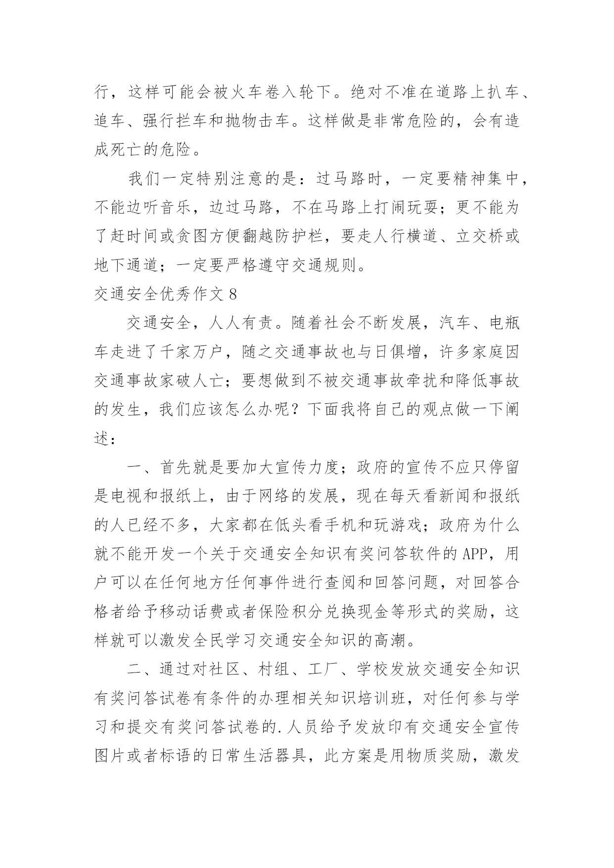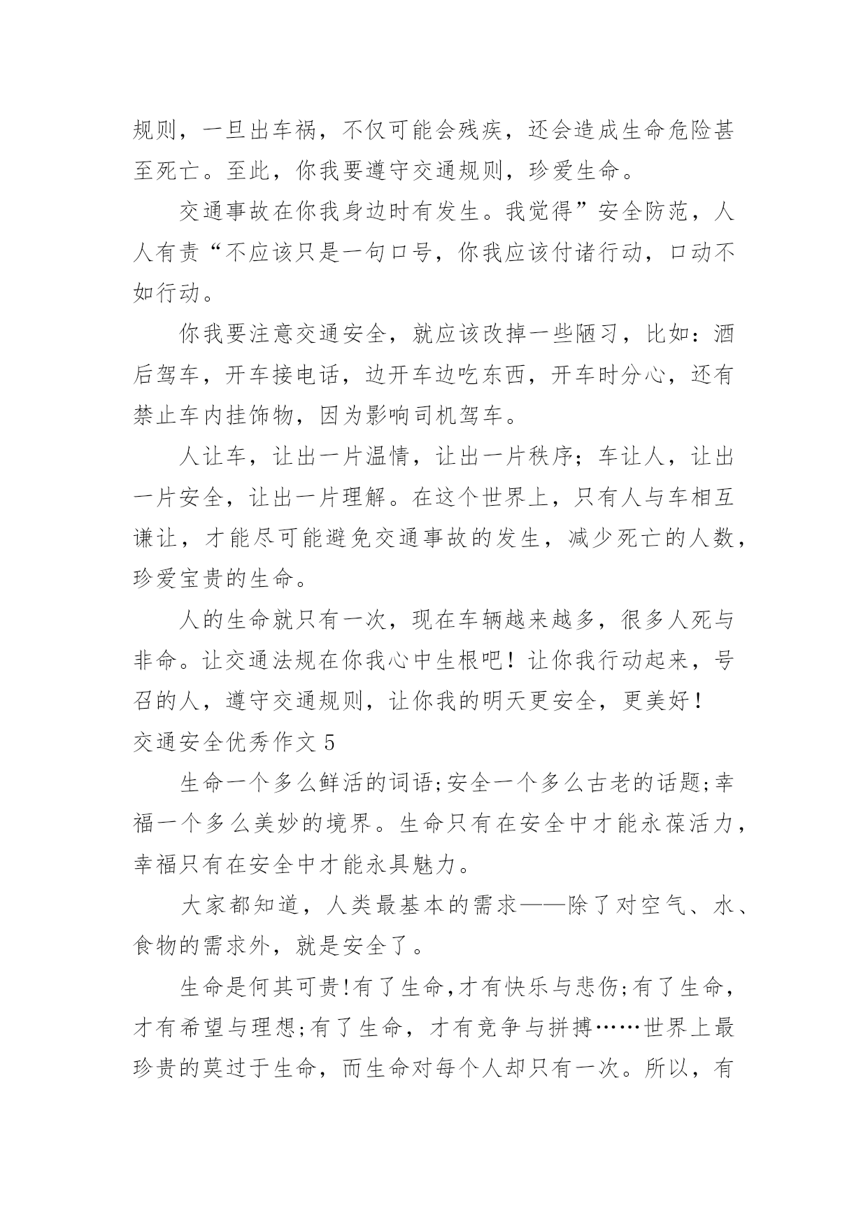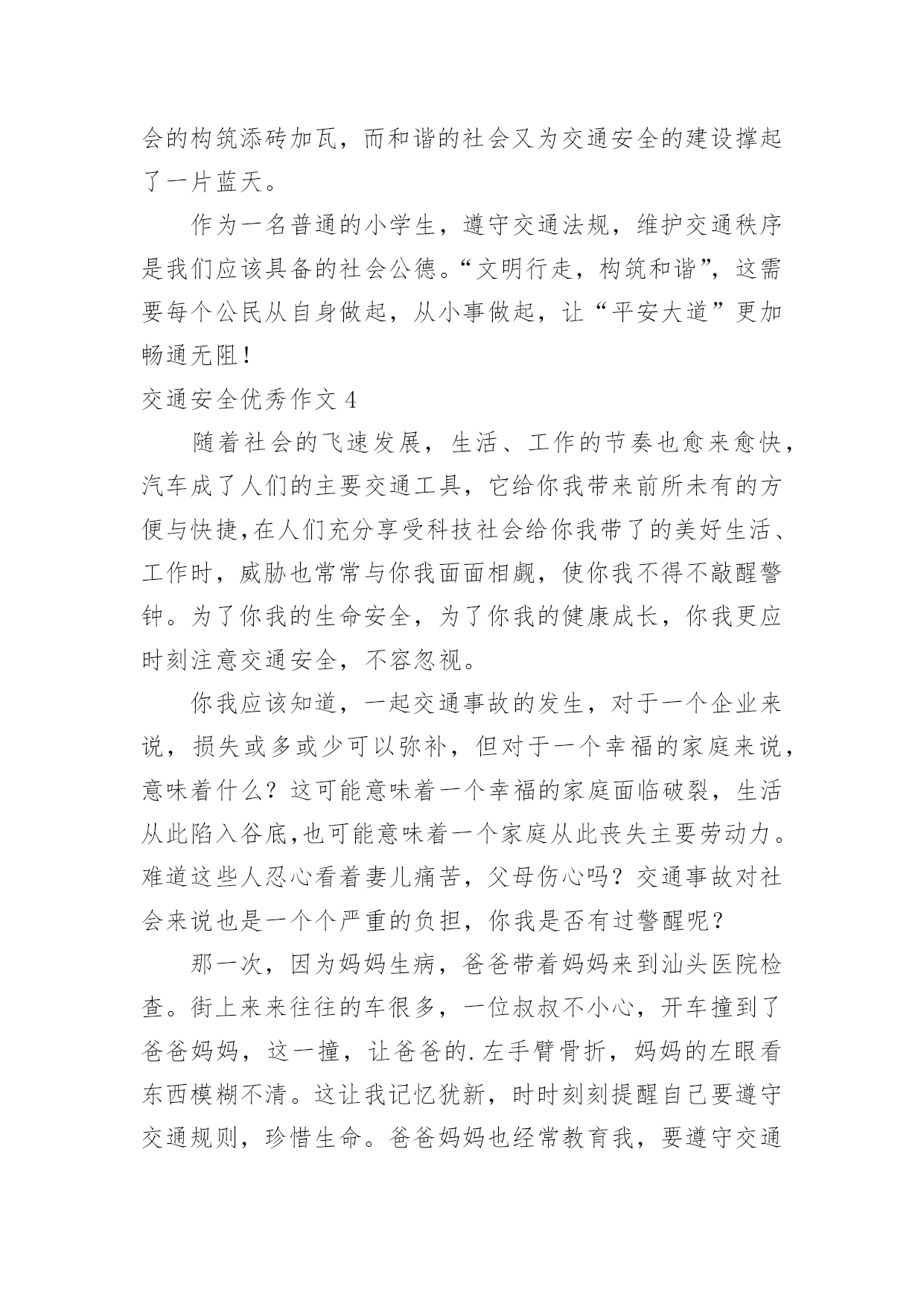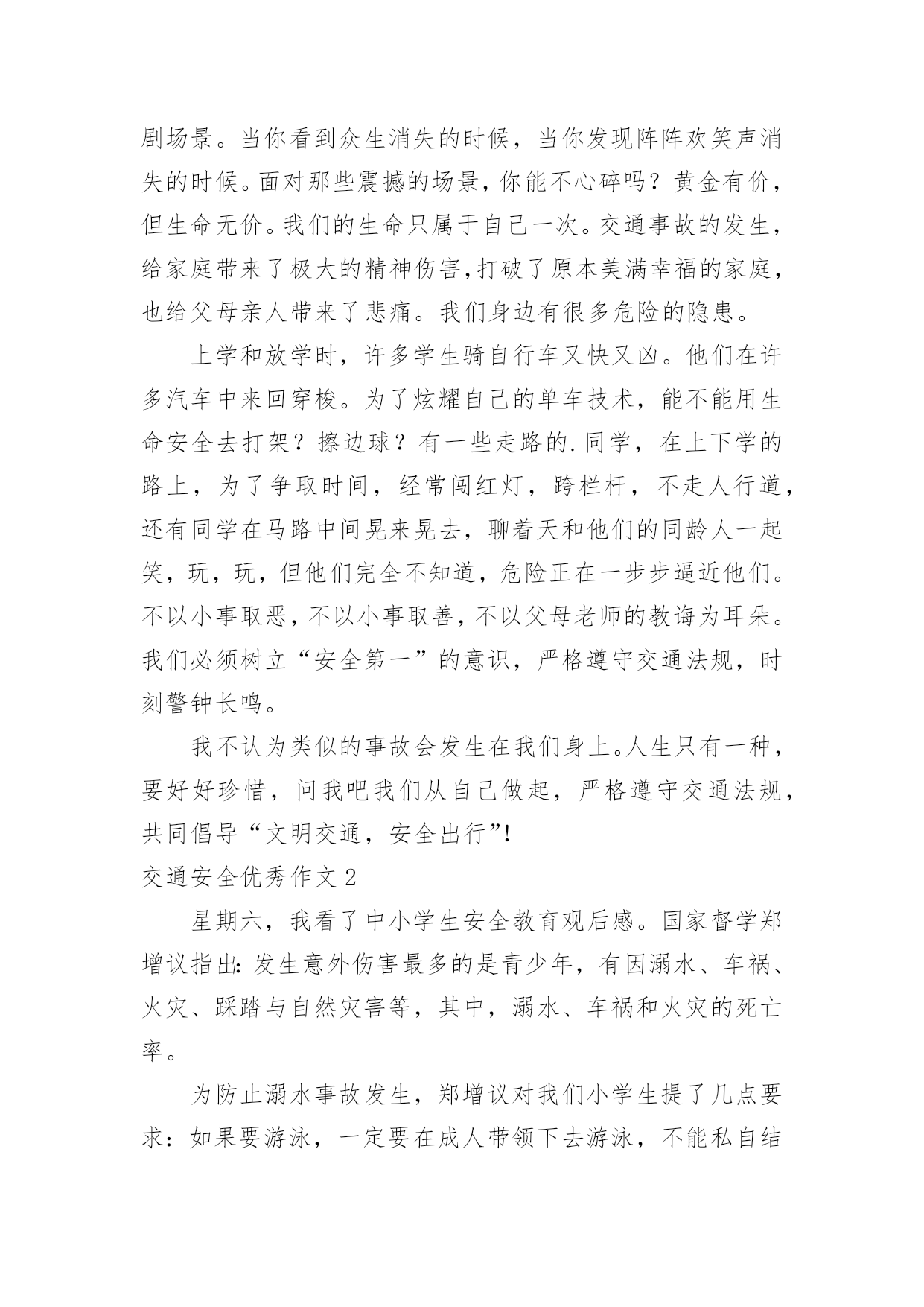 交通安全优秀作文交通安全优秀作文在学习、工作、生活中,大家都尝试过写作文吧,借助作文可以提高我们的语言组织能力。你知道作文怎样才能写的好吗?以下是小编收集整理的交通安全优秀作文,欢迎阅读,希望大家能够喜欢。交通安全优秀作文1当今社会随着经济的发展和交通事业的发展而蓬勃发展,道路上的车流不断。随着道路变得越来越拥挤,交通事故也越来越多。记得前段时间,听别人说黄山区发生了一起严重的车祸。一辆装满石头的大卡车在左转时与迎面而来的另一辆卡车相撞。两具尸体都严重受损。驾驶室被撞得面目全非。两名司机受重伤,被紧急送往最近的医院。救援……后来,据当地交警介绍,两车速度过快,处理不当,是造成事故的主要原因。而每一年,有多少生命被夺走,多少家庭被毁,多少人失去亲人。这些都是血的教训,作为中学生难道不应该被唤醒吗?交通事故往往是人为不遵守交通法规造成的。“不闯红灯、不越过护栏、不呆在马路中间……”这些最流行的交通规则说起来简单,但为什么人们总是不严格遵守呢?由于缺乏安全意识,很多人在繁忙的道路上上演了不可逆转的悲剧场景。当你看到众生消失的时候,当你发现阵阵欢笑声消失的时候。面对那些震撼的场景,你能不心碎吗?黄金有价,但生命无价。我们的生命只属于自己一次。交通事故的发生,给家庭带来了极大的精神伤害,打破了原本美满幸福的家庭,也给父母亲人带来了悲痛。我们身边有很多危险的隐患。上学和放学时,许多学生骑自行车又快又凶。他们在许多汽车中来回穿梭。为了炫耀自己的单车技术,能不能用生命安全去打架?擦边球?有一些走路的.同学,在上下学的路上,为了争取时间,经常闯红灯,跨栏杆,不走人行道,还有同学在马路中间晃来晃去,聊着天和他们的同龄人一起笑,玩,玩,但他们完全不知道,危险正在一步步逼近他们。不以小事取恶,不以小事取善,不以父母老师的教诲为耳朵。我们必须树立“安全第一”的意识,严格遵守交通法规,时刻警钟长鸣。我不认为类似的事故会发生在我们身上。人生只有一种,要好好珍惜,问我吧我们从自己做起,严格遵守交通法规,共同倡导“文明交通,安全出行”!交通安全优秀作文2星期六,我看了中小学生安全教育观后感。国家督学郑增议指出:发生意外伤害最多的是青少年,有因溺水、车祸、火灾、踩踏与自然灾害等,其中,溺水、车祸和火灾的死亡率。为防止溺水事故发生,郑增议对我们小学生提了几点要求:如果要游泳,一定要在成人带领下去游泳,不能私自结伴去。坚决不能够到水库、小河、池塘和没有安全保障的水域玩耍。要是在专业的泳池中游泳时,不可以在泳池里打闹,会呛水死亡,更不可以搞恶作剧。如果游泳的水平和技术不是很高,先不要轻易到深水池里,现在浅水池中练习。为预防抽筋,在下水之前要做好下水前的准备。如果已经发生危险,千万不能够自己下水,如看到手里或身边有木棍、木板、草绳,抛向溺水者,先不至于沉下去,再呼救成年人来救。溺水者不能慌乱,越慌乱越呛水,尽量把鼻子和嘴巴露出来,保持呼吸,等待救援。发生交通事故的主要原因,郑增议说出了几样:一是学生违反了交通法律法规。在农村不能乘坐那些无照的黑车与农用车。二是农村有些地方公共交通设施欠缺。三是有些驾驶员没有以人的生命为本的思想观念。过马路时要遵守交通信号灯,不钻或跨越交通隔离设施,不能在车辆临近时横穿马路,不在马路上嬉戏、奔跑或边走路边看书。火灾也是对青少年的生命和身体安全造成损害的一个威胁。万一发生火灾,一定要弯下腰,顺着楼梯用湿毛巾捂住嘴巴迅速疏散。青少年是祖国的未来,青少年的能否健康成长,关系到我们的国家和民族未来的希望。在这样的情况下,给青少年一个远离意外伤害的'安全的世界,为建设我们的和谐社会作出自己的努力。看了中小学生安全教育片后,我深受启发,以后过马路时看信号灯,到正规的泳池中游泳,不在泳池里打闹、嬉戏或搞恶作剧,让我们的社会永远远离意外事故。交通安全优秀作文3我是六年级的学生,虽然年龄不大,但是提起交通安全,真是触目惊心。那是去年的夏初,我的邻居忙碌着盖新房子,家长东奔西跑的备盖房子的料。一场悲剧降临到他的家庭,家长在去夏庄集买料的途中,被一辆大货车压死。噩耗出来,一家老小哭得死去活来,看到情景真让人心碎。一个幸福的家庭瞬间被毁灭了,是谁的错?今年的四月十日,我随父亲去夏庄赶集回来,亲眼目睹了一场让人心寒的车祸。一辆集装箱大货车和一辆迎面开来的依维柯汽车瞬间相撞,大货车的集装箱被撇在路边,一个二十三岁的姑娘被活活砸死;依维柯上的乘客死伤三人,血流在206国道上流淌着,真是惨无人读,这又是谁的错?出行安全,不仅关系到自己的生命和安全,同时也是尊重他人生命的体现,是构筑和谐社会的重要因素。透过川流不息行驶的车辆,“关爱生命,安全出行”八个字在我的脑海里显得更加突出。行走时的一次走神,过马路时的'一次侥幸,开车时的一次违章,仅仅是一次小小的疏忽,这一切都会