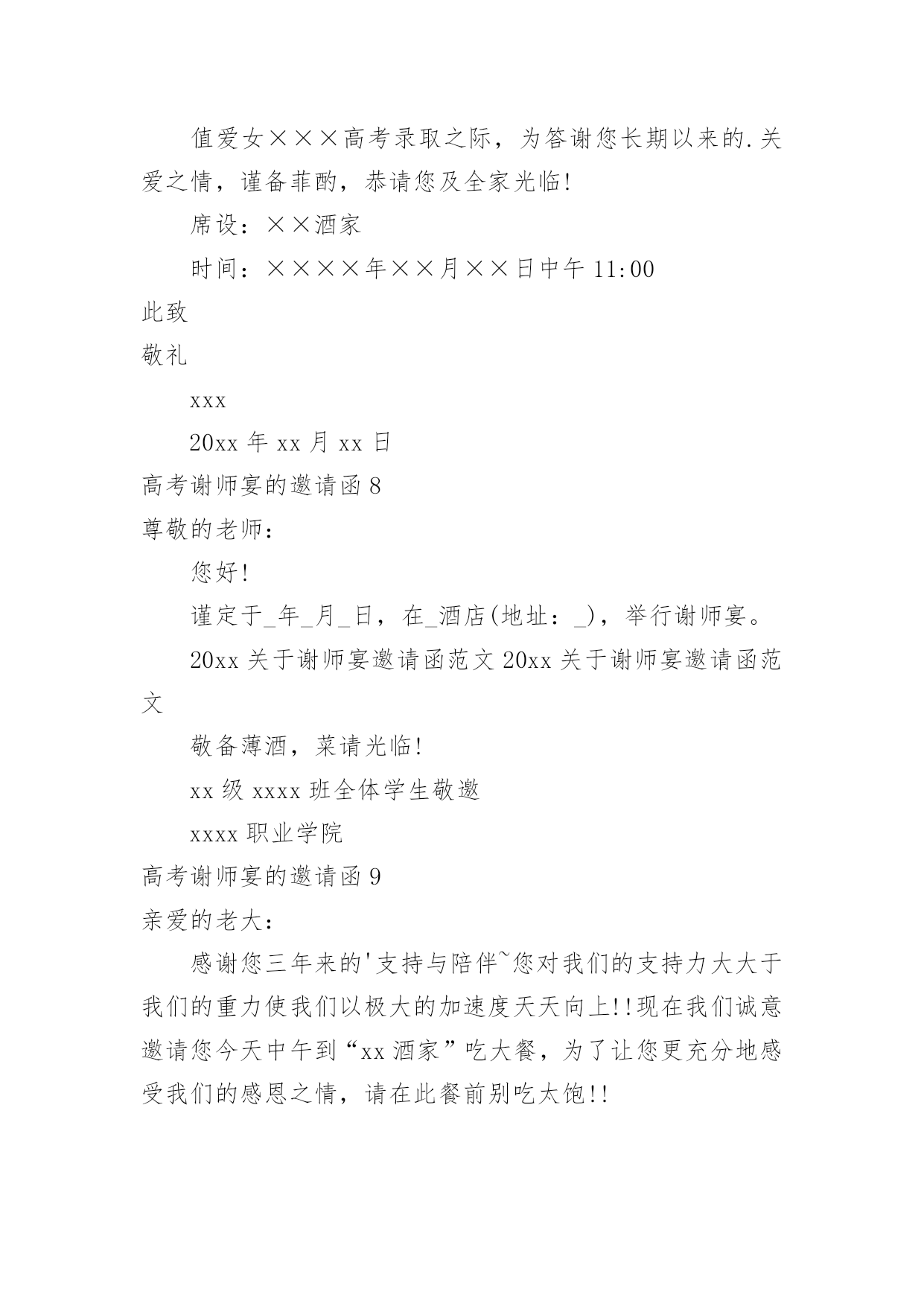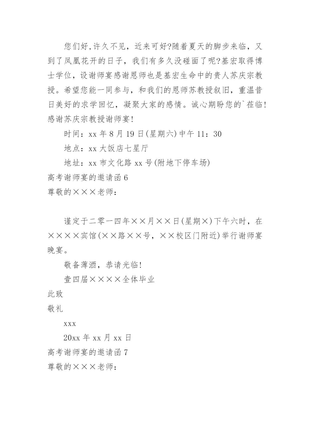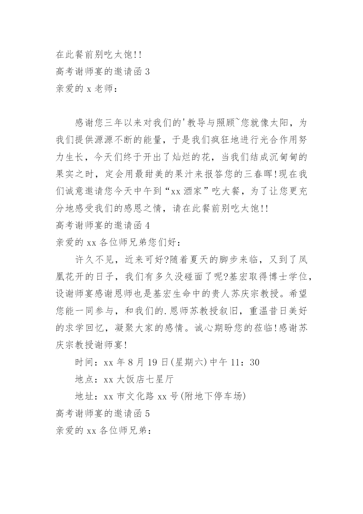 高考谢师宴的邀请函高考谢师宴的邀请函商务礼仪中有一项就是活动邀请函。在不断进步的社会中,邀请函与我们的关系越来越密切,邀请函的注意事项有许多,你确定会写吗?下面是小编收集整理的高考谢师宴的邀请函,欢迎大家借鉴与参考,希望对大家有所帮助。高考谢师宴的邀请函1亲爱的x老师:先让我告诉您一个秘密:其实我们班的同学在底下就不叫您x老师,而是叫您x教授~因为您那睿智的目光和富有逻辑的思维深深地震撼了我们,您循循善诱,带领我们体验代数的'耐心,领略几何人生。现在我们诚意邀请您今天中午到“xx酒家”吃大餐,为了让您更充分地感受我们的感恩之情,请在此餐前别吃太饱!!高考谢师宴的邀请函2亲爱的全胜兄:感谢您一年来对我们的.真心付出,您的斐然文采让我们顶礼膜拜,您的锦囊妙计让我们受益匪浅,感谢您的临门一脚,把我们带进龙门!现在我们诚意邀请您今天中午到“xx酒家”吃大餐,为了让您更充分地感受我们的感恩之情,请在此餐前别吃太饱!!高考谢师宴的邀请函3亲爱的x老师:感谢您三年以来对我们的'教导与照顾~您就像太阳,为我们提供源源不断的能量,于是我们疯狂地进行光合作用努力生长,今天们终于开出了灿烂的花,当我们结成沉甸甸的果实之时,定会用最甜美的果汁来报答您的三春晖!现在我们诚意邀请您今天中午到“xx酒家”吃大餐,为了让您更充分地感受我们的感恩之情,请在此餐前别吃太饱!!高考谢师宴的邀请函4亲爱的xx各位师兄弟您们好:许久不见,近来可好?随着夏天的脚步来临,又到了凤凰花开的日子,我们有多久没碰面了呢?基宏取得博士学位,设谢师宴感谢恩师也是基宏生命中的贵人苏庆宗教授。希望您能一同参与,和我们的.恩师苏教授叙旧,重温昔日美好的求学回忆,凝聚大家的感情。诚心期盼您的莅临!感谢苏庆宗教授谢师宴!时间:xx年8月19日(星期六)中午11:30地点:xx大饭店七星厅地址:xx市文化路xx号(附地下停车场)高考谢师宴的邀请函5亲爱的xx各位师兄弟:您们好,许久不见,近来可好?随着夏天的脚步来临,又到了凤凰花开的日子,我们有多久没碰面了呢?基宏取得博士学位,设谢师宴感谢恩师也是基宏生命中的贵人苏庆宗教授。希望您能一同参与,和我们的恩师苏教授叙旧,重温昔日美好的求学回忆,凝聚大家的感情。诚心期盼您的`莅临!感谢苏庆宗教授谢师宴!时间:xx年8月19日(星期六)中午11:30地点:xx大饭店七星厅地址:xx市文化路xx号(附地下停车场)高考谢师宴的邀请函6尊敬的×××老师:谨定于二零一四年××月××日(星期×)下午六时,在××××宾馆(××路××号,××校区门附近)举行谢师宴晚宴。敬备薄酒,恭请光临!壹四届××××全体毕业此致敬礼xxx20xx年xx月xx日高考谢师宴的邀请函7尊敬的×××老师:值爱女×××高考录取之际,为答谢您长期以来的.关爱之情,谨备菲酌,恭请您及全家光临!席设:××酒家时间:××××年××月××日中午11:00此致敬礼xxx20xx年xx月xx日高考谢师宴的邀请函8尊敬的老师:您好!谨定于_年_月_日,在_酒店(地址:_),举行谢师宴。20xx关于谢师宴邀请函范文20xx关于谢师宴邀请函范文敬备薄酒,菜请光临!xx级xxxx班全体学生敬邀xxxx职业学院高考谢师宴的邀请函9亲爱的老大:感谢您三年来的'支持与陪伴~您对我们的支持力大大于我们的重力使我们以极大的加速度天天向上!!现在我们诚意邀请您今天中午到“xx酒家”吃大餐,为了让您更充分地感受我们的感恩之情,请在此餐前别吃太饱!!
