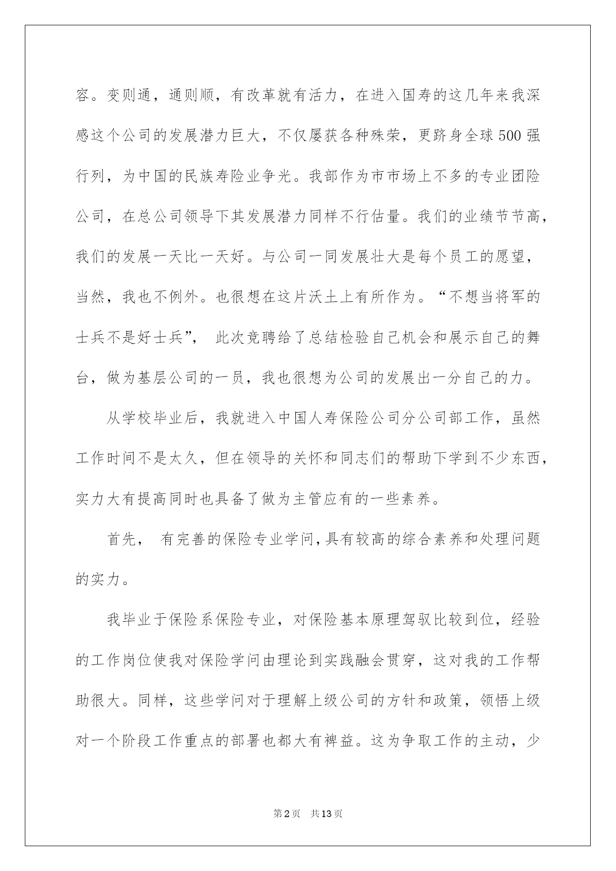 第PAGE\*Arabic\*MERGEFORMAT13页共NUMPAGES\*Arabic\*MERGEFORMAT13页第PAGE\*MERGEFORMAT13页共NUMPAGES\*MERGEFORMAT13页第PAGE\*MERGEFORMAT13页共NUMPAGES\*MERGEFORMAT13页第PAGE\*MERGEFORMAT13页共NUMPAGES\*MERGEFORMAT13页第PAGE\*MERGEFORMAT13页共NUMPAGES\*MERGEFORMAT13页第PAGE\*MERGEFORMAT13页共NUMPAGES\*MERGEFORMAT13页第PAGE\*MERGEFORMAT13页共NUMPAGES\*MERGEFORMAT13页第PAGE\*MERGEFORMAT13页共NUMPAGES\*MERGEFORMAT13页第PAGE\*MERGEFORMAT13页共NUMPAGES\*MERGEFORMAT13页第PAGE\*MERGEFORMAT13页共NUMPAGES\*MERGEFORMAT13页第PAGE\*MERGEFORMAT13页共NUMPAGES\*MERGEFORMAT13页2022竞聘保险主管的演讲稿竞聘保险主管的演讲稿演讲稿要求内容充溢,条理清晰,重点突出。现如今,我们可以运用演讲稿的机会越来越多,写起演讲稿来就毫无头绪?以下是我细心整理的竞聘保险主管的演讲稿,希望能够帮助到大家。竞聘保险主管的演讲稿1敬重的各位领导、各位同志:大家好!首先感谢大家给我这次参加竞聘的机会,我竞聘的职位是综合科主管。我叫陈xx,xx年诞生,现年20岁,籍贯海南市,高校本科学历。20xx年毕业于高校系。同年进入中国人寿保险公司,在其支公司工作至今。先后历任银行兼业代理顾问,外勤及综合科出纳等职。在学校我学习的专业就是保险,对保险行业有较为全面深刻的相识。为自己能投身这样一个富有朝气和活力的行业而感到傲慢。我们中国人寿保险公司是老字号的保险公司,为了顺应加入WTO的形式,公司进行了一系列的改革,这次人力资源改革便是其中的一个重要内容。变则通,通则顺,有改革就有活力,在进入国寿的这几年来我深感这个公司的发展潜力巨大,不仅屡获各种殊荣,更跻身全球500强行列,为中国的民族寿险业争光。我部作为市市场上不多的专业团险公司,在总公司领导下其发展潜力同样不行估量。我们的业绩节节高,我们的发展一天比一天好。与公司一同发展壮大是每个员工的愿望,当然,我也不例外。也很想在这片沃土上有所作为。“不想当将军的士兵不是好士兵”,此次竞聘给了总结检验自己机会和展示自己的舞台,做为基层公司的一员,我也很想为公司的发展出一分自己的力。从学校毕业后,我就进入中国人寿保险公司分公司部工作,虽然工作时间不是太久,但在领导的关怀和同志们的帮助下学到不少东西,实力大有提高同时也具备了做为主管应有的一些素养。首先,有完善的保险专业学问,具有较高的综合素养和处理问题的实力。我毕业于保险系保险专业,对保险基本原理驾驭比较到位,经验的工作岗位使我对保险学问由理论到实践融会贯穿,这对我的工作帮助很大。同样,这些学问对于理解上级公司的方针和政策,领悟上级对一个阶段工作重点的部署也都大有裨益。这为争取工作的主动,少走弯路打下了坚实的基础;此外,会计学,金融学,经济法学方面的学问也能使自己在工作中和处理相关问题时能够游刃有余。其次,具有较强的综合协调实力综合科主管是公司的中层管理阶层,也是公司的中流砥柱。随着金融一体化,市场的全球化,学问经济正在快速到来,企业的内外部环境都发生着巨大的改变。而综合科作为协调公司内外部的重要职能部门其主管的协调实力显得尤为重要。对内部而言,在目前的工作中,我的职务是综合科财务出纳,担负着本公司与市公司财务部之间的连接工作,能作到两者之间信息刚好沟通,问题顺当解决。此外,由于工作须要,我还负责与税务部门,质量监督局,公积金中心及银行等其他公司外部单位协调关系,使公司的工作能顺当有效的进行。第三,熟识财务管理,现代化办公技能娴熟,能有效的使工作顺当进行。由于现在从事的是财务工作,我对财务工作比较熟识,已顺当取得了会计师资格证。在工作中能很好的帮助领导对公司的财务状况进行刚好精确的把握,确定公司发展的方向。另外,对OFFICE等办公软件能娴熟操作,企业办公自动化方面应当不成问题,在对新技术运用方面,在今年的学平险的收费管理中,还首次了运用财务软件进行管理,大大削减了相关人员的工作量,提高了工作效率。第四。具有从事综合科工作的阅历。我的职位所在综合科,所谓近水楼台先得月
