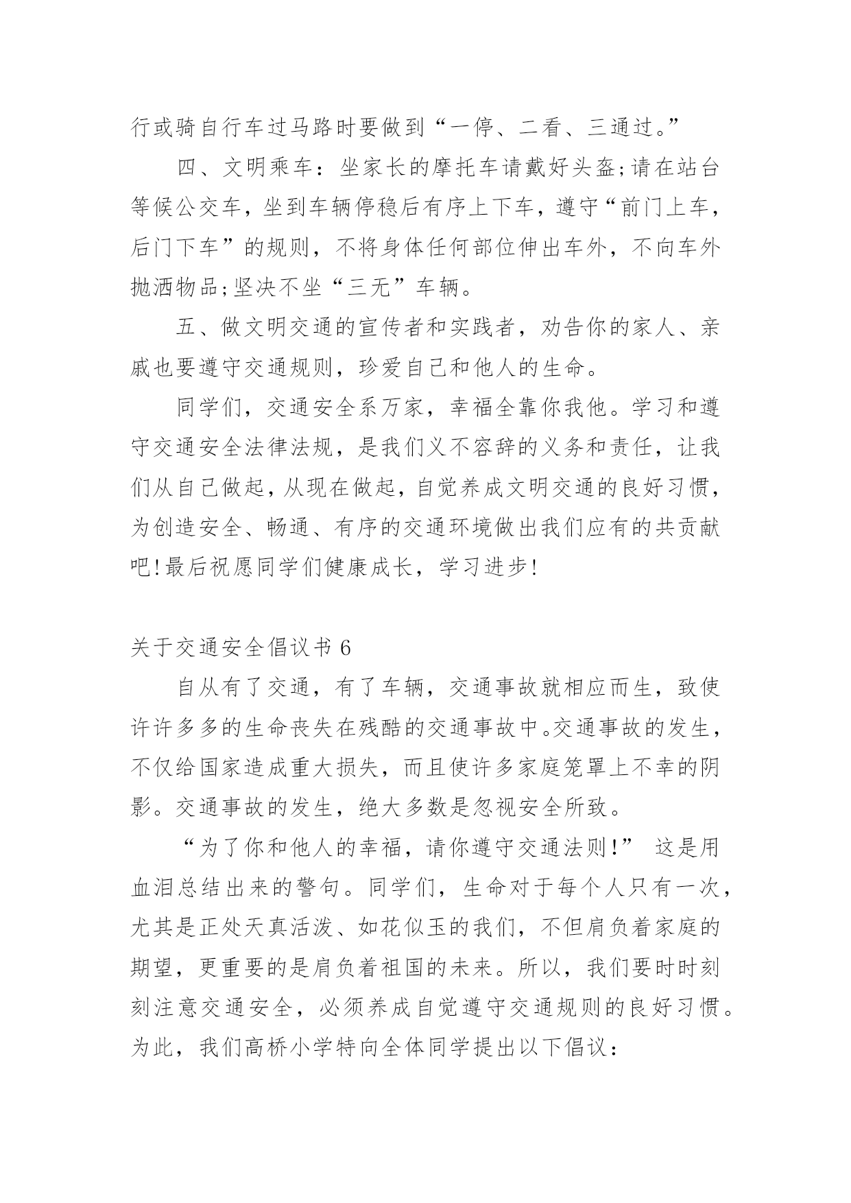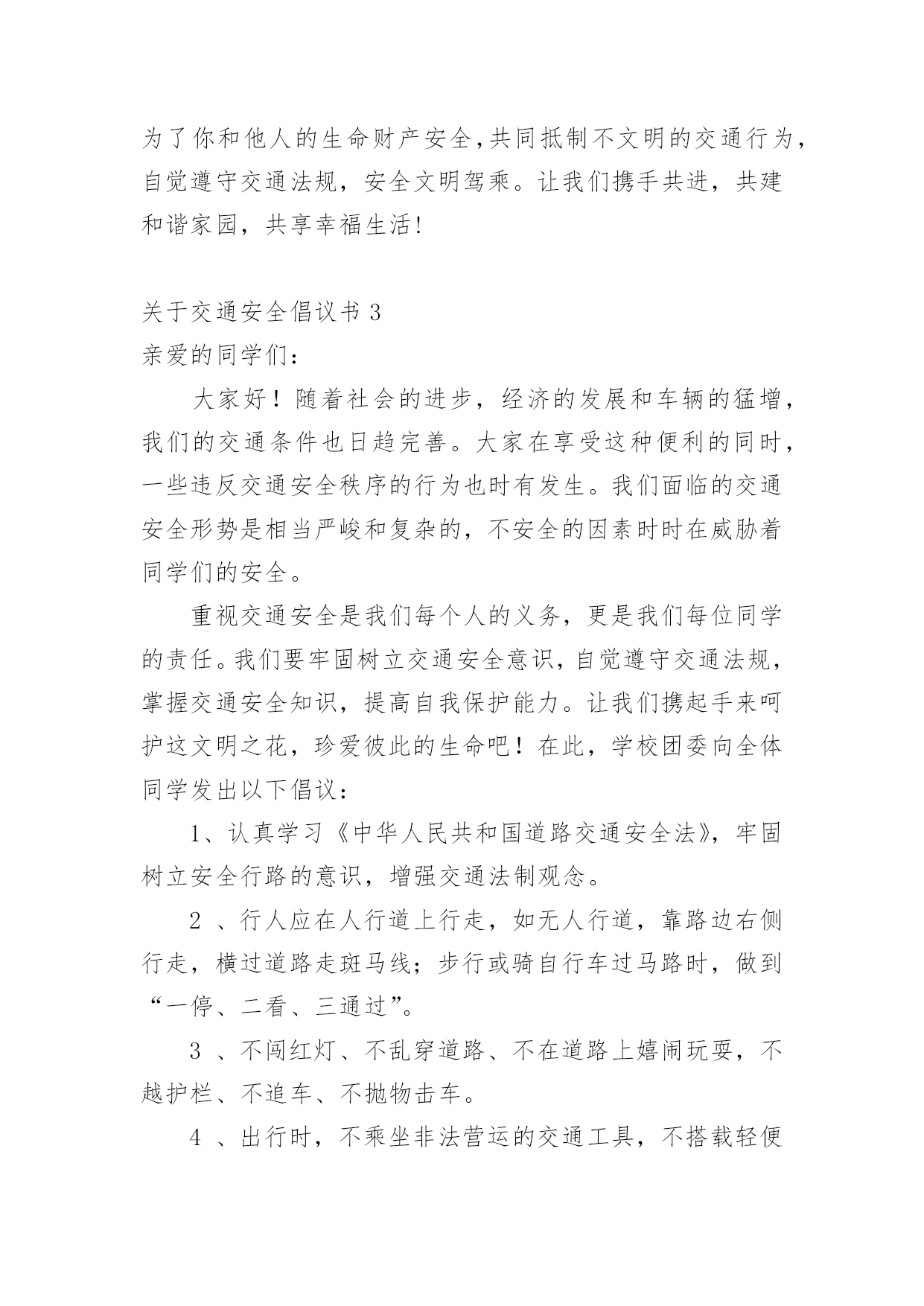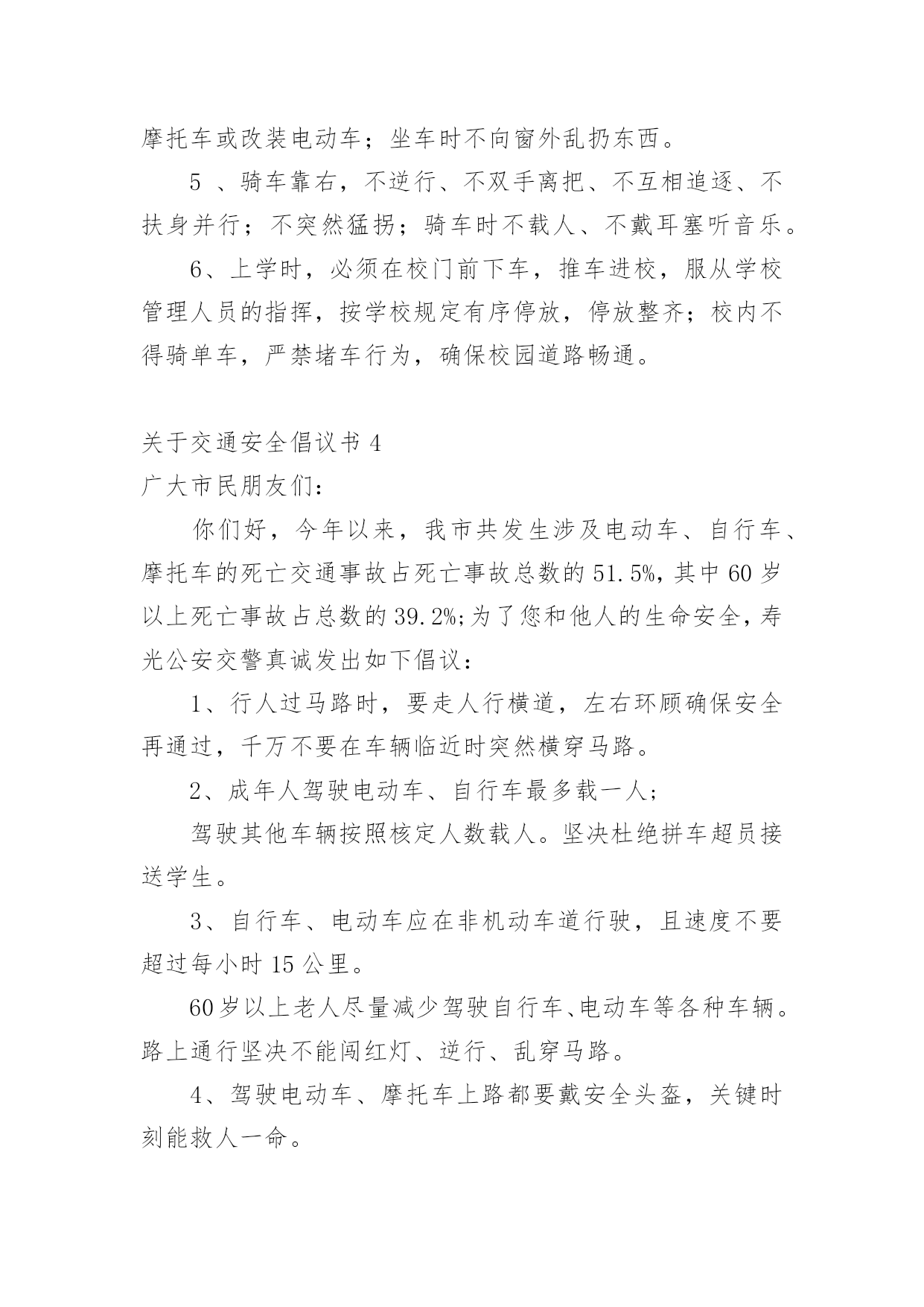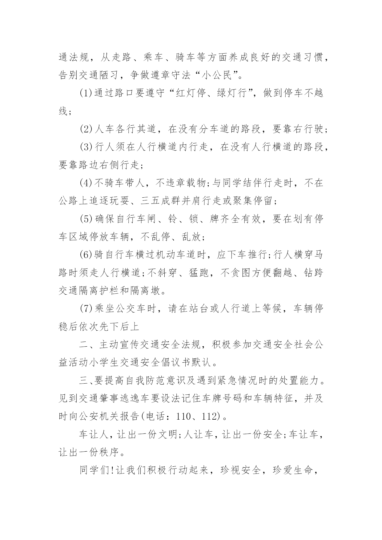 交通安全倡议书关于交通安全倡议书(通用15篇)在学习、工作生活中,接触并使用倡议书的人越来越多,倡议书一般由标题、称呼、正文、结尾、落款五部分组成。还是对倡议书一筹莫展吗?下面是小编为大家整理的关于交通安全倡议书,仅供参考,希望能够帮助到大家。关于交通安全倡议书1广大驾驶员朋友、市民朋友们:当前,我市上下正全力以赴创建全国文明城市提名城市、国家卫生城市、国家全域旅游示范市、国家水生态文明城市。为助力“四城联创”“让群众更满意”,全市政法综治系统率先在公交营运车辆、公务车辆、公职人员私家车范围启动礼让斑马线行动,逐步引导规范广大车主增强礼让斑马线意识。开展“司机礼让斑马线·文明接力保平安”活动,为树立我市文明形象、打造平安和谐软环境、提高城市综合竞争力有着十分重要的意义。作为焦作人,尤其是党政机关企事业单位的党员、干部、职工,我们更要坚决响应市委、市政府关于创建全国文明城市提名城市、“让群众更满意”的号召,理应成为文明交通的实践者、参与者、支持者。为此,特发出如下倡议:一、文明驾车,礼让行人。车辆在行经斑马线路段时,主动减速行驶,不争道抢行;遇行人正在通过斑马线时,主动停车让行。要严格执行“三个必须”:必须提前减速,作好礼让准备;当有行人通过斑马线时,必须停车让行;当无行人通过斑马线时,必须低速通过。二、文明出行,遵章守法。行人通过路口或者横过道路,应当走斑马线,遵守交通信号灯指示,不跨越护栏;通过无交通信号灯斑马线时,要注意观察两边来车,确认机动车停车礼让时,应当快速通过,不在马路上追逐嬉戏、打闹、玩手机,主动营造“路畅人和”的出行环境。三、文明交通,促进和谐。驾驶人和行人主动接受社会监督。文明行车,从按章行驶、礼让斑马线开始;文明过马路,从遵守信号指示、各行其道做起,主动为停车礼让驾驶员竖起大拇指,积极为礼让行为点赞,共同营造“文明出行,车人相让”的良好氛围。让我们积极投身于“司机礼让斑马线·文明接力保平安”行动,做文明人、行文明路、开文明车,使斑马线成为礼貌线、文明线、安全线,成为xxxx的一道风景线,为“四城联创”和建设创新xxxx、富裕xxxx、美丽xxxx、平安焦作增光添彩!xxxx市社会治安综合治理委员会办公室精神文明建设委员会办公室中共xxxx市委市直机关工作委员会xxxx市机关事务管理局xxxx市公安局xxxx市交通运输局xx年xx月xx日关于交通安全倡议书2亲爱的同学们:随着社会的进步,我们的交通条件也日趋完善。大家在享受这种便利的同时,一些违反交通安全秩序的行为也时有发生。在行人车辆拥挤的道路上,同学们,你们是否注意到了潜藏的危险呢?我们大家都拥有一个快乐幸福的家庭,我们每一位同学都拥有深爱我们的父母,对于父母来说,孩子的安全是他们心头时刻的牵挂,我们每天如果能快快乐乐出门,平平安安回家,就是父母最大的幸福和快乐。同时,作为子女,父母和每一位我们深爱的亲朋好友的交通安全都与我们息息相关。大家只有遵守《道路交通安全法》,我们的每一个家庭才会快乐、幸福。红灯短暂而生命长久小学生交通安全倡议书小学生交通安全倡议书。遵章守纪就是尊重生命,尊重自我。当我们能做到这一切的时候,我们的社会便向文明的彼岸又靠近了一步。重视交通安全是我们每个人的义务,更是我们每位同学的责任。我们要牢固树立交通安全意识,自觉遵守交通法规,掌握交通安全知识,提高自我保护能力。让我们携起手来呵护这文明之花,珍爱彼此的生命吧!在此,学校团支部向全校学生发出以下倡议:一、认真学习《道路交通安全法》,自觉遵守、宣传交通法规,从走路、乘车、骑车等方面养成良好的交通习惯,告别交通陋习,争做遵章守法“小公民”。(1)通过路口要遵守“红灯停、绿灯行”,做到停车不越线;(2)人车各行其道,在没有分车道的路段,要靠右行驶;(3)行人须在人行横道内行走,在没有人行横道的路段,要靠路边右侧行走;(4)不骑车带人,不违章载物;与同学结伴行走时,不在公路上追逐玩耍、三五成群并肩行走或聚集停留;(5)确保自行车闸、铃、锁、牌齐全有效,要在划有停车区域停放车辆,不乱停、乱放;(6)骑自行车横过机动车道时,应下车推行;行人横穿马路时须走人行横道;不斜穿、猛跑,不贪图方便翻越、钻跨交通隔离护栏和隔离墩。(7)乘坐公交车时,请在站台或人行道上等候,车辆停稳后依次先下后上二、主动宣传交通安全法规,积极参加交通安全社会公益活动小学生交通安全倡议书默认。三、要提高自我防范意识及遇到紧急情况时的处置能力。见到交通肇事逃逸车要设法记住车牌号码和车辆特征,并及时向公安机关报告(电话:110、112)。车让人,让出一份文明;人让车,让出一份安全;车让车,让出一份秩序。同学们!让我们积极行动起来,珍视安全,珍爱生命,为了你和他人的生命财产安全,共同抵制不文明的交通行为,自觉遵守交通法规,安全文